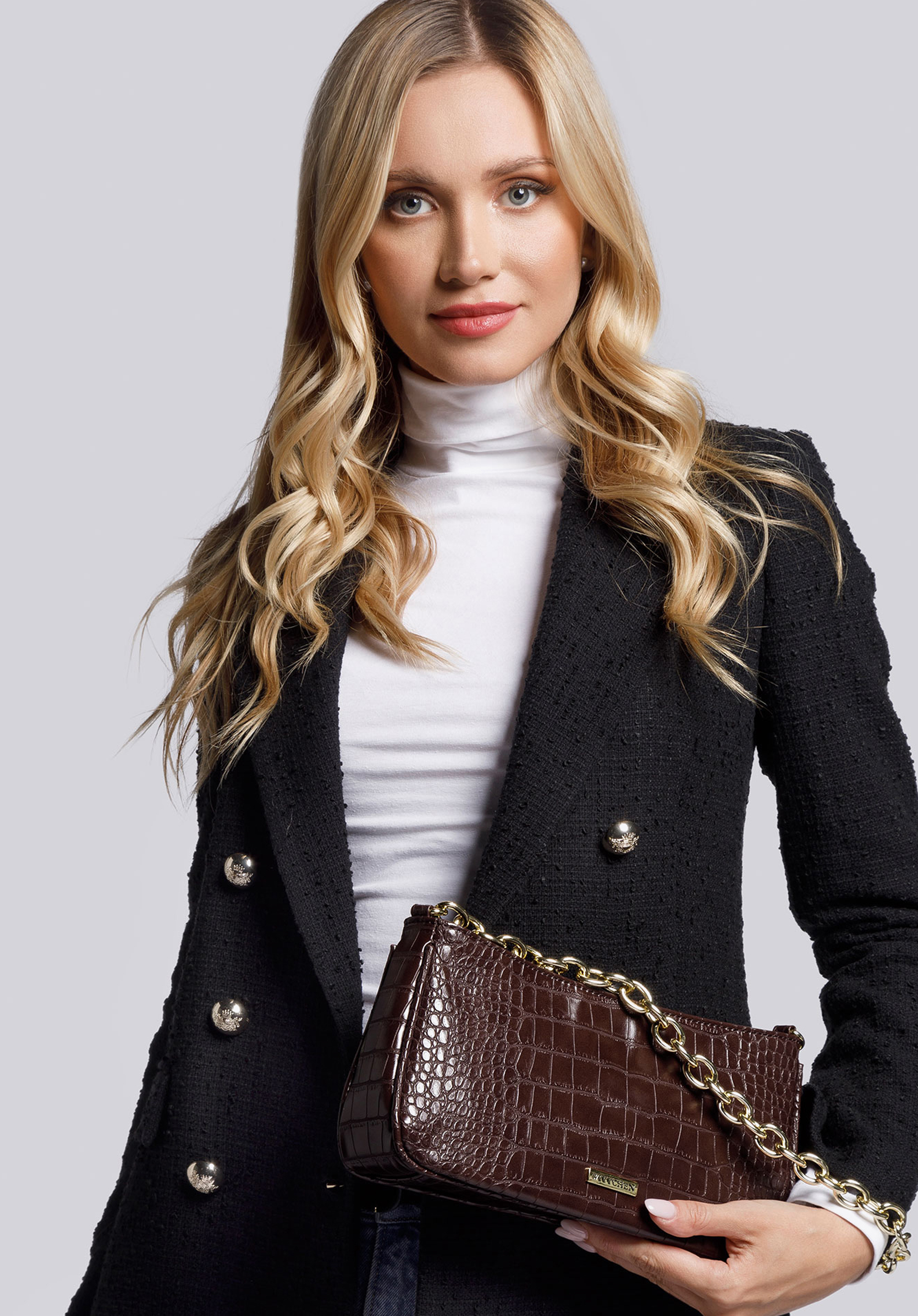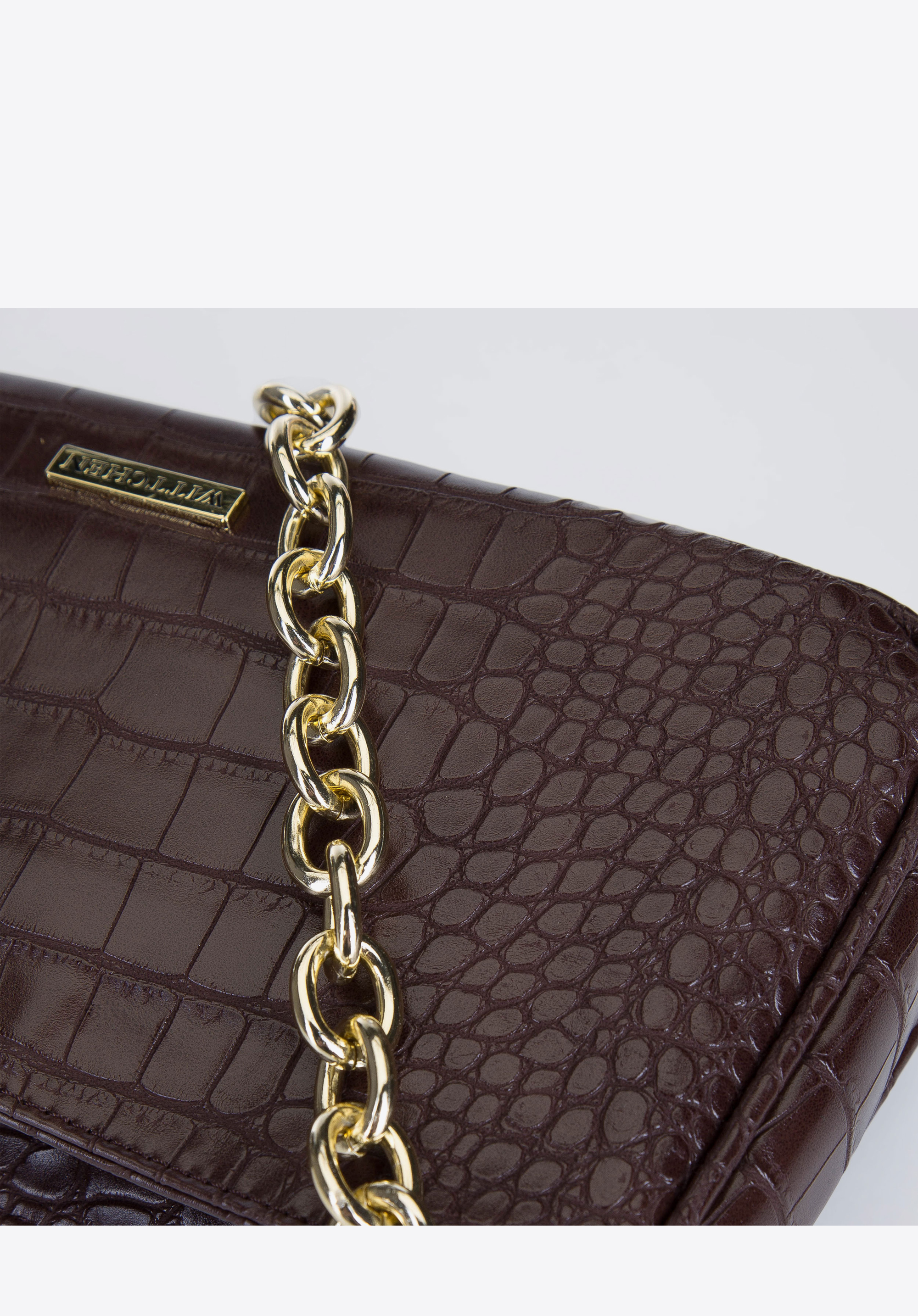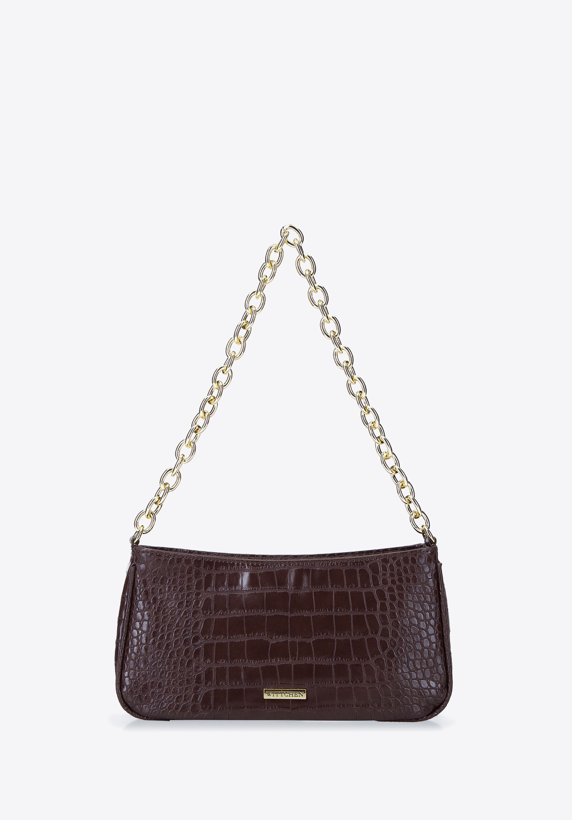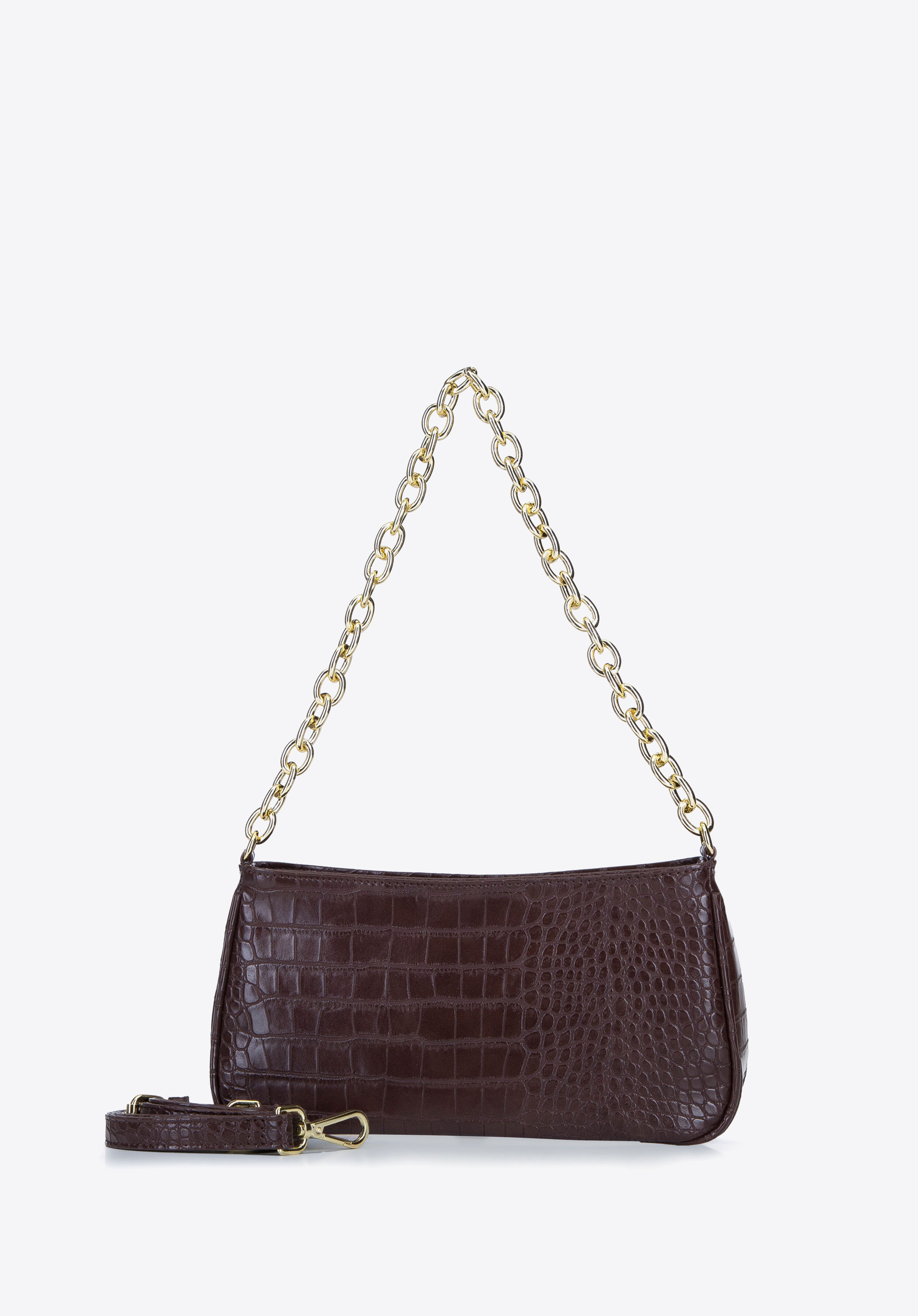 Kleine Baguette-Tasche mit länglichem Korpus und mit Krokodilledermuster verleiht Ihren Outfits einen besonderen Charakter. Das hochwertige Kunstleder ist dem Naturleder täuschend ähnlich, dabei aber pflegeleicht, weich und leicht. Das Aussehen der Tasche wurde mit goldenen Elementen angereichert, darunter die Kette, die einen rockigen Stil verleiht. Im Inneren gibt es den Platz für ein Handy, eine Brieftasche, eine Sonnenbrille und andere Kleinigkeiten. Die Baguette Tasche mit Kette ist sowohl für den Alltag als auch für besondere Anlässe geeignet.