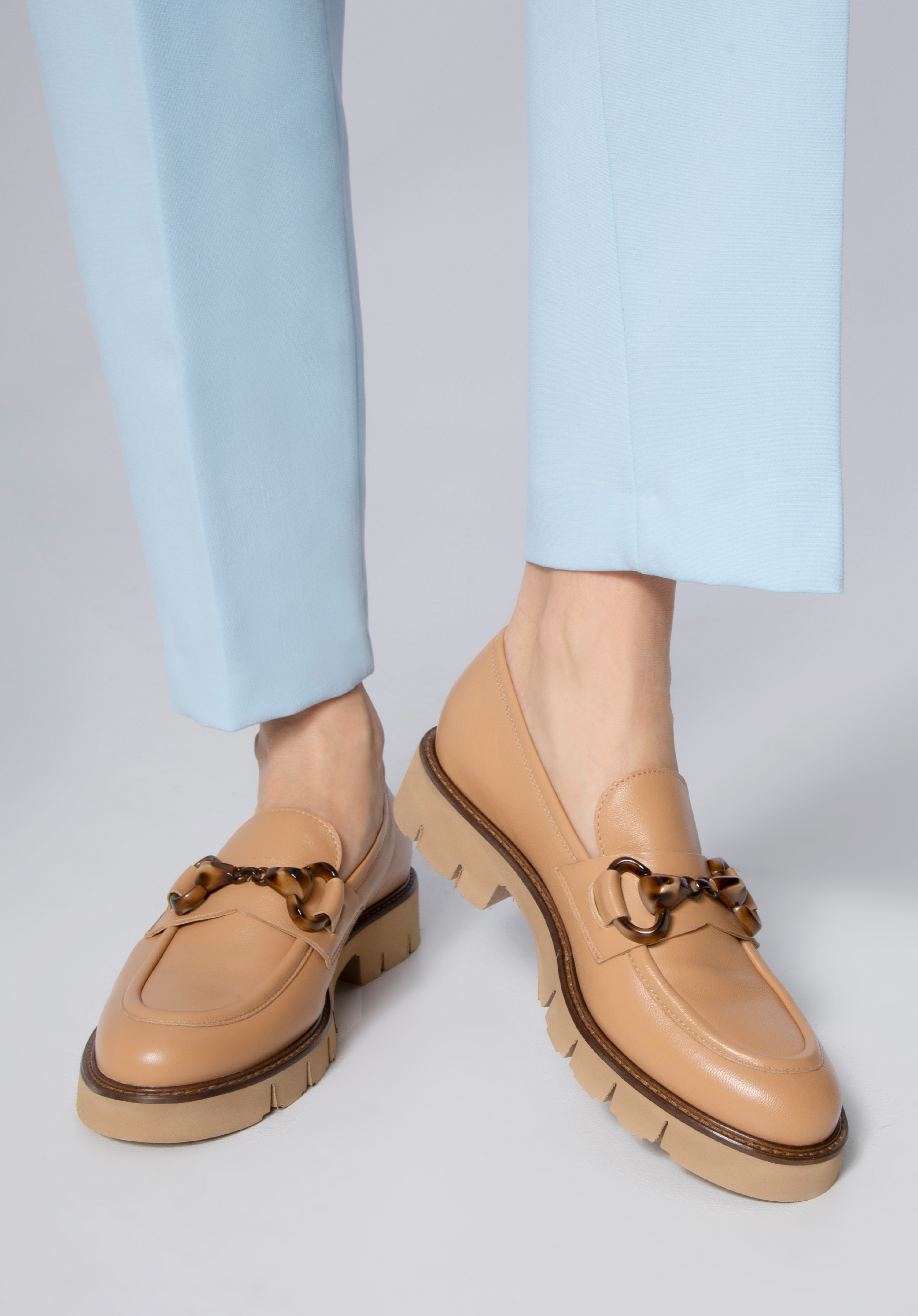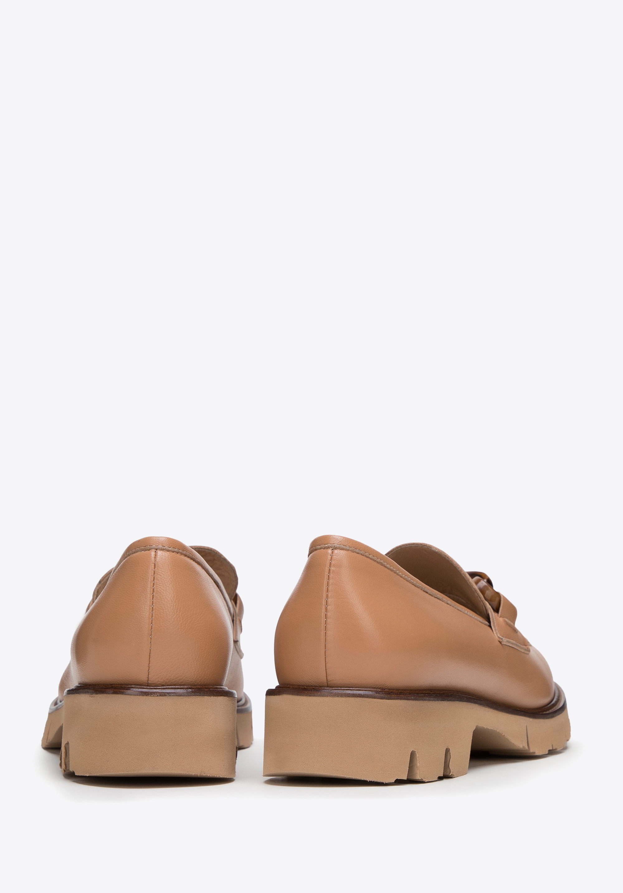 beige-braune Plateau-Mokassins aus Leder mit Schnalle