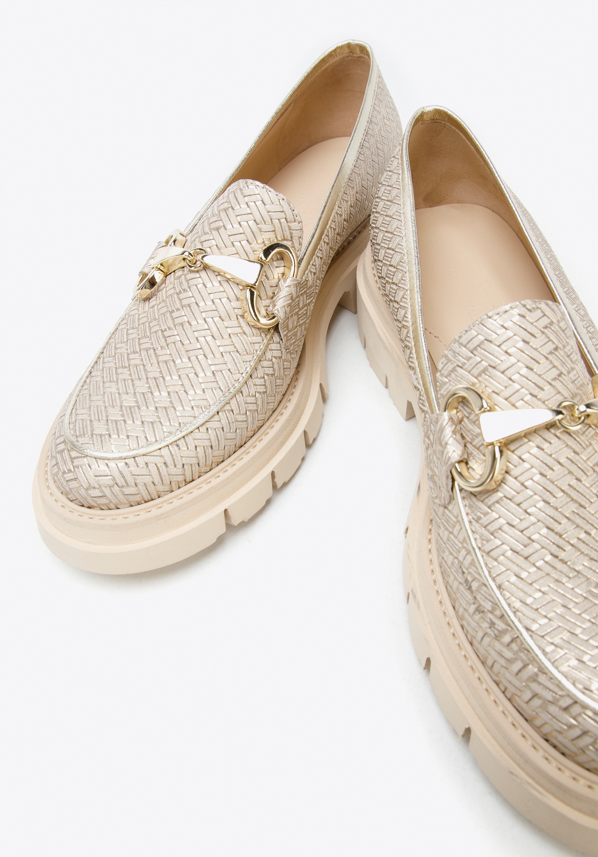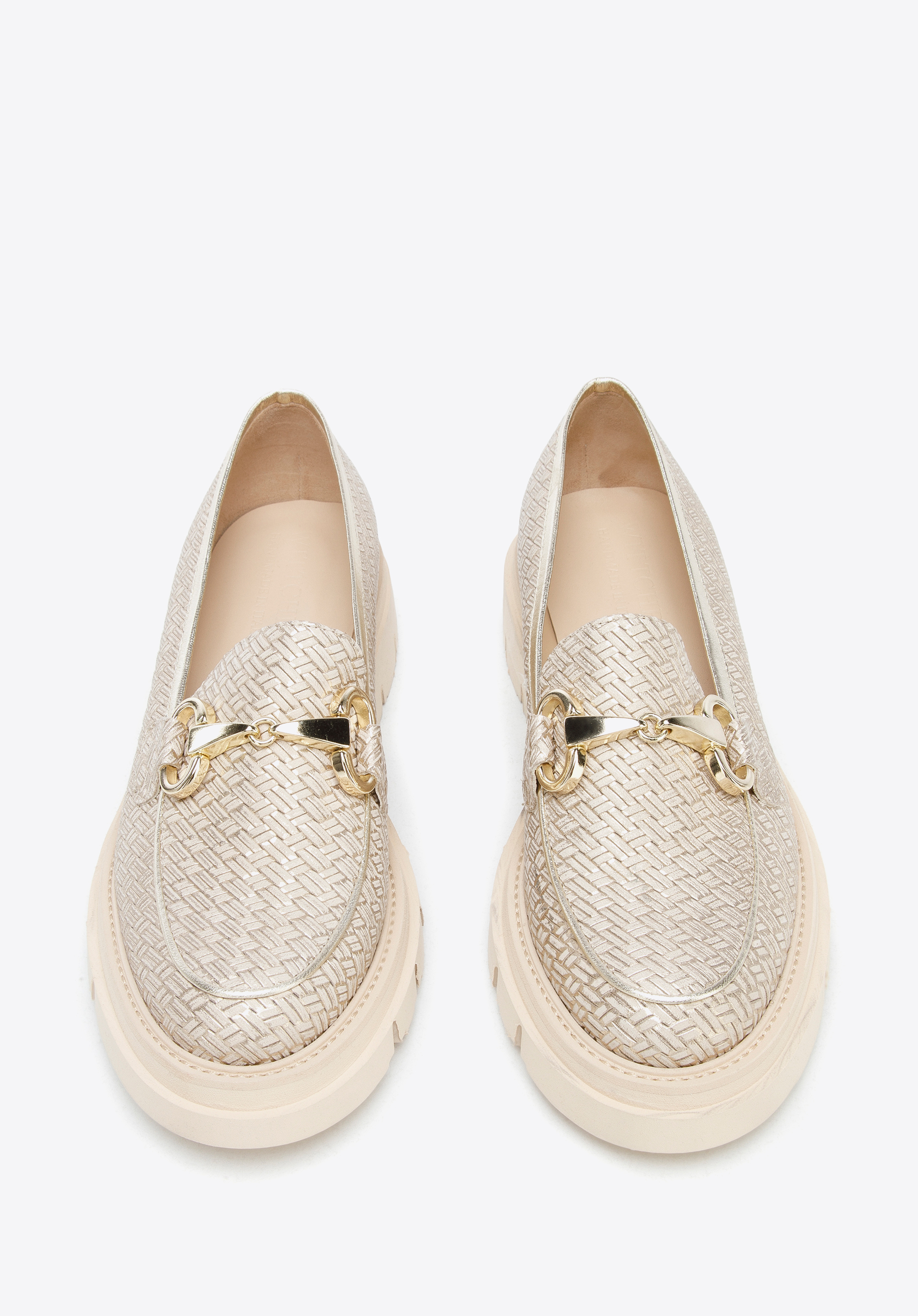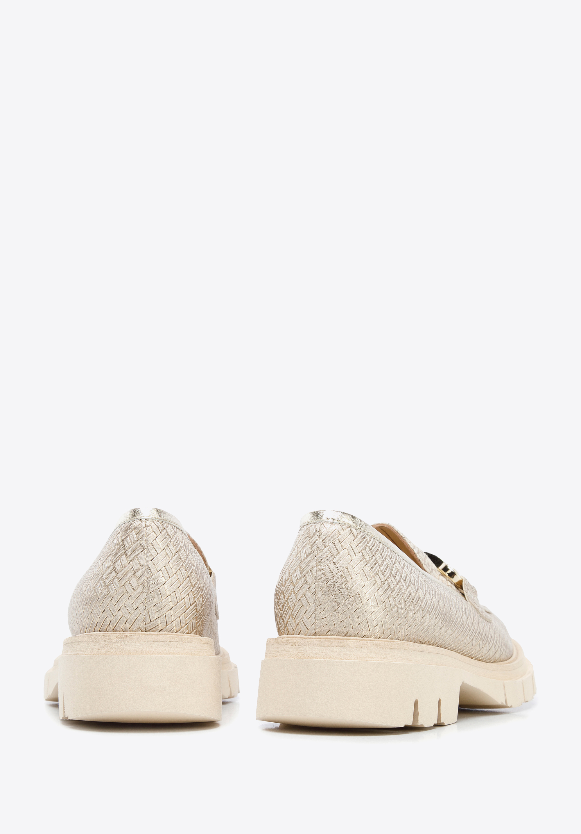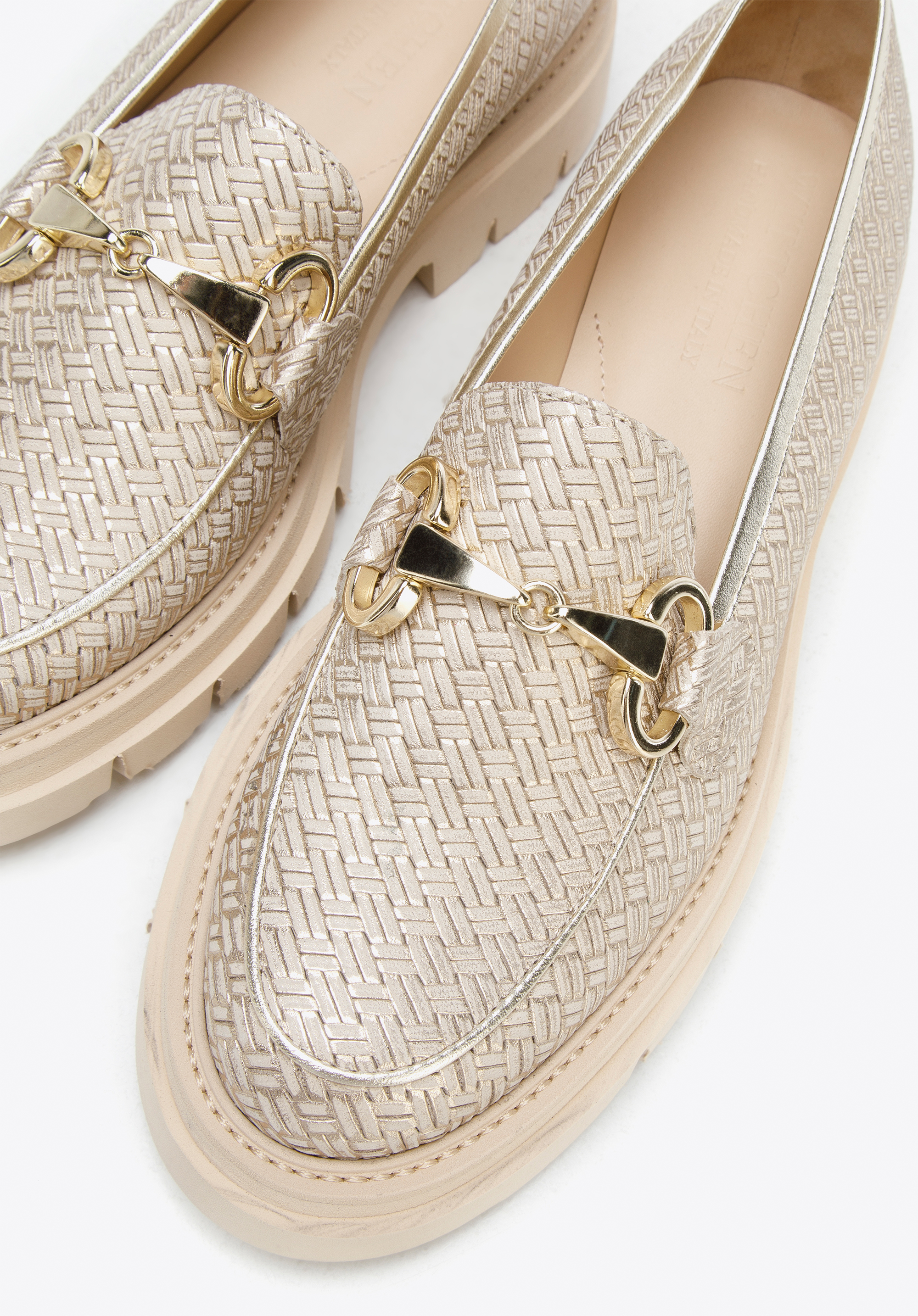 beige-goldene Mokassins für Damen aus glänzendem Leder mit Schnalle