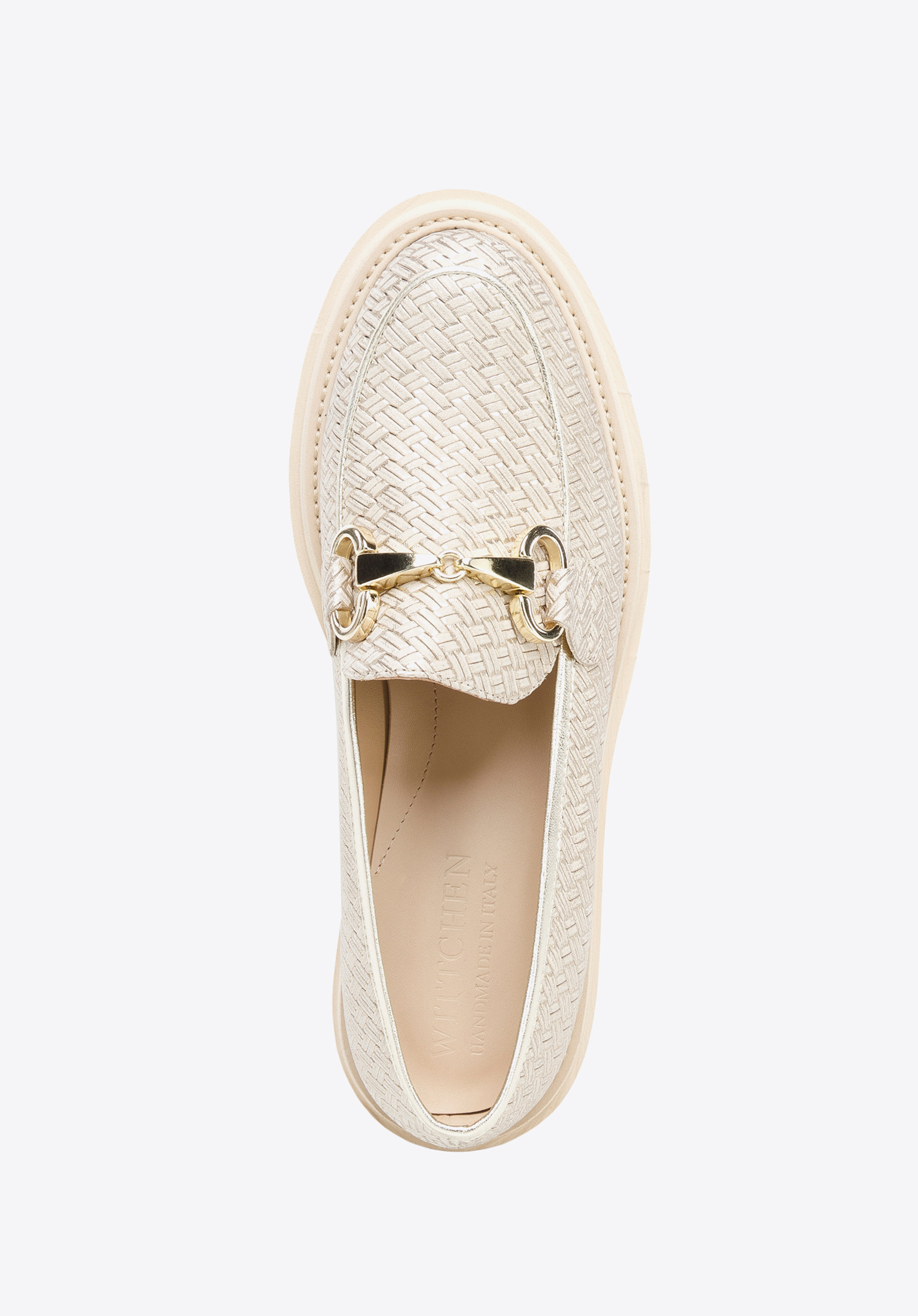 Mit diesen Mokassins sehen Sie jeden Tag besonders aus. Sie sind in Italien aus glänzendem Leder gefertigt, das sich sehr angenehm anfühlt. Außerdem ist dieses Modell mit der geflochtenen Textur verziert. Die glänzende Schnalle und die besetzte Schuhkappe runden den Look stilvoll ab. Diese Schuhe sind leicht, und dank des dicken Plateaus und der Innensohle aus Leder werden Sie stundenlang bequem darin laufen können. Sie sehen gut sowohl zu knöchellangen Hosen als auch zu einem luftigen Kleid aus. Die Mokassins für Damen aus glänzendem Leder mit Schnalle sind ein stilvolles Accessoire, das Sie jeden Tag tragen können.