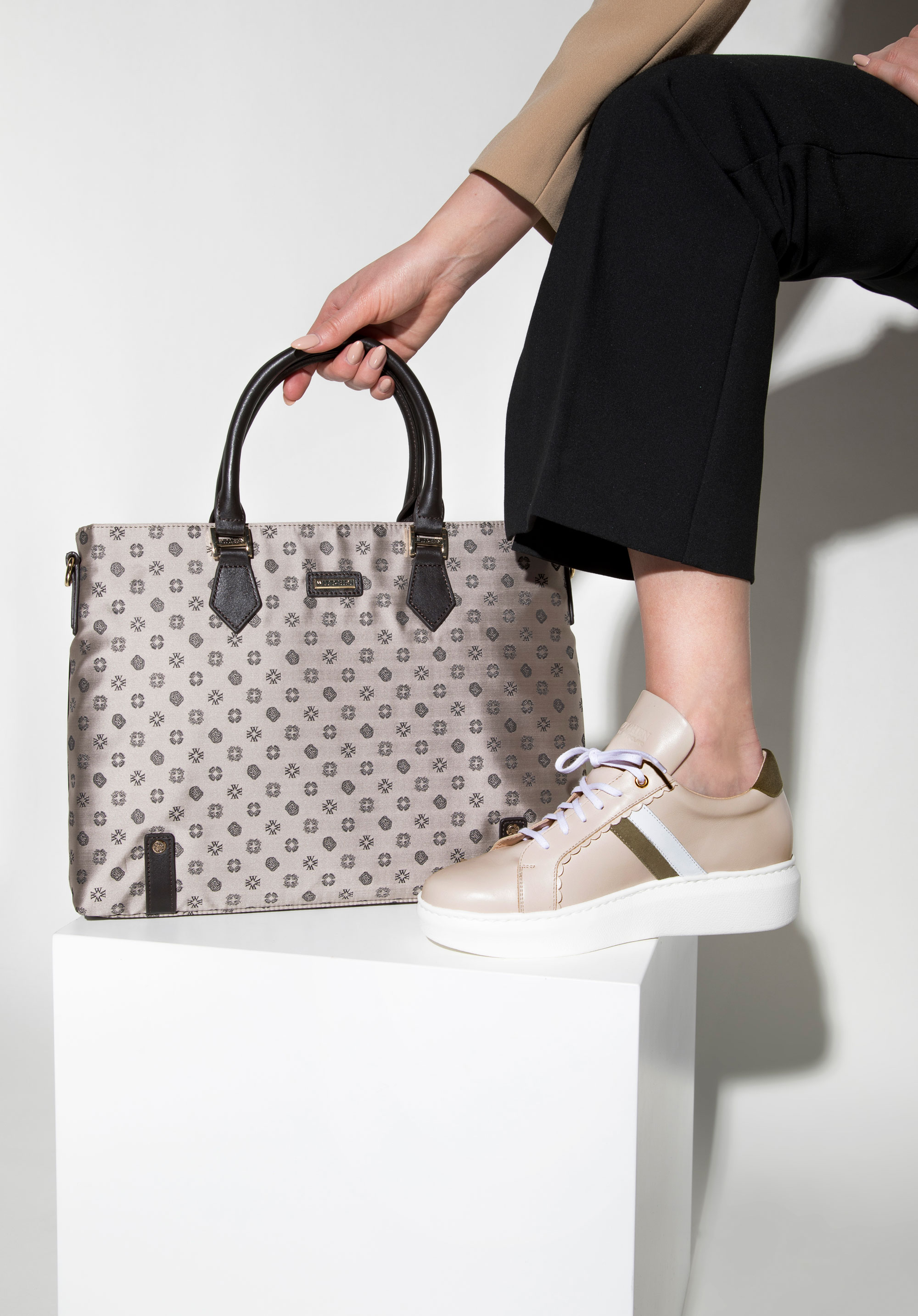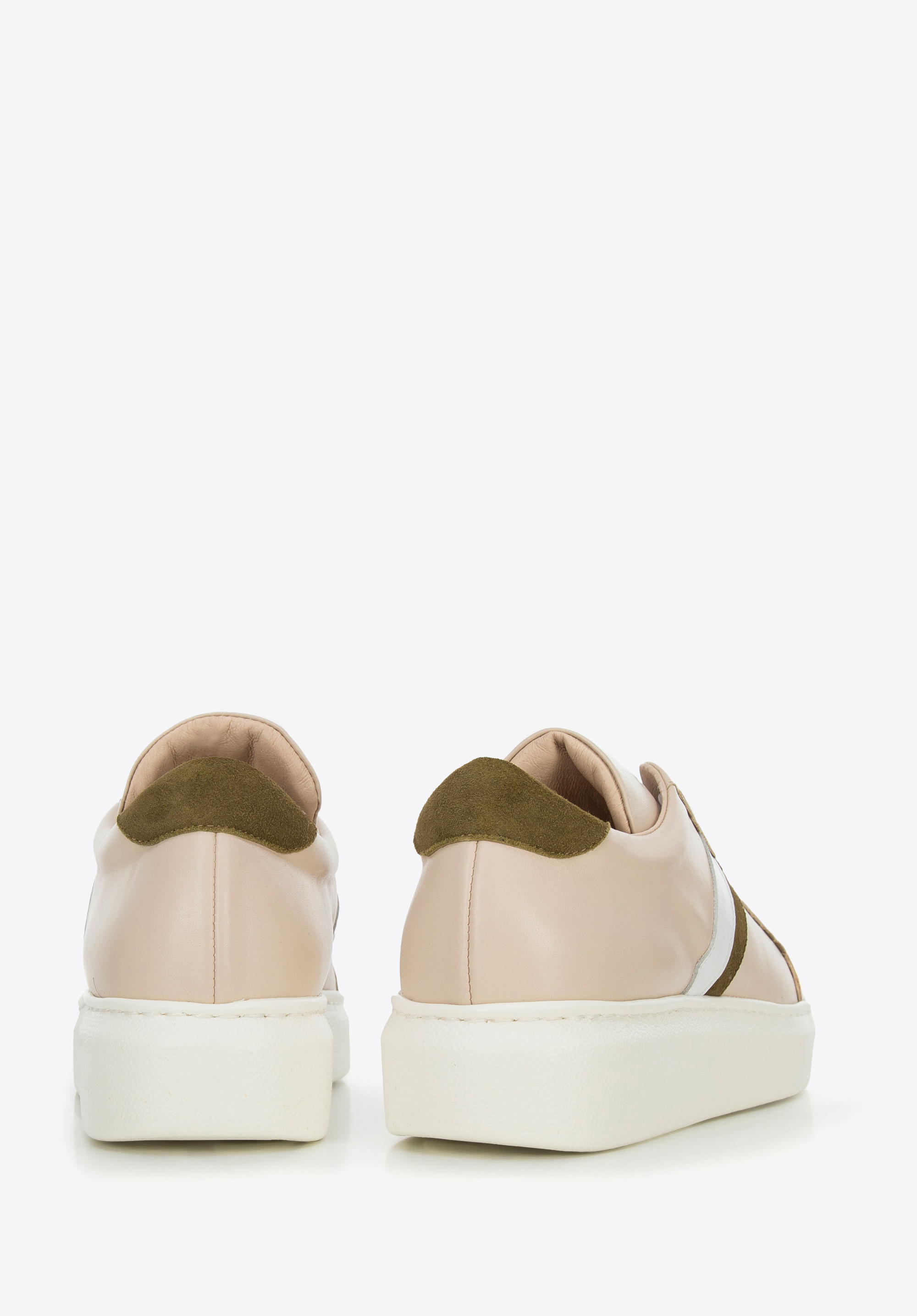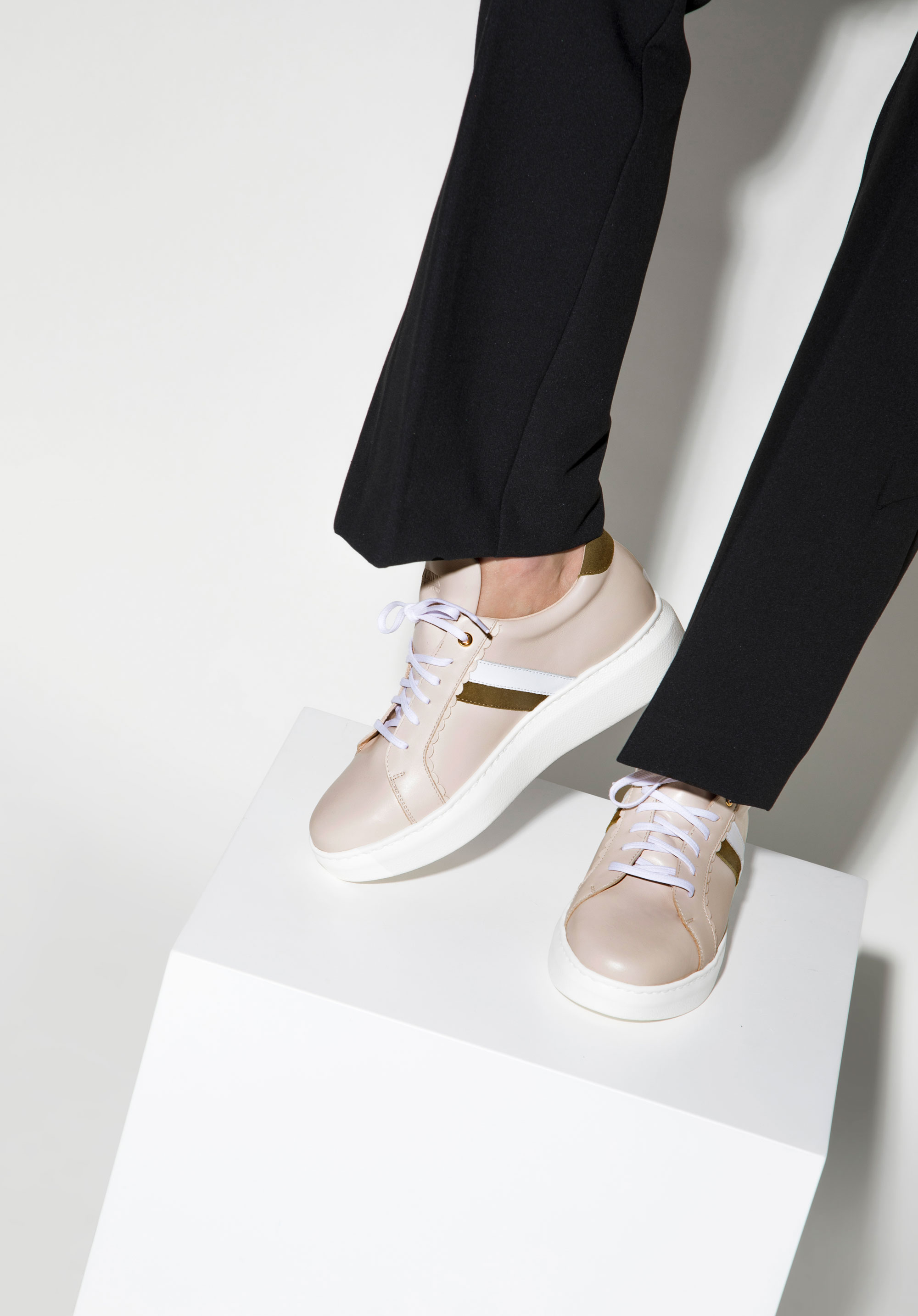 Diese stilvollen Damenschuhe beweisen, dass man nicht zwischen den Schick und Komfort wählen muss. Sie wurden in Polen aus hochwertigstem Leder gefertigt und passen sich dank der sorgfältigen Verarbeitung perfekt an Ihren Fuß an. Diese Sneakers haben eine klassische Form der Turnschuhe, die durch Details ergänzt wird: Rüsche aus Leder entlang der Schnürsenkel und kontrastierende Streifen an der Seite des Schafts. Die Fersenkappe ist sowohl innen als auch außen mit Wildleder gefüttert, was den Tragekomfort noch erhöht. Die dicke Sohle ist leicht und hat die richtige Höhe, um in den Schuhen bequem durch den Tag zu gehen. Sneakers für Damen aus Leder mit Rüsche sind schlichte und originelle Schuhe für viele Gelegenheiten.