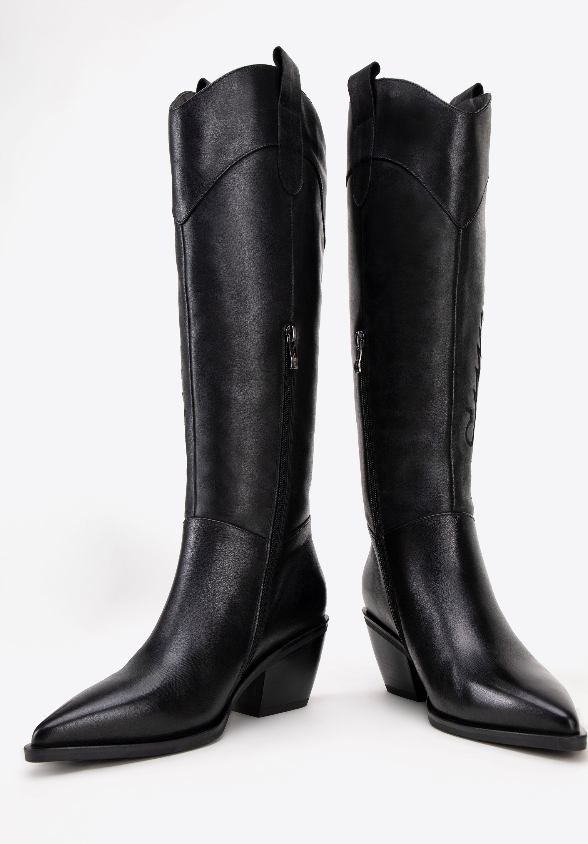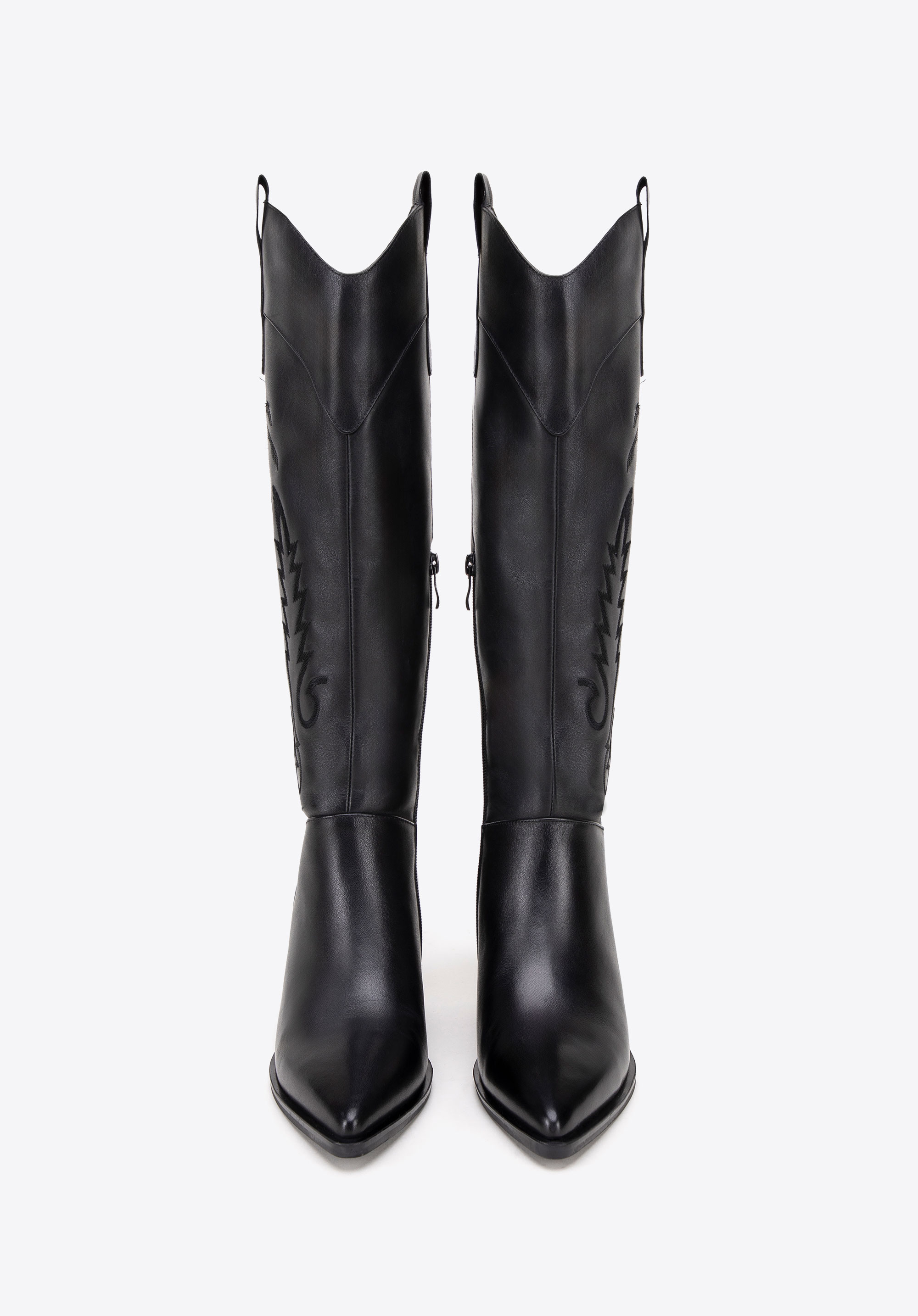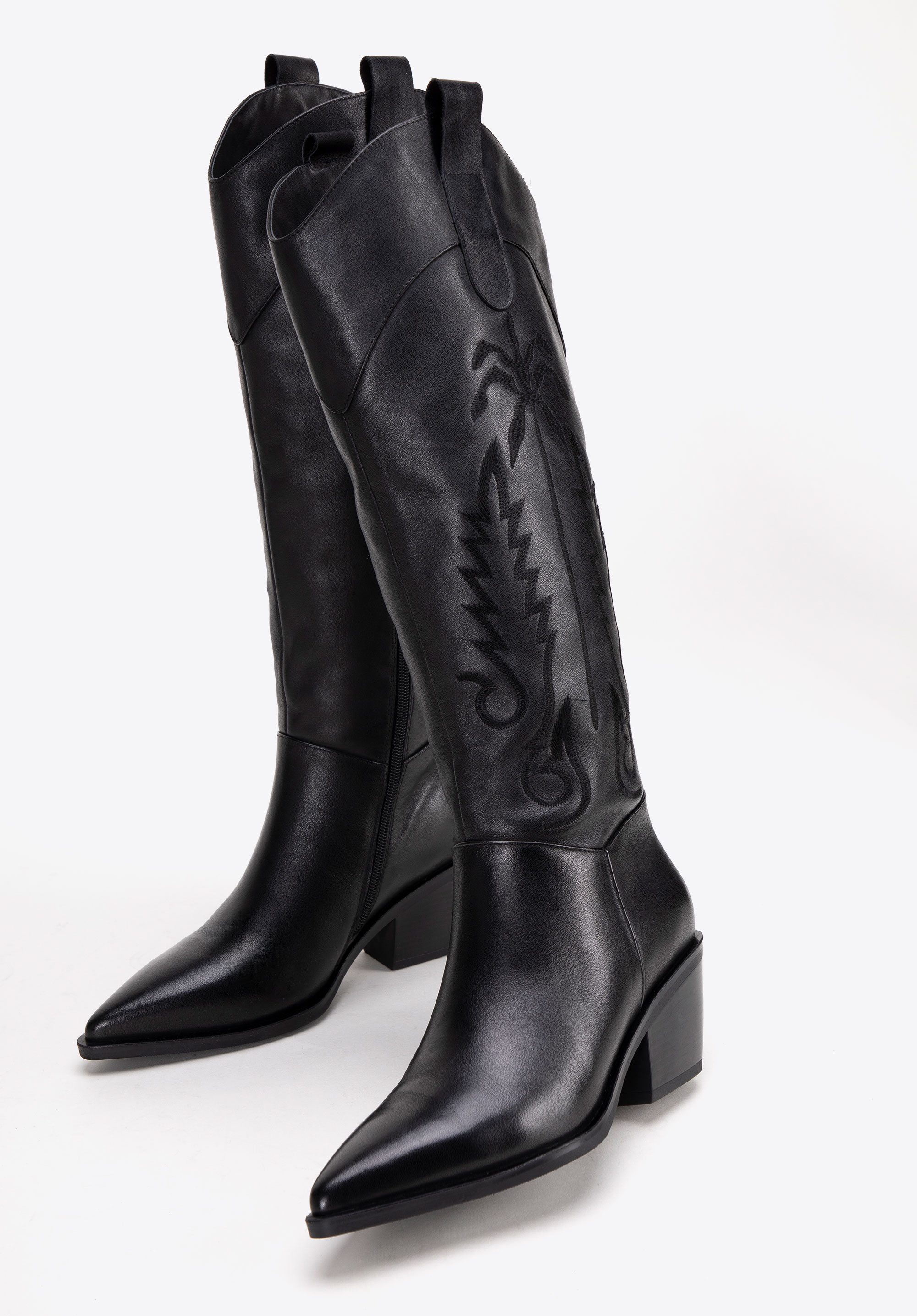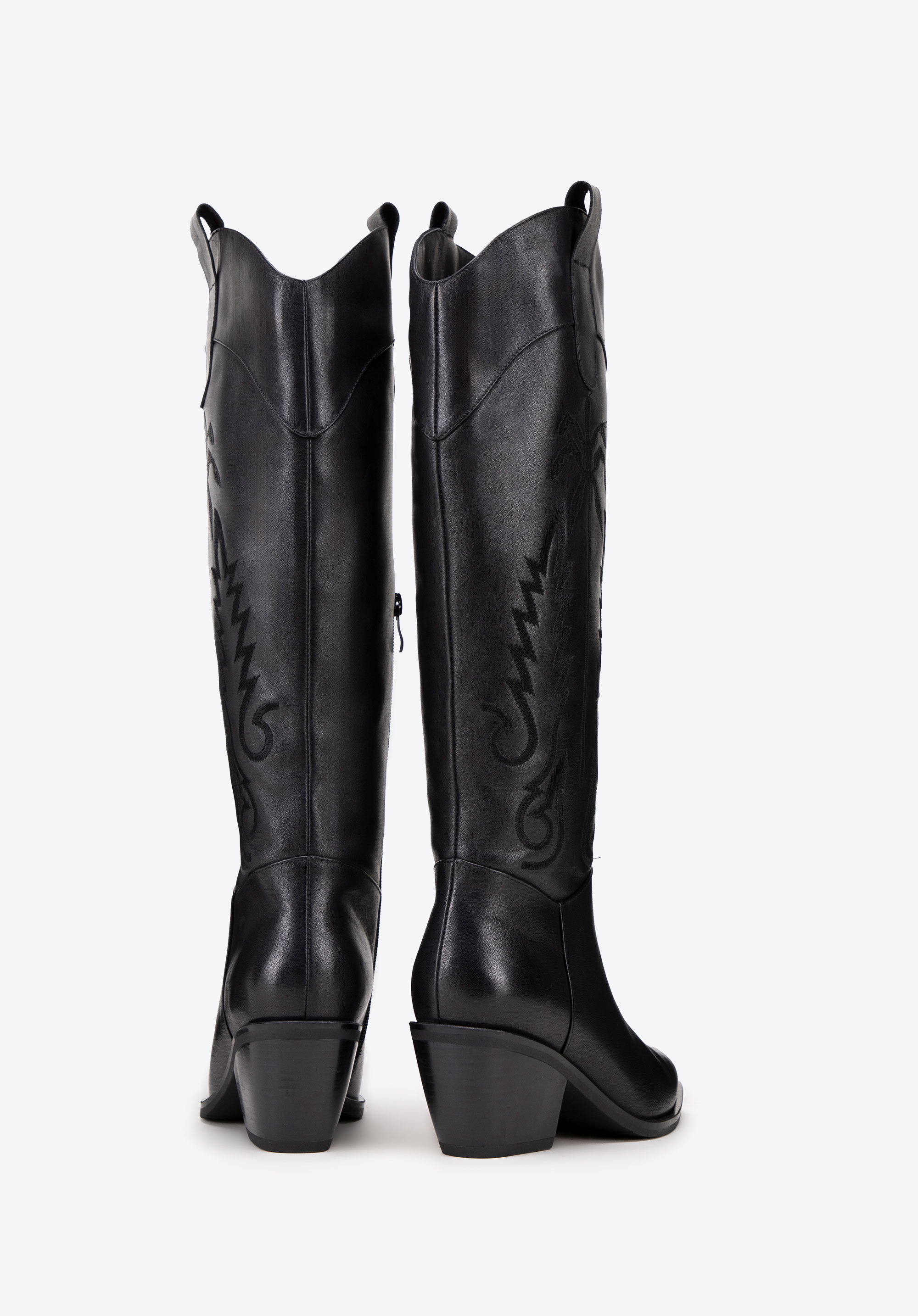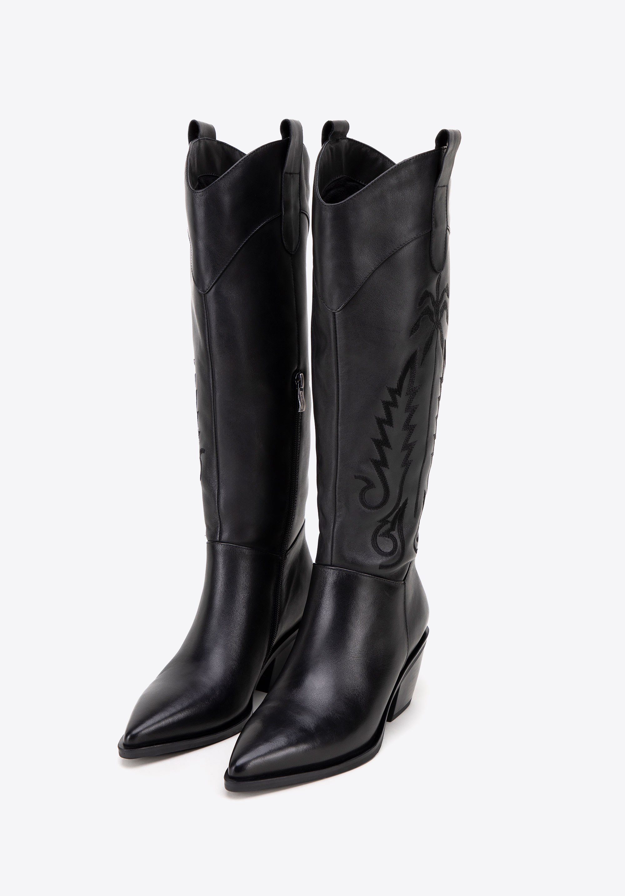 Werten Sie Ihren Stil mit unseren Cowboystiefeln für Damen auf. Diese außergewöhnlichen Schuhe sind die perfekte Wahl für Frauen, die Eleganz mit modernem Flair verbinden möchten. Diese Stiefel mit Blockabsatz sind aus Naturleder höchster Qualität gefertigt . Ein stabiler Blockabsatz sorgt dafür, dass Sie den ganzen Tag darin bleiben können. Abgerundet mit einer raffinierten Stickerei am Schaft , spitz zulaufend Zehenpartie und praktische und einfache Anziehschlaufen an den Seiten.