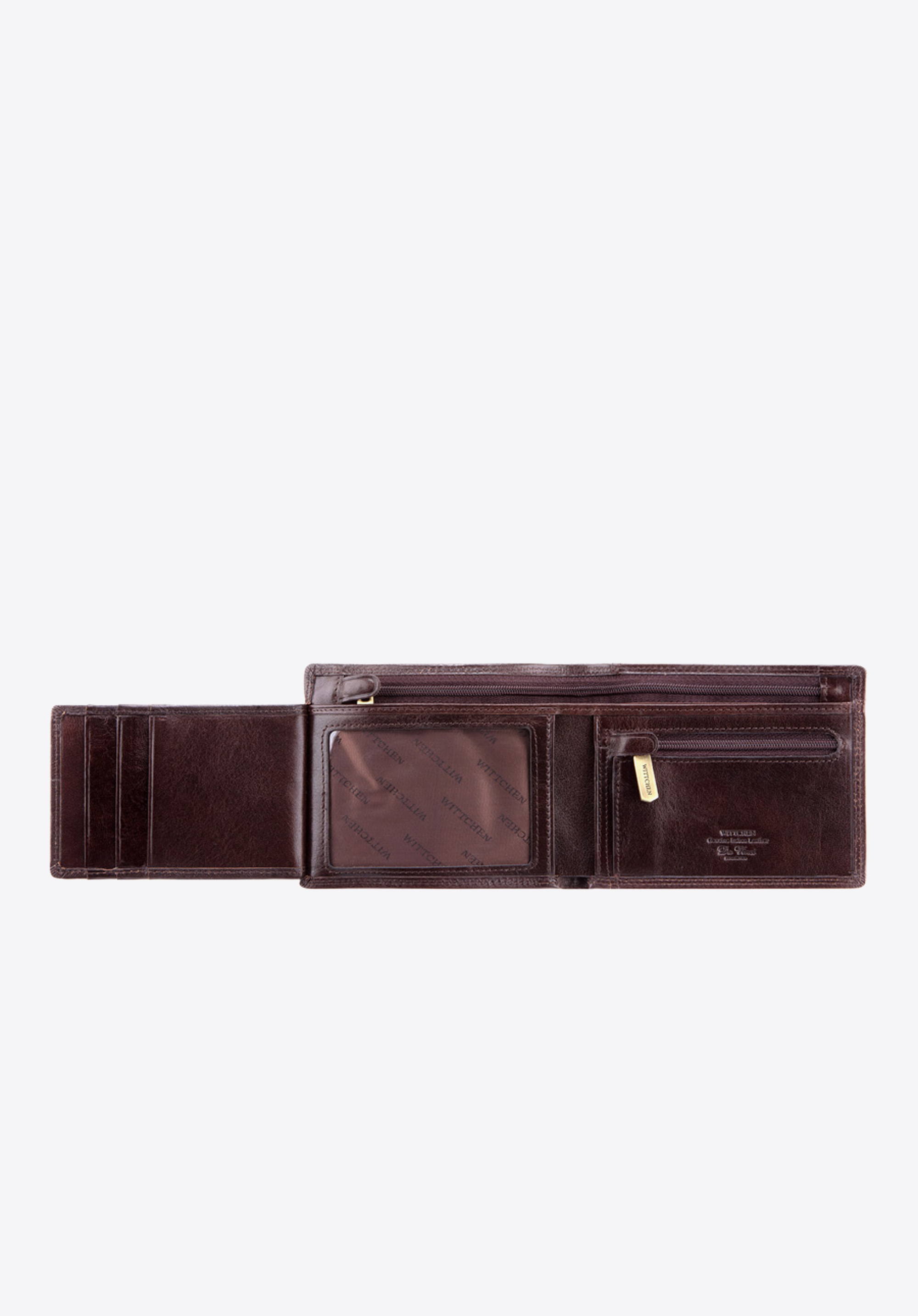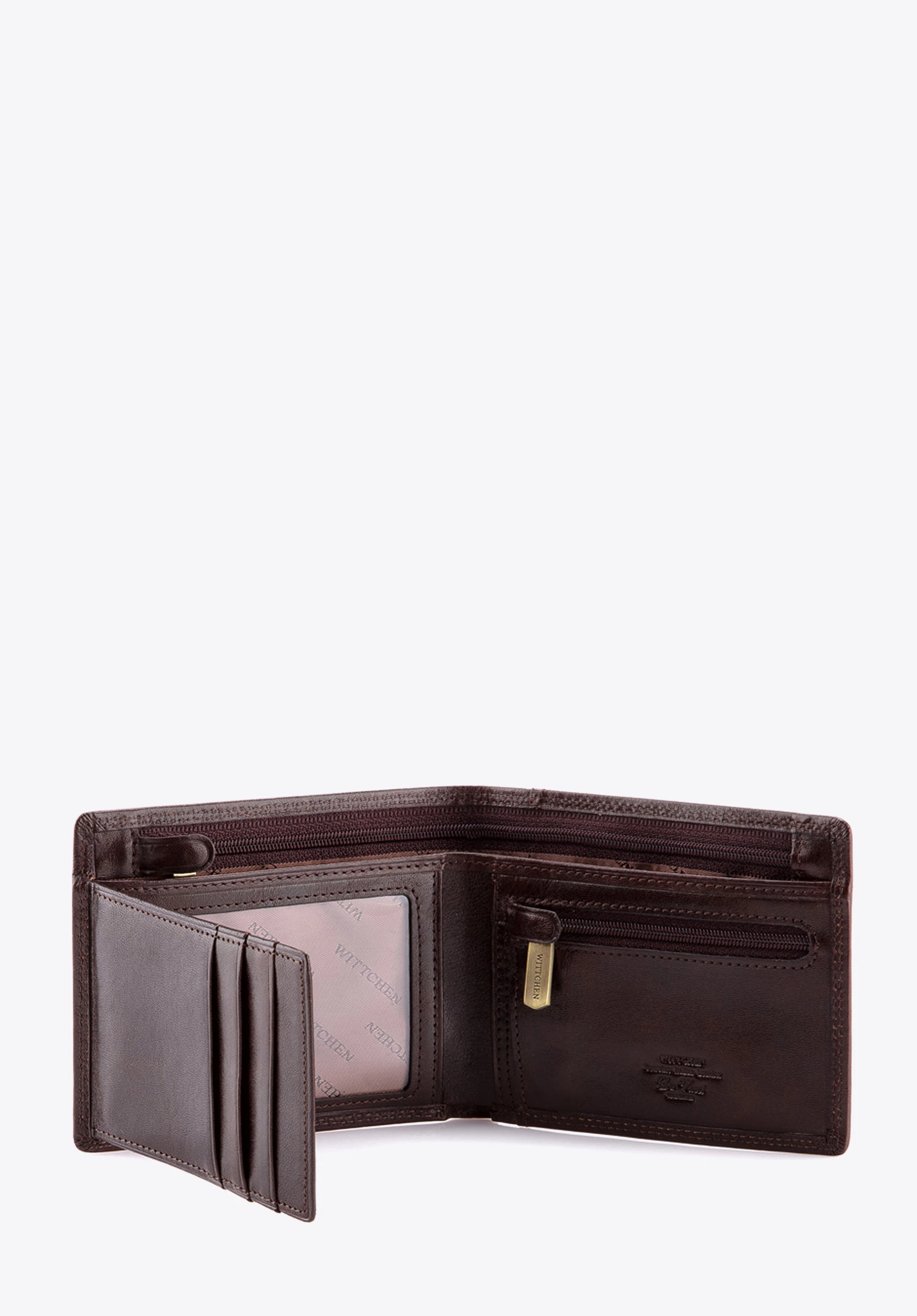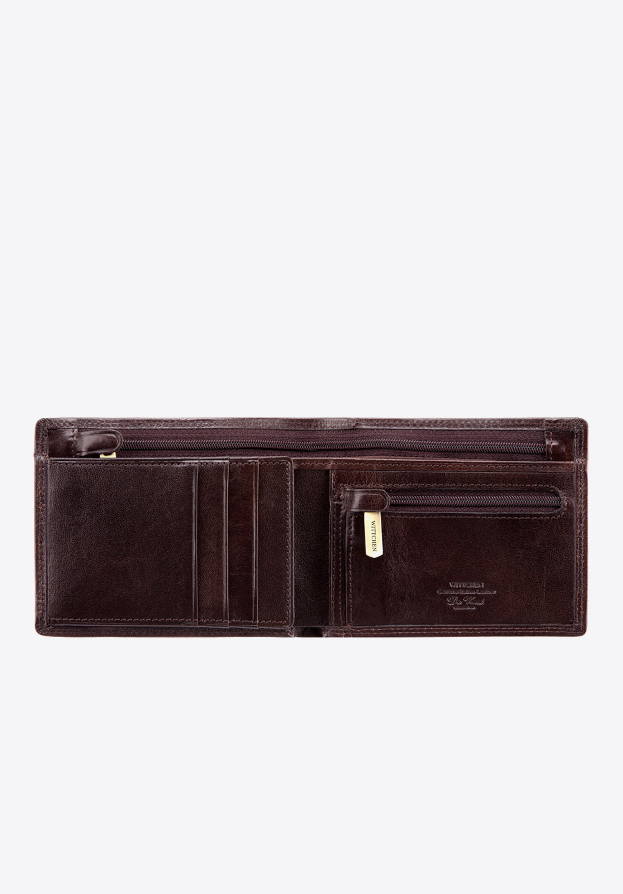 Mittlere Geldbörse für Herren. Handgearbeitet aus Spitzenqualität Kalbsleder. Sorgfältige und elegante Fertigstellung. Logo - Firmeninitialien auf einem Wappenschild in einer altgoldenen Farbe. Lieferung erfolgt in exklusiver Verpackung mit signiertem WITTCHEN-Logo.