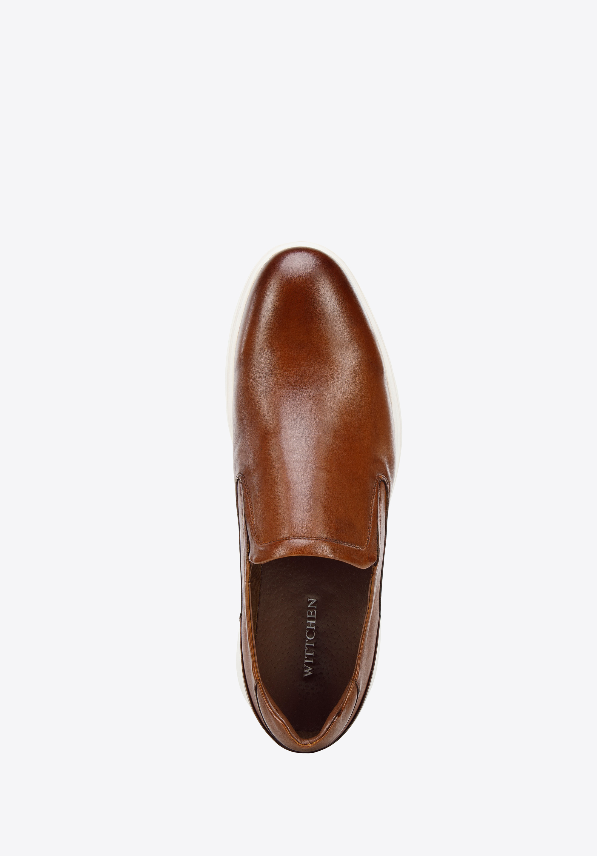 Dieses Modell wird ideal für Sie, wenn Sie schlichte und bequeme Schuhe suchen. Diese Schuhe passen zu den meisten Kleidungsstücken in Ihrem Kleiderschrank und zu vielen Gelegenheiten. Sie verbinden die Eleganz mit sportlichem Stil. Die Schuhe haben die moderne Sohle ohne markierten Absatz. Dank der versteckten Gummizüge können Sie sie ganz einfach anziehen. Sie sind aus hochwertigem Leder gefertigt, das bei richtiger Pflege viele Jahre lang gut aussehen wird. Die Herrenschuhe aus Glattleder passen sowohl zur eleganten Freizeitkleidung als auch zu lässigen Chino Hosen und T-Shirt.
