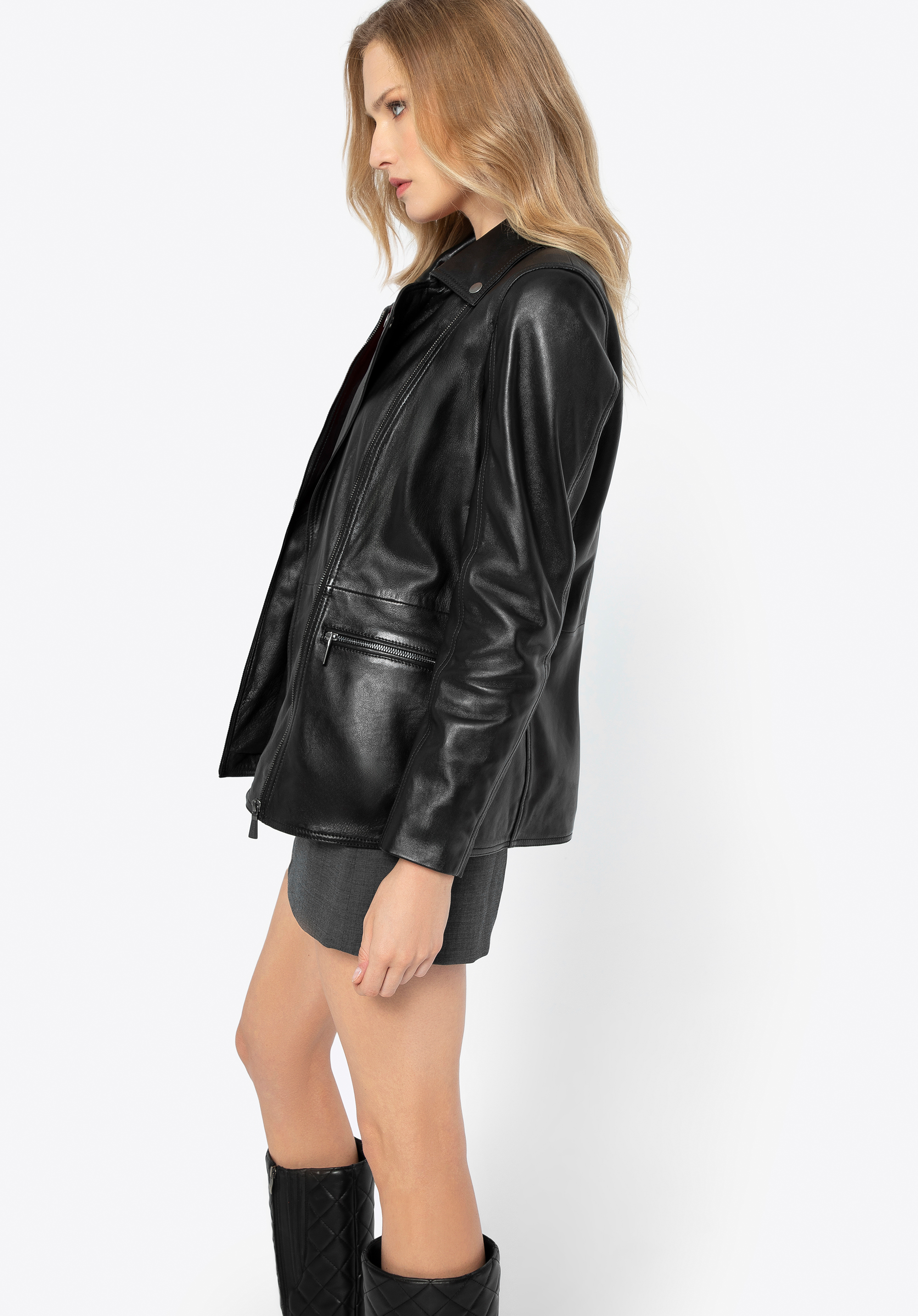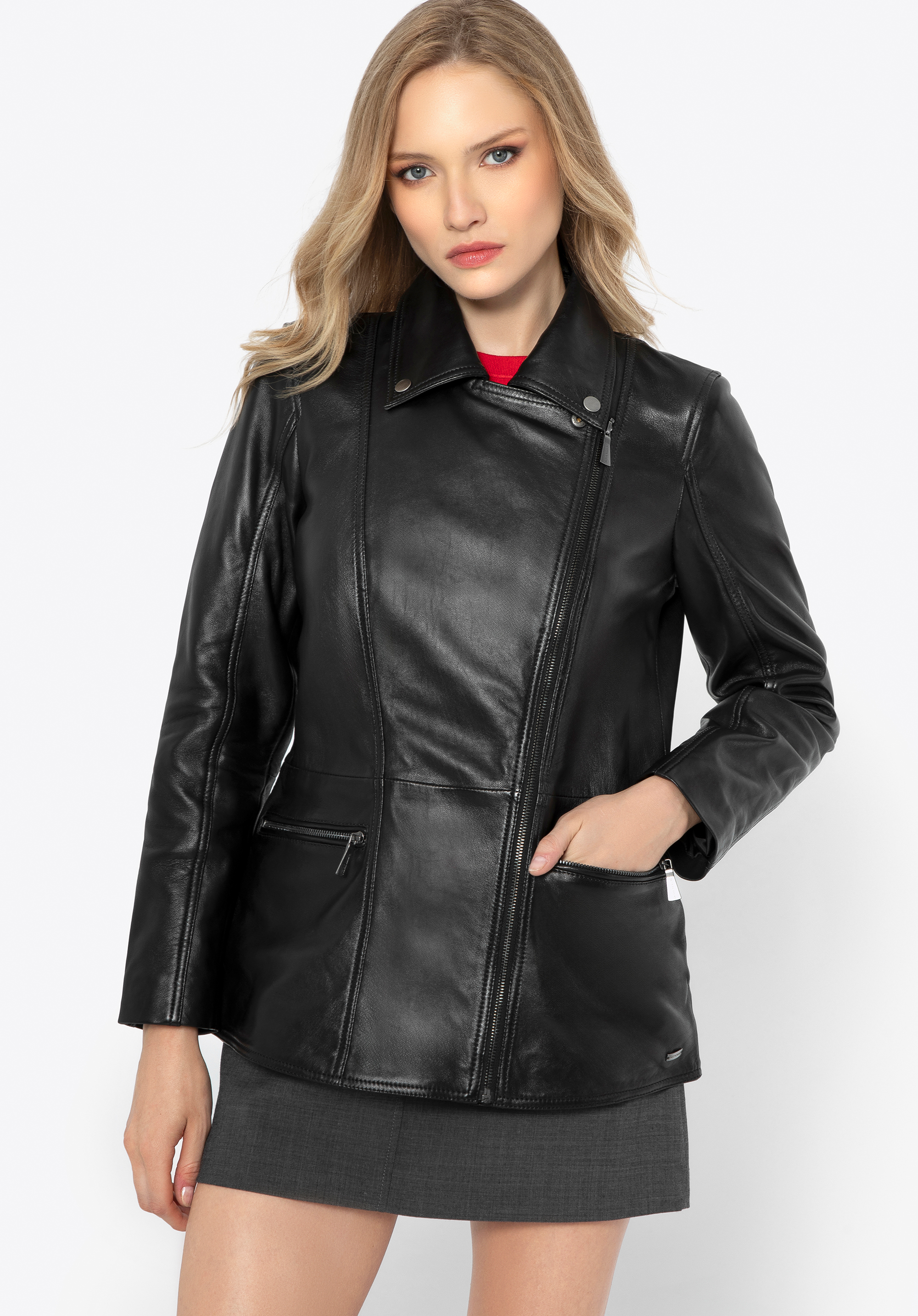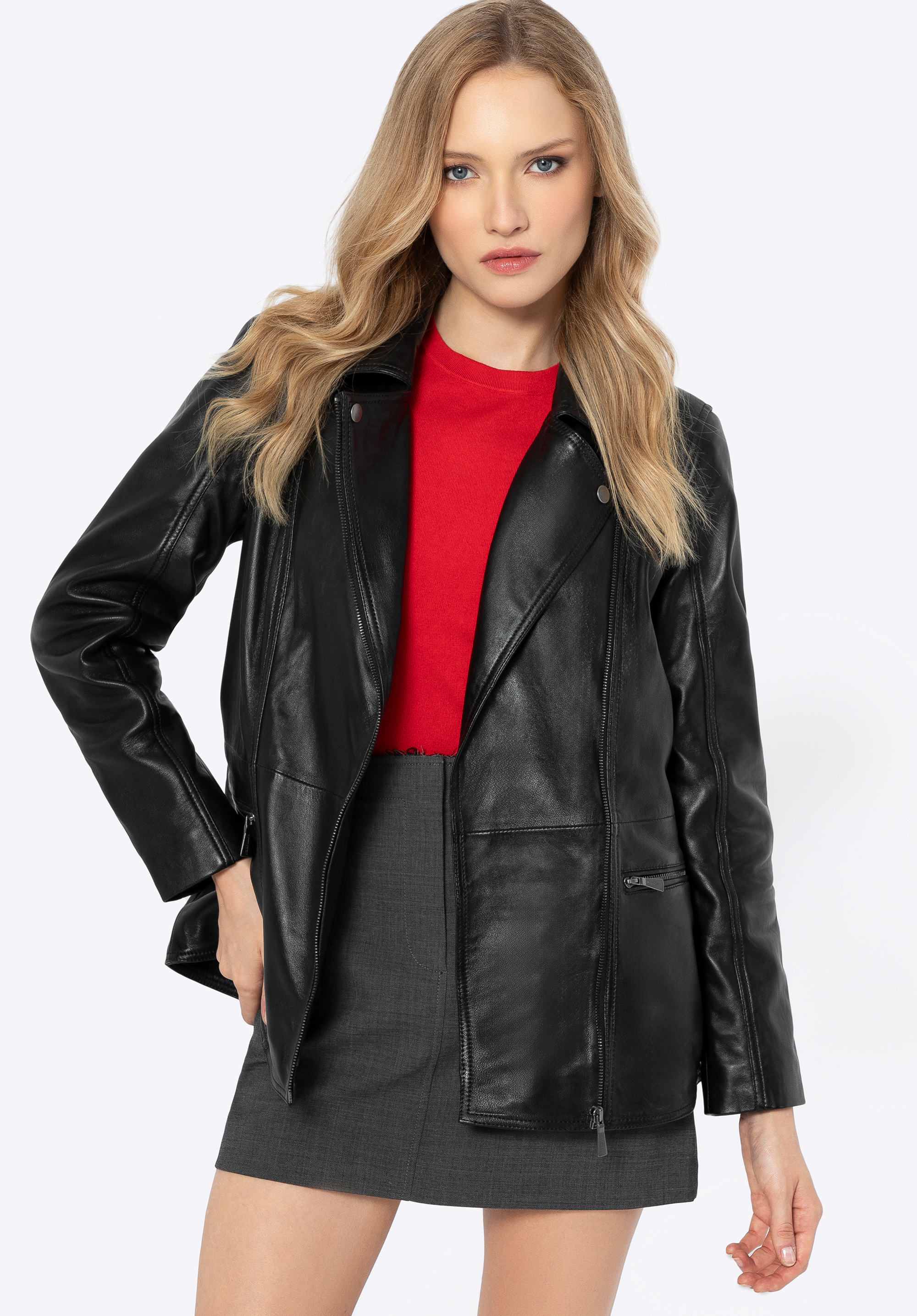 Diese Jacke ist ein zeitloses Symbol für Unabhängigkeit und Mut und ein unverzichtbares Element der Modekollektion jeder modernen Frau. Die Leder-Bikerjacke ist die perfekte Wahl für Frauen, die Einfachheit und klassischen Stil schätzen. Ein Reverskragen, ein diagonaler Metallreißverschluss und lange, gerade Ärmel sind die charakteristischen Merkmale dieses Designs . Die Jacke ist aus weichem Schafsleder höchster Qualität gefertigt und sorgt für Komfort und Tragekomfort. Die Bikerjacke passt gut zu verschiedenen Outfits – von lässig bis elegant.