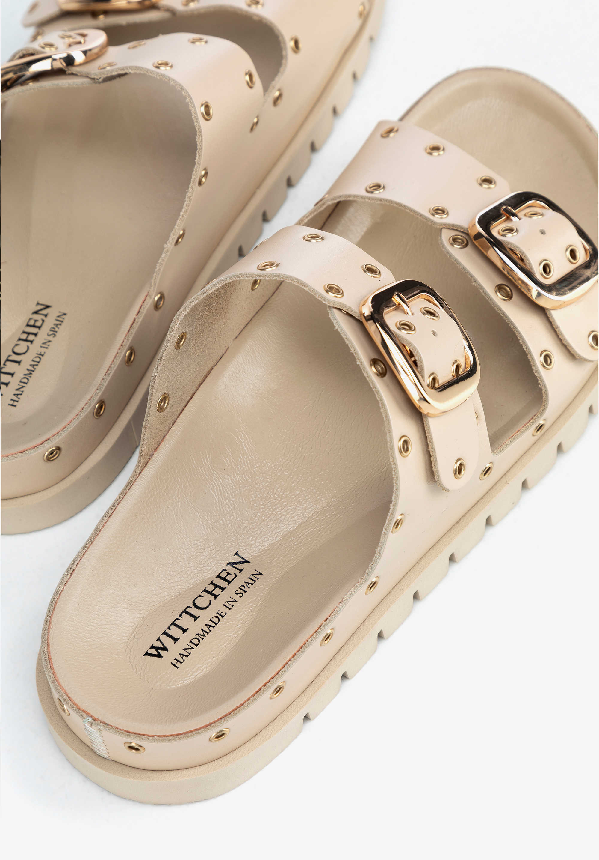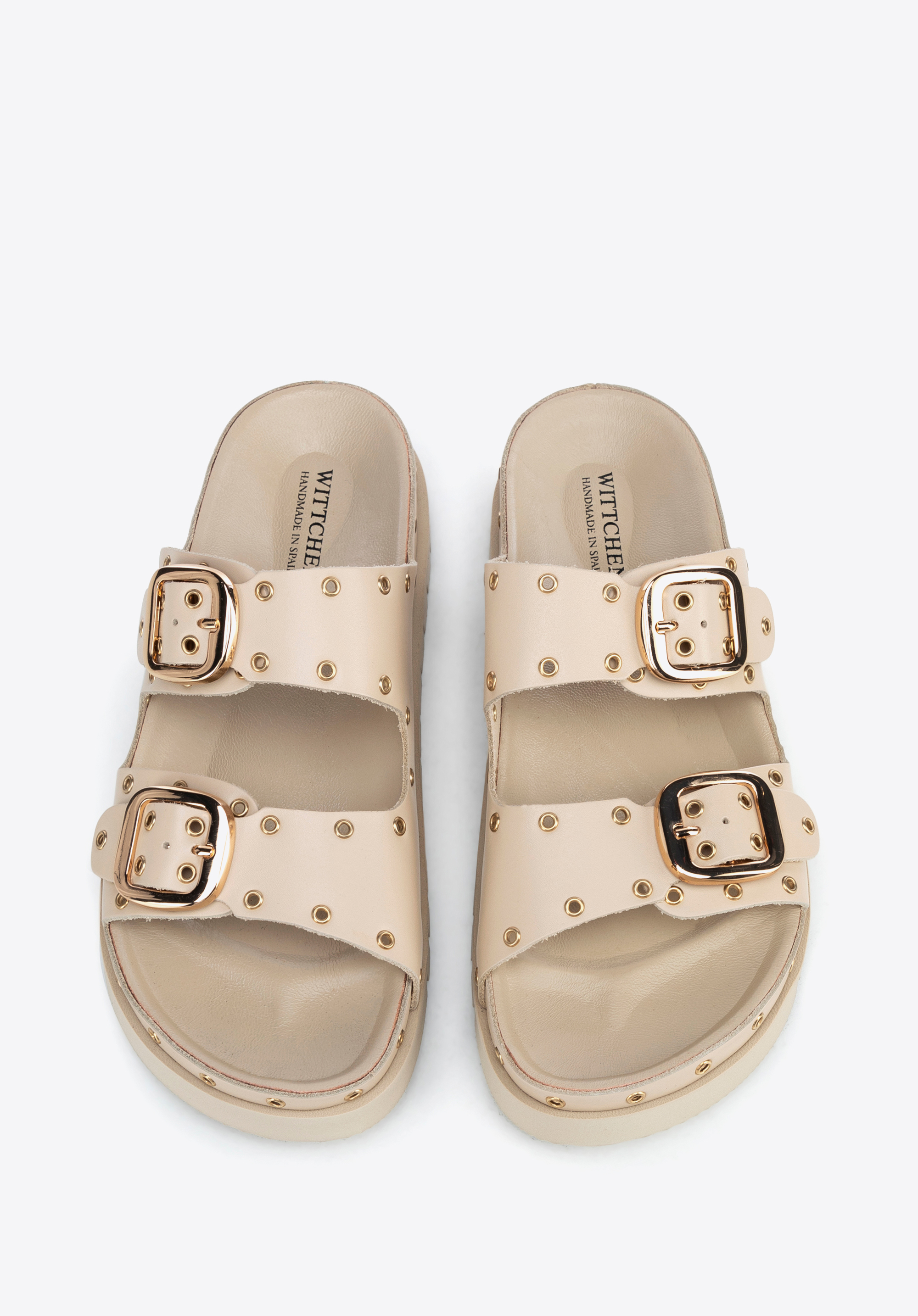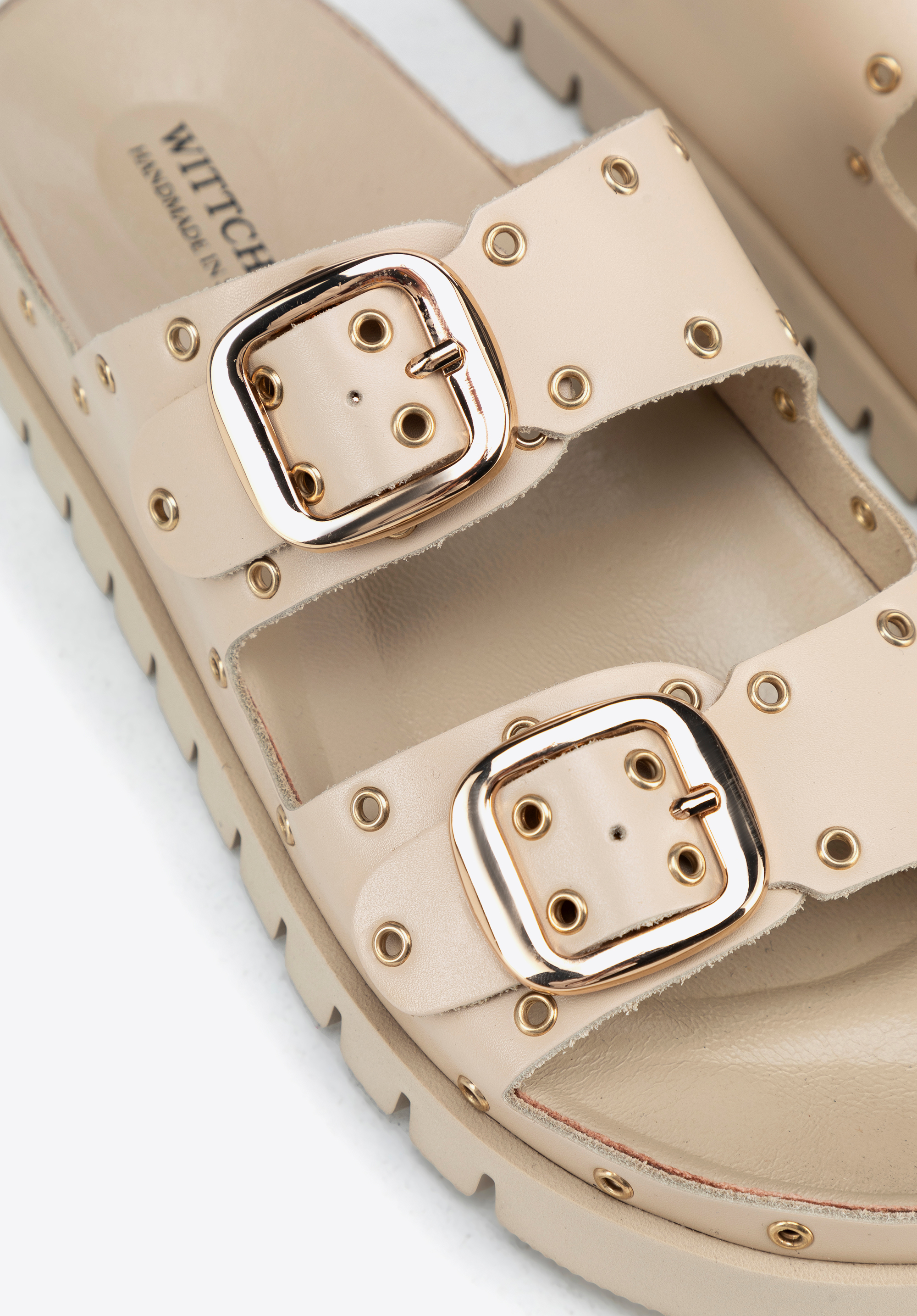 Damen-Flip-Flops aus Leder mit Metall-Details beige-gold