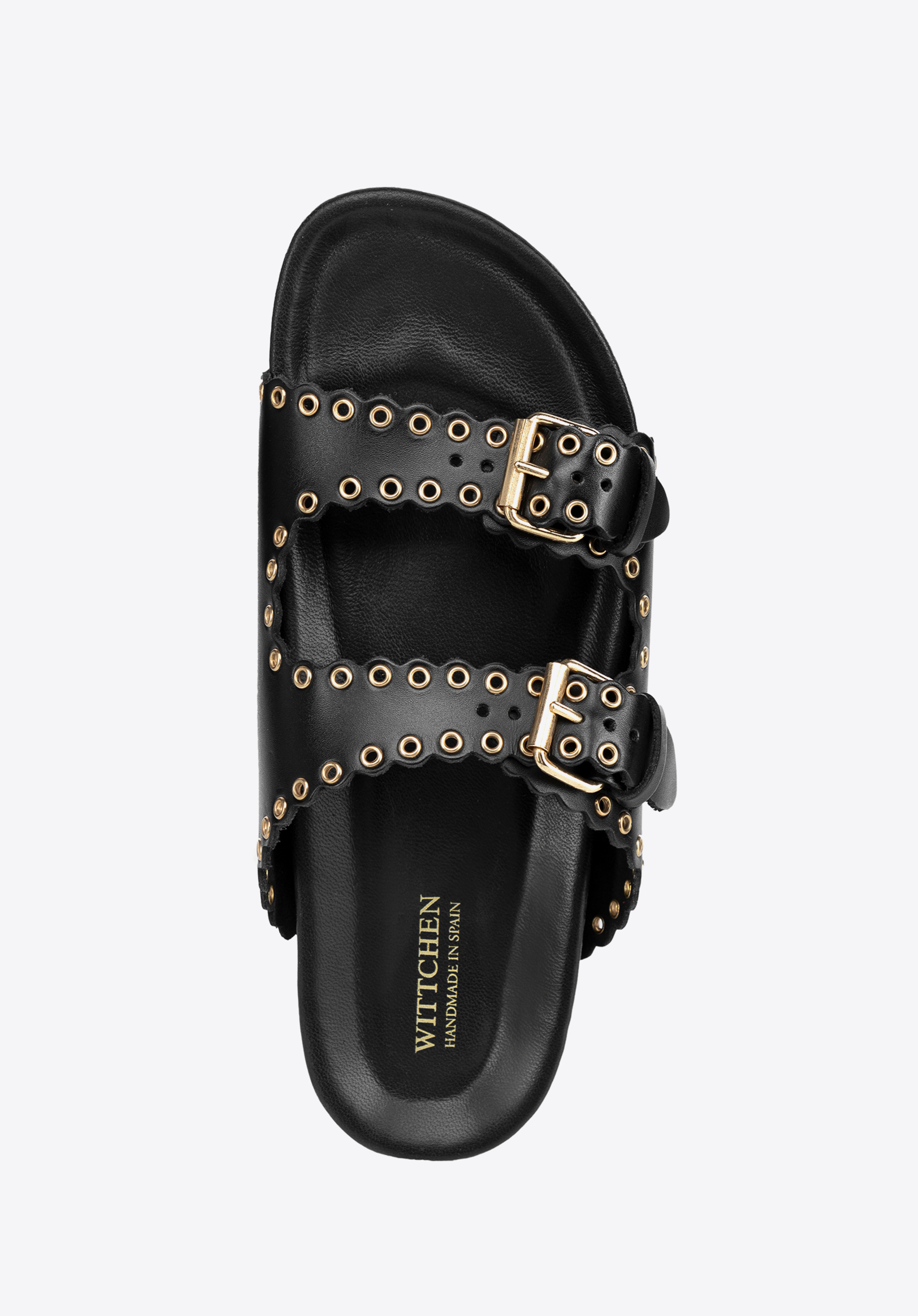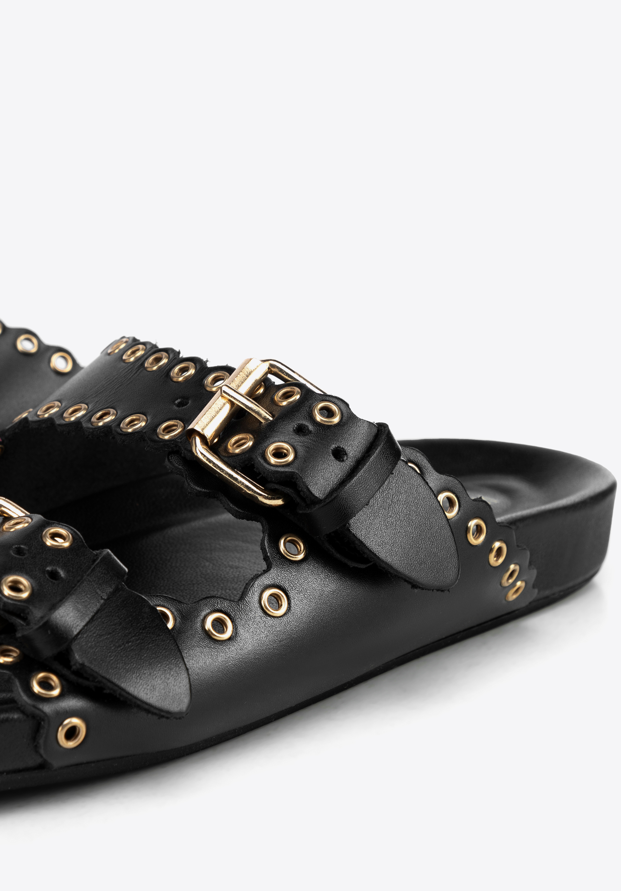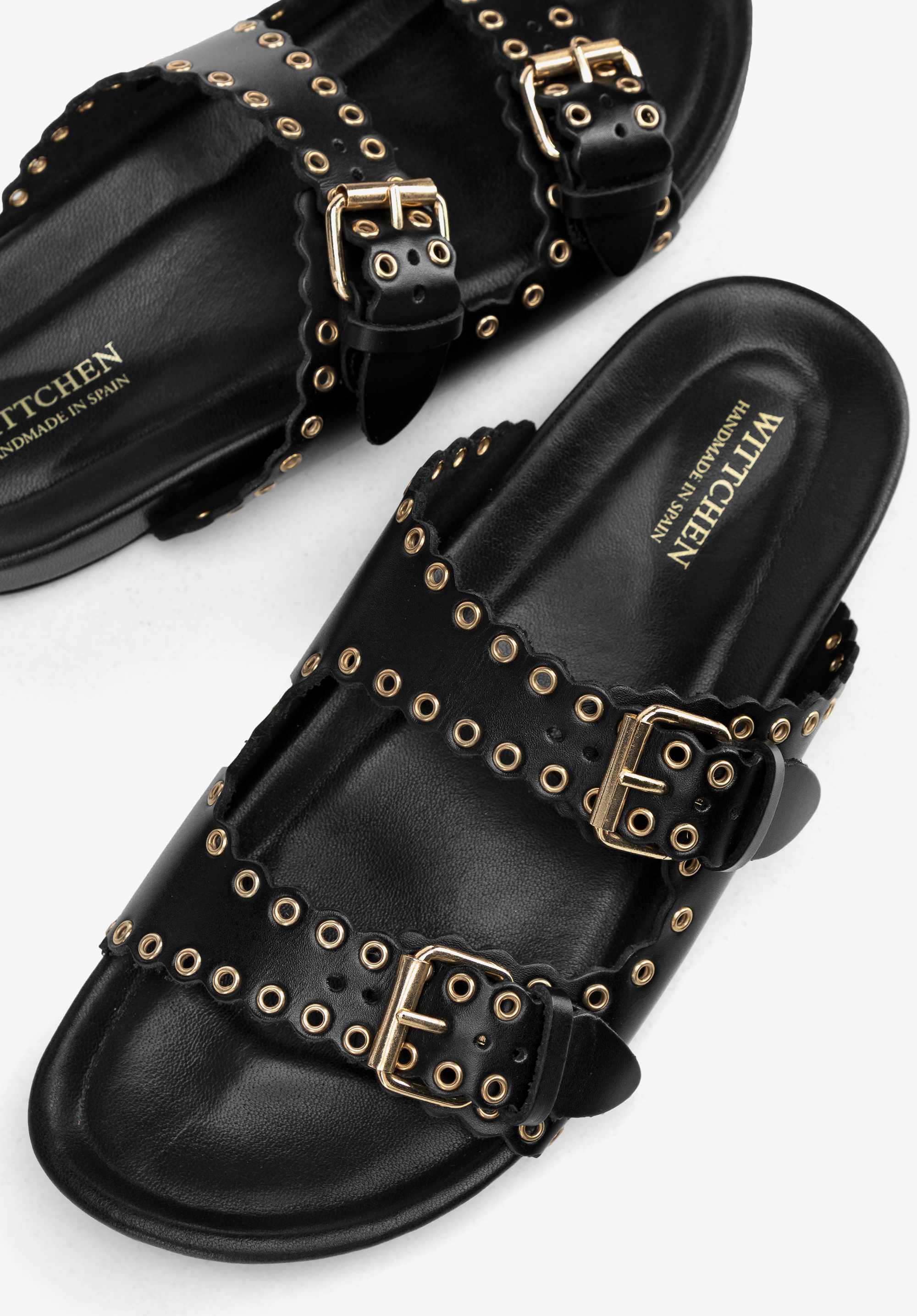 Leicht, feminin und voller Charakter – diese Damen-Sandalen zum Hineinschlüpfen sind die perfekte Wahl für warme Tage! Sie werden in Spanien aus natürlichem Vollnarbenleder hergestellt und verbinden subtile Eleganz mit mühelosem Sommerstil. Ihr einzigartiges Design zeichnet sich durch zwei breite Riemen mit Metalldetails aus, die für eine unverwechselbare Note sorgen. Verstellbare Schnallen sorgen für eine perfekte Passform, während die Slip-On-Konstruktion sie unglaublich einfach zu tragen macht. Die mandelförmige Zehenpartie verlängert den Fuß dezent, während das weiche Futter und die Innensohle ganztägigen Komfort bieten.