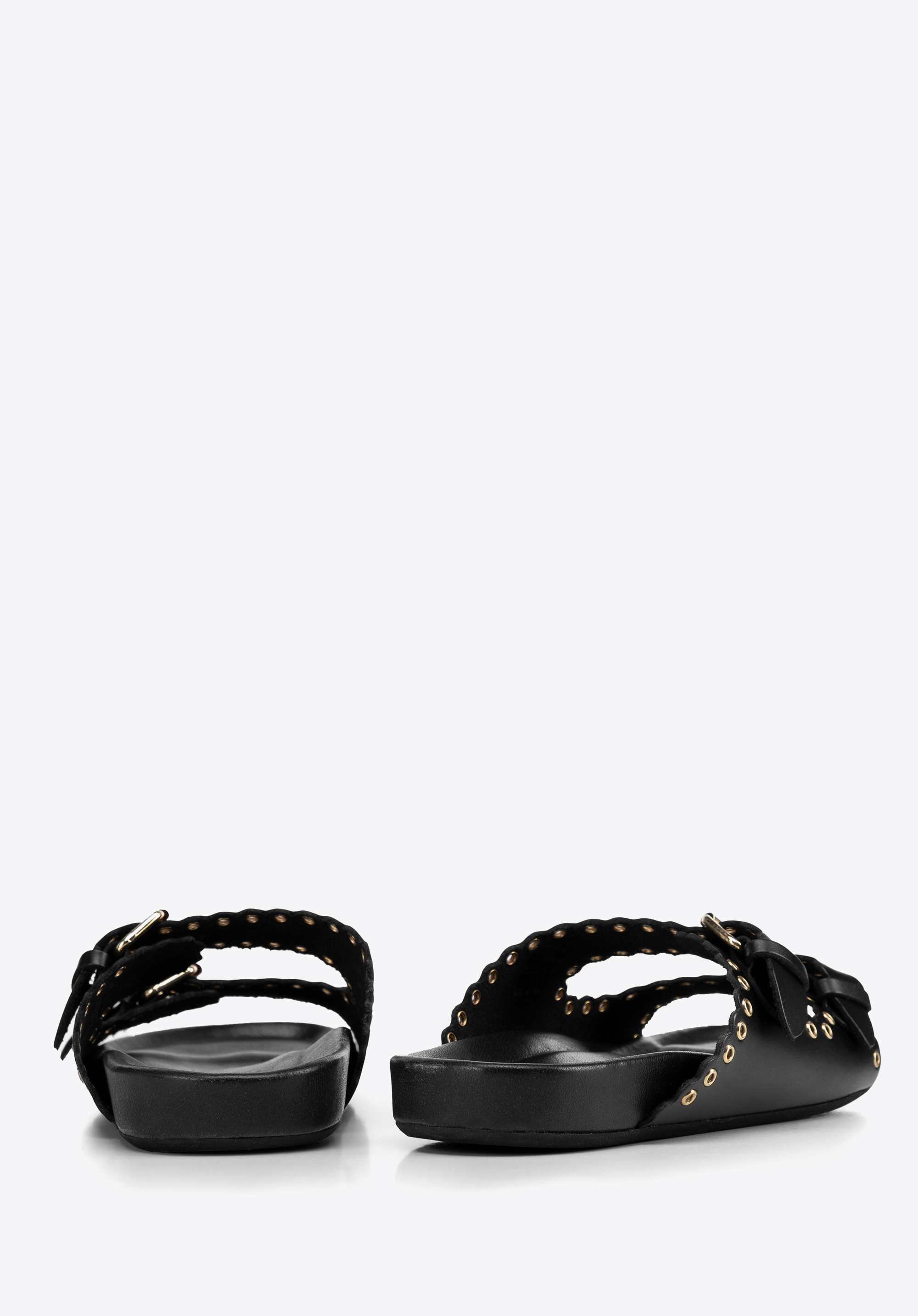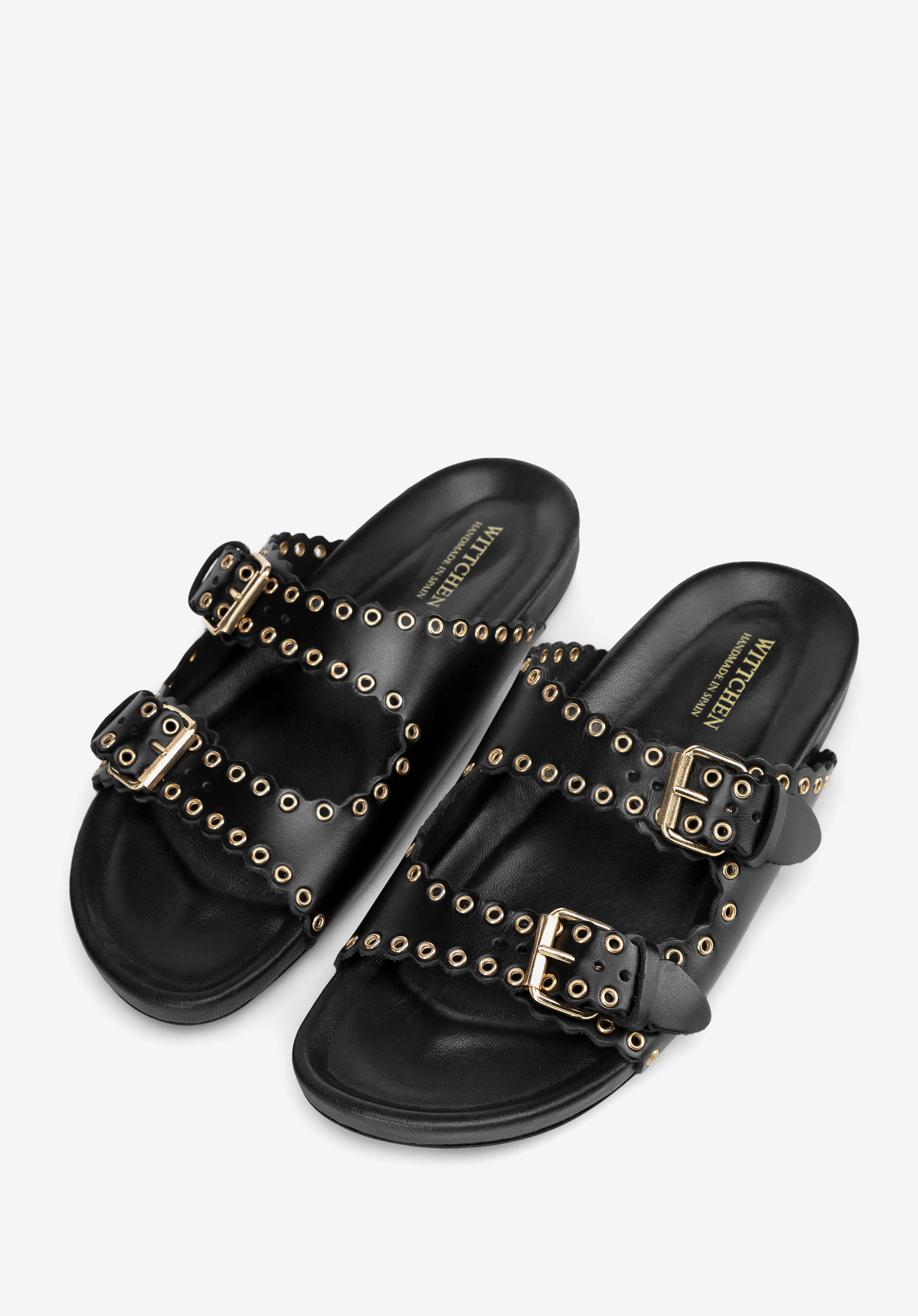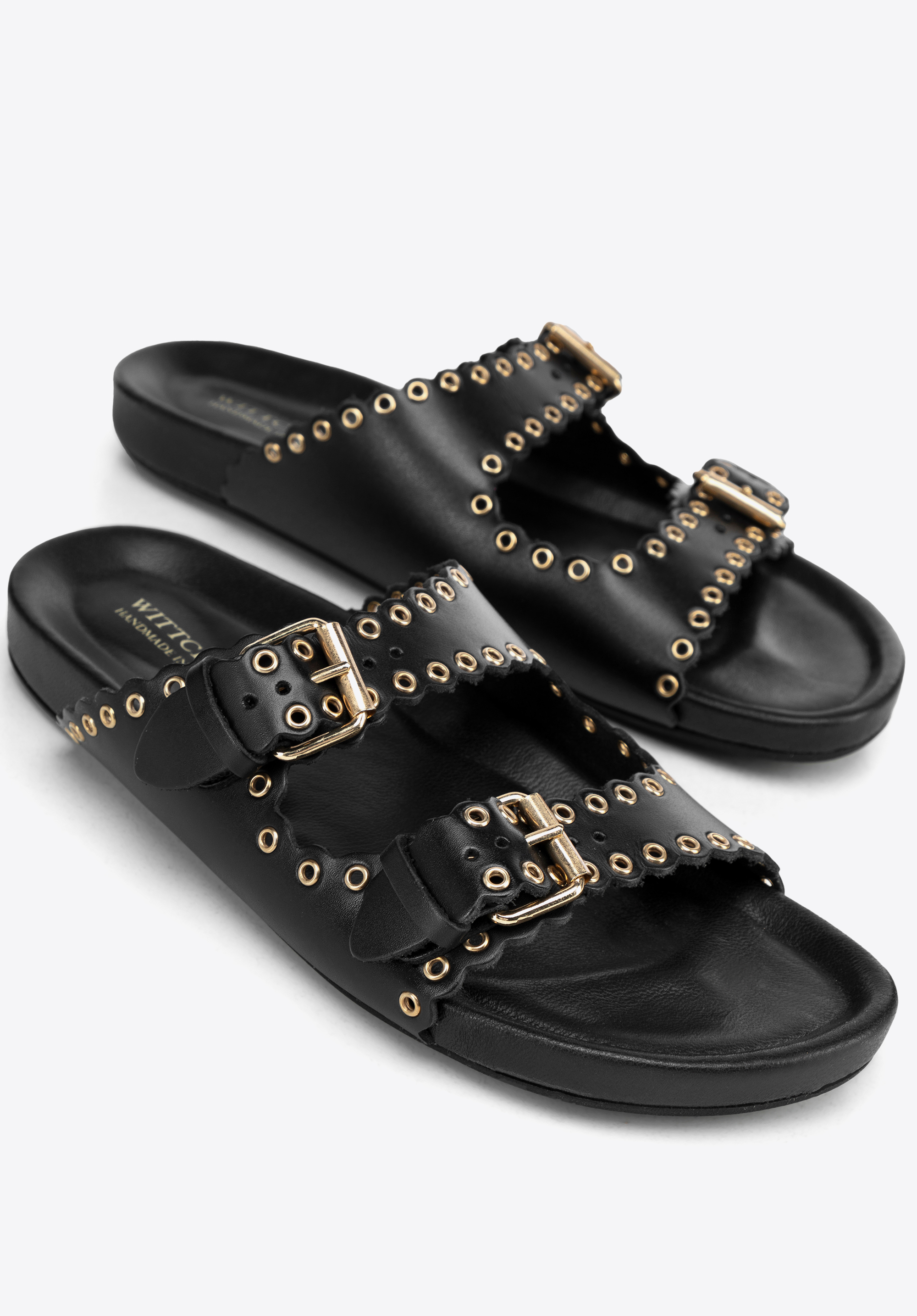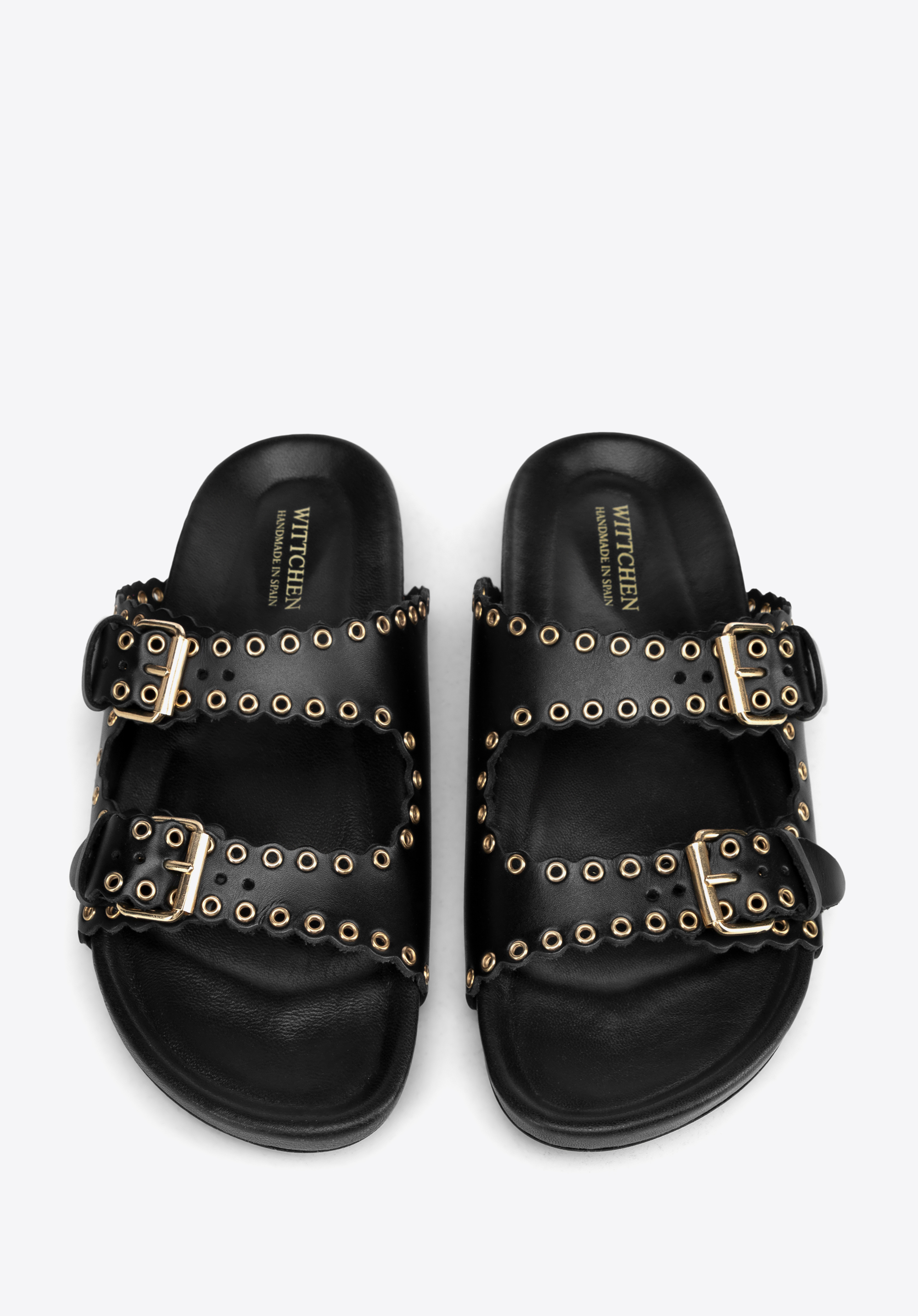 Leicht, feminin und voller Charakter – diese Damen-Sandalen zum Hineinschlüpfen sind die perfekte Wahl für warme Tage! Sie werden in Spanien aus natürlichem Vollnarbenleder hergestellt und verbinden subtile Eleganz mit mühelosem Sommerstil. Ihr einzigartiges Design zeichnet sich durch zwei breite Riemen mit Metalldetails aus, die für eine unverwechselbare Note sorgen. Verstellbare Schnallen sorgen für eine perfekte Passform, während die Slip-On-Konstruktion sie unglaublich einfach zu tragen macht. Die mandelförmige Zehenpartie verlängert den Fuß dezent, während das weiche Futter und die Innensohle ganztägigen Komfort bieten.