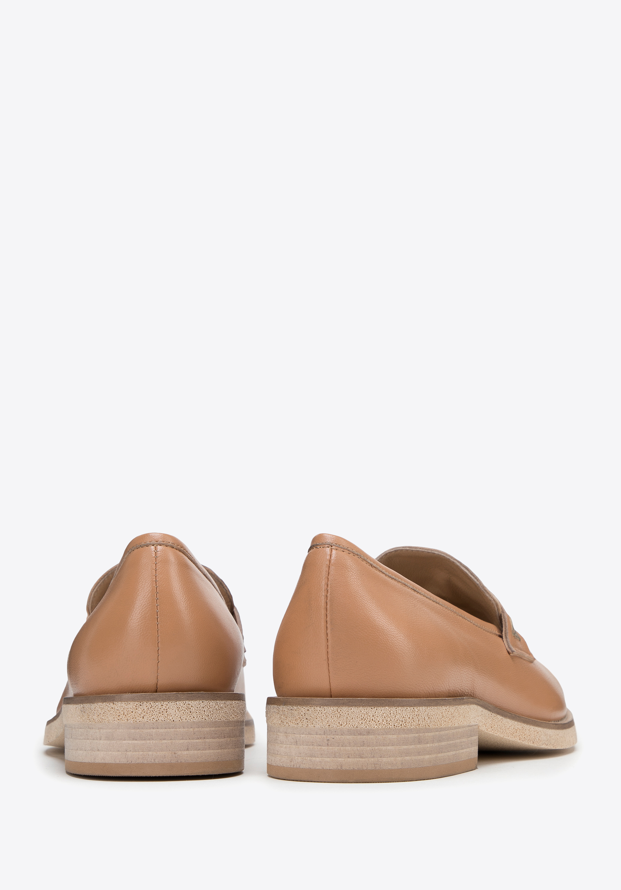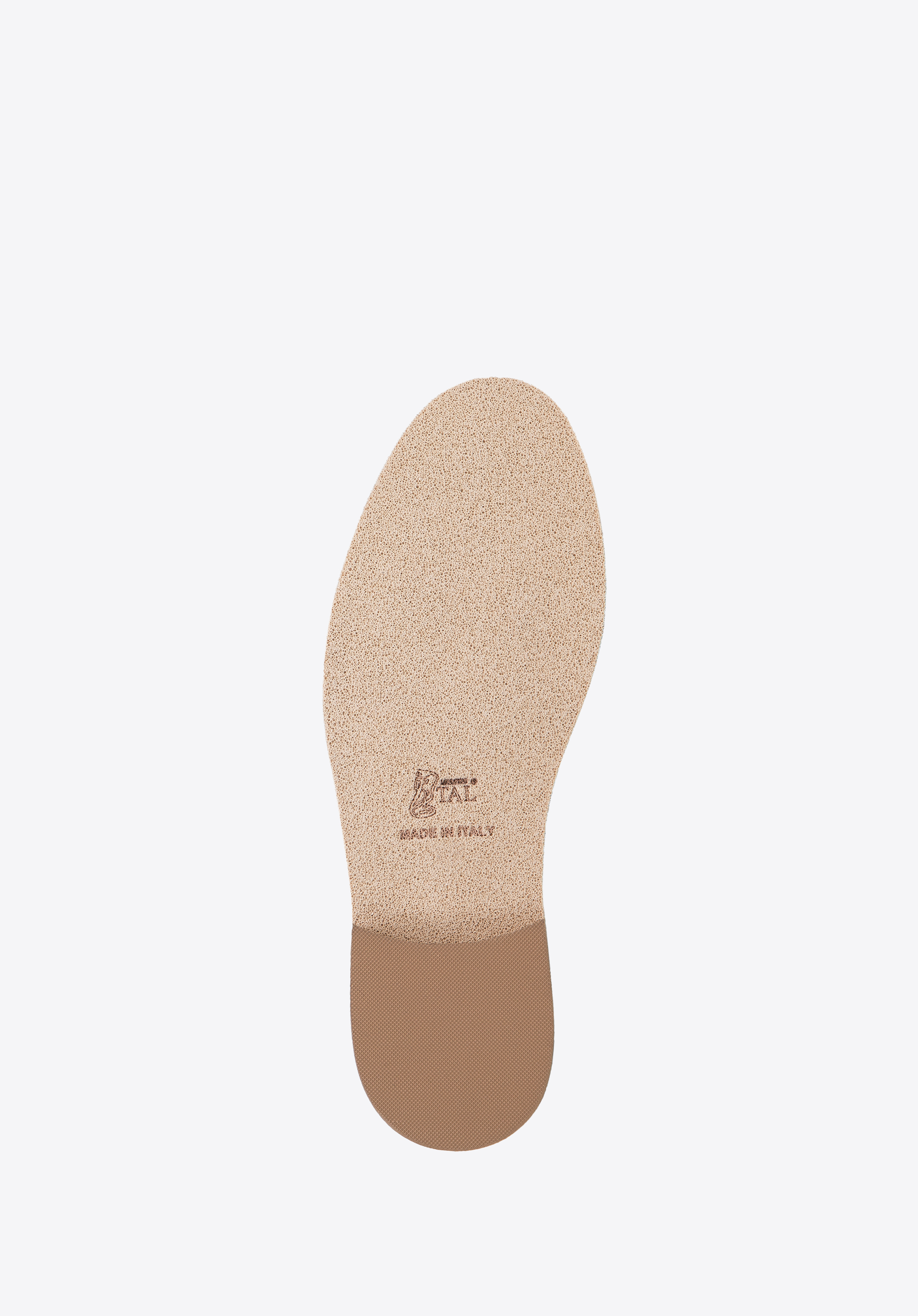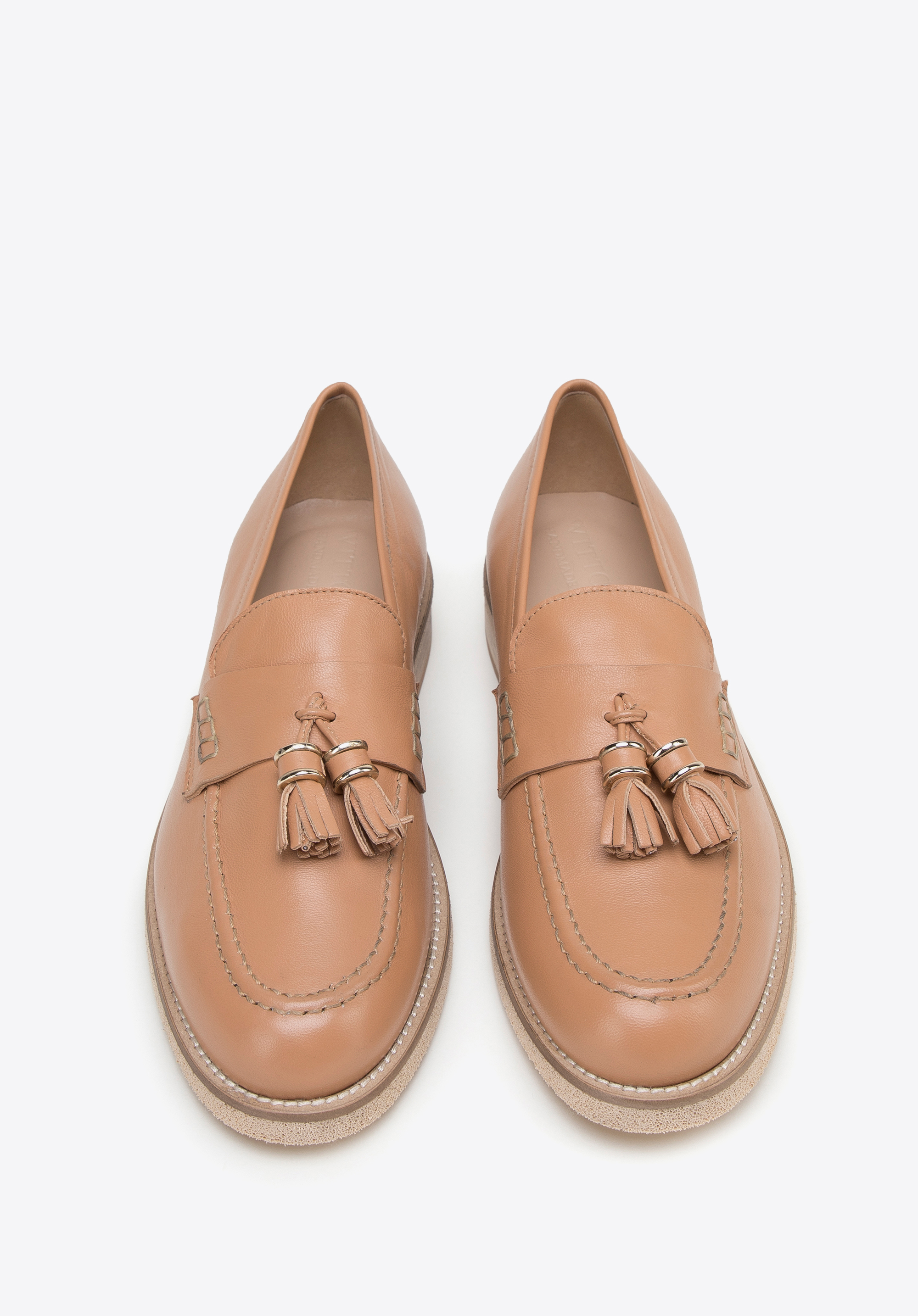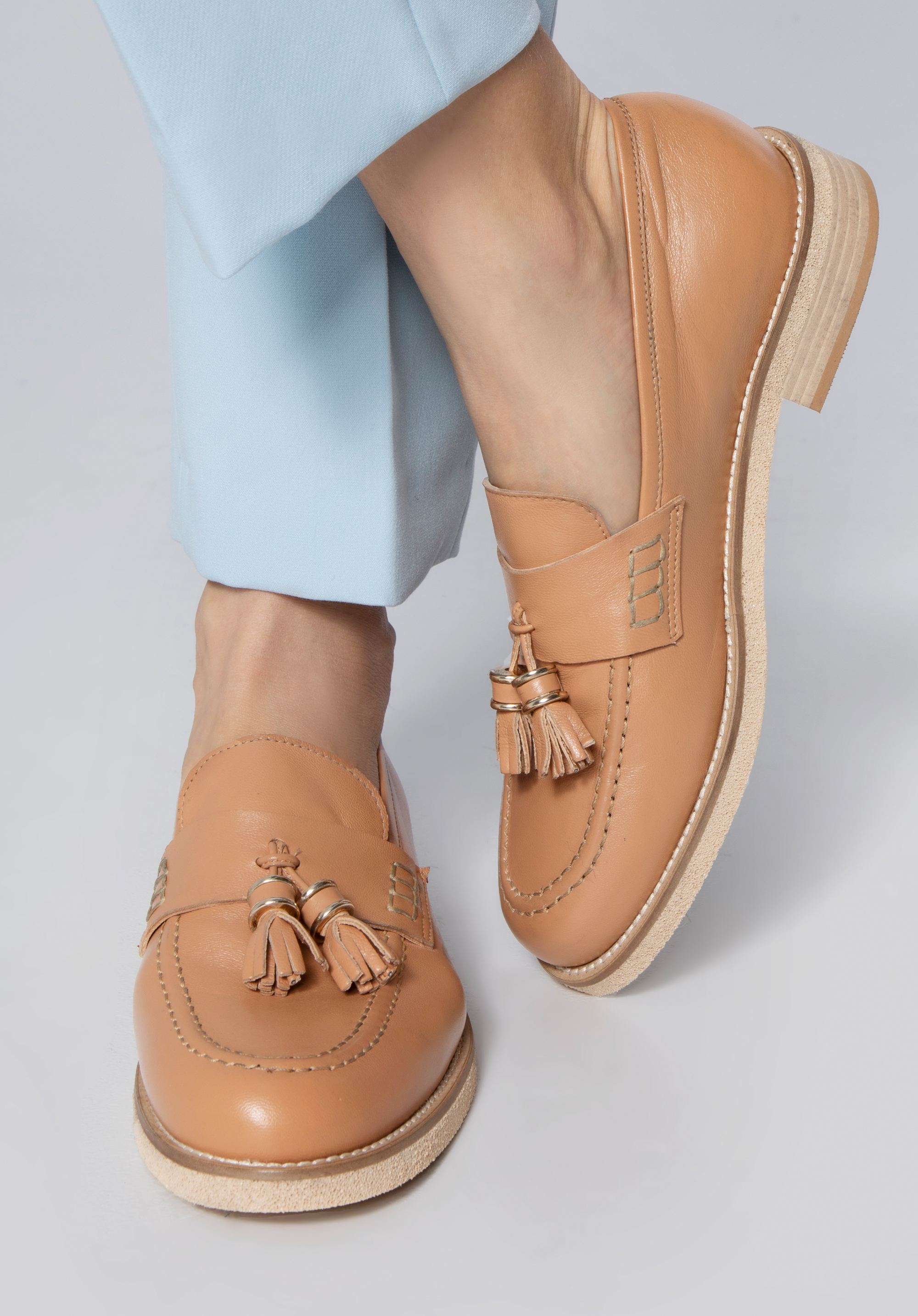Diese schicken Mokassins bringen einen neuen Stil in Ihre Garderobe. Der klassische Schnitt ist mit zwei kleinen, glänzenden Quasten und dekorativen quadratischen Säumen an den Seiten verziert. Die Schuhe wurden in Italien aus hochwertigem Naturleder gefertigt und sind somit eine Wahl für viele Jahreszeiten. Sie haben die klobige, aber leichte Sohle, so dass Sie stundenlang bequem darin laufen können. Tragen Sie sie zur Arbeit oder nach der Arbeit: Sie passen sowohl zu einem Kleid als auch zu Ihre Jeans und Ihren Pullover. Die Mokassins aus Leder für Damen mit Quasten sind ein Accessoire mit Charakter, das jede stilvolle Frau zu schätzen weiß.