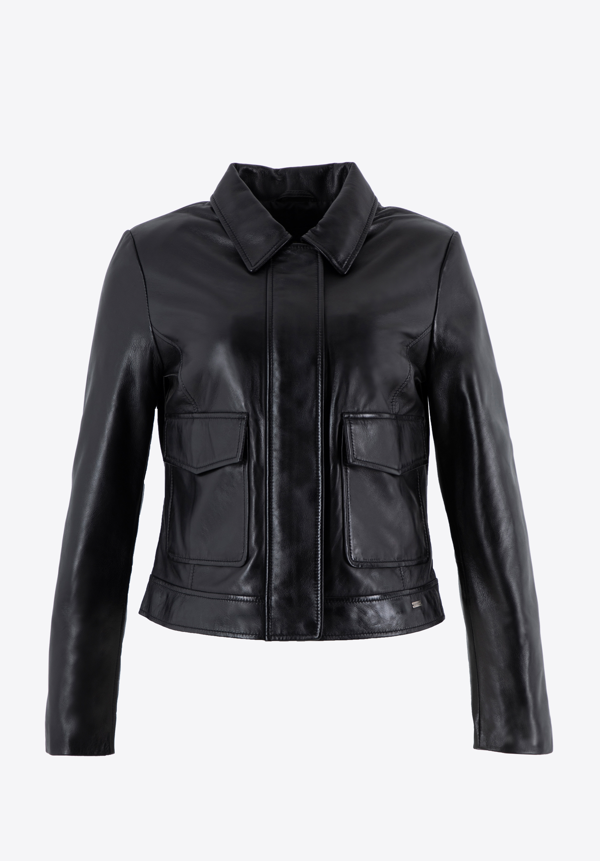 Die kurze, kastenförmige Silhouette der Jacke bietet ein unverwechselbares geometrisches Flair, das sie von traditionellen Designs abhebt und dafür sorgt, dass Sie sich beim Tragen bemerkenswert wohl fühlen. Die Jacke verfügt über einen Reißverschluss und 4 unter einer Knopfleiste versteckte Druckknöpfe für eine zusätzliche elegante Ausstrahlung. Der schlichte Kragen unterstreicht die schlanke und anspruchsvolle Ästhetik der Jacke. Auf der Vorderseite befinden sich zwei rechteckige Taschen mit Klappenverschluss . Die Konstruktion der Jacke wird durch Nähte hervorgehoben, die entlang der Schultern und Taschen verlaufen, während das dezente silberne WITTCHEN-Logo einen Hauch raffinierter Eleganz verleiht. Wenn Sie sich für eine Damenlederjacke entscheiden, entscheiden Sie sich für ein Kleidungsstück, das topaktuellen Stil mit zeitloser Eleganz perfekt in Einklang bringt.
