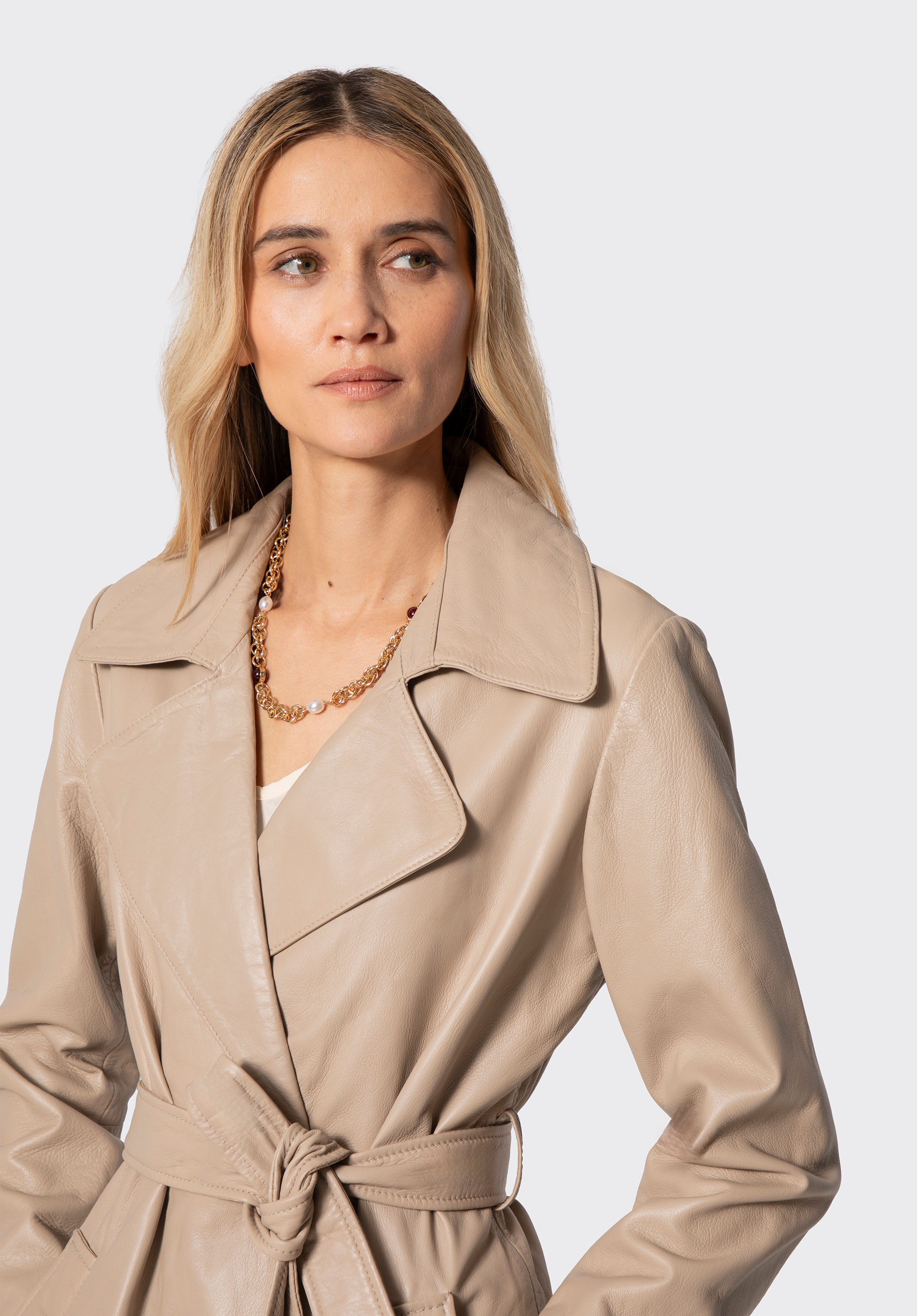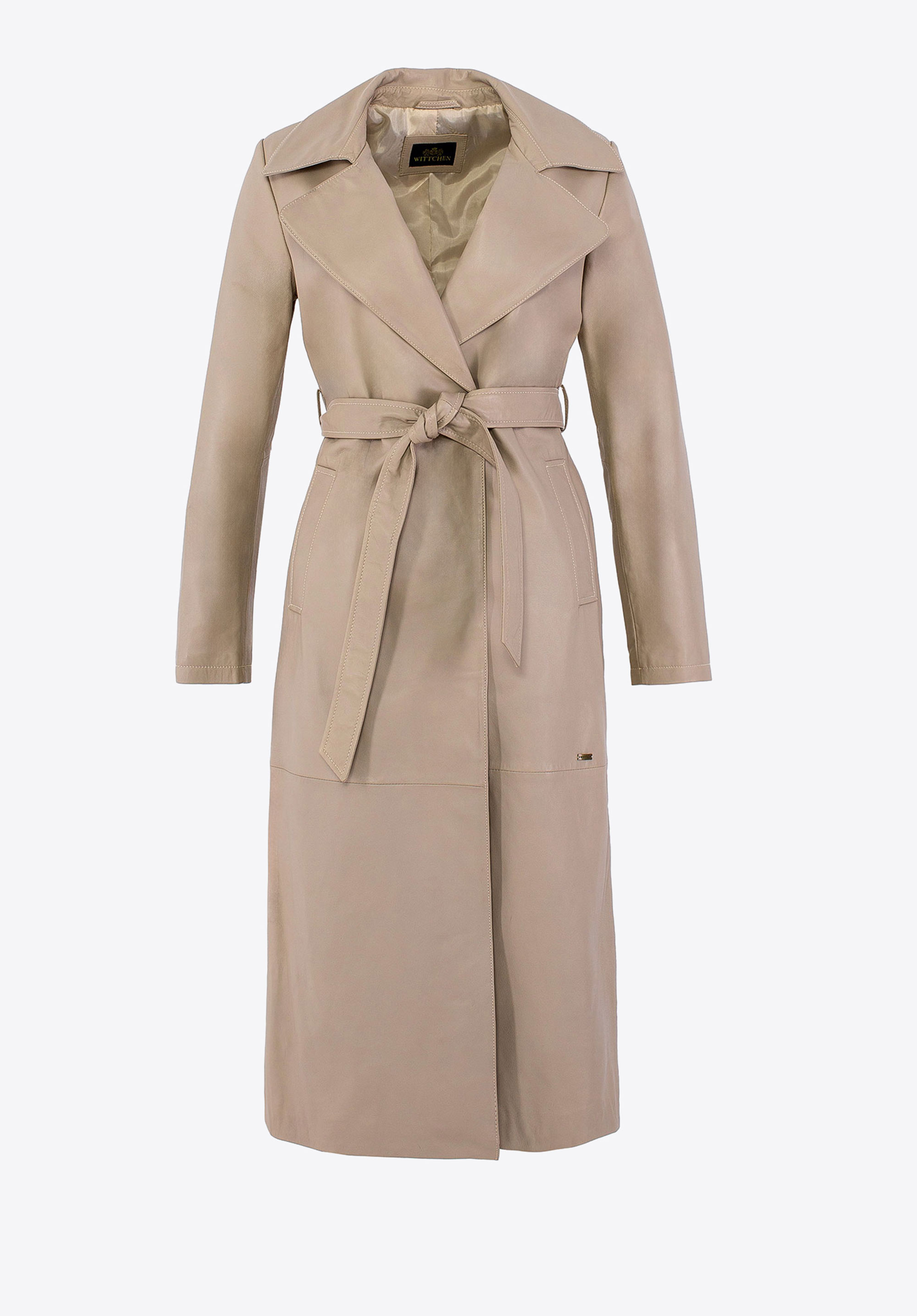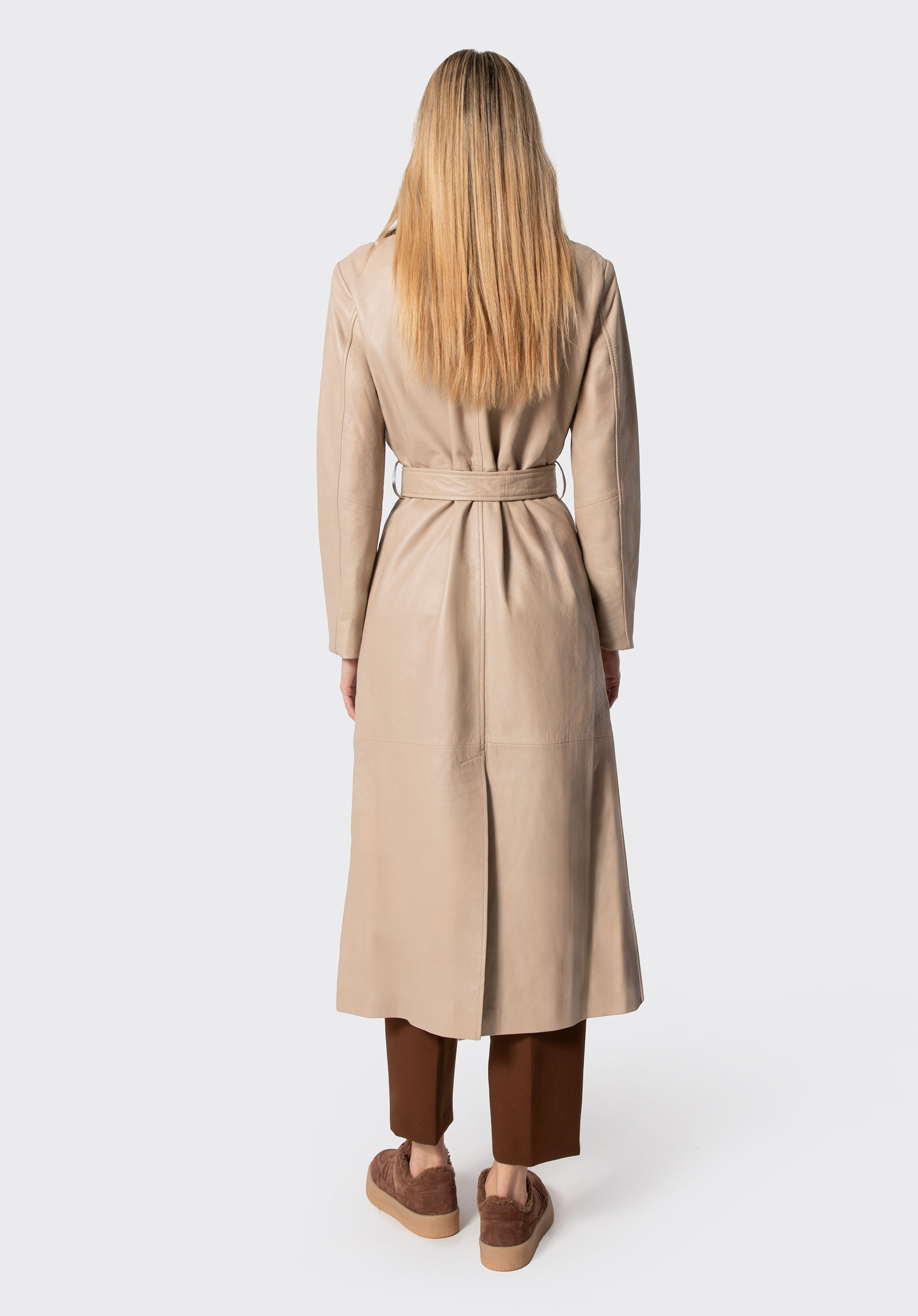 Dieser Mantel aus natürlichem Schafsleder wurde für Frauen entworfen, die dezente Eleganz und zeitlosen Stil schätzen. Er ist der Inbegriff klassischer Mode, angereichert mit modernen Details. Sein klassischer Schnitt betont die Silhouette auf subtile Weise, während Sie mit dem Taillengürtel die Passform für maximalen Komfort anpassen können. Ein zartes Metalllogo an der Seite und praktische vertikale Taschen verleihen einen einzigartigen Charakter, während der klassische Kragen dafür sorgt, dass dieser Mantel immer im Trend liegt.