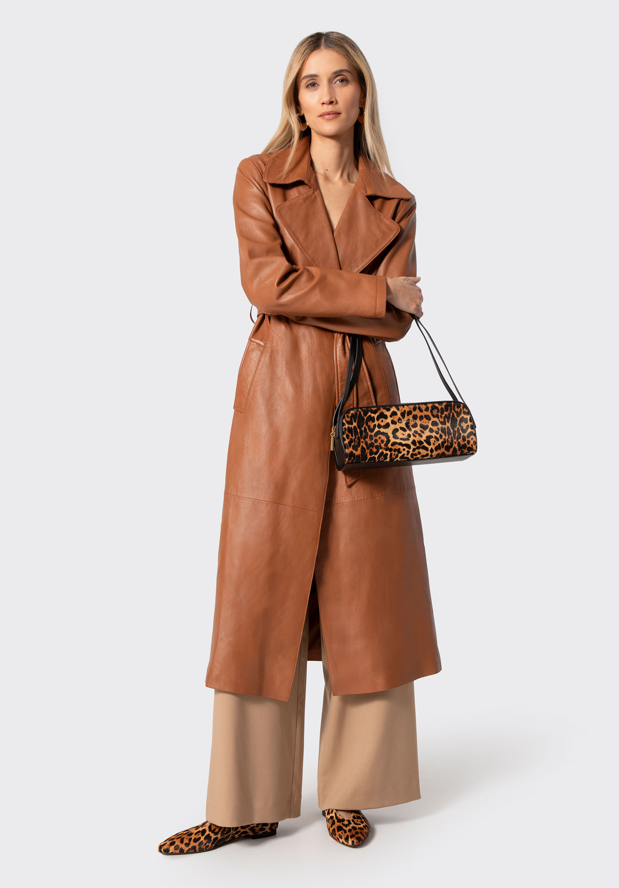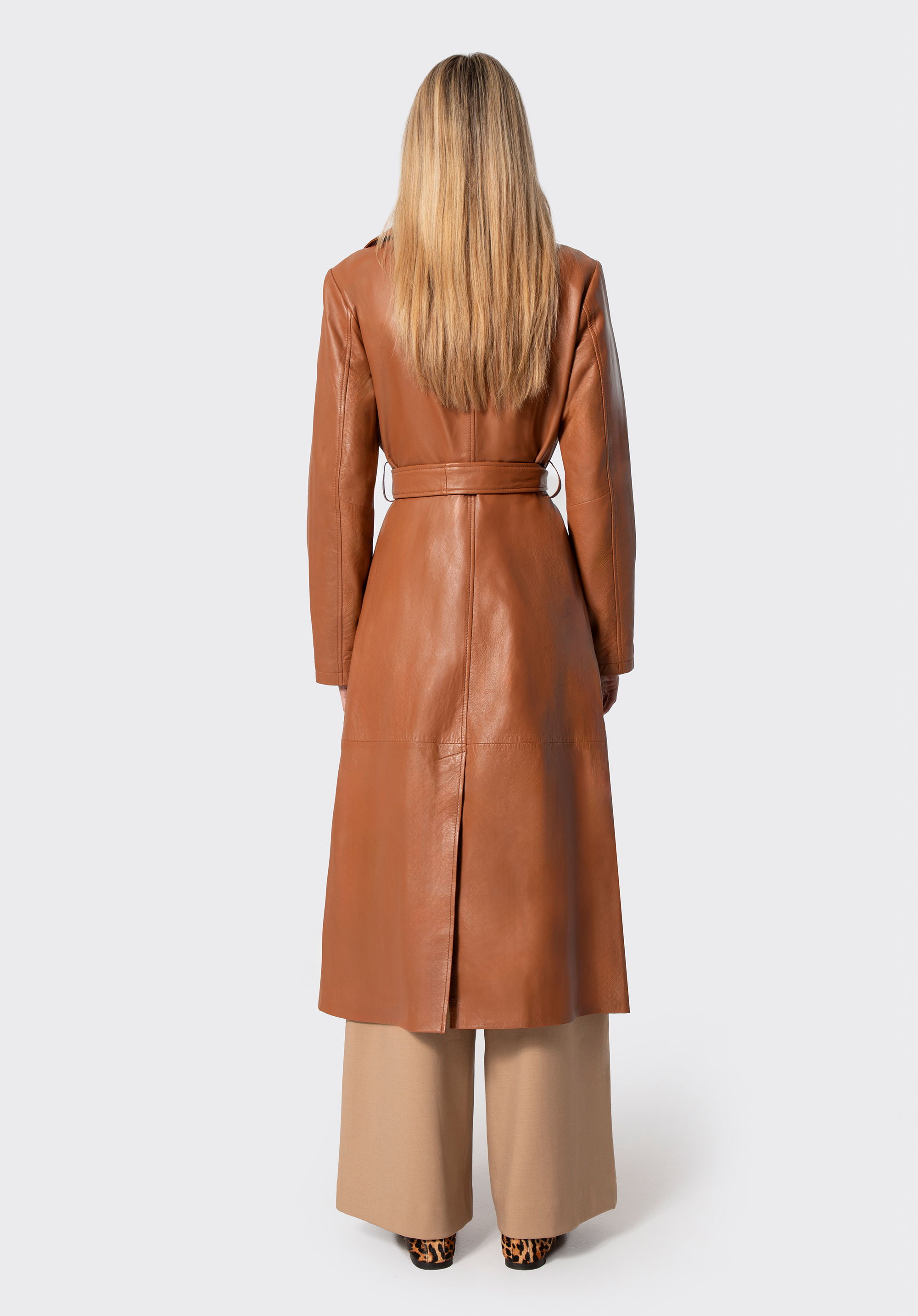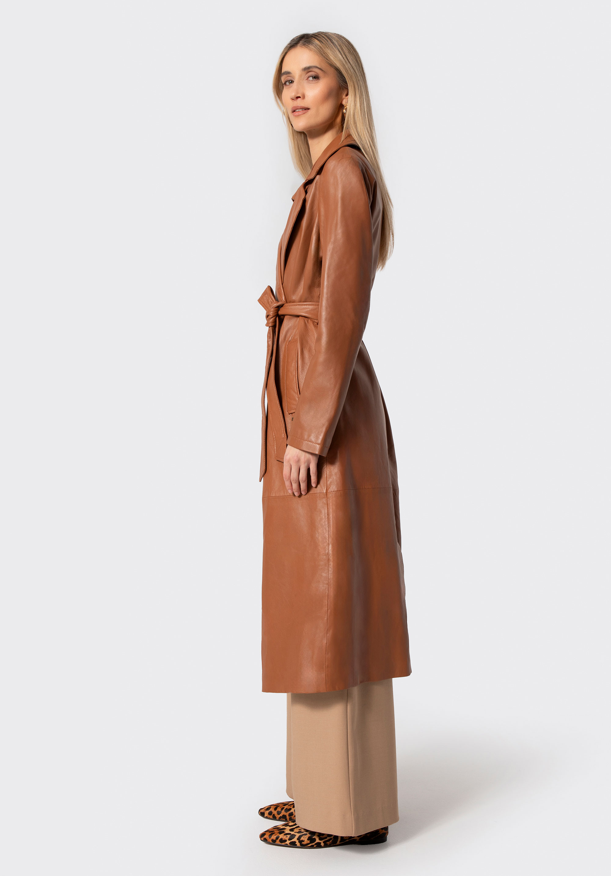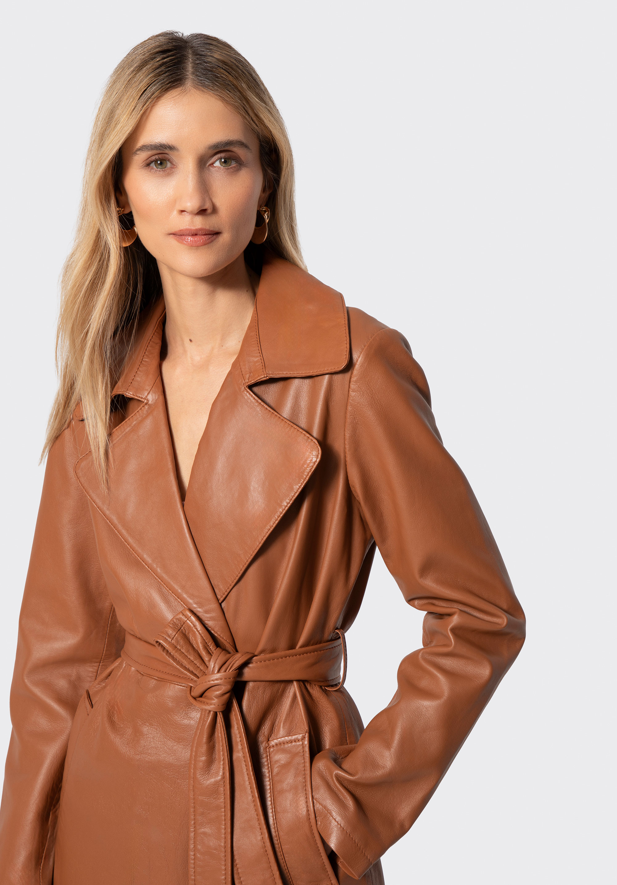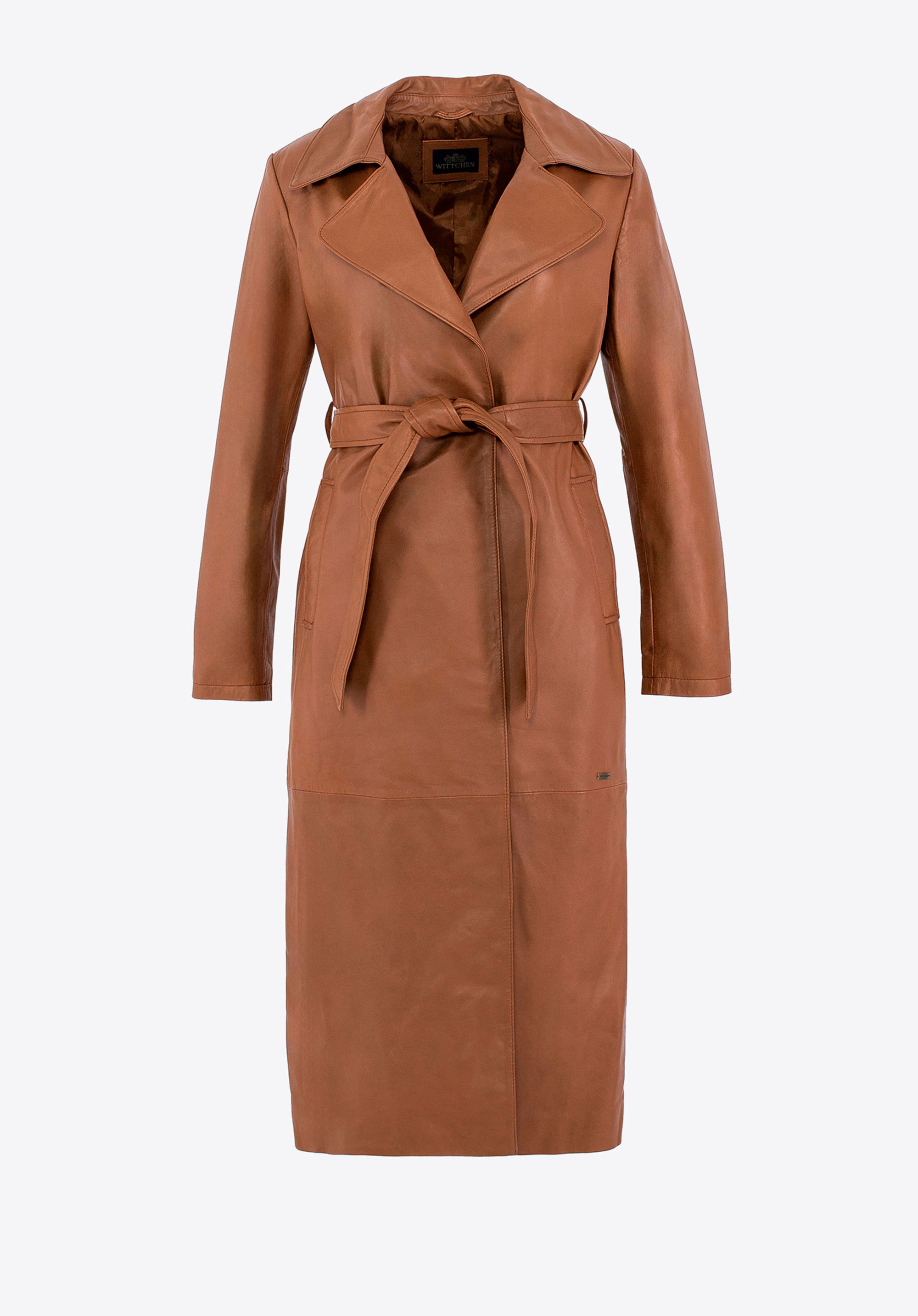Damen Ledermantel mit Gürtel hellbraun