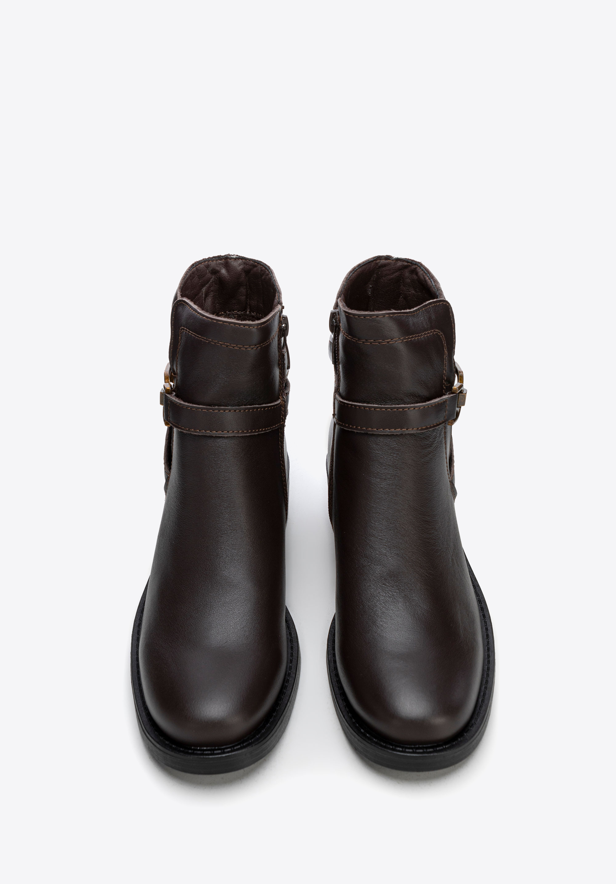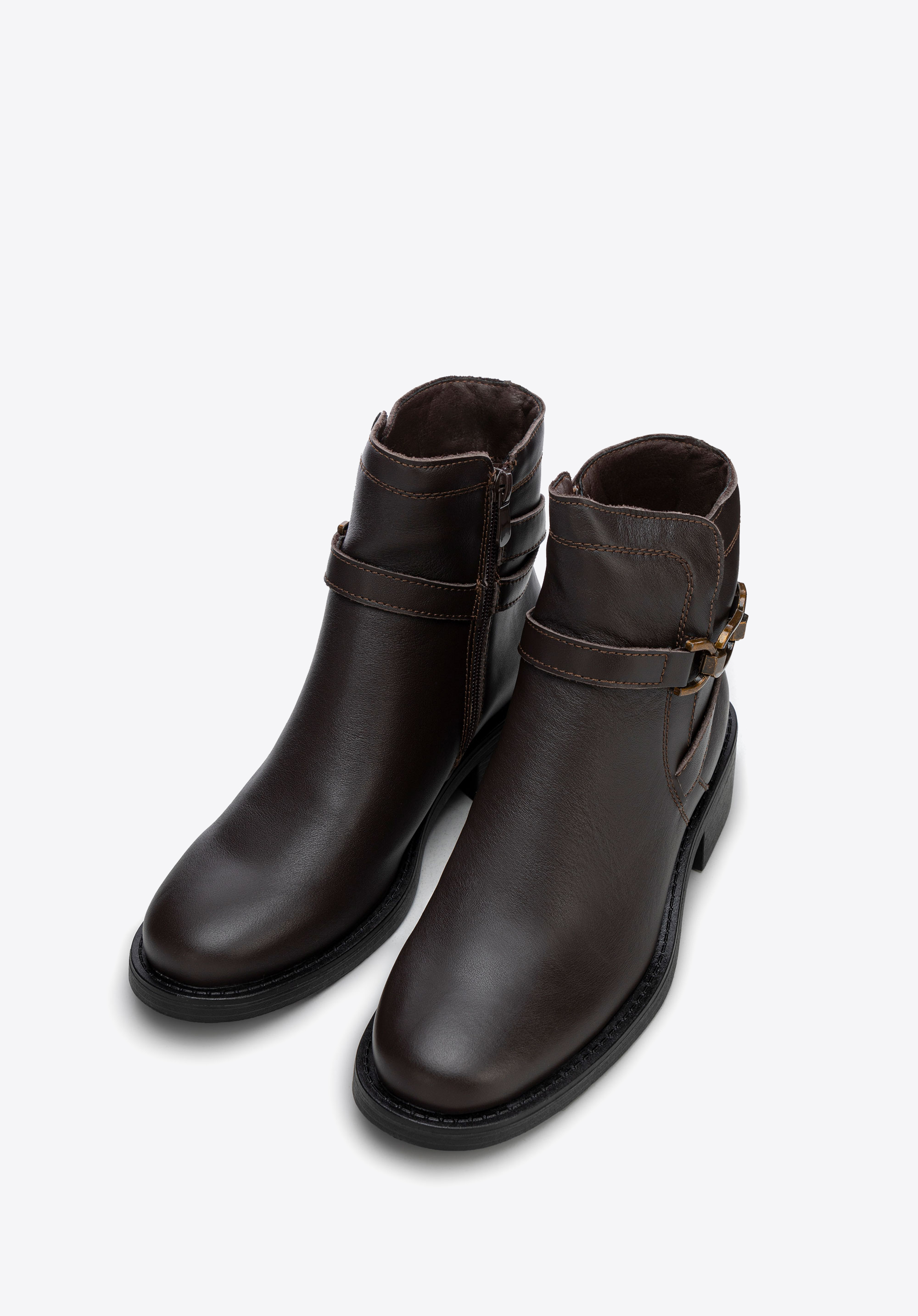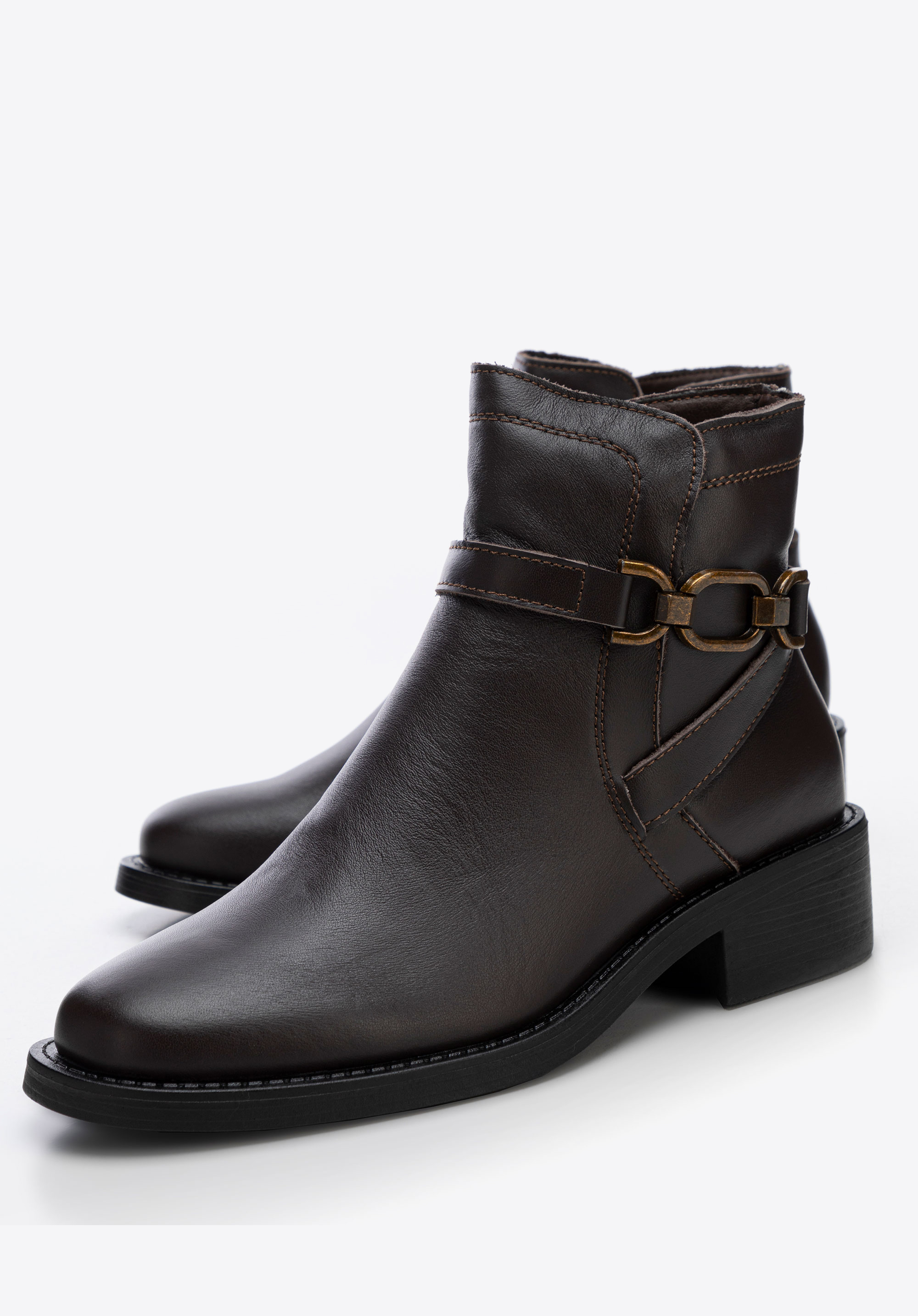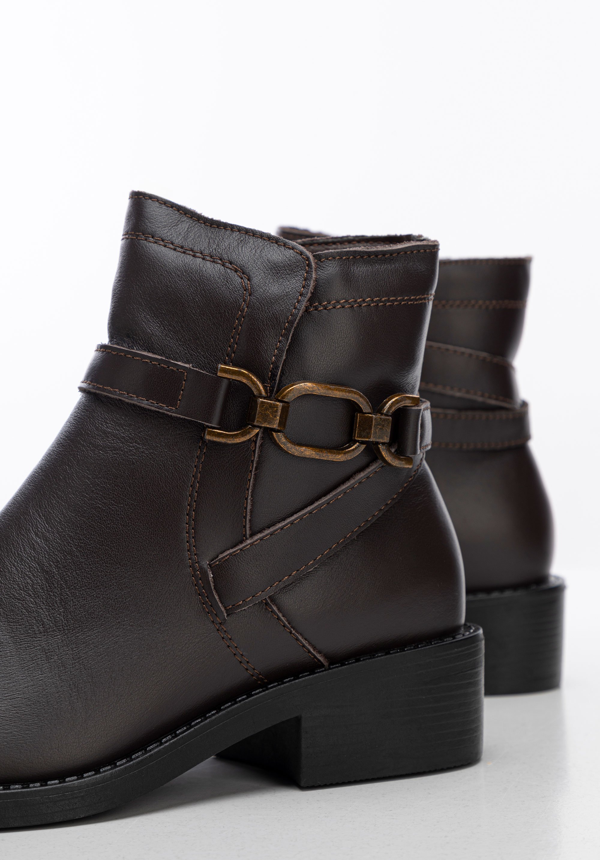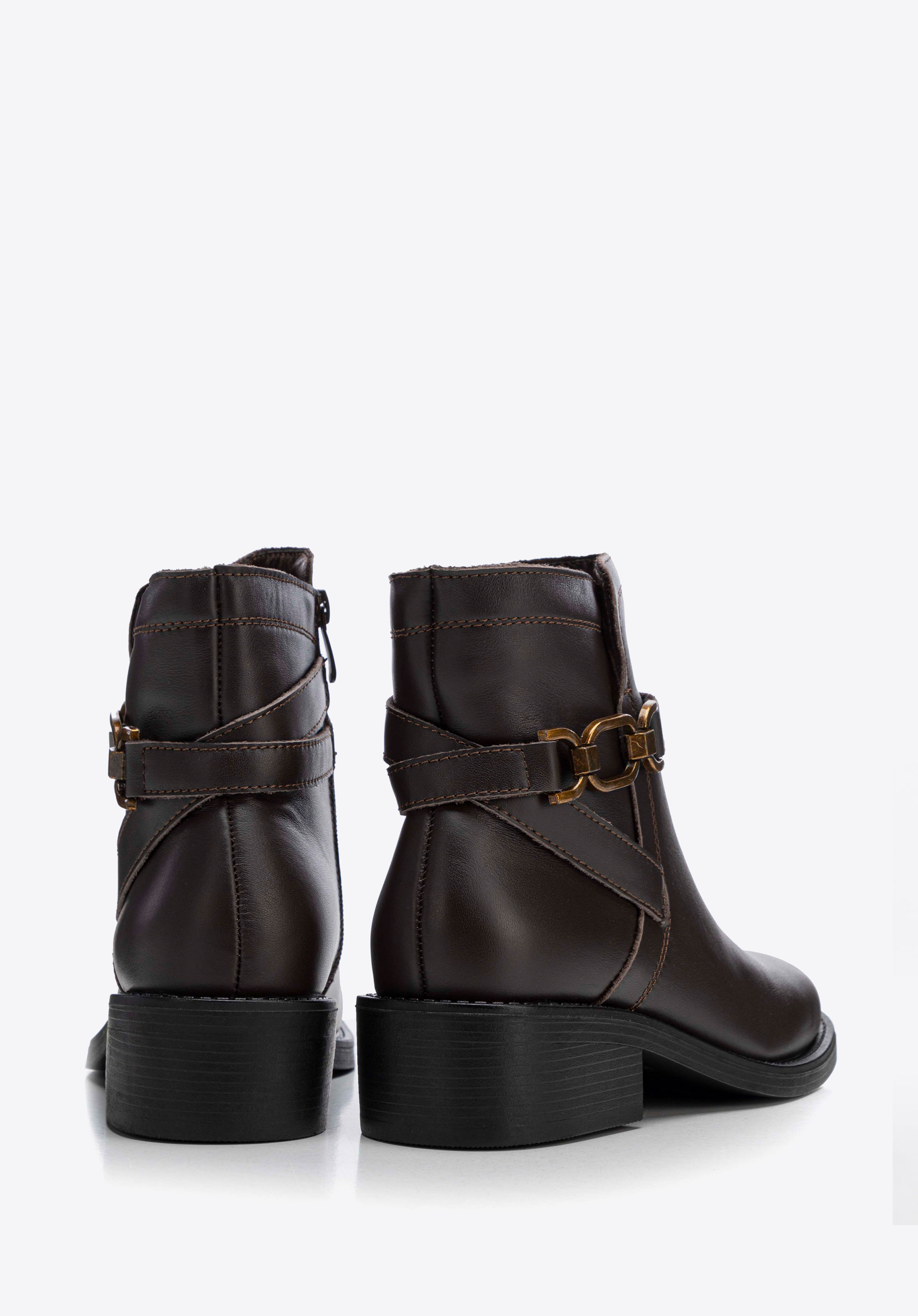 Entdecken Sie Eleganz und Komfort in einem – diese Damenstiefeletten sind die perfekte Kombination aus Stil und Funktionalität. Sie sind aus Naturleder gefertigt und haben eine klassische mandelförmige Spitze , die ihnen Zartheit und subtilen Charme verleiht. Auf der Außenseite finden Sie eine dekorative Kette und sich kreuzende Riemen, die den Stiefeln einen einzigartigen Charakter mit einem Hauch von Rock-Chic verleihen. Mit einem praktischen seitlichen Reißverschluss befestigt, ermöglichen sie ein schnelles und einfaches Anziehen.