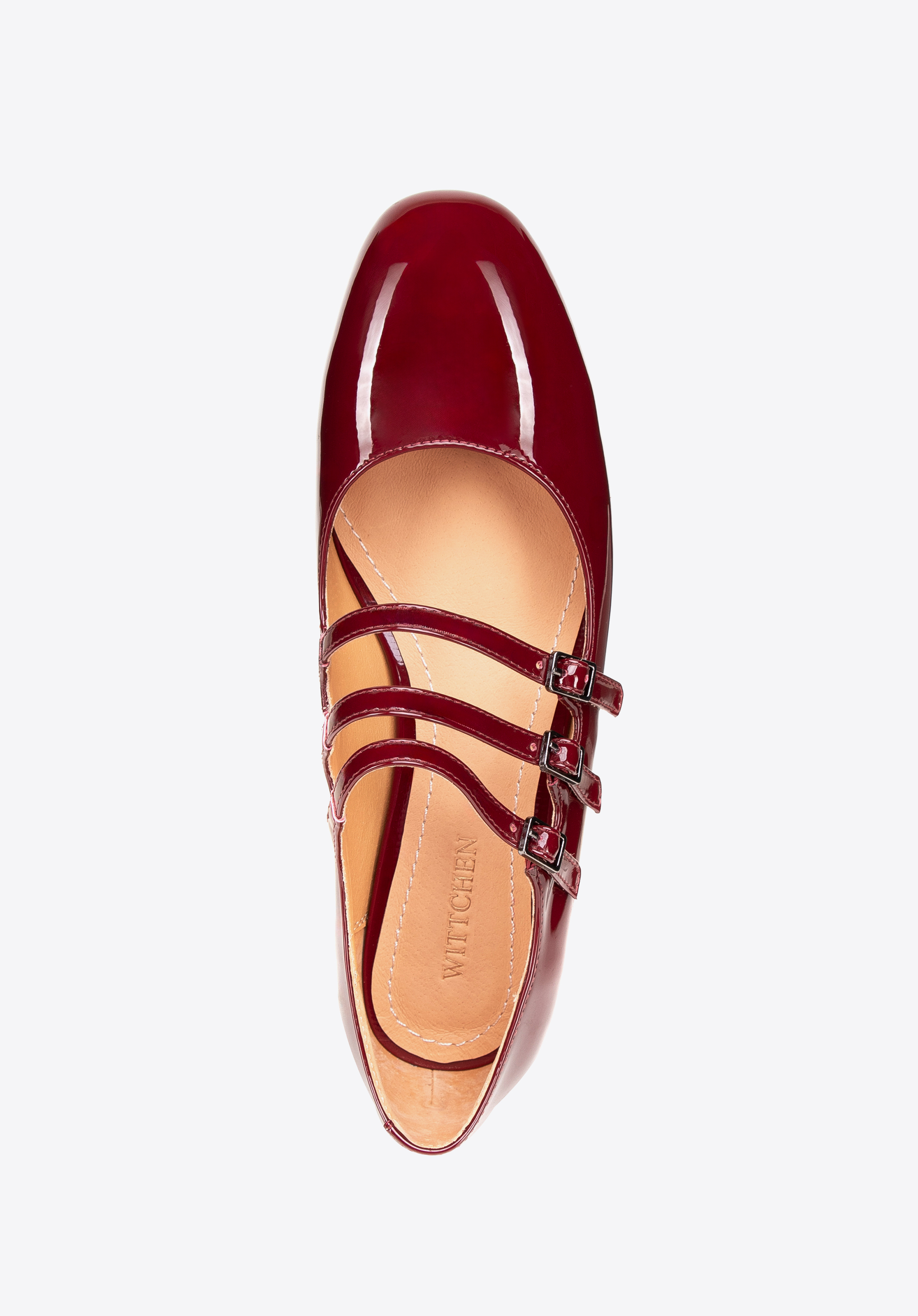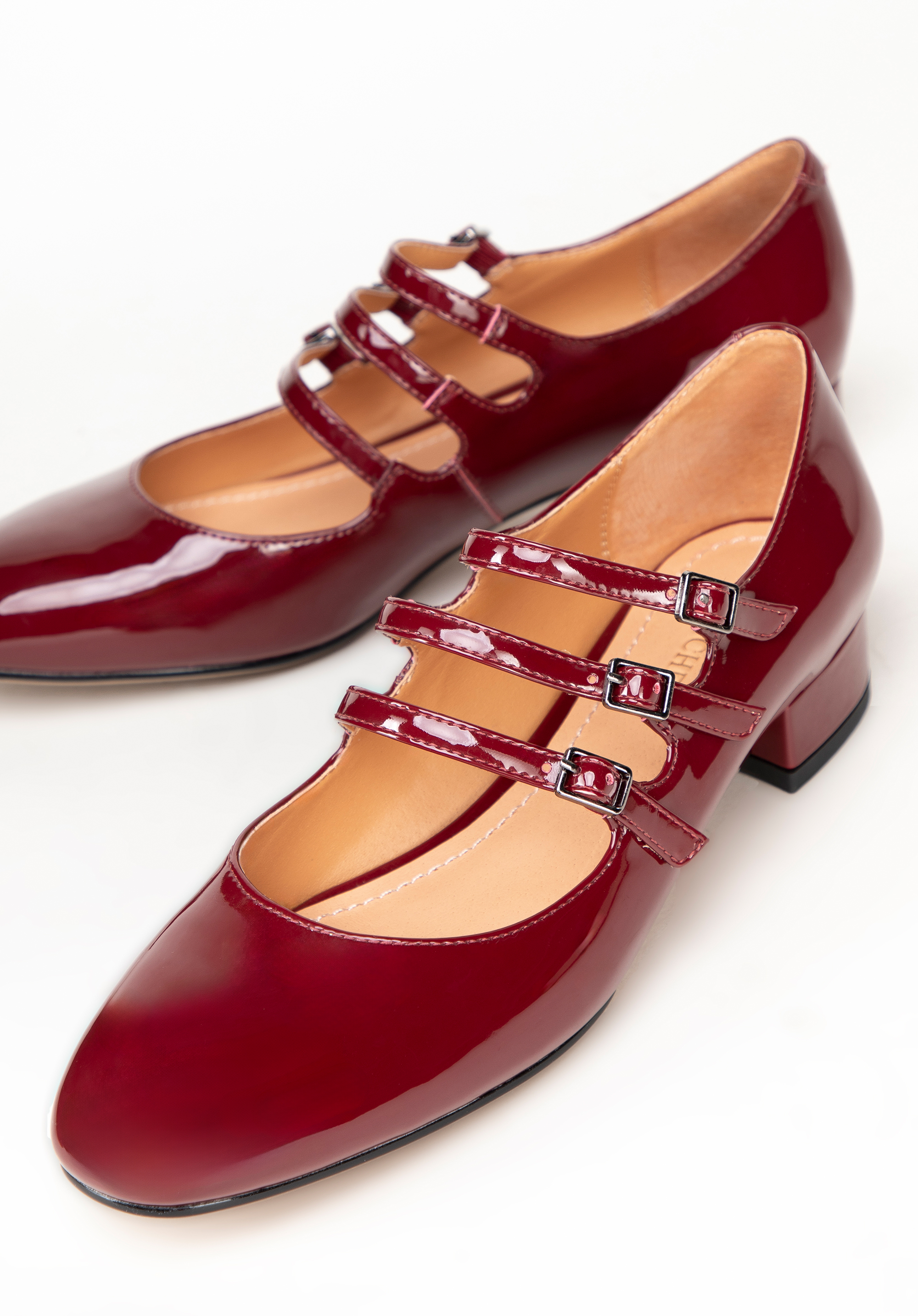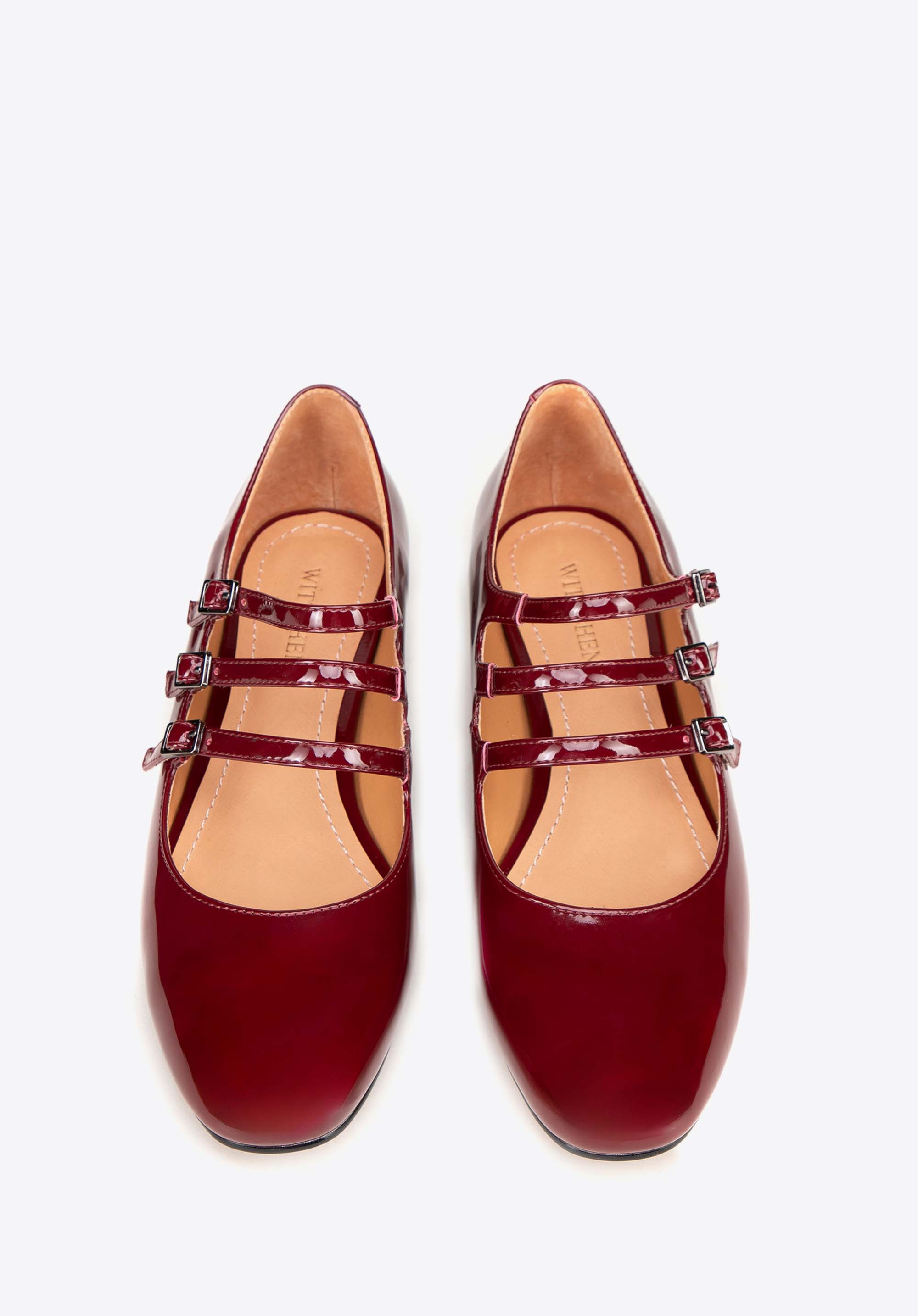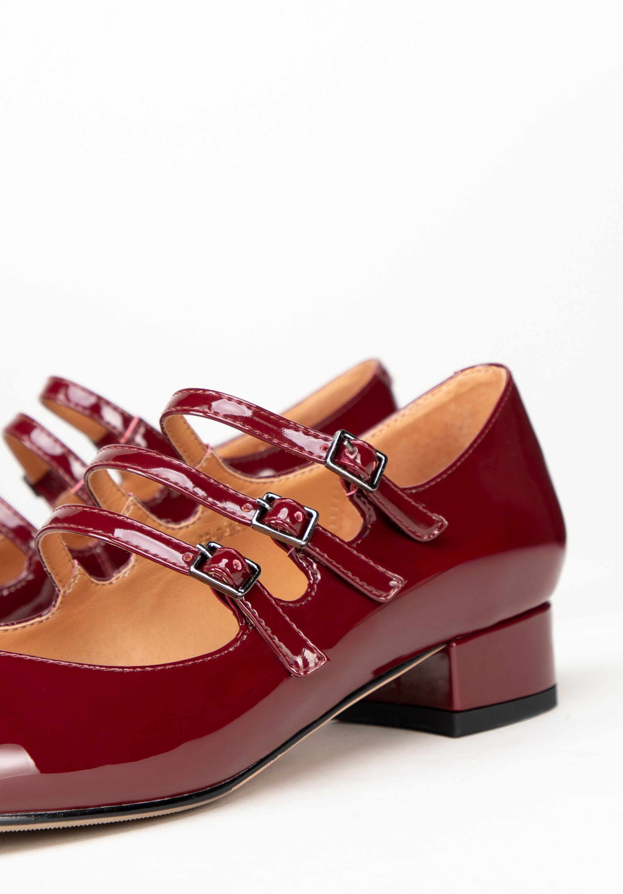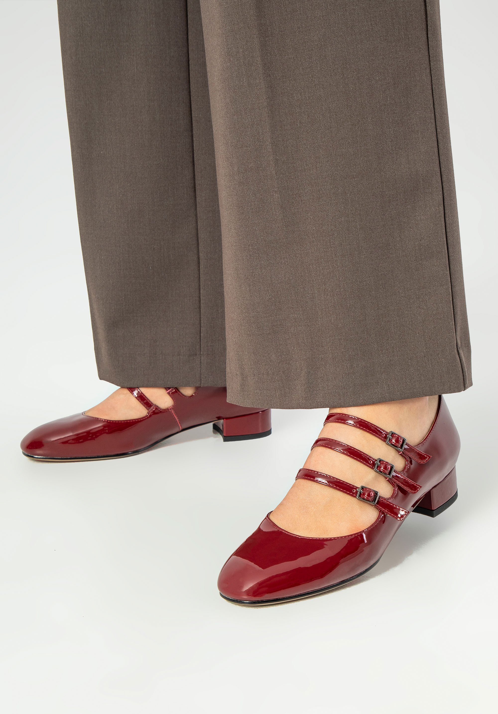 Verschluss: Für eine individuelle Passform und zusätzliche Stabilität werden die Pumps mit drei schmalen Riemen befestigt.