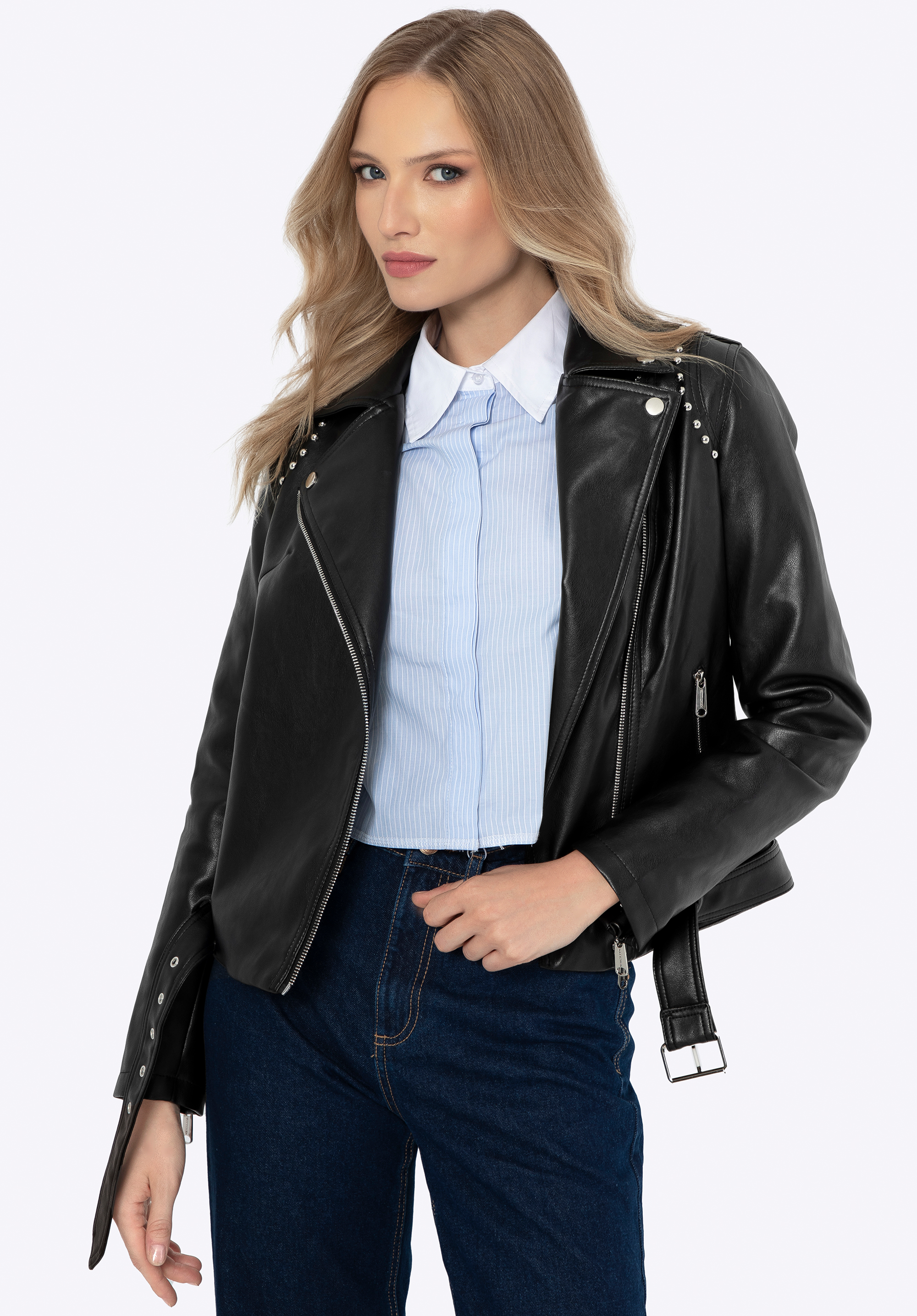 Verleihen Sie Ihrer Garderobe einen Hauch von Rocker mit unserer stylischen Öko-Lederjacke für Damen. Diese Jacke ist nicht nur ein modisches Stück, sondern auch eine praktische Wahl für alle Jahreszeiten. Stilvolle Details wie Ziernieten und ein verstellbarer Gürtel unterstreichen ihr einzigartiges Design und machen sie zur perfekten Wahl für jede Gelegenheit. Das moderne und dynamische Design mit dem Reißverschluss, verleiht der Jacke einen einzigartigen Charakter.