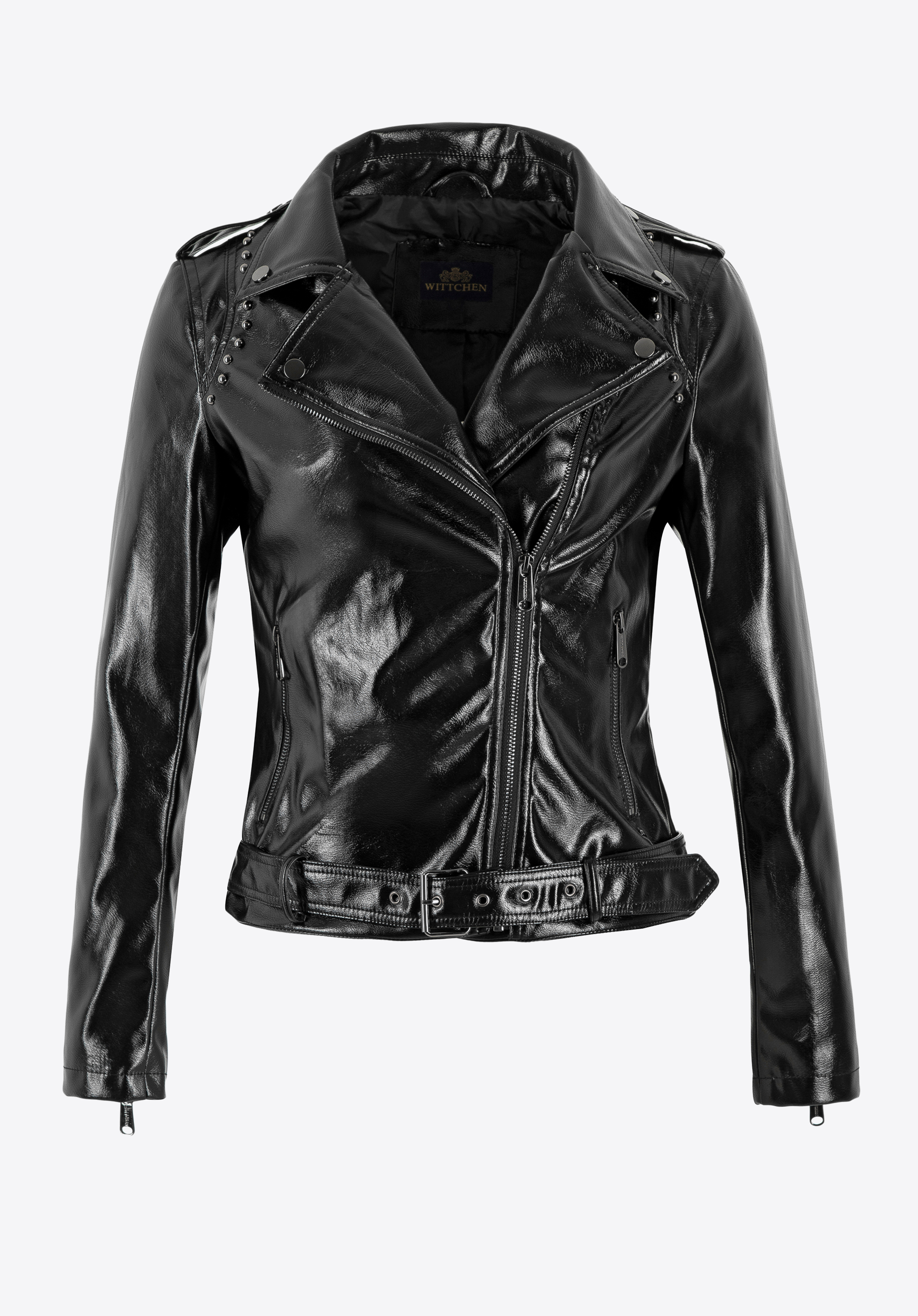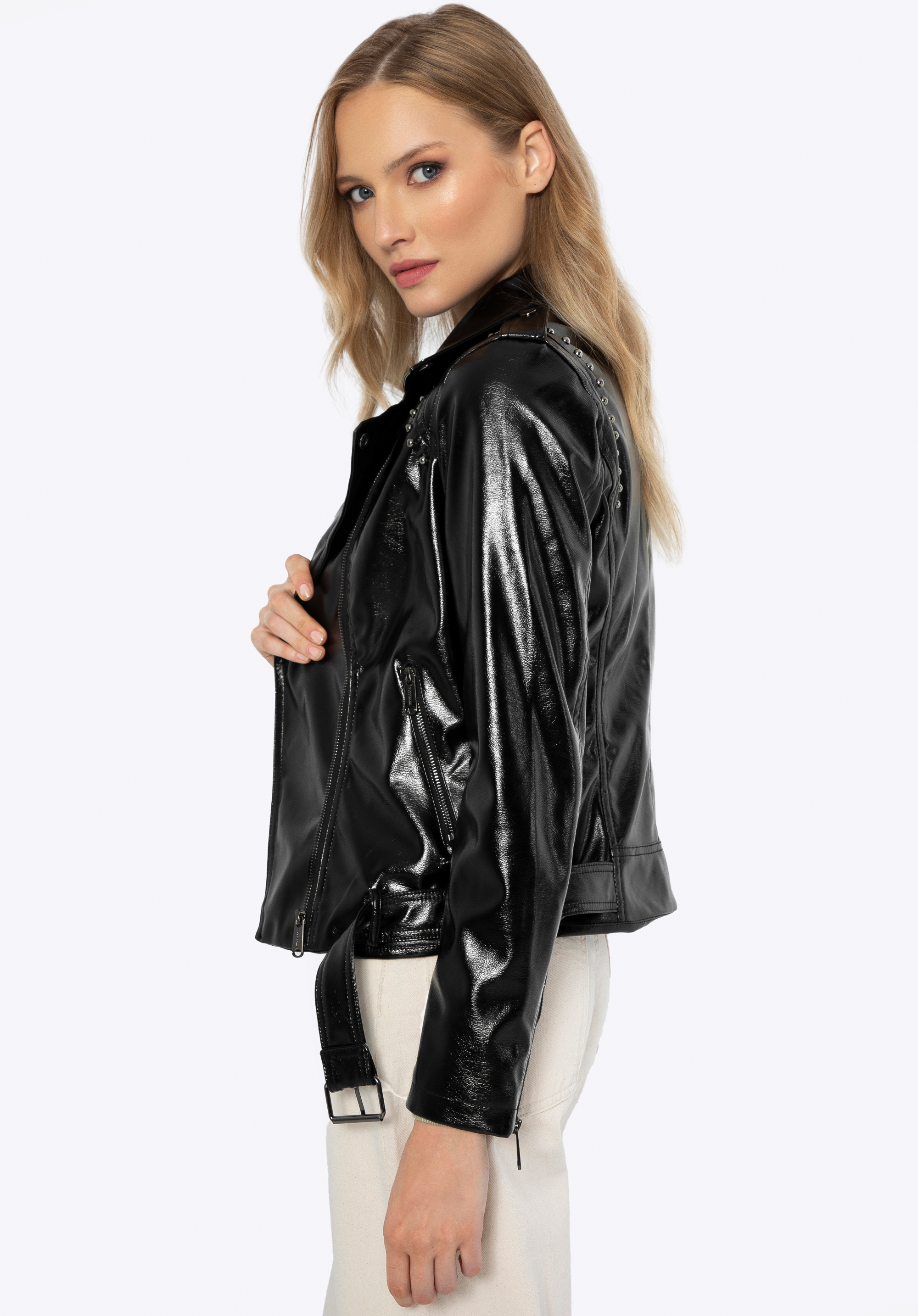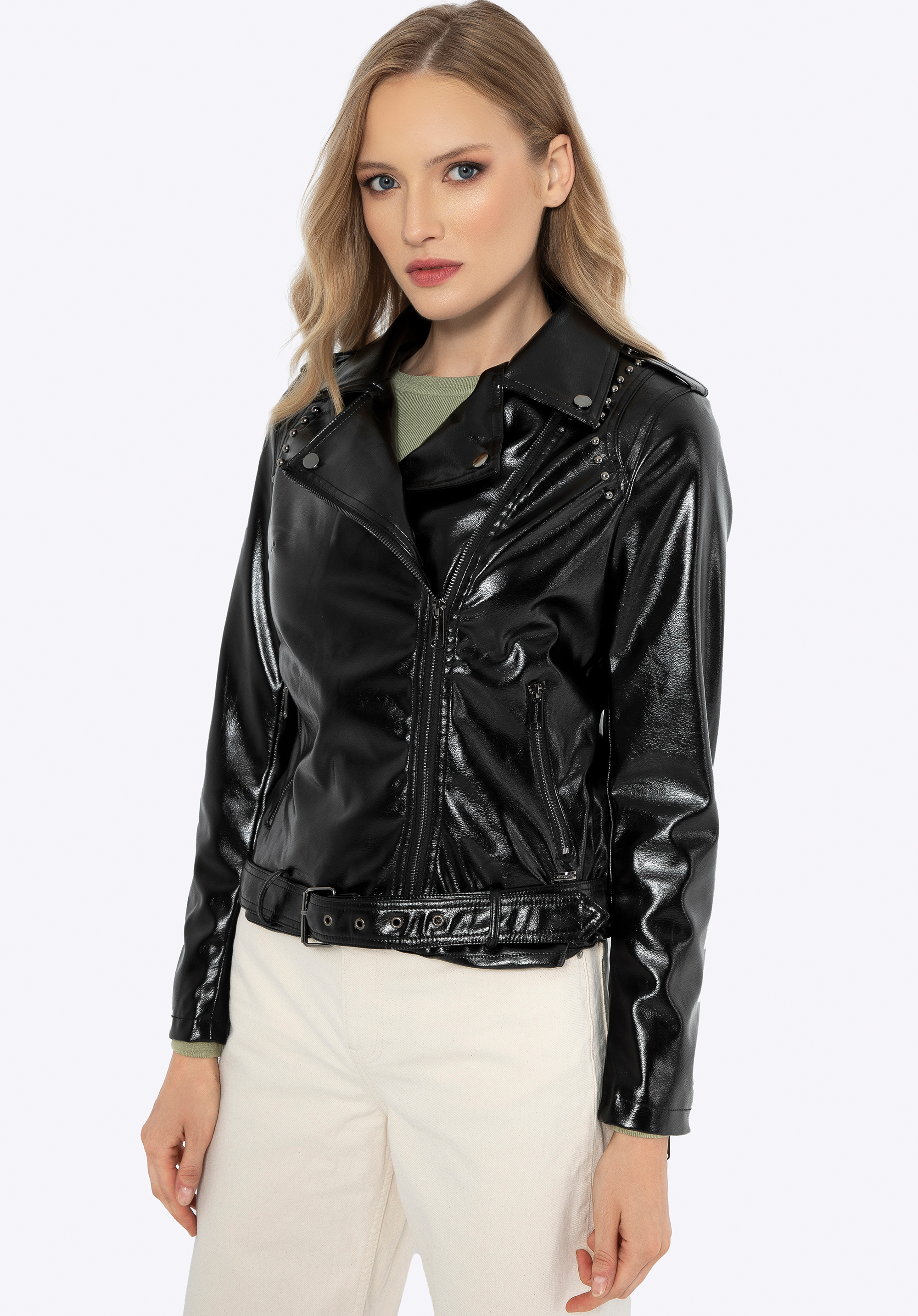 Verleihen Sie Ihrer Garderobe einen Hauch von Rocker mit unserer stylischen Öko-Lederjacke für Damen. Diese Jacke ist nicht nur ein modisches Stück, sondern auch eine praktische Wahl für alle Jahreszeiten. Stilvolle Details wie Ziernieten und ein verstellbarer Gürtel unterstreichen ihr einzigartiges Design und machen sie zur perfekten Wahl für jede Gelegenheit. Das moderne und dynamische Design mit dem Reißverschluss, verleiht der Jacke einen einzigartigen Charakter.