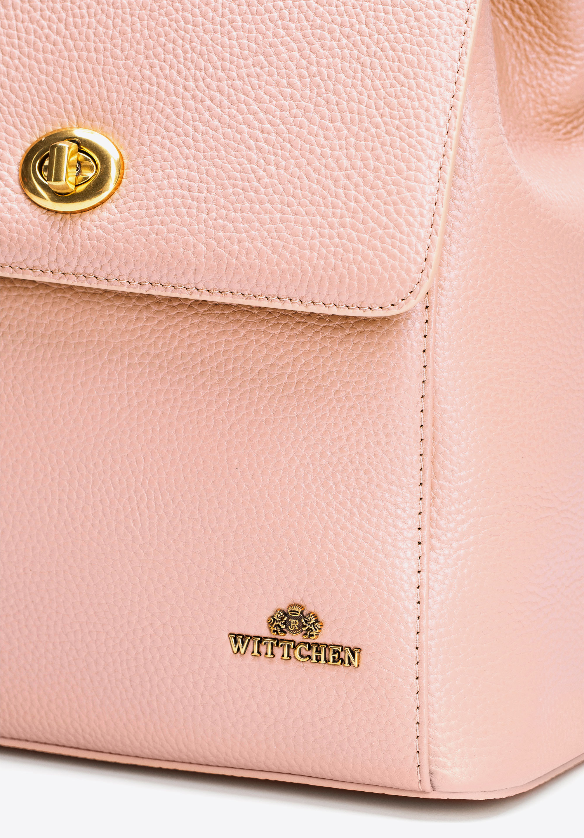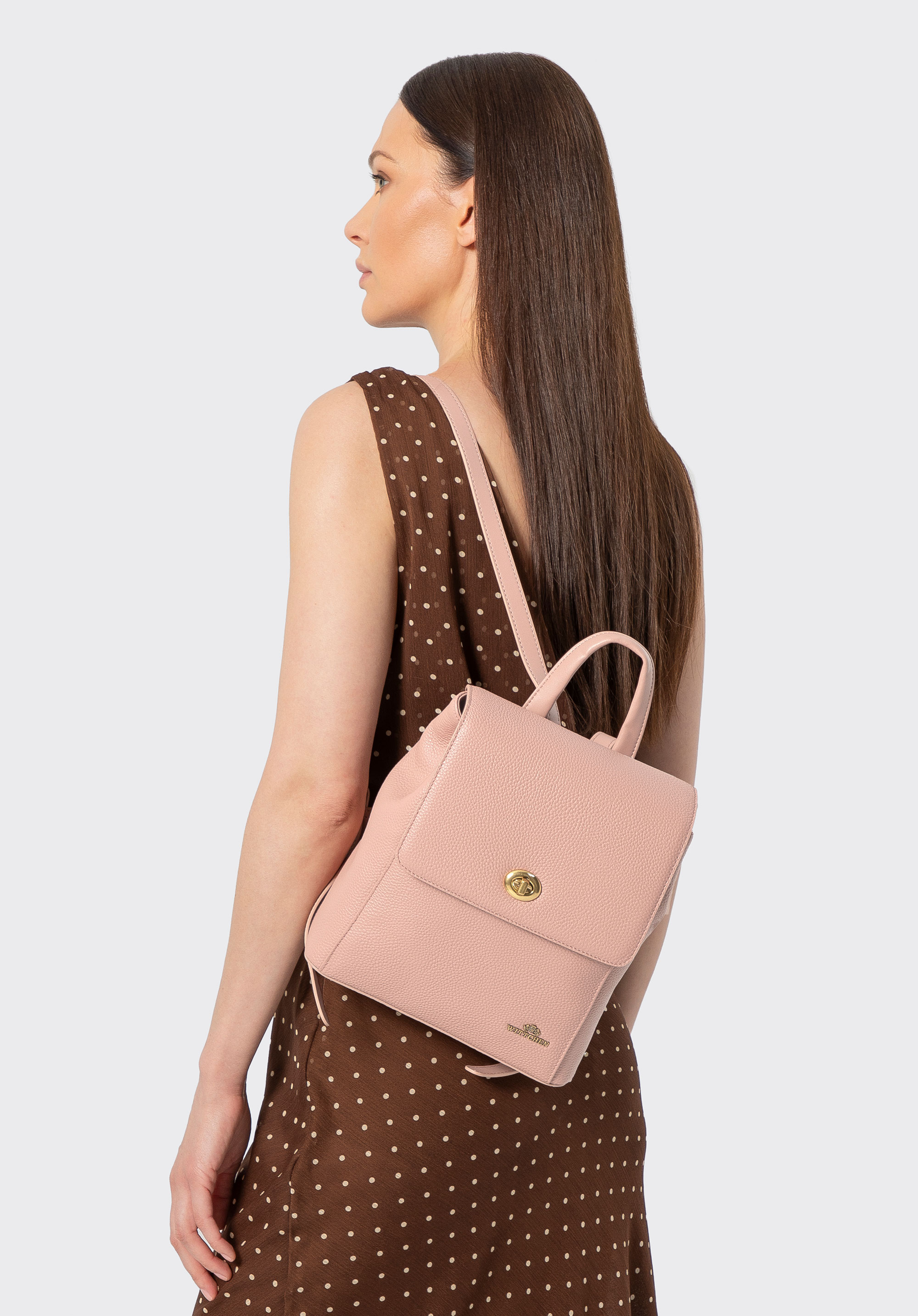 Ein stylischer Rucksack aus Naturleder (mit Griff und Riemen aus lederähnlichem Mikrofasermaterial), der Eleganz, Strapazierfähigkeit und außergewöhnliche Funktionalität vereint. Sein modernes Design wird durch einen Drehverschluss hervorgehoben, der nicht nur für Sicherheit sorgt, sondern auch eine einzigartige Note verleiht. Im Inneren verfügt der Rucksack über zwei Fächer, die durch eine Reißverschlusstasche getrennt sind.