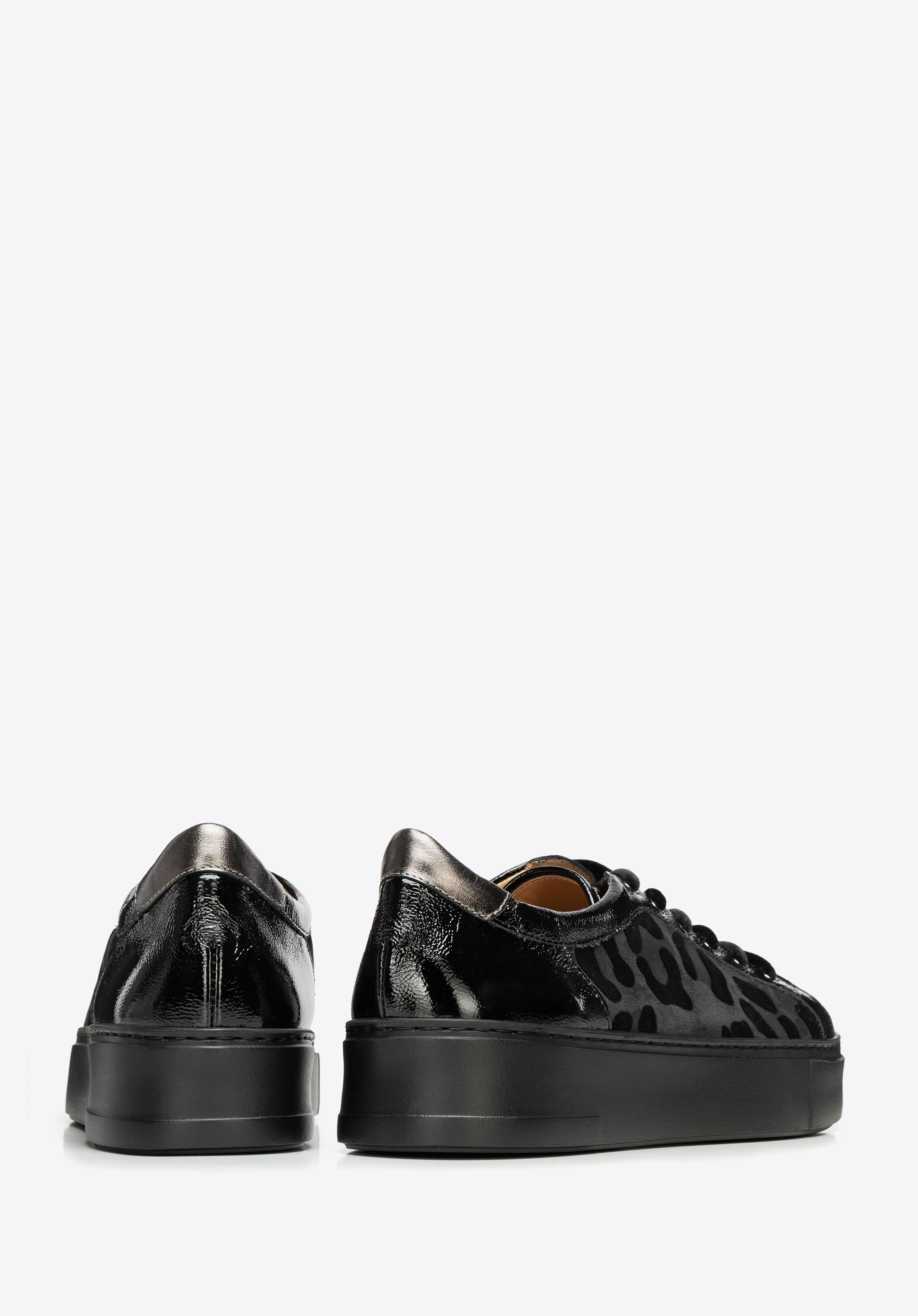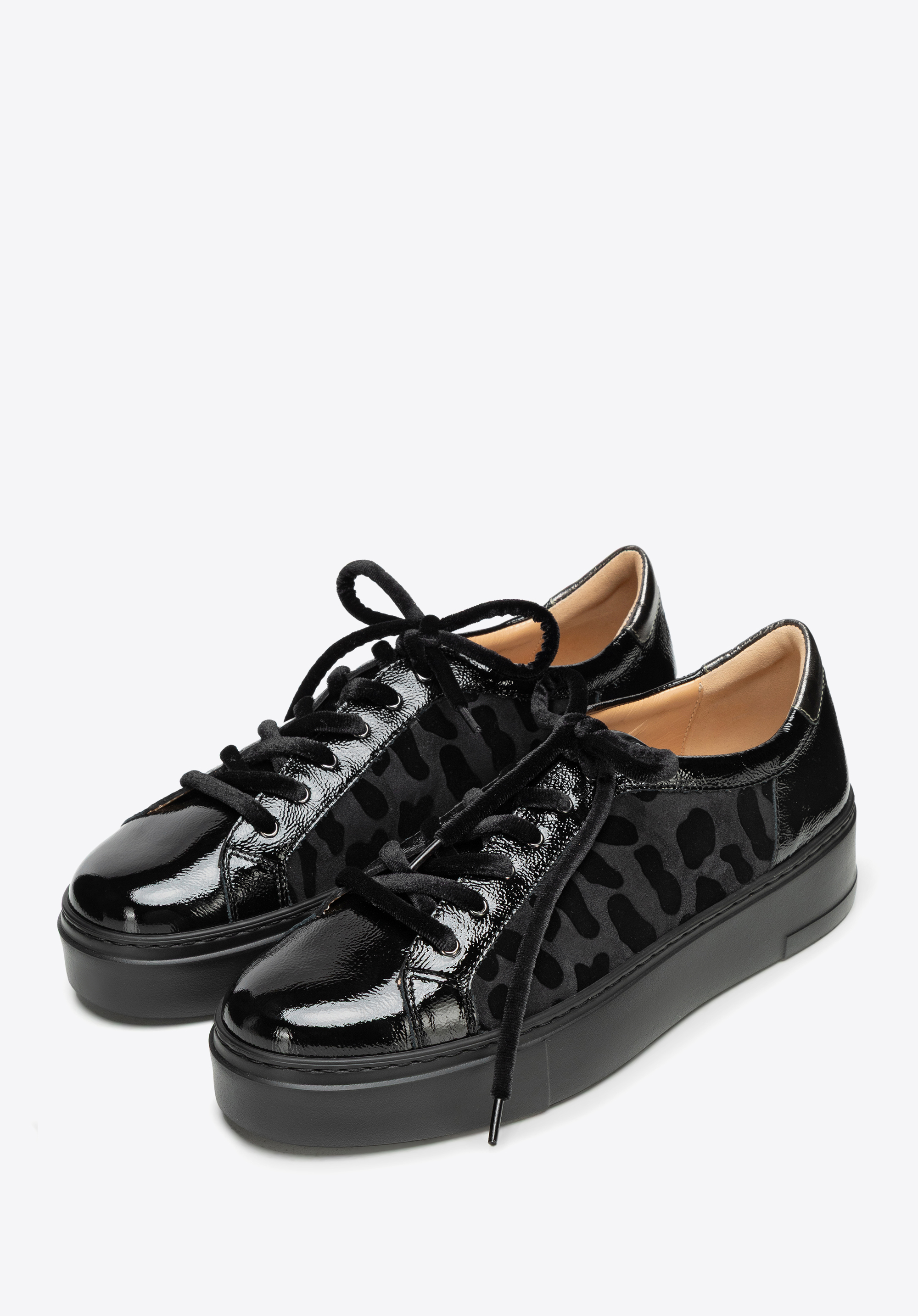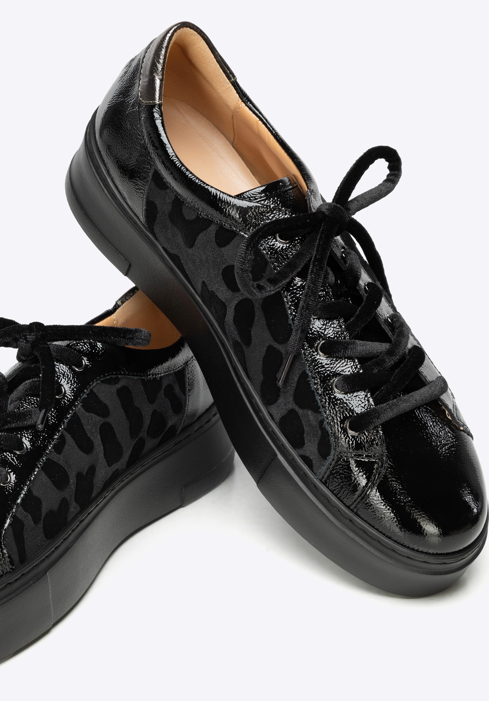 Diese Sneaker sind die perfekte Mischung aus Stil, Komfort und starkem Charakter. Sie sind aus einem Mix aus natürlichem Wildleder und Lackleder gefertigt und verfügen über ein auffälliges Leopardenmuster , das alle Blicke auf sich zieht und jedem Outfit eine unverwechselbare Note verleiht. Dicke, samtig schwarze Schnürsenkel sorgen für eine unerwartete, dekorative Note. Die bequeme Plateausohle macht sie ein paar Zentimeter höher, ohne den ganztägigen Tragekomfort zu beeinträchtigen. Die abgerundete Zehenpartie bietet ausreichend Platz für Ihre Zehen, während die Lederinnenseite für dauerhaften Komfort sorgt.