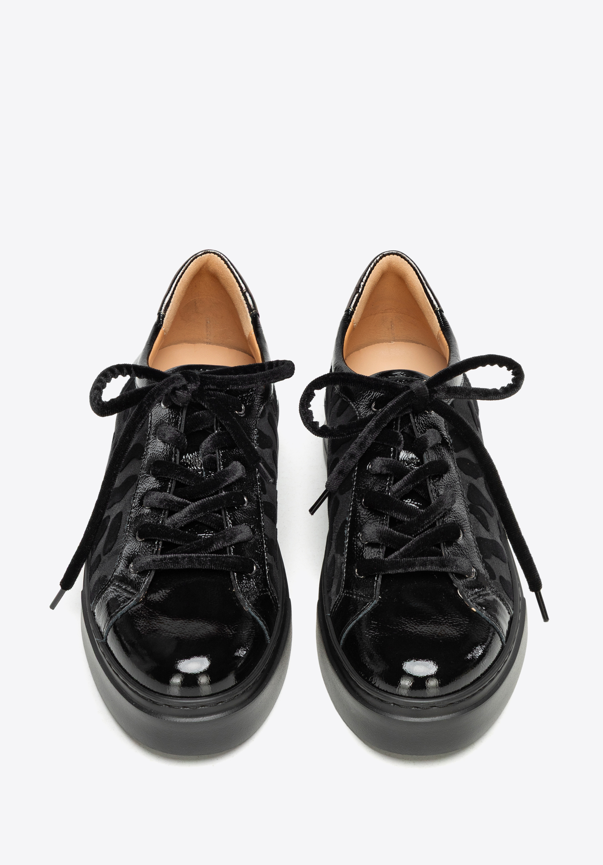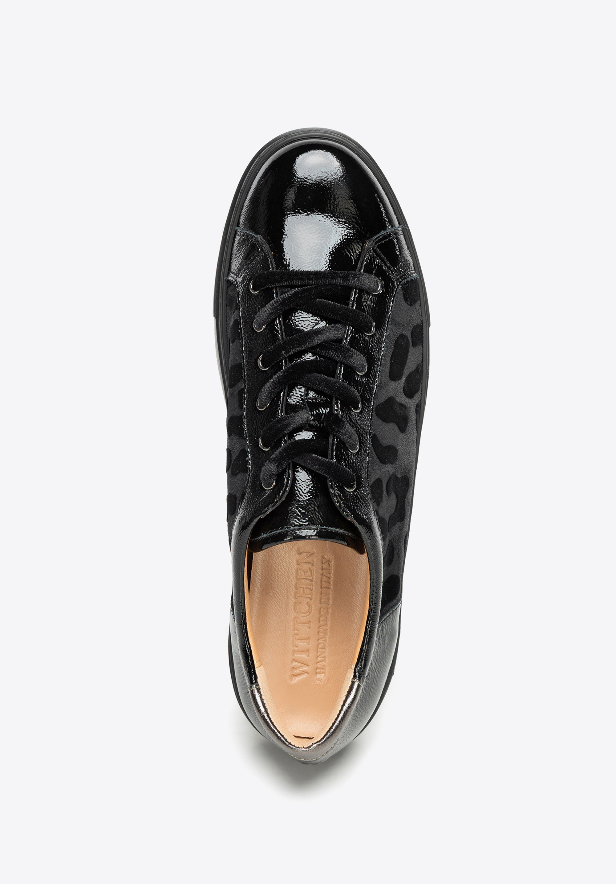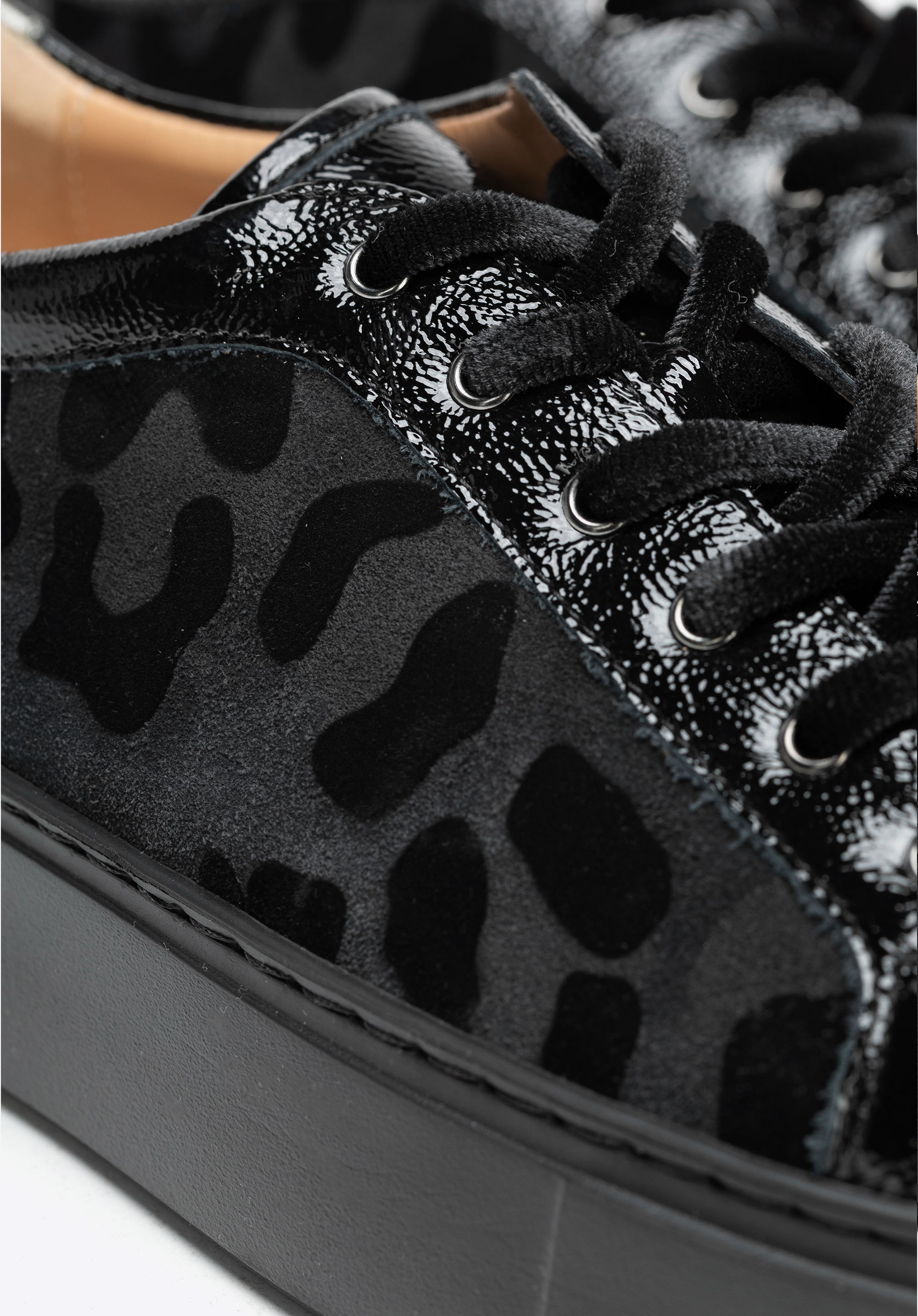 Diese Sneaker sind die perfekte Mischung aus Stil, Komfort und starkem Charakter. Sie sind aus einem Mix aus natürlichem Wildleder und Lackleder gefertigt und verfügen über ein auffälliges Leopardenmuster , das alle Blicke auf sich zieht und jedem Outfit eine unverwechselbare Note verleiht. Dicke, samtig schwarze Schnürsenkel sorgen für eine unerwartete, dekorative Note. Die bequeme Plateausohle macht sie ein paar Zentimeter höher, ohne den ganztägigen Tragekomfort zu beeinträchtigen. Die abgerundete Zehenpartie bietet ausreichend Platz für Ihre Zehen, während die Lederinnenseite für dauerhaften Komfort sorgt.