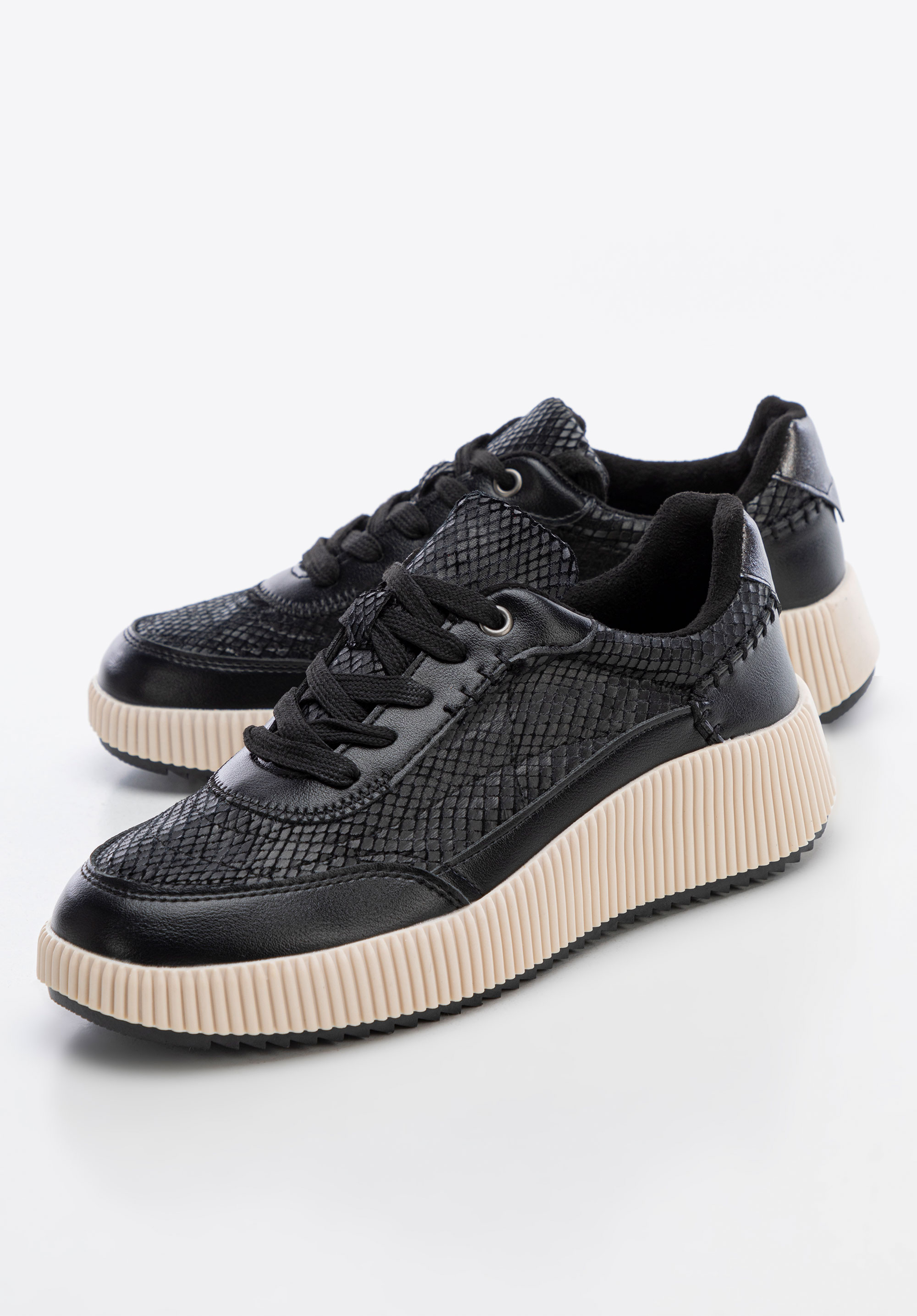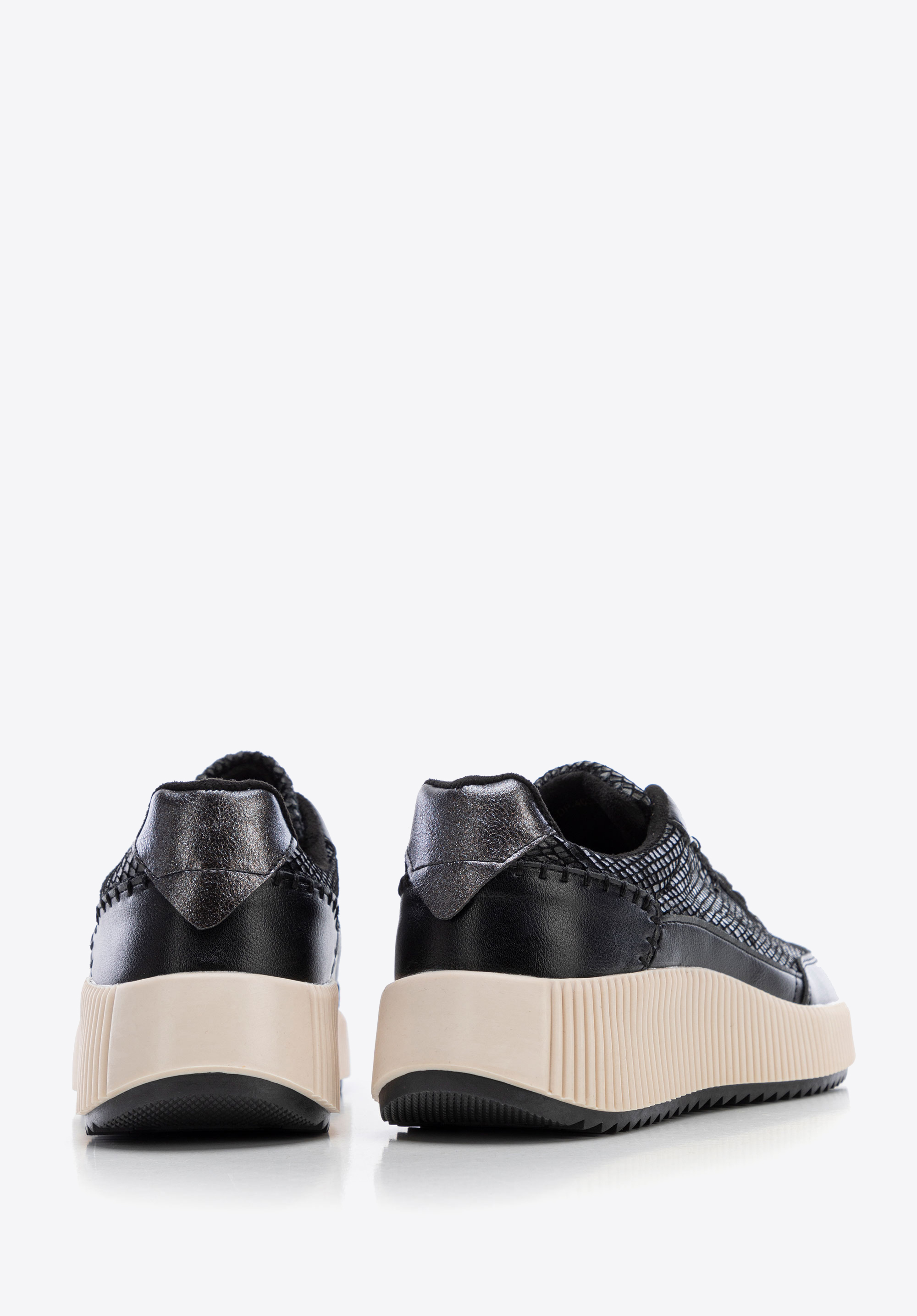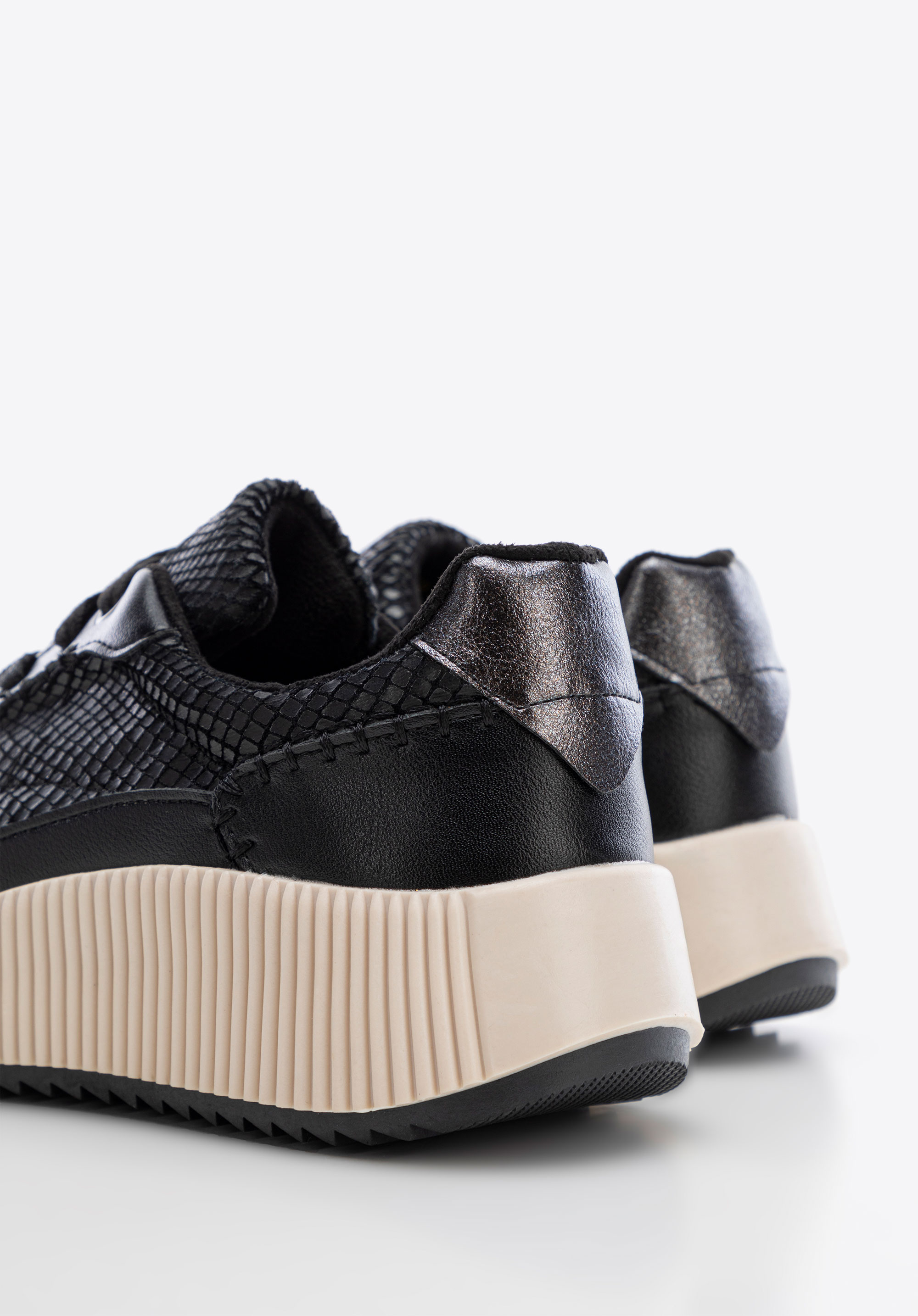 Unsere Damen-Sneakers aus Öko Leder zeichnen sich durch geometrische Nähte und dezente Glitzerakzente an der Ferse aus, die für ein elegantes Flair sorgen. Die mandelförmige Schuhspitze setzt einen eleganten Akzent, während die klobige, geriffelte Sohle für Stabilität und Komfort sorgt. Das Innenleben der Schuhe mit einer weichen Innensohle aus Öko Leder und Synthetik Futter garantiert den ganzen Tag über Komfort. Perfekt für den Alltag und die Abendgestaltung.