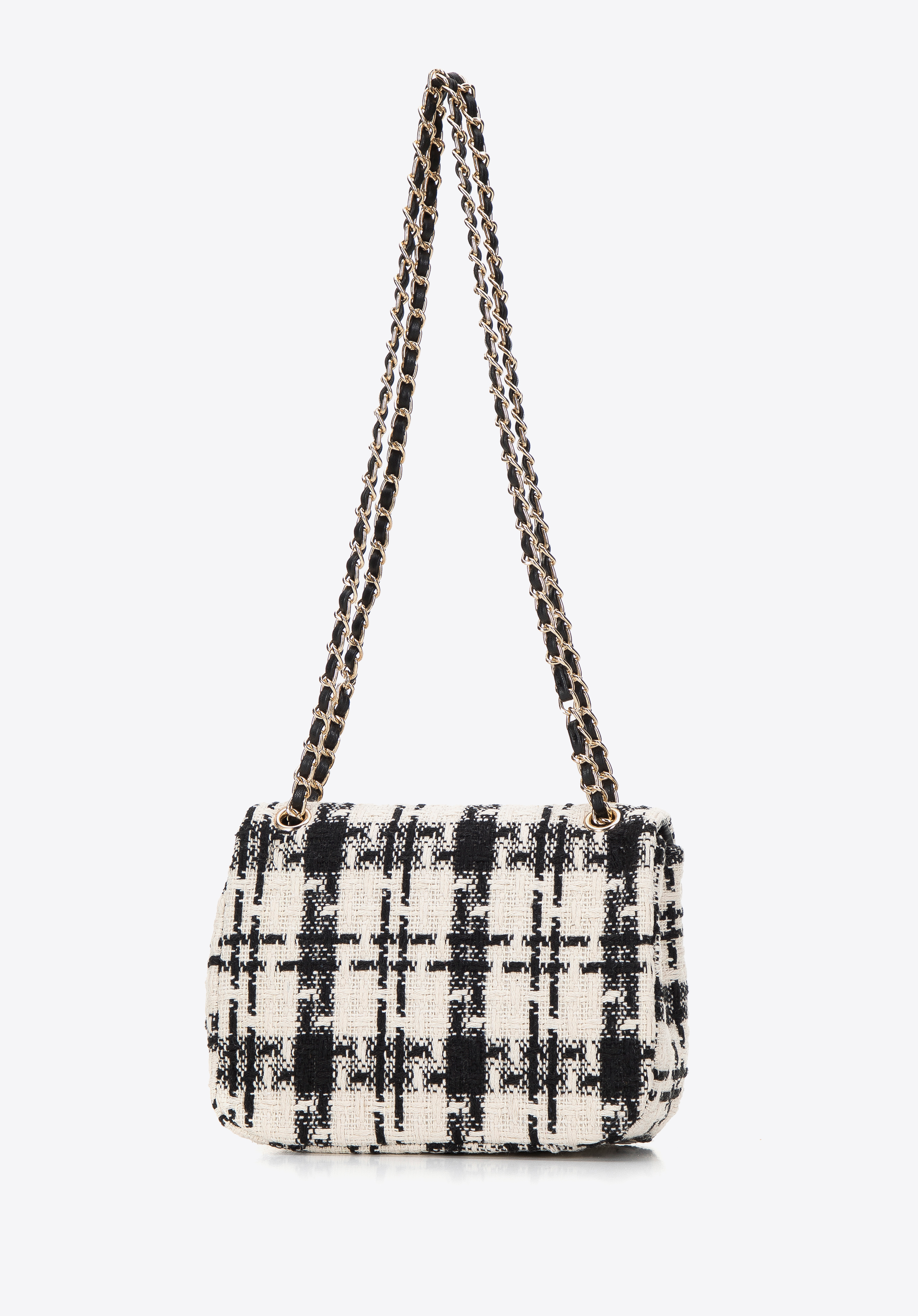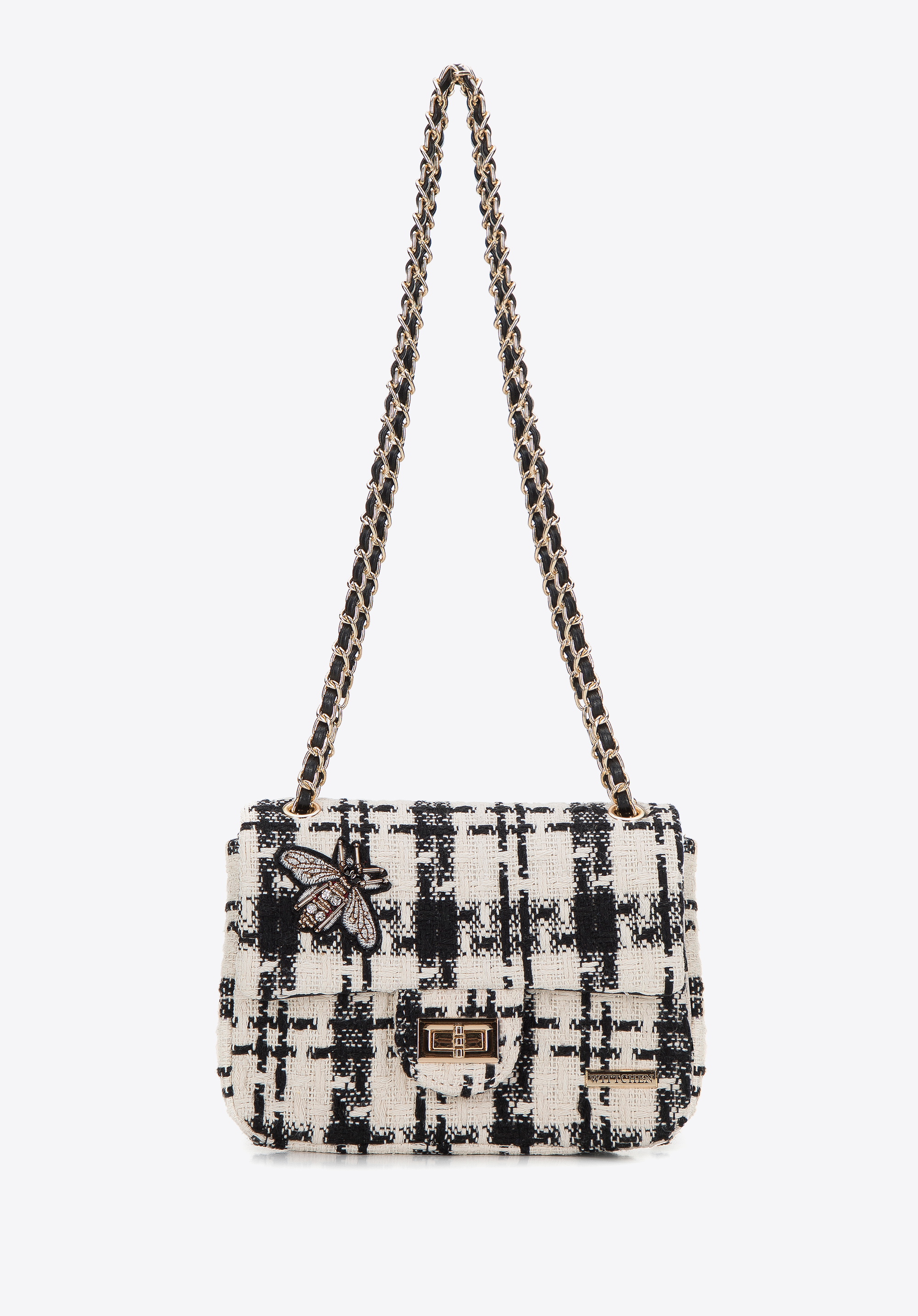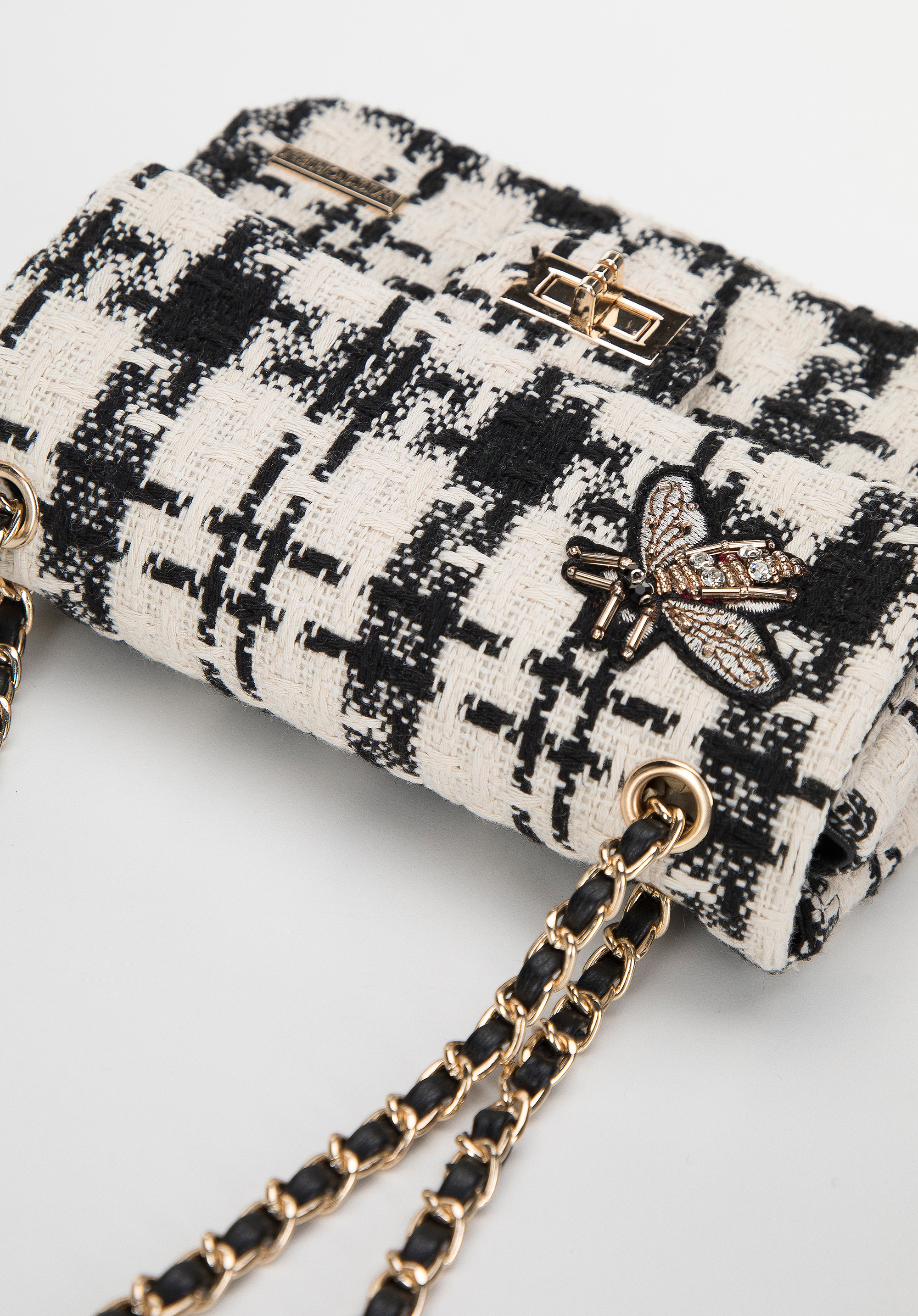 Diese originelle kleine Handtasche wird viele Blicke auf sich ziehen. Sie ist aus weichem Stoff mit einem karierten Muster gefertigt. Sie ist mit einem glitzernden Insekt aus Plastikkristallen verziert. Im Inneren finden Sie Platz für Ihr Handy, Kartenetui, Handcreme und ein paar Kleinigkeiten. Tragen Sie sie zu einem Retro-Look oder kombinieren Sie sie mit einem eleganten, taillierten Kleid. Diese originelle Handtasche bringt einen neuen Stil in Ihre Garderobe.