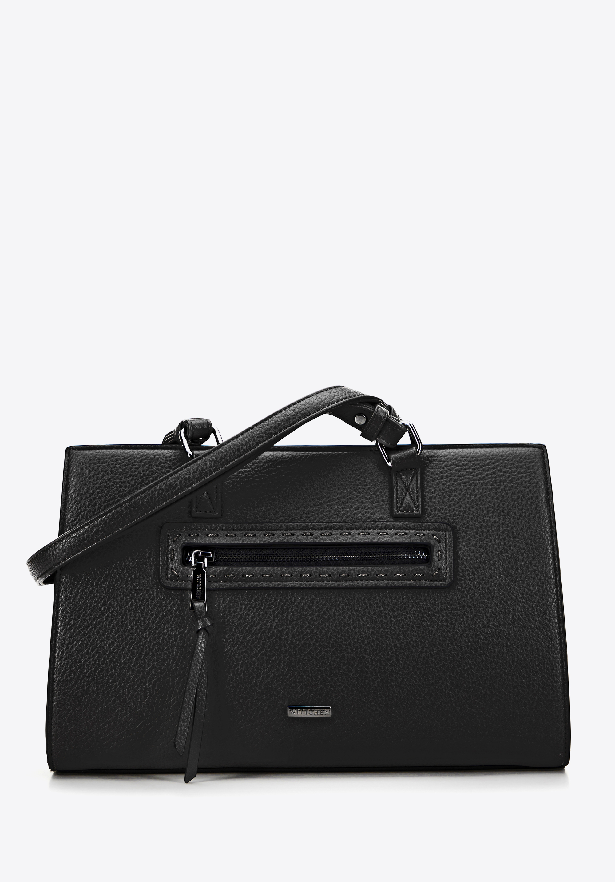 Unsere außergewöhnliche Damenhandtasche aus Kunstleder ist die Essenz von Eleganz und Funktionalität. Der stabile Boden und die zwei eleganten Tragegriffe garantieren nicht nur Komfort, sondern auch Langlebigkeit im täglichen Gebrauch. Der einteilige Innenraum macht die Organisation Ihrer Sachen unglaublich einfach. Hier finden Sie alles, was Sie brauchen: Zwei kleine offene Taschen und eine Reißverschlusstasche bieten zusätzlichen Platz für Kleinigkeiten. Externe Reißverschlusstaschen auf beiden Seiten der Handtasche gewährleisten schnellen Zugriff auf wichtige Gegenstände. Die mit Ziernähten verzierte Vordertasche verleiht Eleganz und Stil. Das WITTCHEN-Logo , das sowohl auf der Vorderseite als auch im Inneren der Handtasche sichtbar ist, unterstreicht den einzigartigen Charakter und die hohe Qualität des Produkts.