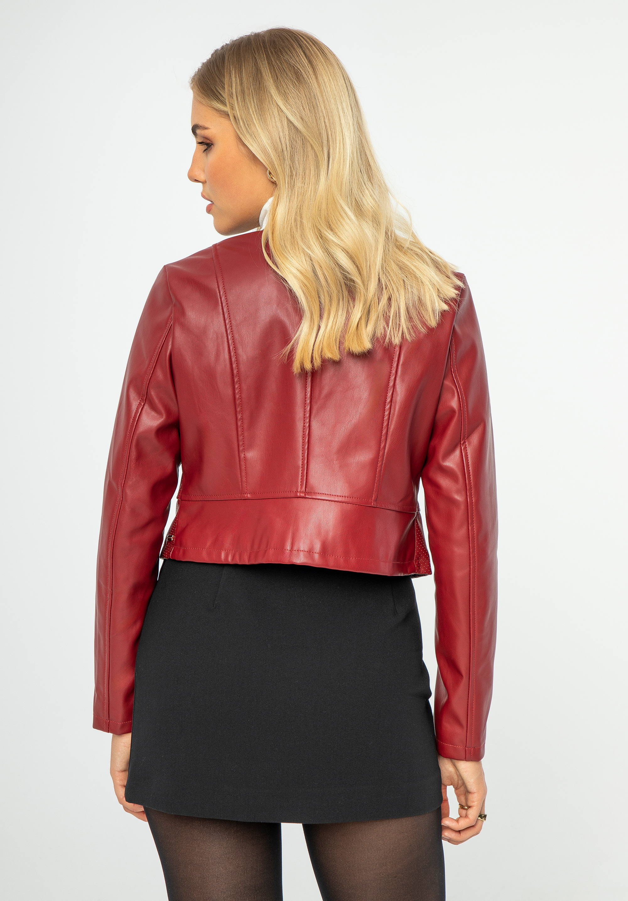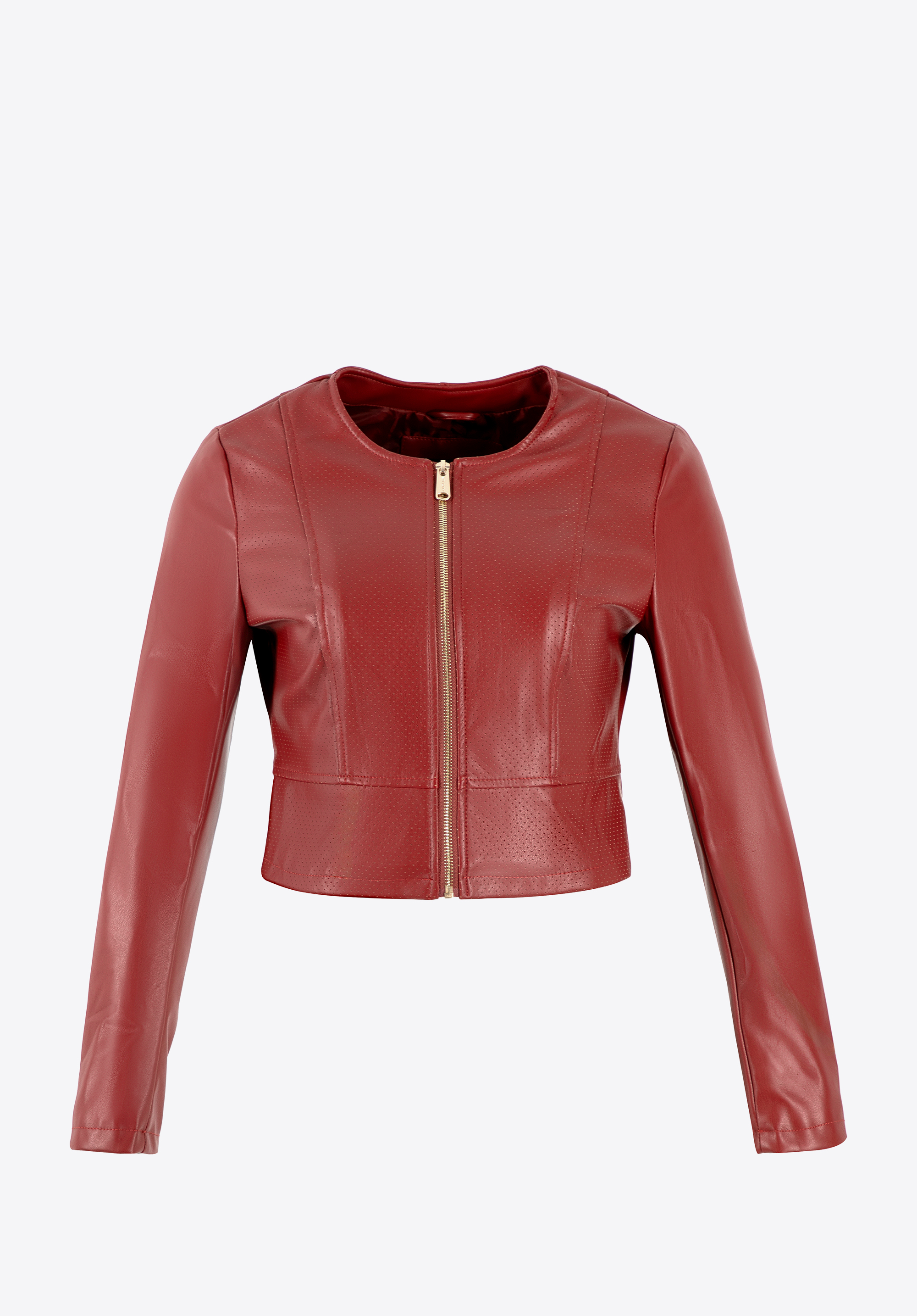 Entdecken Sie mit unserer Damenjacke eine neue Dimension der Eleganz – eine perfekte Mischung aus Stil, Komfort und modernen Lösungen. Sie ist aus hochwertigem Kunstleder gefertigt und kombiniert einen luxuriösen Look mit einem umweltfreundlichen Ansatz, sodass Sie eine modische Wahl treffen können. Der kurze, taillierte Schnitt betont Ihre Figur wunderschön und verleiht ihr weiblichen Charme und Eleganz. Das Polyesterfutter sorgt für Weichheit und Haltbarkeit, während der Reißverschluss Funktionalität mit klassischem Stil verbindet. Das taschenfreie Design fällt mit seiner minimalistischen Ästhetik auf und entspricht perfekt den aktuellen Modetrends.