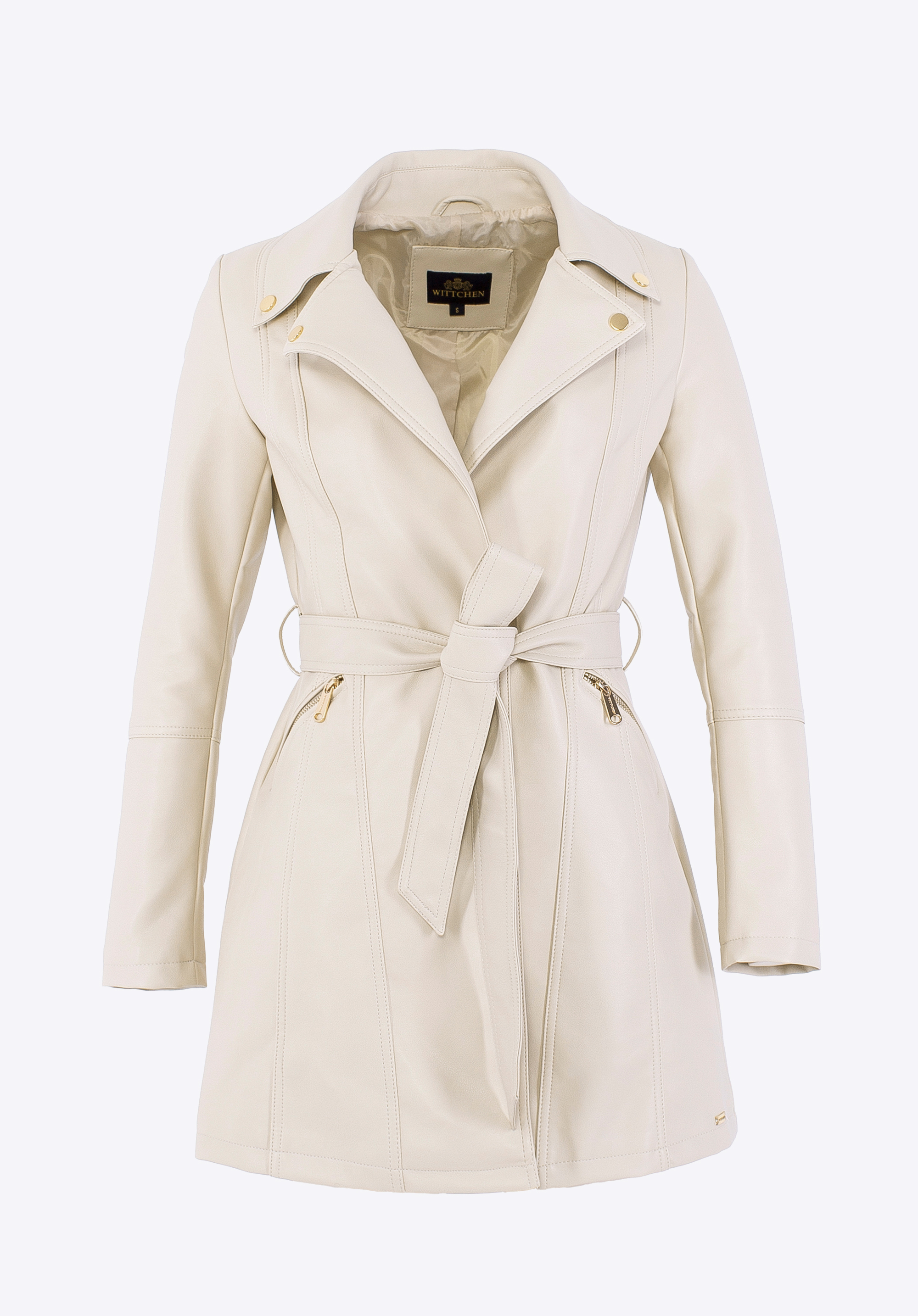 Metallische Akzente, ein perfekter Schnitt und zeitloser Charakter - dieser Mantel aus Ökoleder ist ein absolutes Must-have in Ihrem Kleiderschrank! Das Modell wird in der Taille mit einem Gürtel gebunden, der die Silhouette perfekt unterstreicht, und die beiden praktischen Reißverschlusstaschen sind nicht nur ein funktionelles Detail, sondern auch ein Element, das dem Mantel ein modernes Design verleiht. Ein dezentes Herstellerlogo aus Metall an der Seite und Nieten am Kragen sorgen für einen raubtierhaften Touch und vervollständigen den Look. Ein Mantel, der Selbstbewusstsein und Charakterstärke ausdrückt - die perfekte Wahl für Frauen, die wissen, was sie wollen!