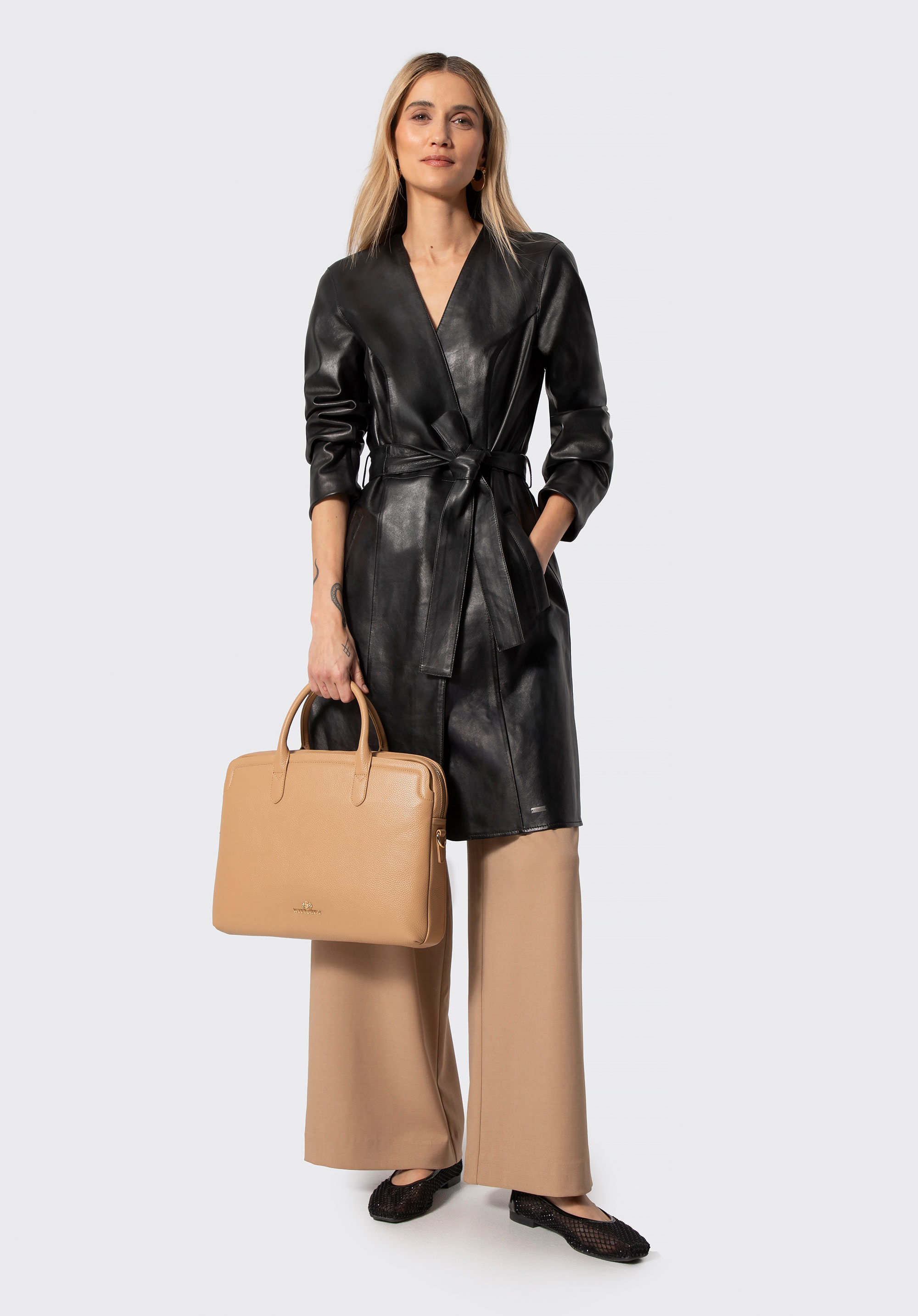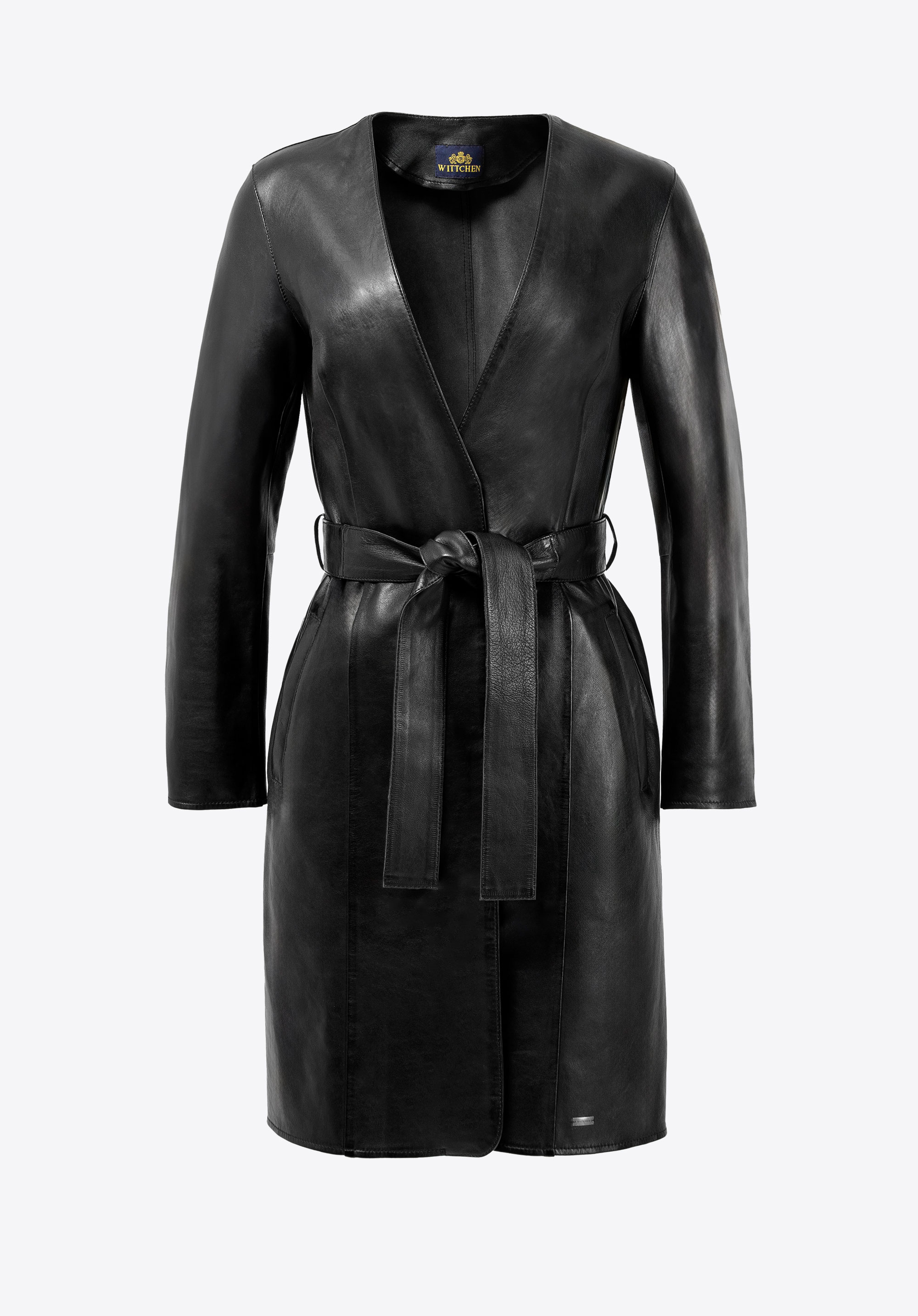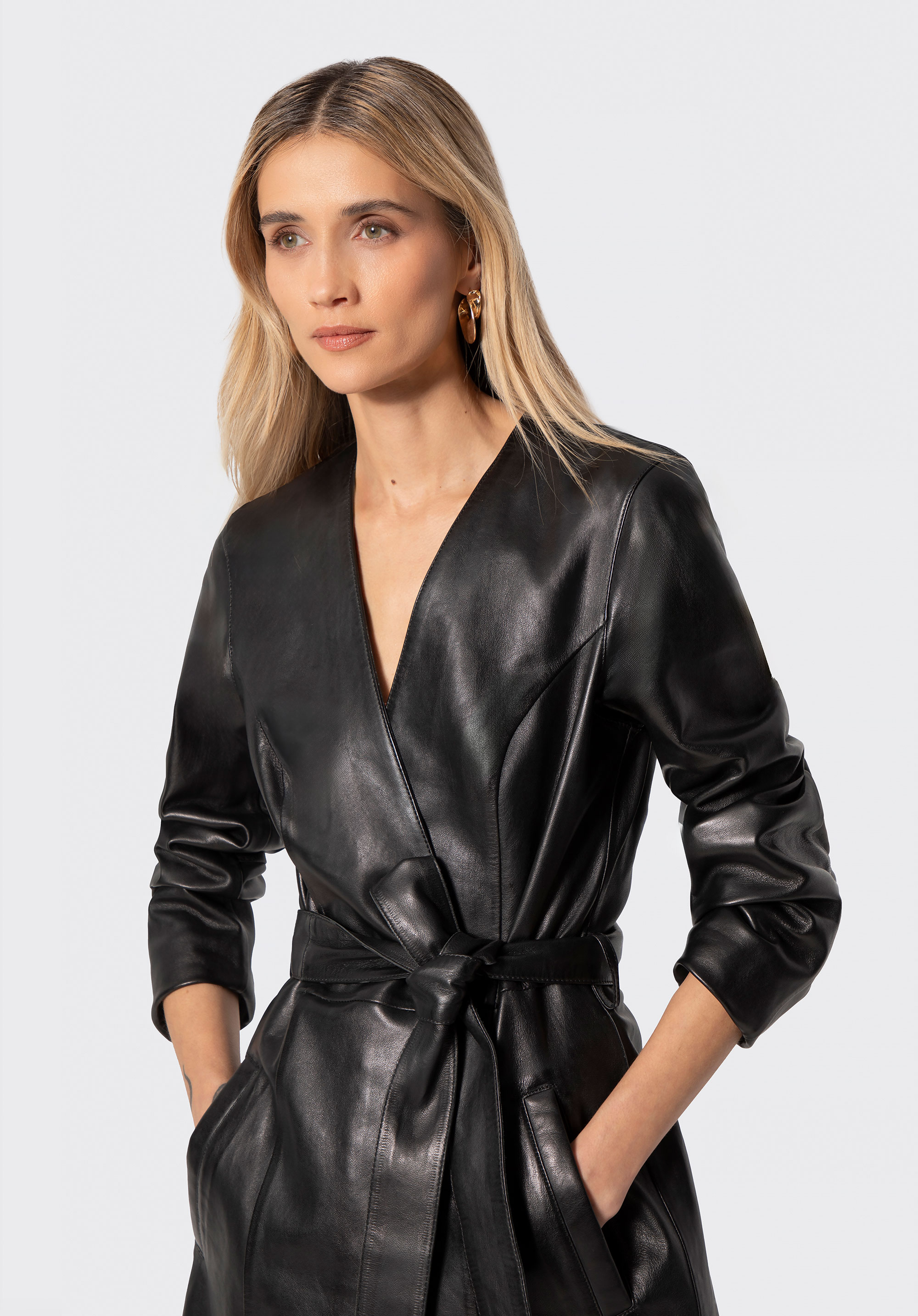 Dieser Mantel verkörpert zeitlose Eleganz mit einem modernen Touch. Gefertigt aus naturbelassenem Lammleder , ist er wunderbar weich und hat einen dezenten Glanz, der seine luxuriöse Qualität unterstreicht. Die klare, gestreckte Silhouette in Kombination mit dem Bindegürtel betont die Taille und sorgt für harmonische Proportionen. Dieser Stil vereint Minimalismus mit raffinierter Weiblichkeit.