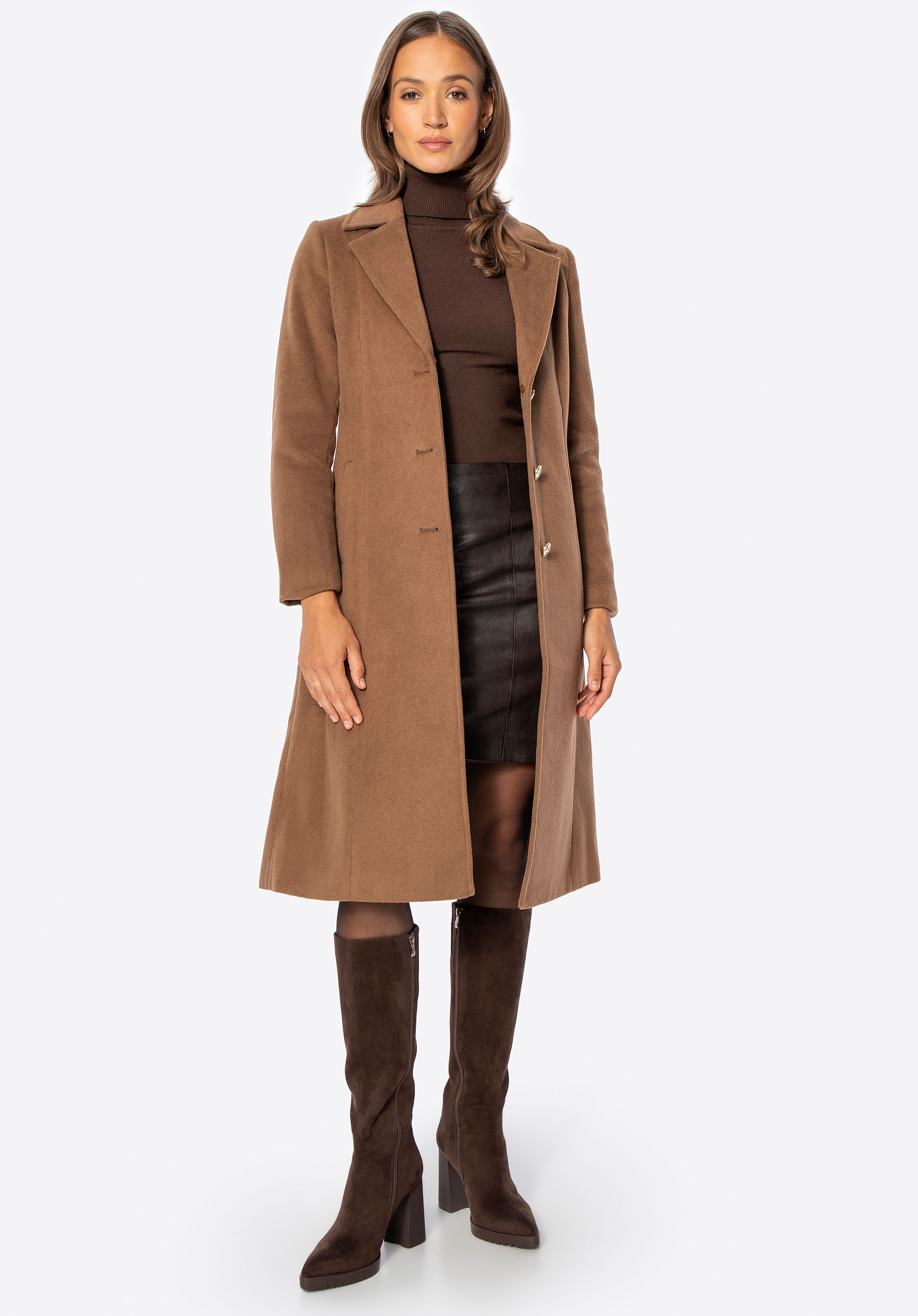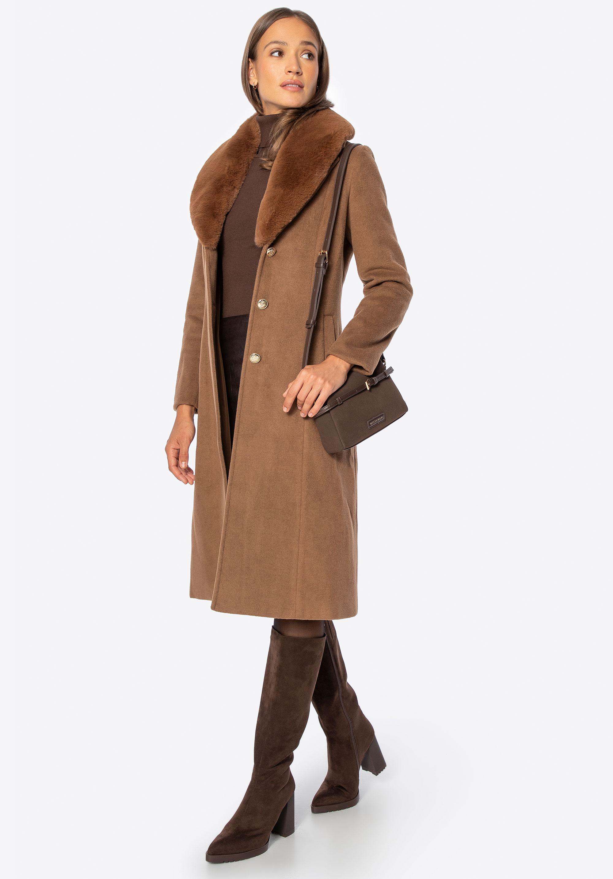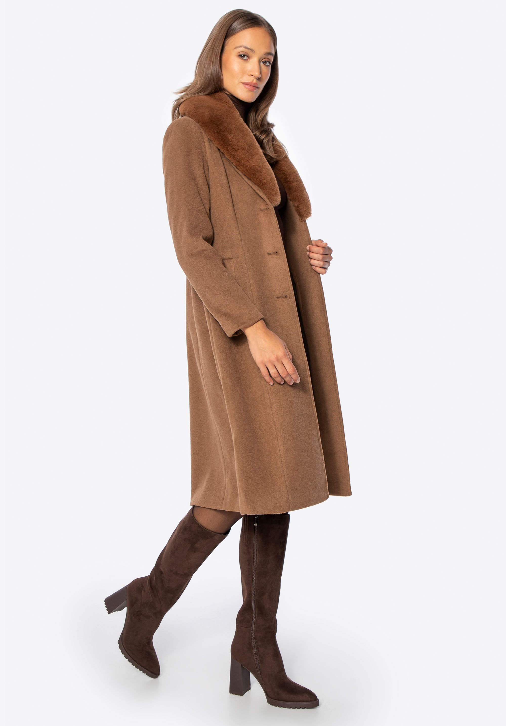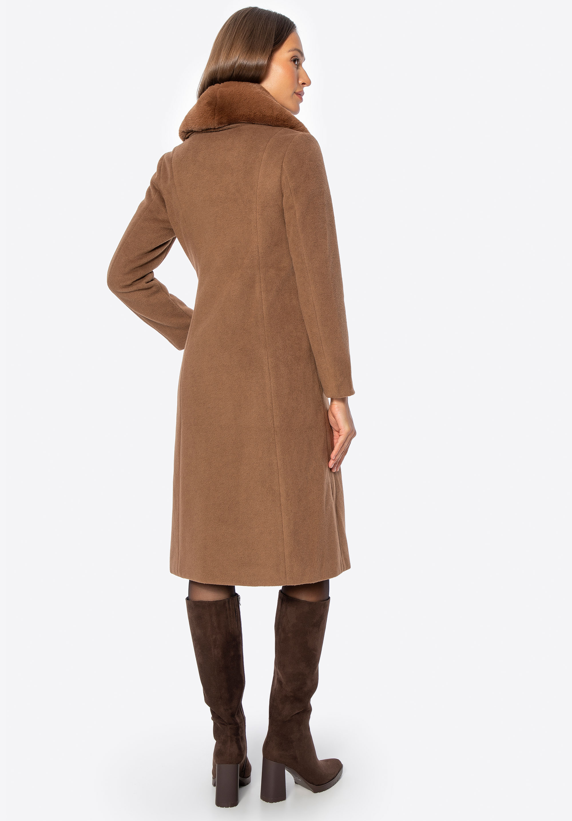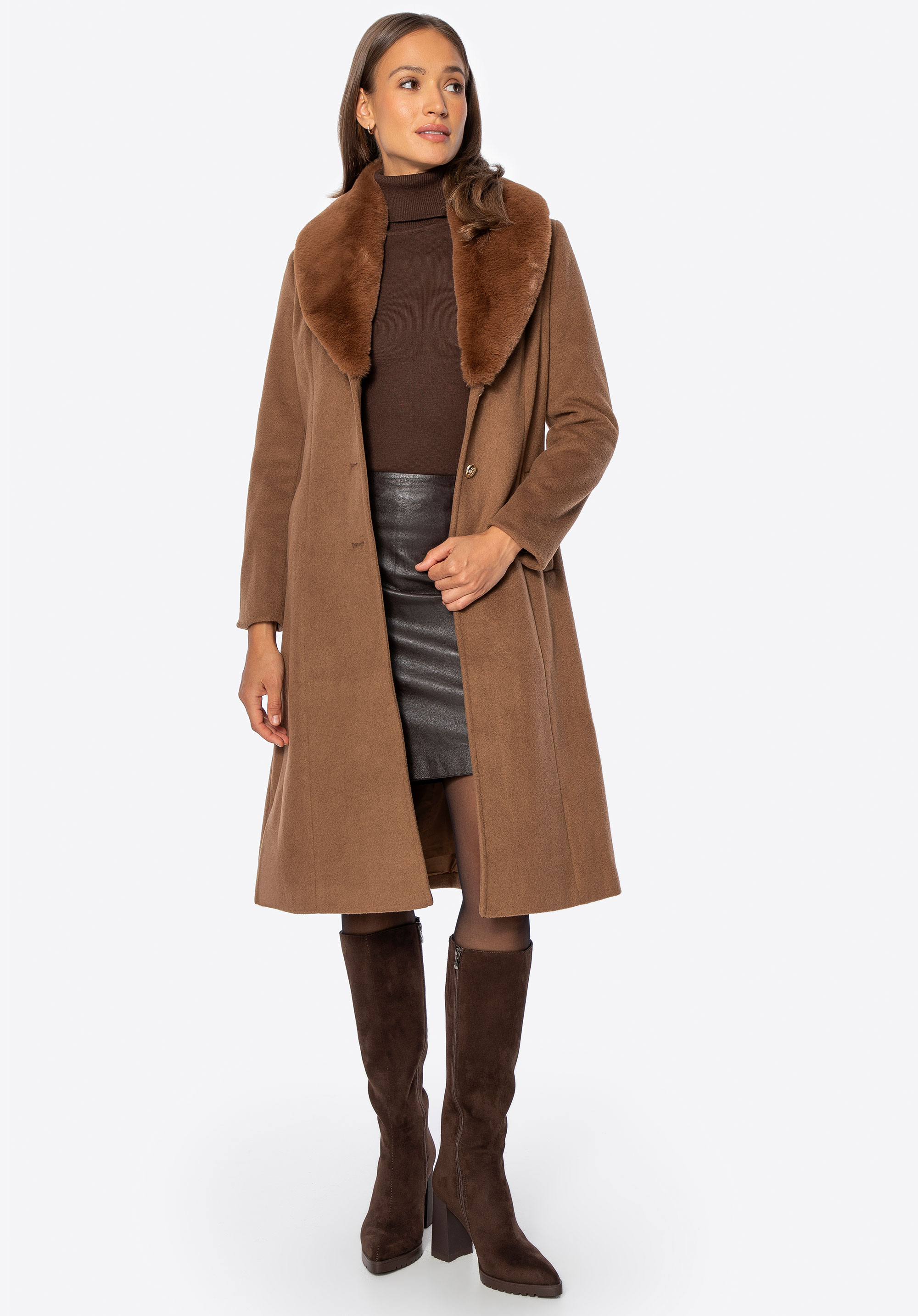 Unser Tipp: Kombinieren Sie den Mantel mit eleganten Ankle Boots oder Knee-High-Boots und einer passenden Lederhandtasche für einen schicken Look für kältere Tage. Dank des abnehmbaren Fells können Sie den Style ganz einfach an Anlass und Wetter anpassen.