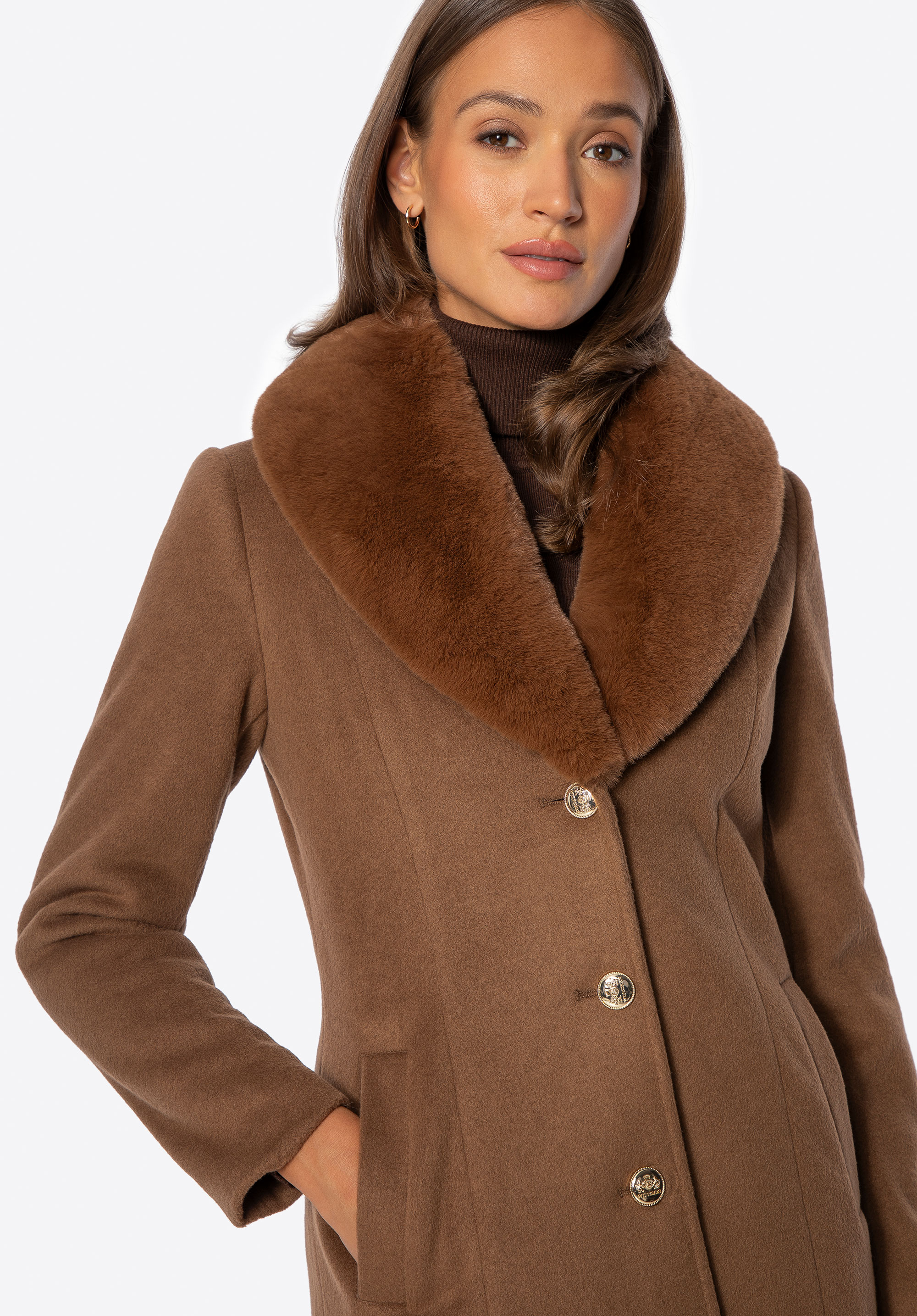 - Abnehmbarer Kunstpelzkragen : Ändert den Charakter des Mantels ganz einfach von gemütlich und elegant zu leicht und modern.