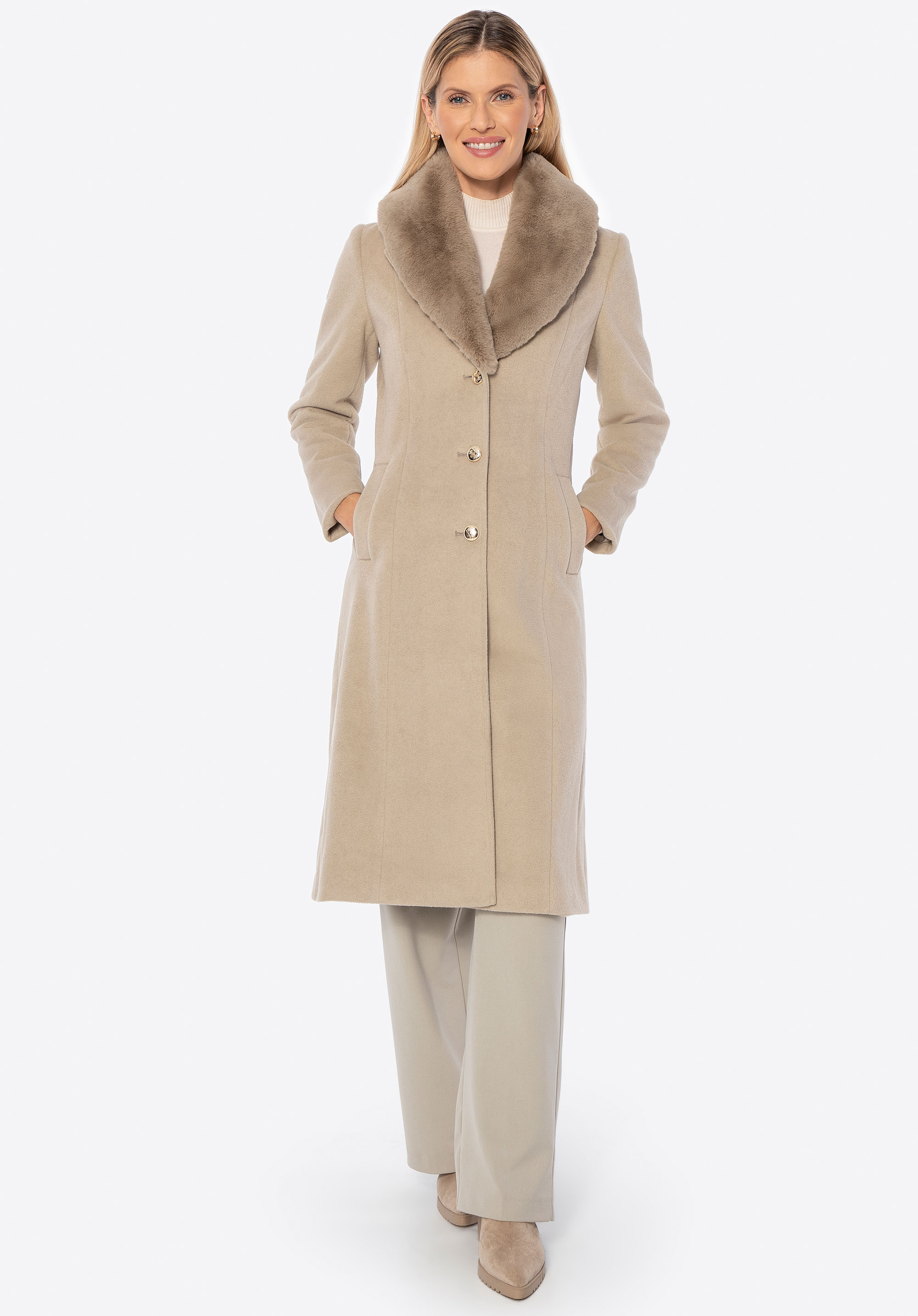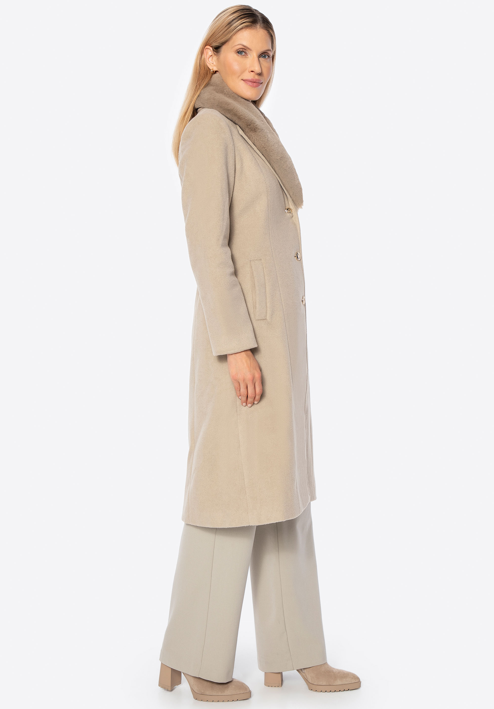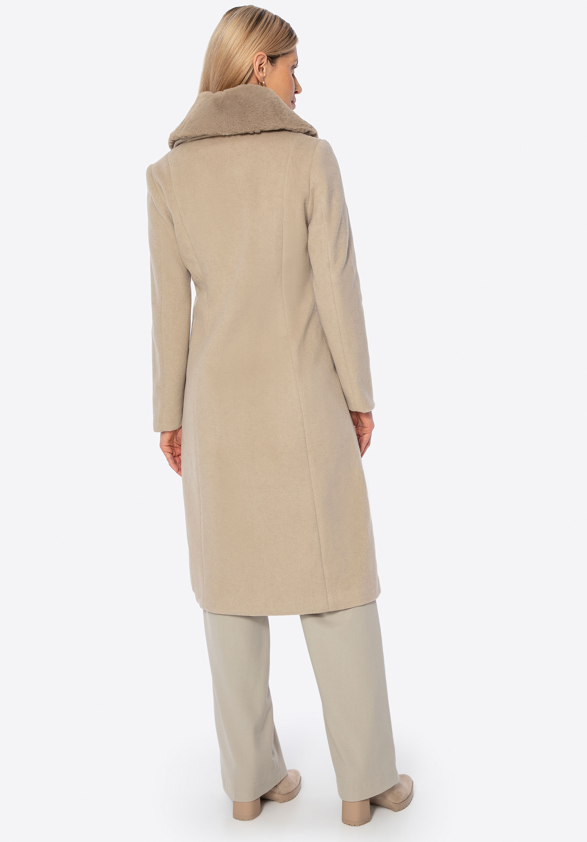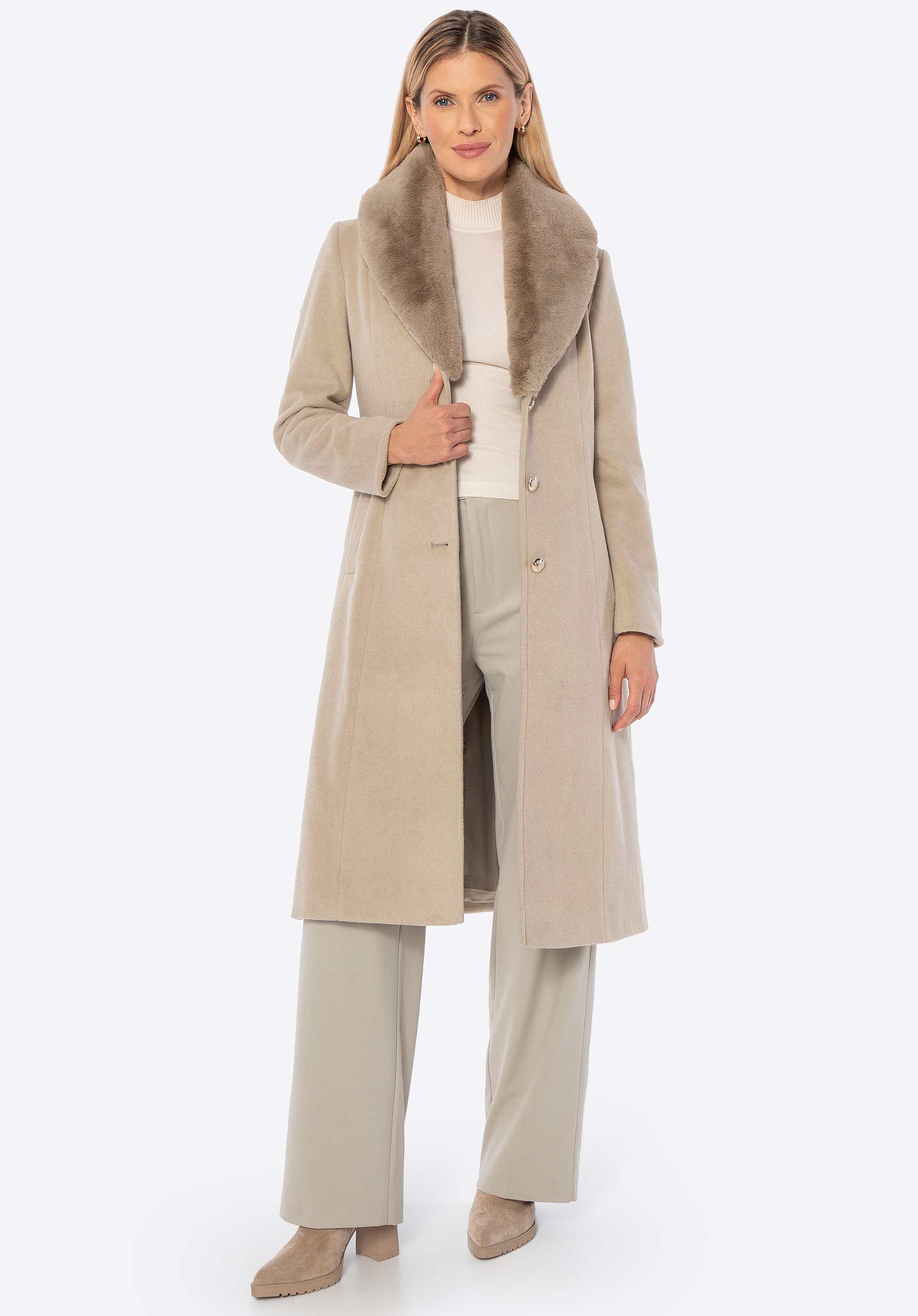 Unser Tipp: Kombinieren Sie den Mantel mit eleganten Ankle Boots oder Knee-High-Boots und einer passenden Lederhandtasche für einen schicken Look für kältere Tage. Dank des abnehmbaren Fells können Sie den Style ganz einfach an Anlass und Wetter anpassen.