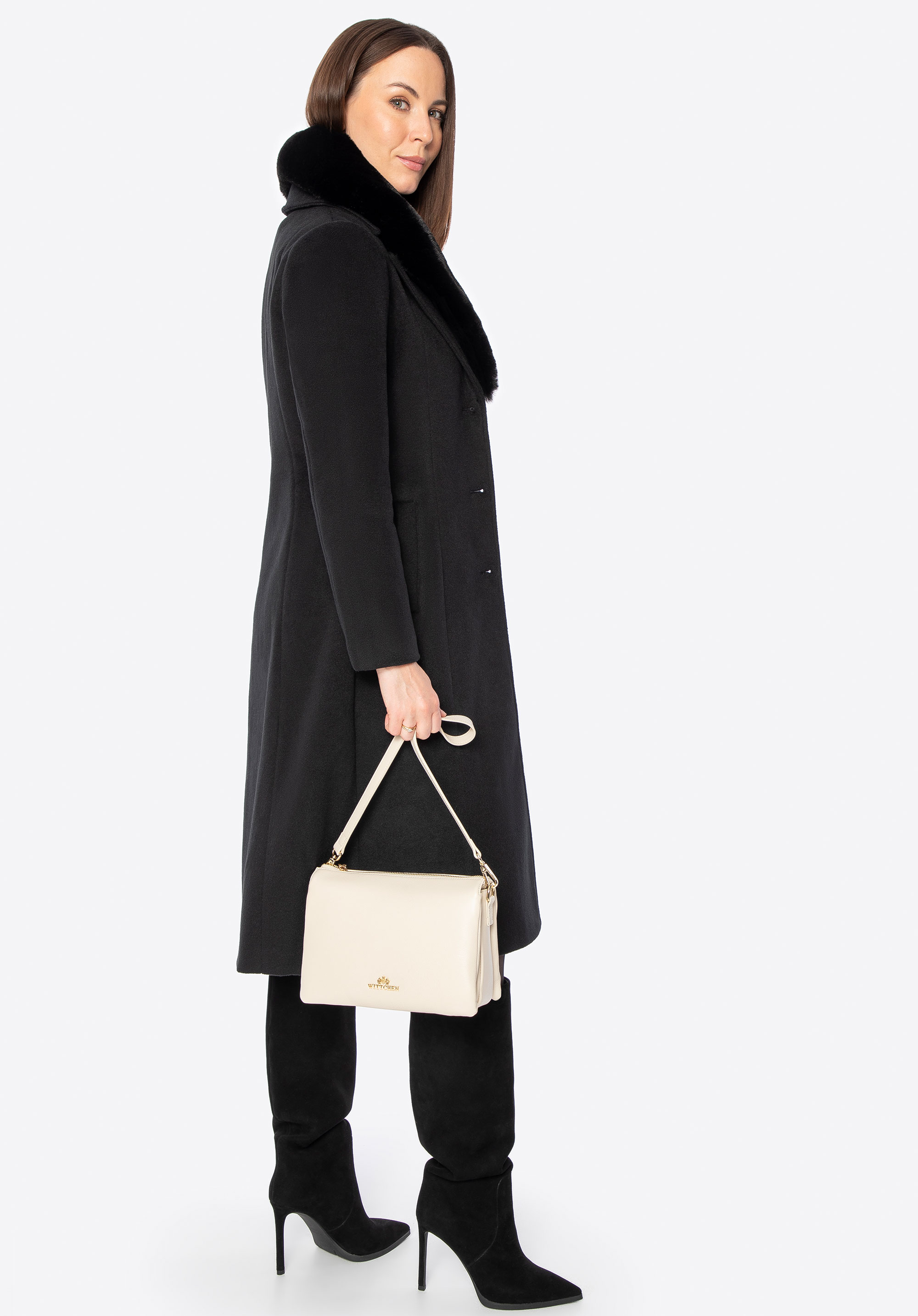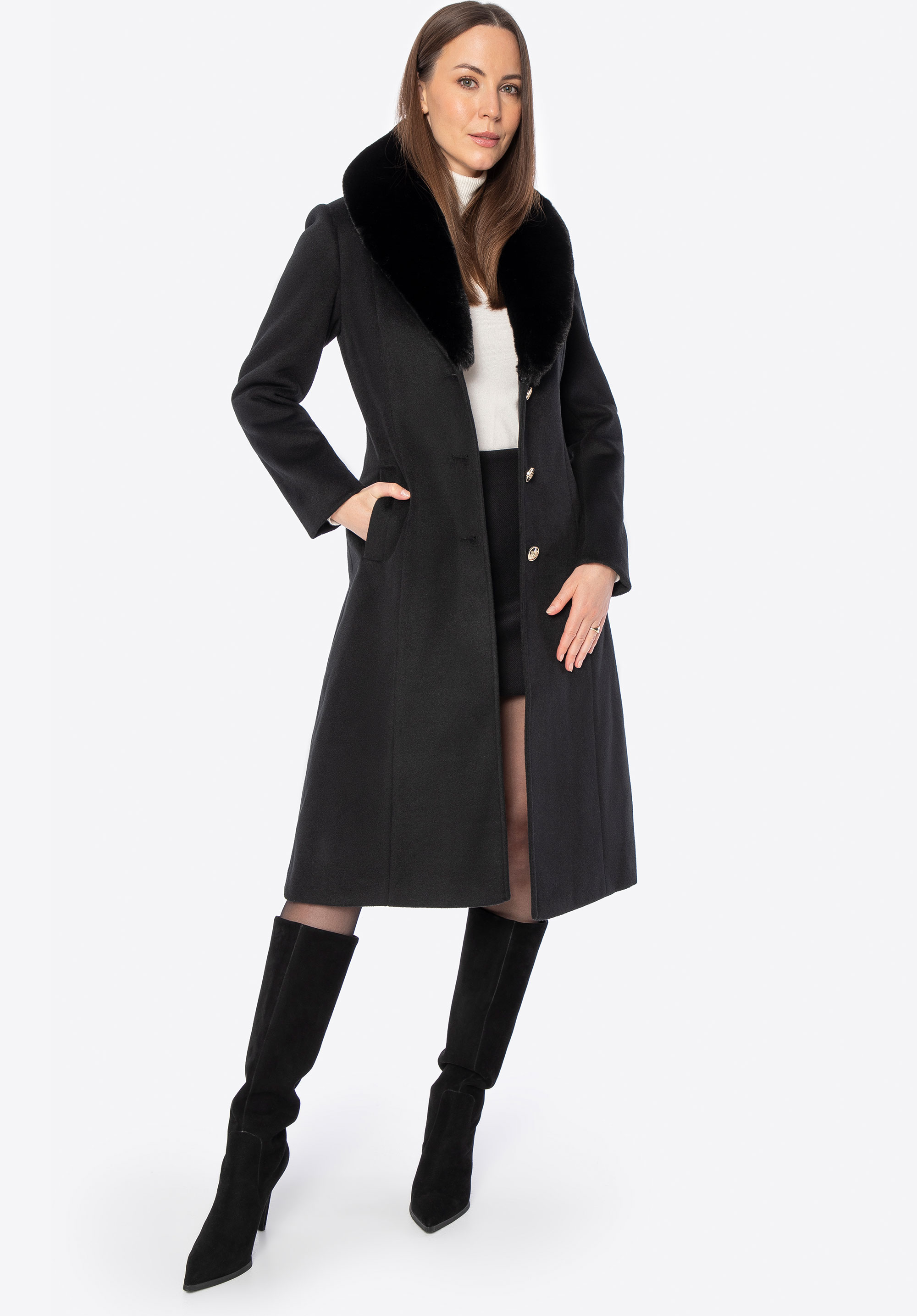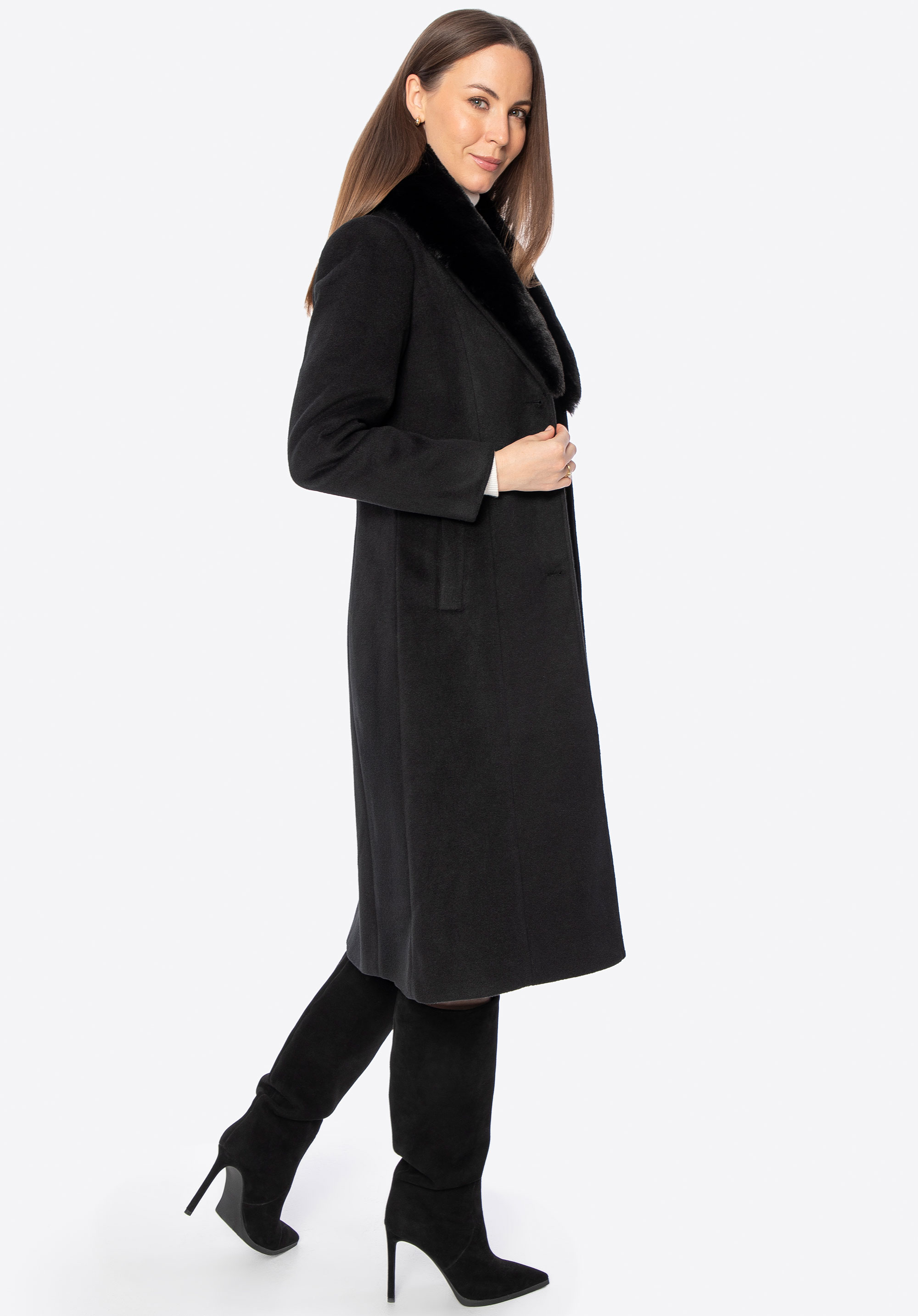 Unser Tipp: Kombinieren Sie den Mantel mit eleganten Ankle Boots oder Knee-High-Boots und einer passenden Lederhandtasche für einen schicken Look für kältere Tage. Dank des abnehmbaren Fells können Sie den Style ganz einfach an Anlass und Wetter anpassen.