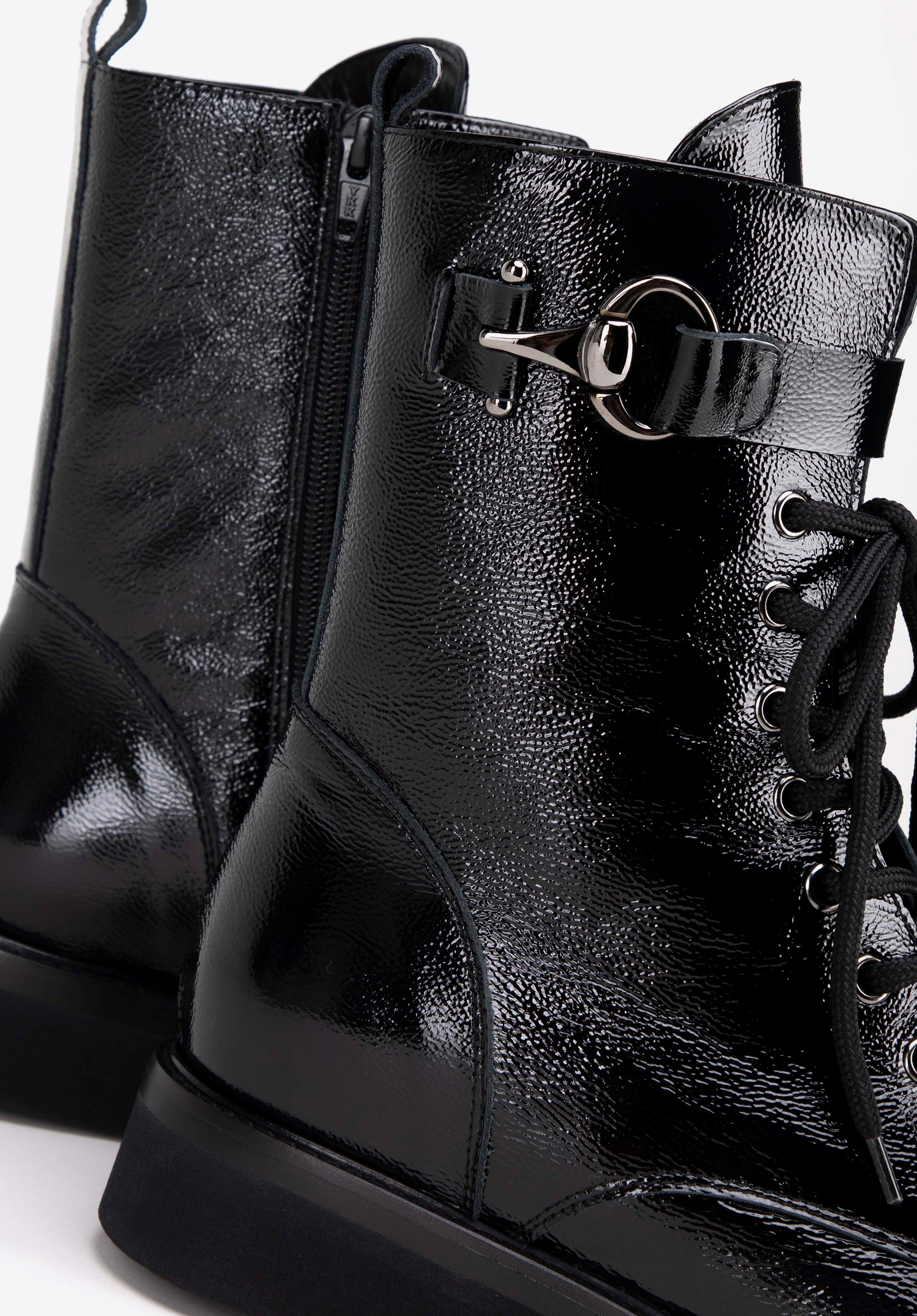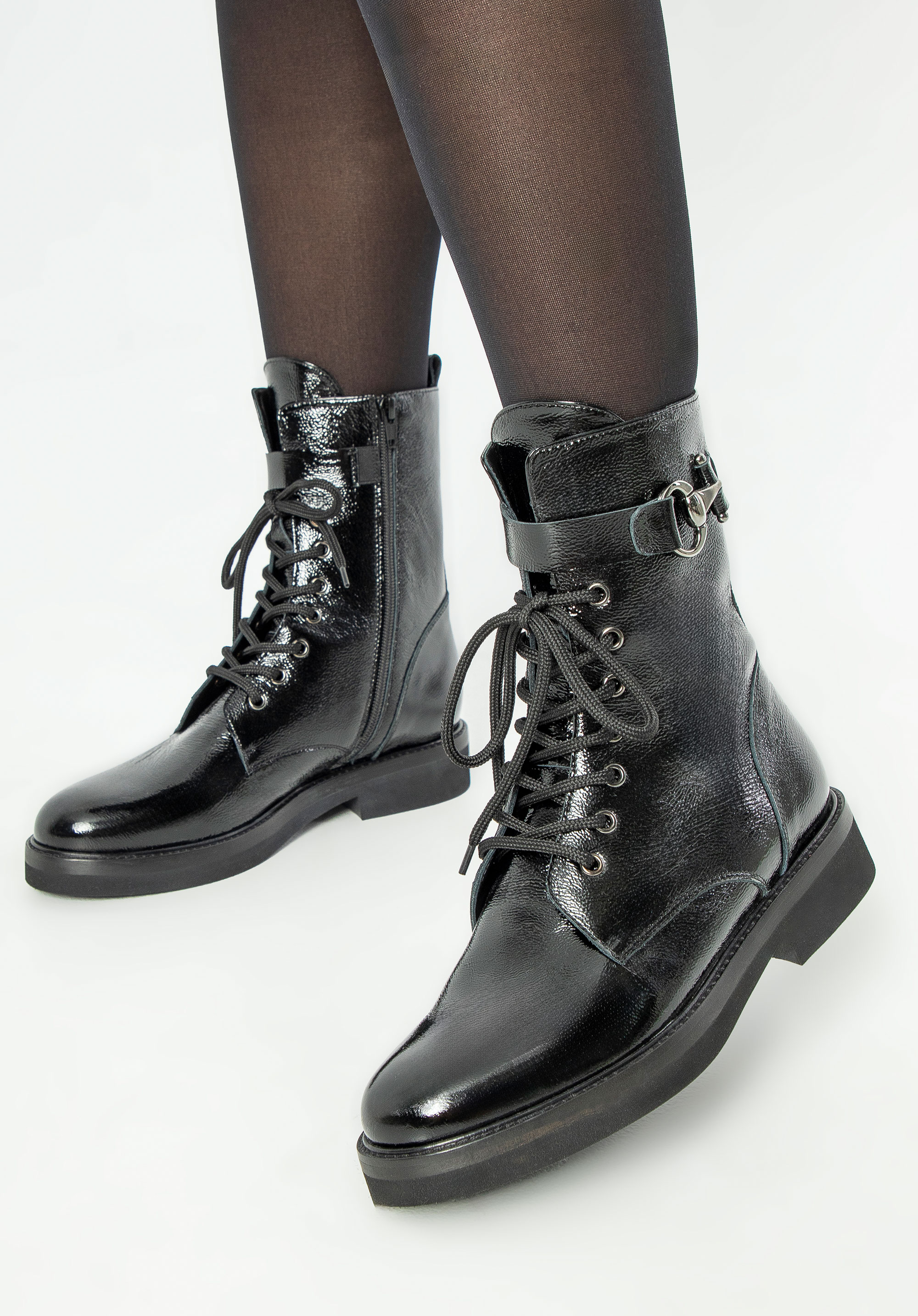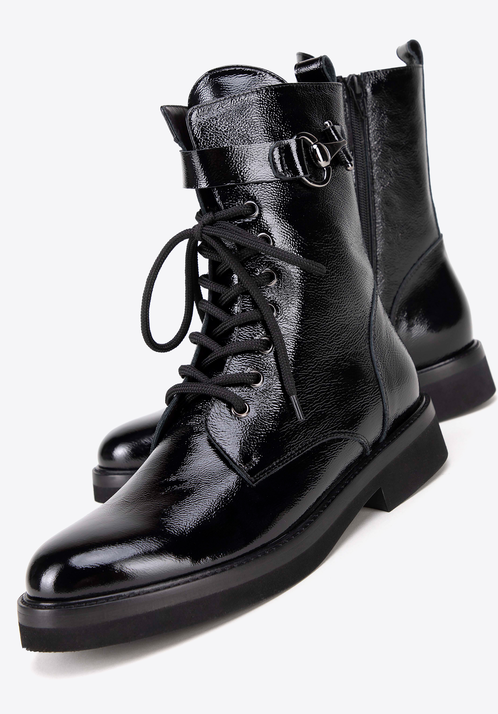 Diese Damenstiefeletten sind elegante und stilvolle Schuhe, perfekt für kühlere Tage und verschiedene Outfits. Aus hochwertigem Leder gefertigt, mit seitlichem Reißverschluss und zusätzlicher Schnürung , sorgen sie für eine ideale Passform und Tragekomfort. Die dezente mandelförmige Spitze verleiht dem Gesamtbild Raffinesse. Ein zusätzlicher dekorativer elastischer Riemen mit Metalldetails verleiht den Stiefeln Charakter und Originalität.