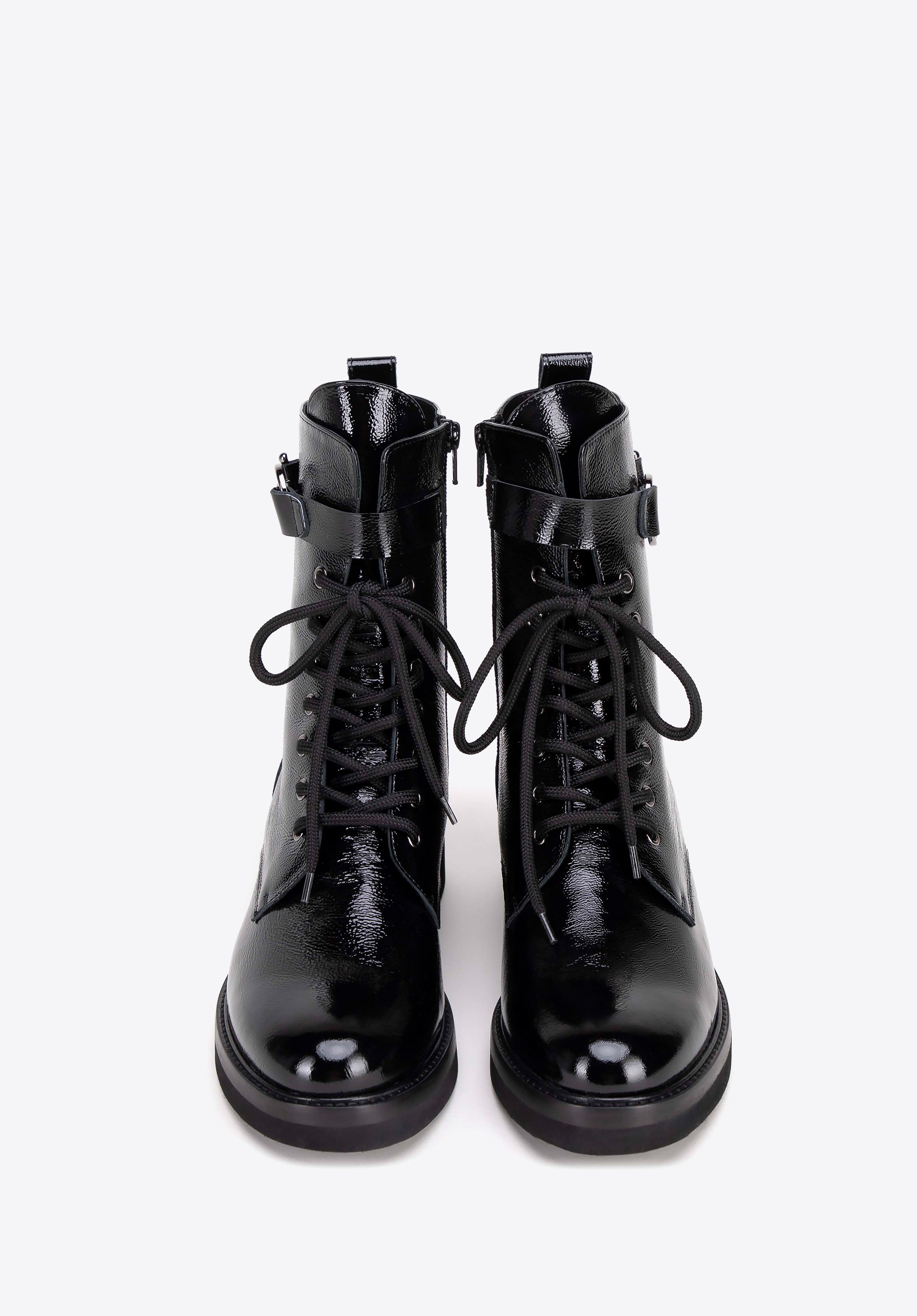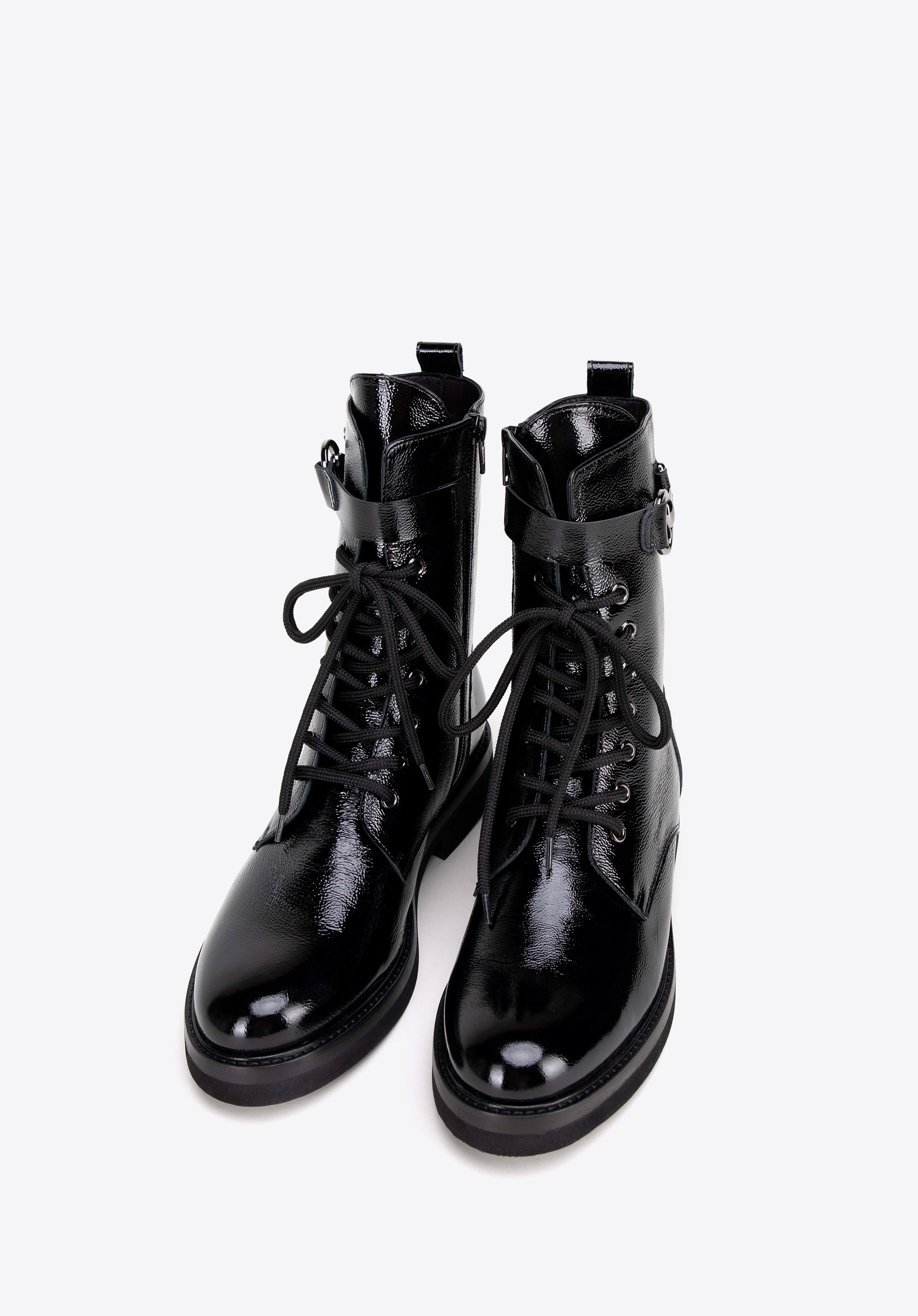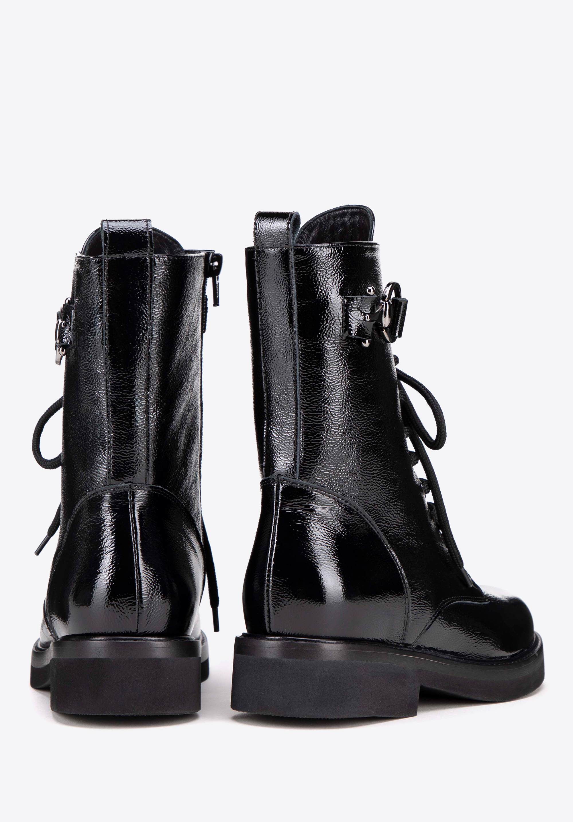 Diese Damenstiefeletten sind elegante und stilvolle Schuhe, perfekt für kühlere Tage und verschiedene Outfits. Aus hochwertigem Leder gefertigt, mit seitlichem Reißverschluss und zusätzlicher Schnürung , sorgen sie für eine ideale Passform und Tragekomfort. Die dezente mandelförmige Spitze verleiht dem Gesamtbild Raffinesse. Ein zusätzlicher dekorativer elastischer Riemen mit Metalldetails verleiht den Stiefeln Charakter und Originalität.