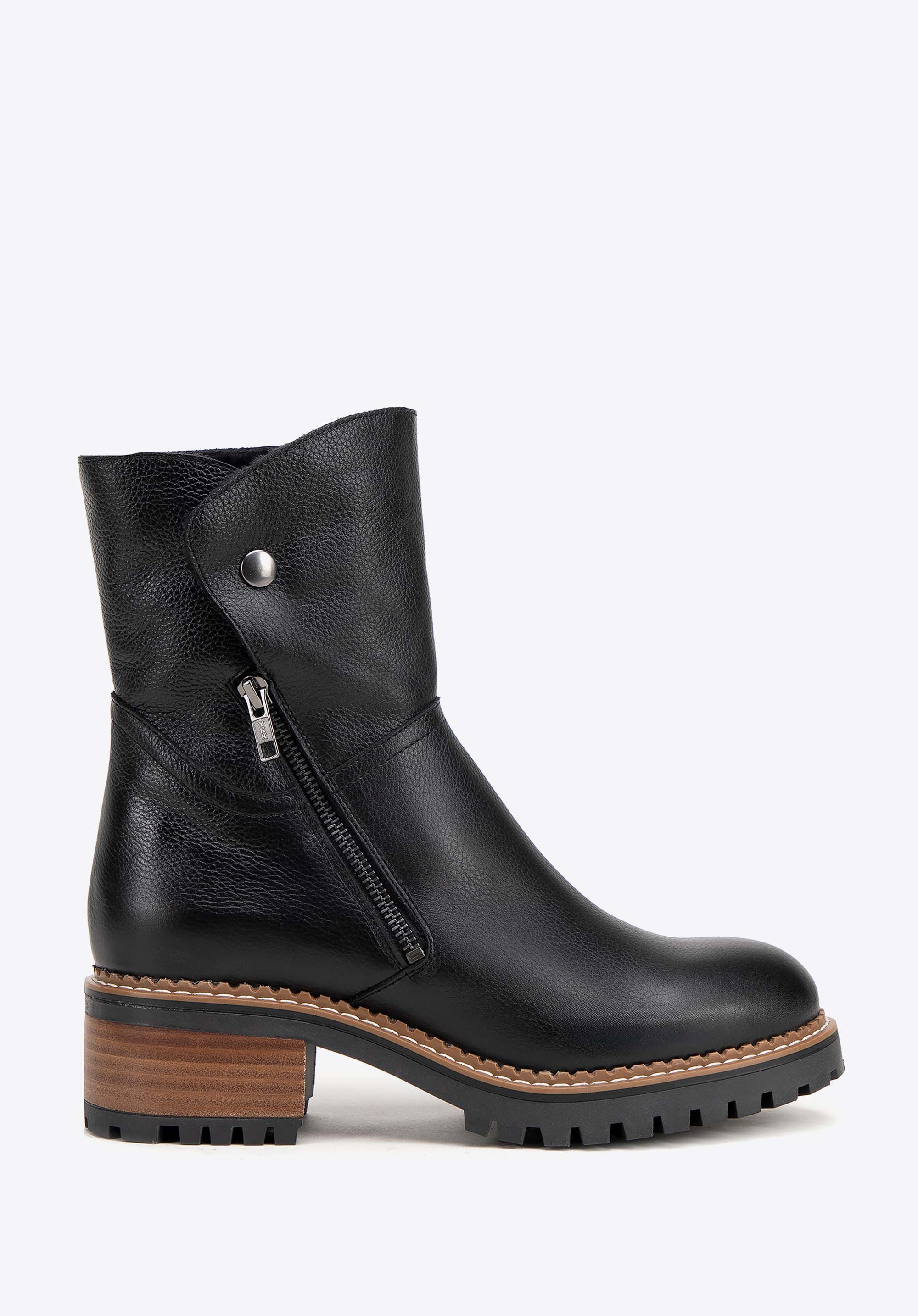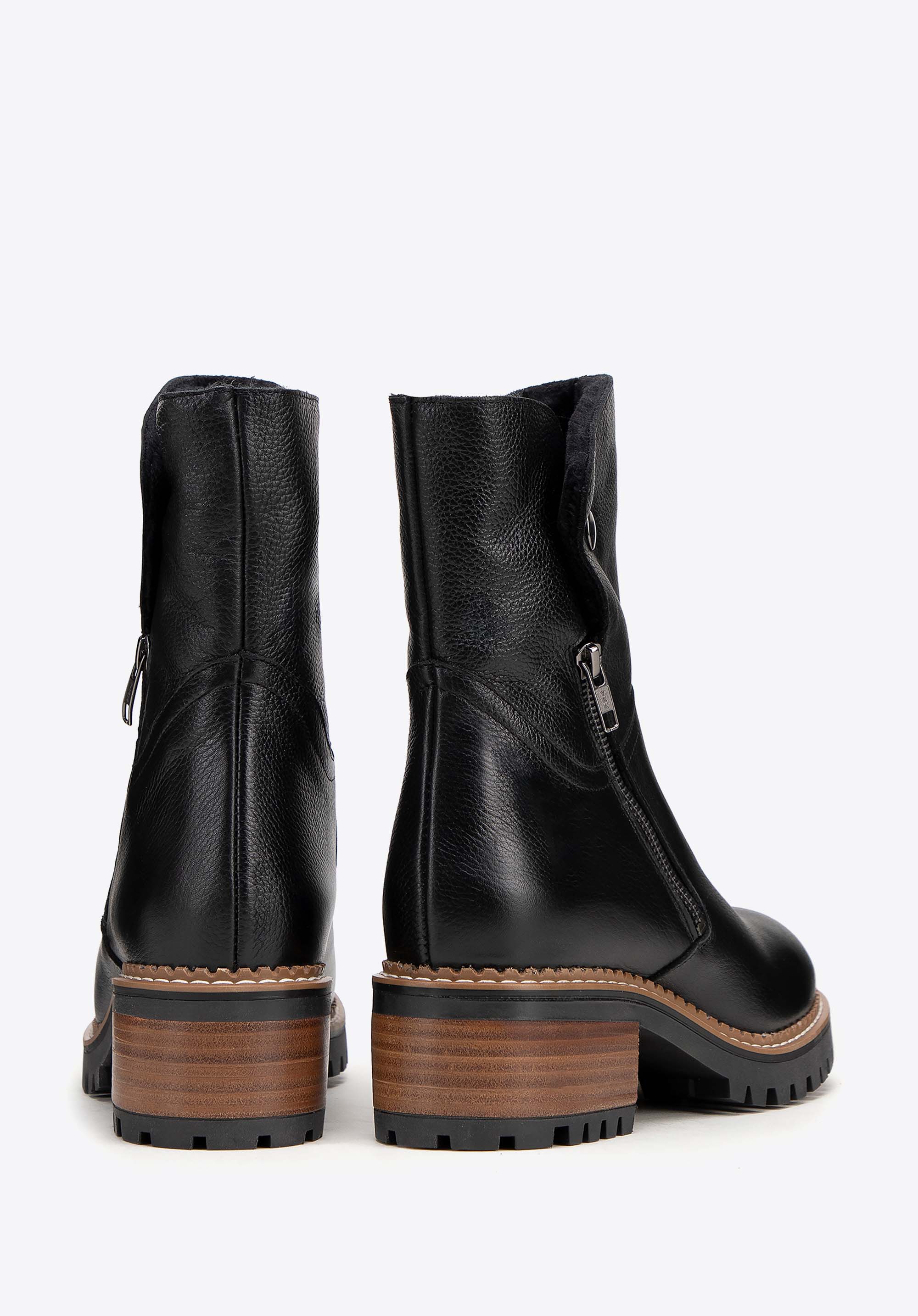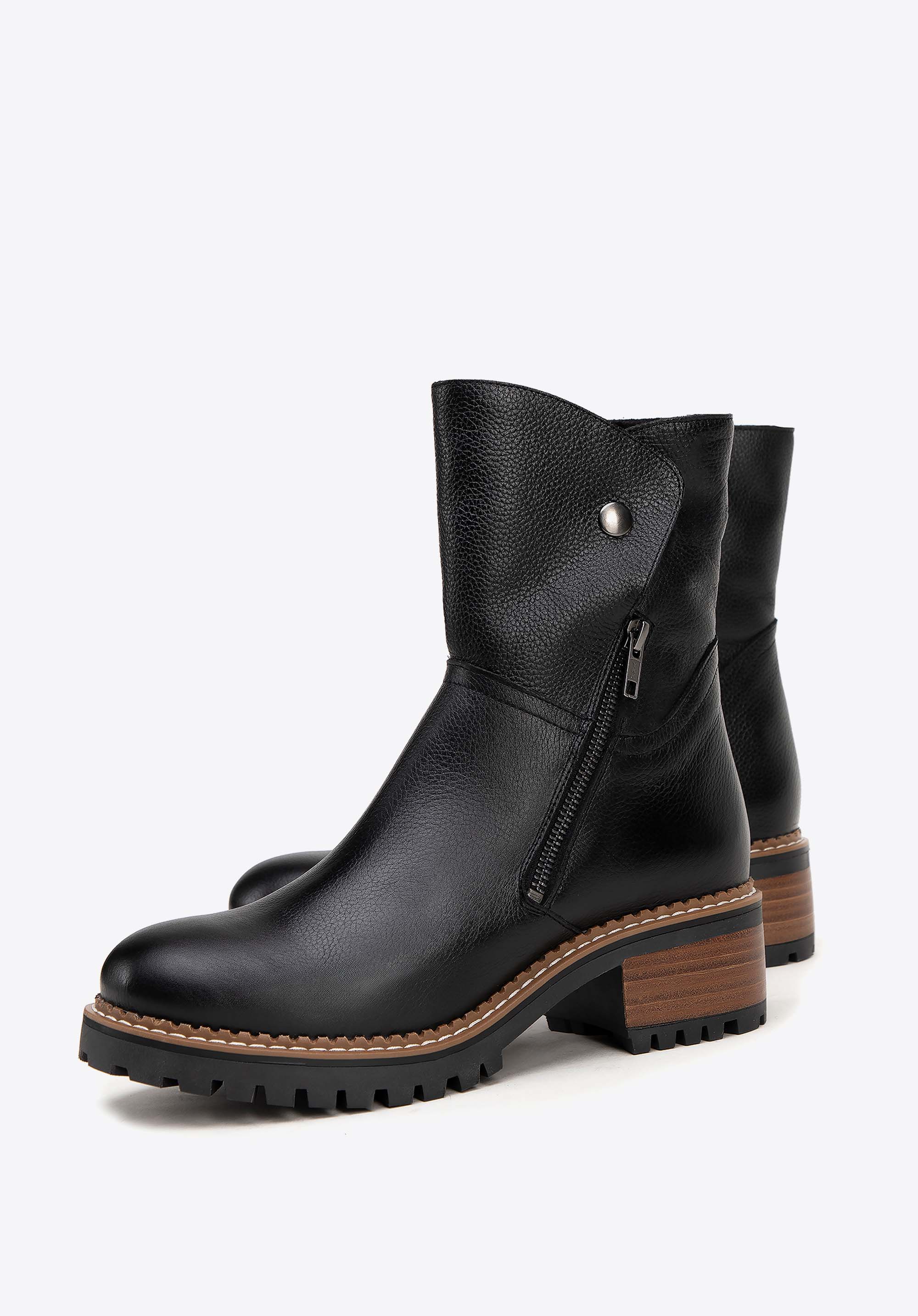 Diese Damenstiefeletten vereinen klassischen und modernen Stil perfekt und erfüllen die Erwartungen jeder Frau, die Wert auf Komfort und außergewöhnliches Design legt. Das Obermaterial aus hochwertigem Naturleder sorgt für Haltbarkeit und Eleganz. Ein weiches Futter sorgt für ganztägigen Komfort und eine perfekte Passform. Die klobige Profilsohle bietet Halt, während die klassische mandelförmige Zehenpartie Eleganz und Vielseitigkeit verleiht. Der diagonale Reißverschluss und der Druckknopf erleichtern das An- und Ausziehen dieser Stiefeletten. Diese Stiefeletten verkörpern die ideale Verbindung aus Stil und Funktionalität.