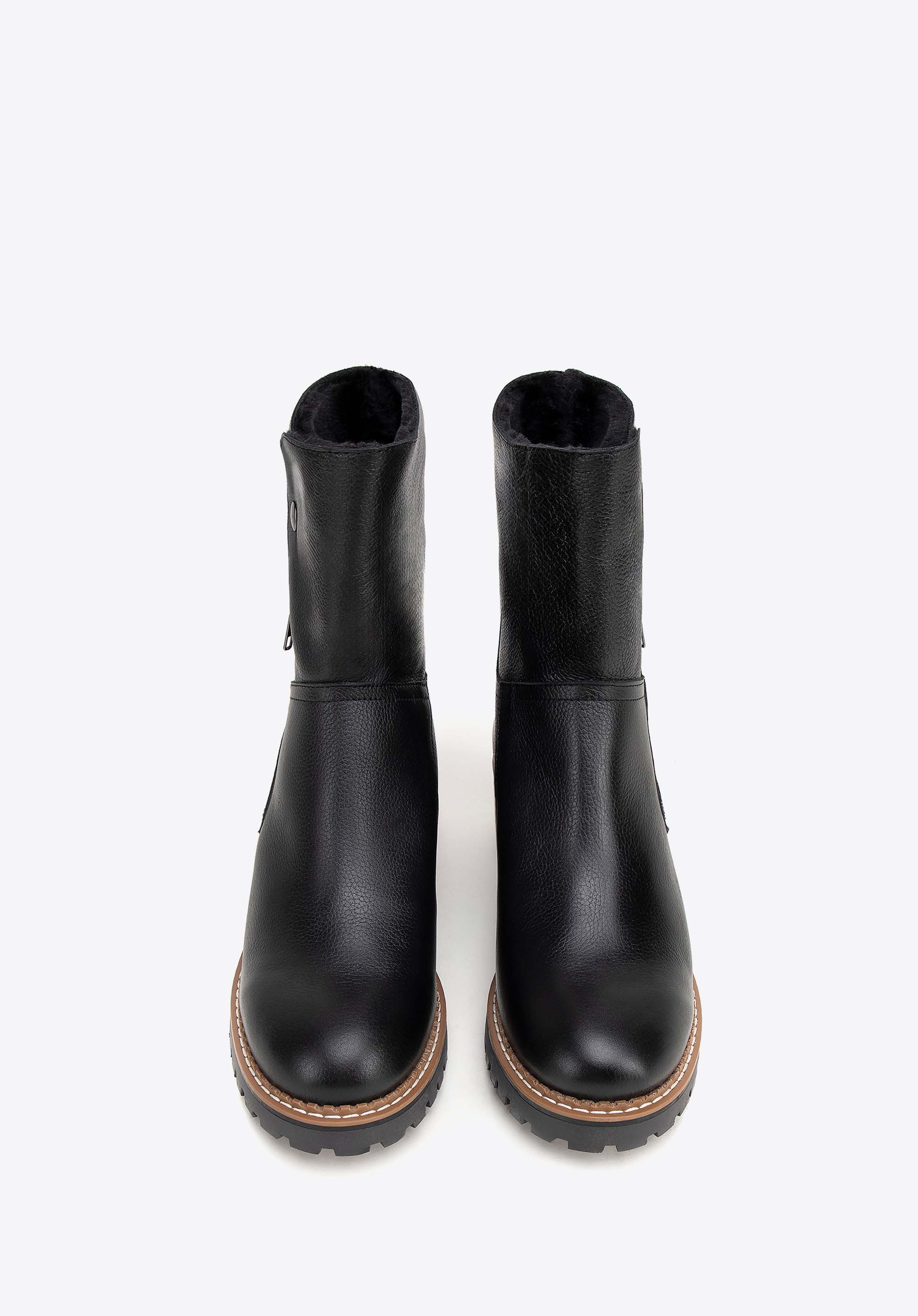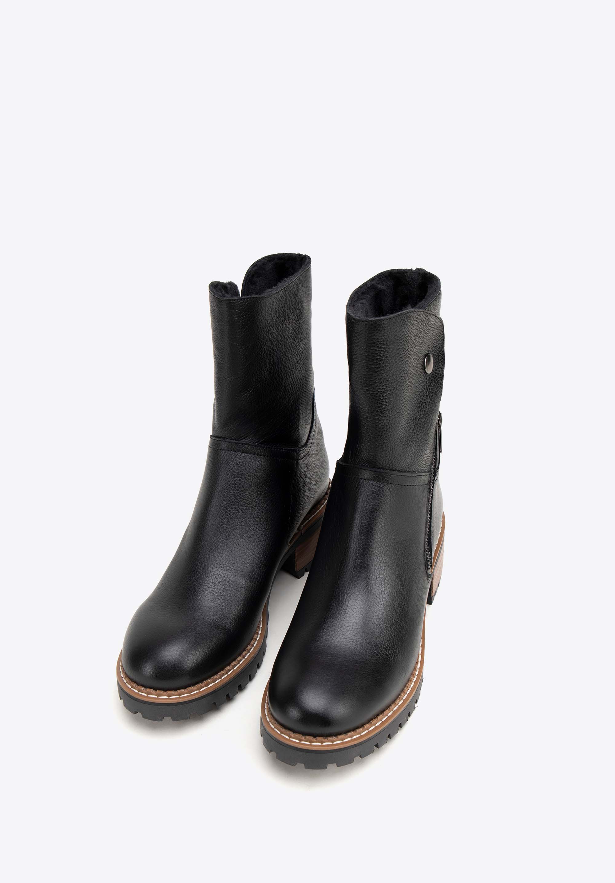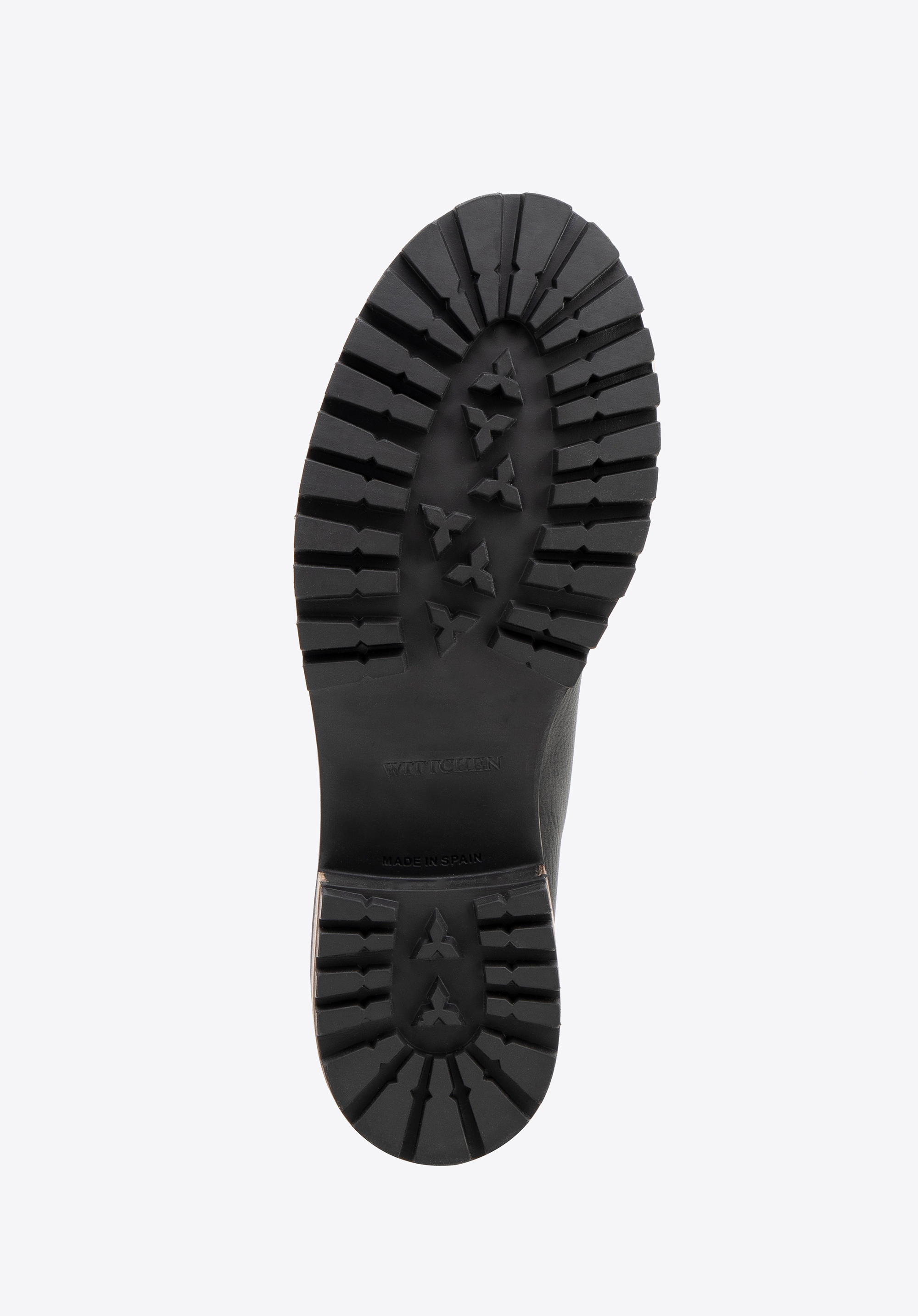 Diese Damenstiefeletten vereinen klassischen und modernen Stil perfekt und erfüllen die Erwartungen jeder Frau, die Wert auf Komfort und außergewöhnliches Design legt. Das Obermaterial aus hochwertigem Naturleder sorgt für Haltbarkeit und Eleganz. Ein weiches Futter sorgt für ganztägigen Komfort und eine perfekte Passform. Die klobige Profilsohle bietet Halt, während die klassische mandelförmige Zehenpartie Eleganz und Vielseitigkeit verleiht. Der diagonale Reißverschluss und der Druckknopf erleichtern das An- und Ausziehen dieser Stiefeletten. Diese Stiefeletten verkörpern die ideale Verbindung aus Stil und Funktionalität.