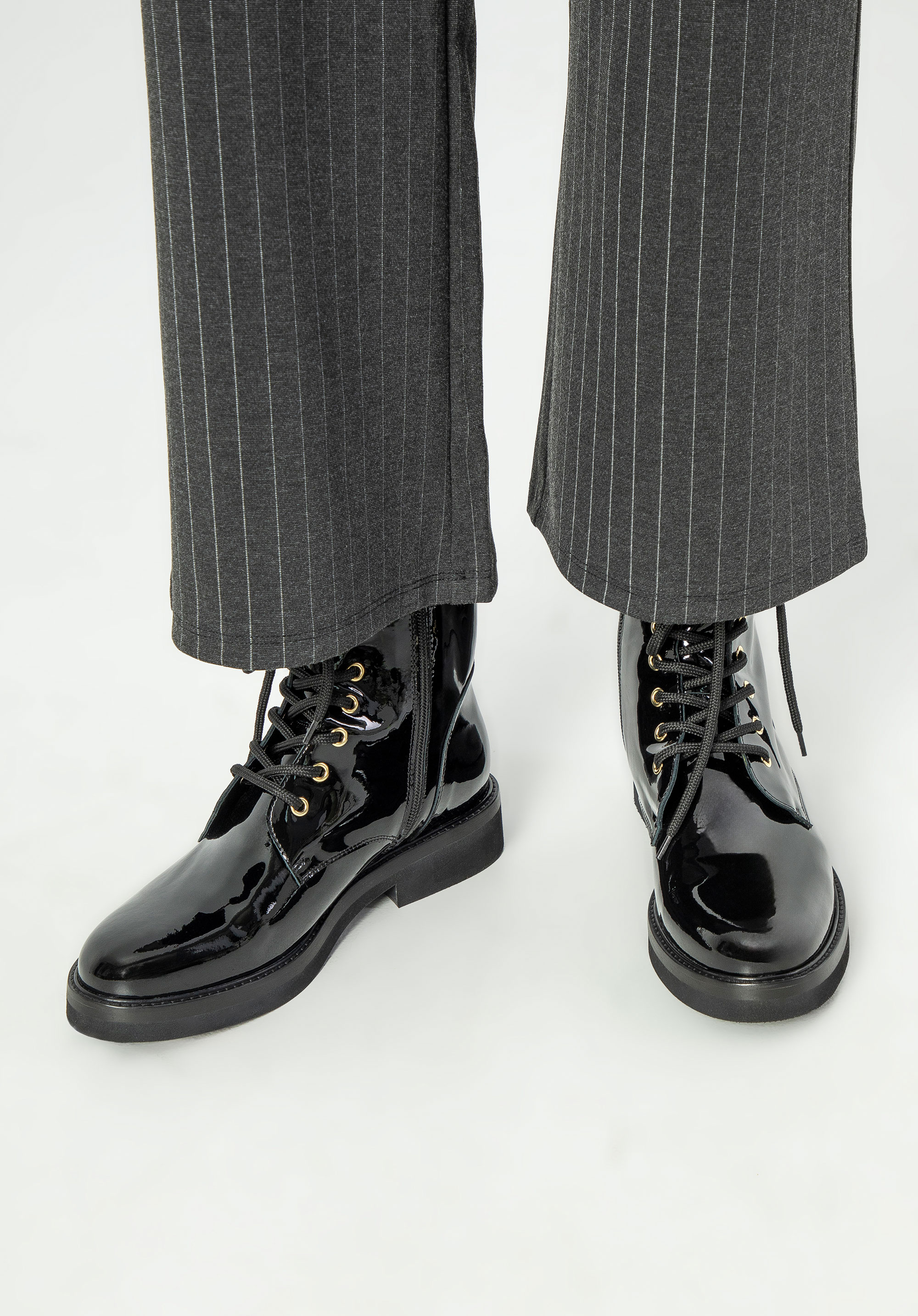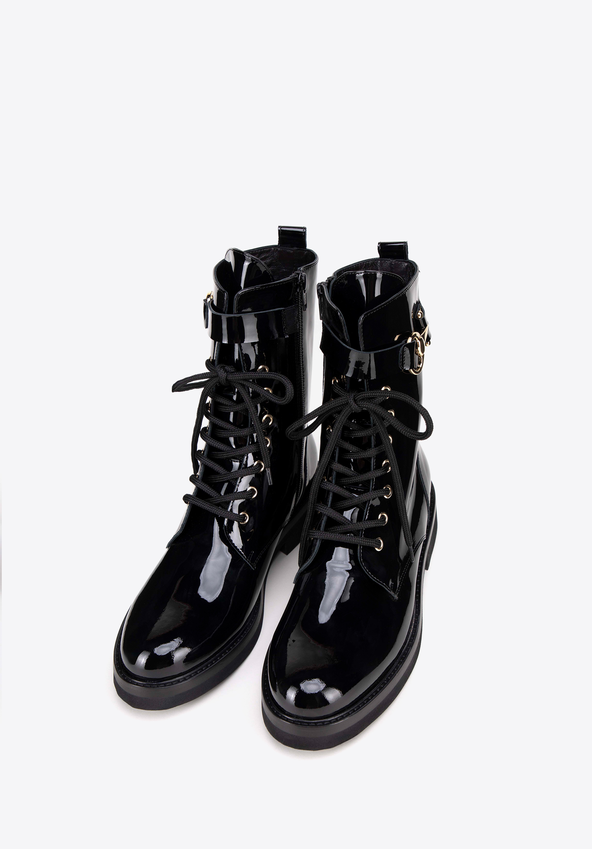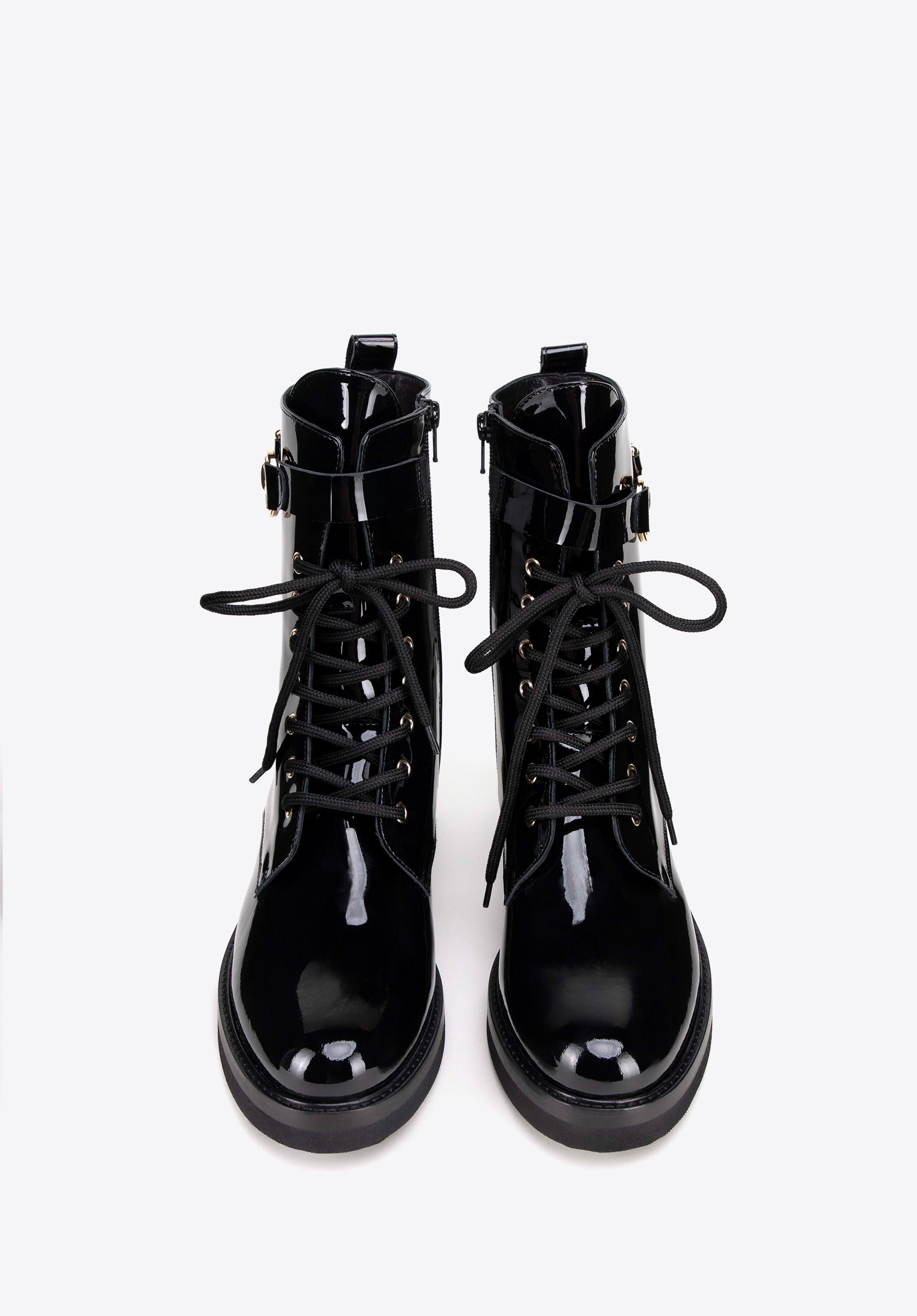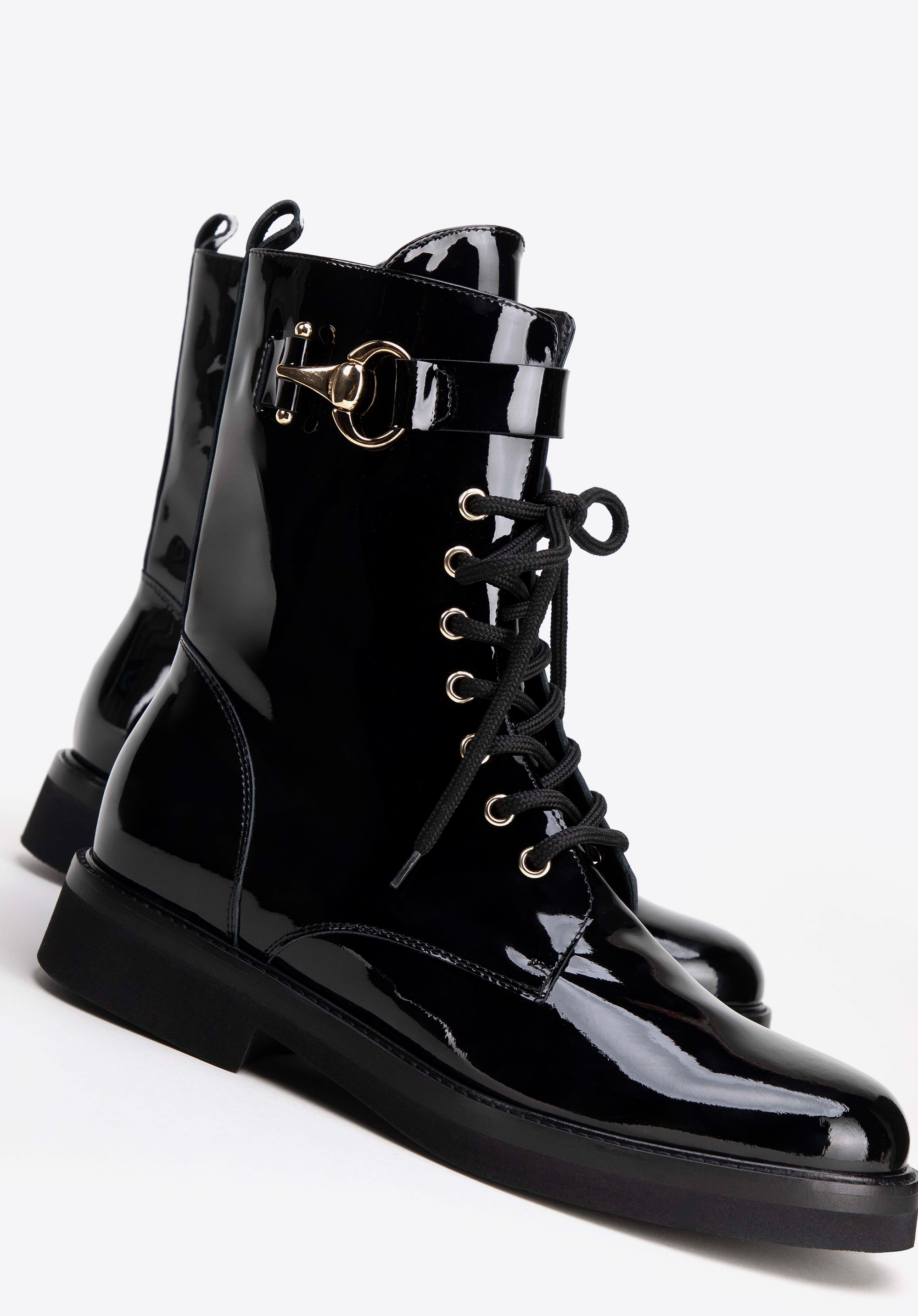 Tauchen Sie ein in Eleganz und zeitlosen Stil mit unseren Damenstiefeletten aus Lackleder. Das glänzende Lackleder verleiht jedem Schritt Stil. Diese Stiefel vereinen Funktionalität und modisches Design auf harmonische Weise. Mit seitlichem Reißverschluss und Schnürung sorgt dieses Paar Schuhe für eine perfekte Passform und einfaches An- und Ausziehen.
