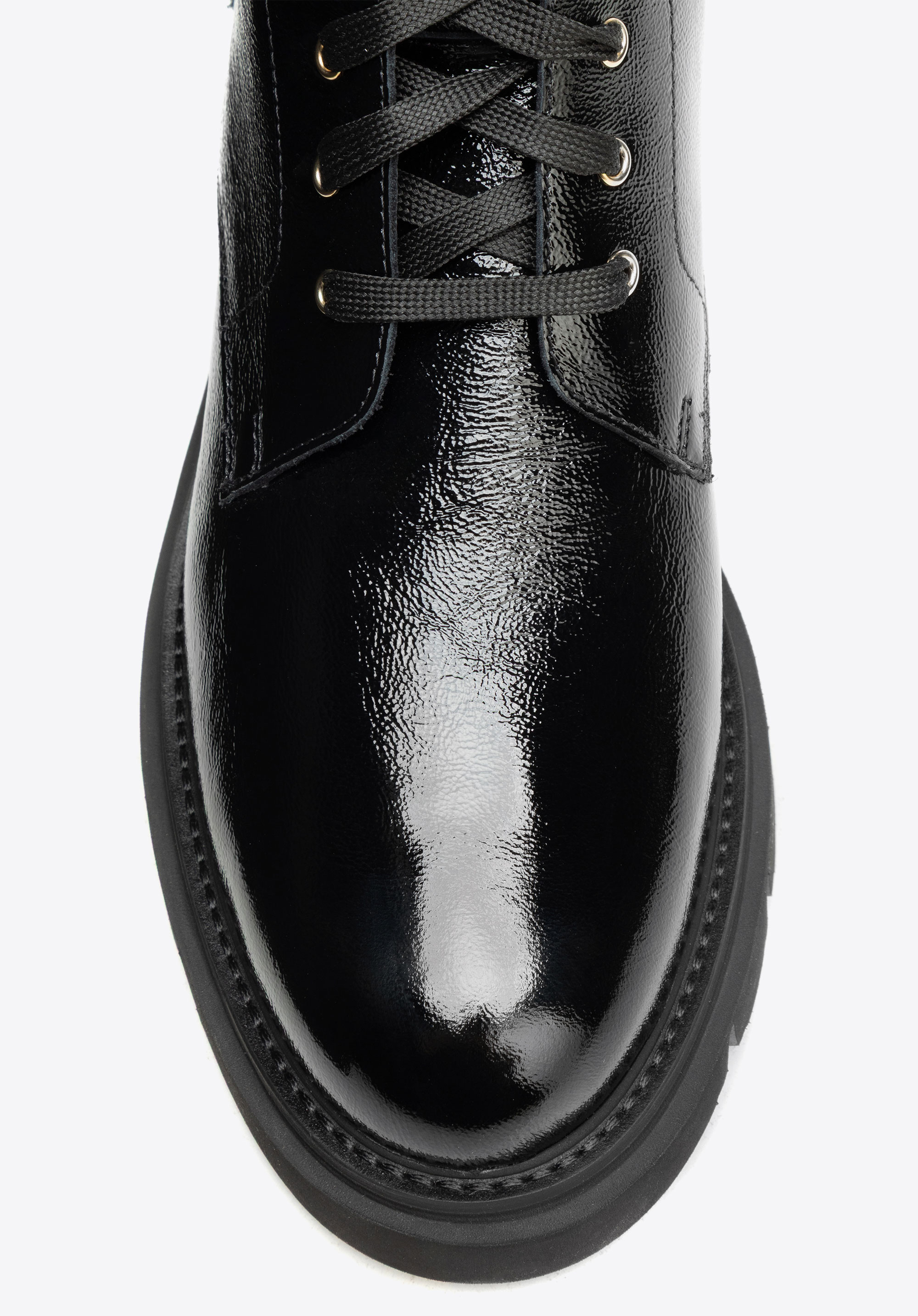 Entdecken Sie den Glanz von Lackleder in klassischem Design mit modernem Touch. Diese Damenstiefeletten aus hochwertigem Naturleder vereinen Funktionalität mit raffinierter Ästhetik. Die Schnürung und der innenliegende Reißverschluss sorgen für eine perfekte Passform, während die mandelförmige Zehenpartie Ihrer Silhouette Leichtigkeit und Eleganz verleiht. Die Lasche an der Rückseite erleichtert das Anziehen und verleiht den Stiefeln einen stilvollen Touch.