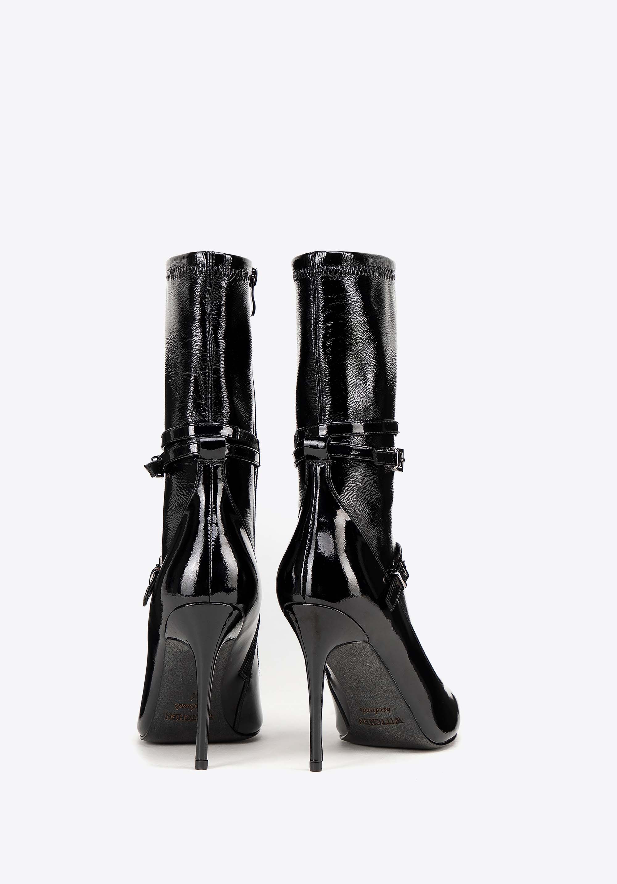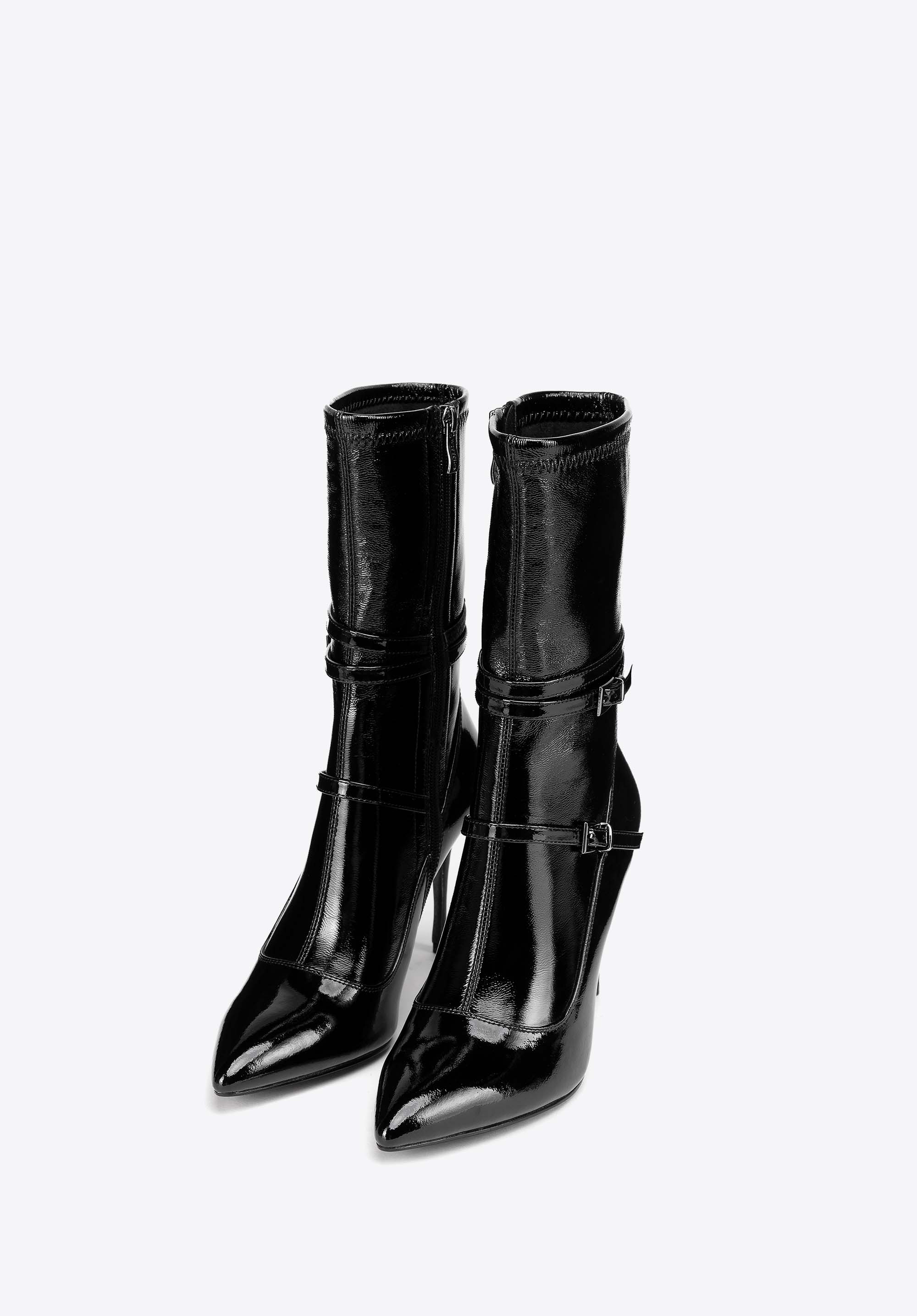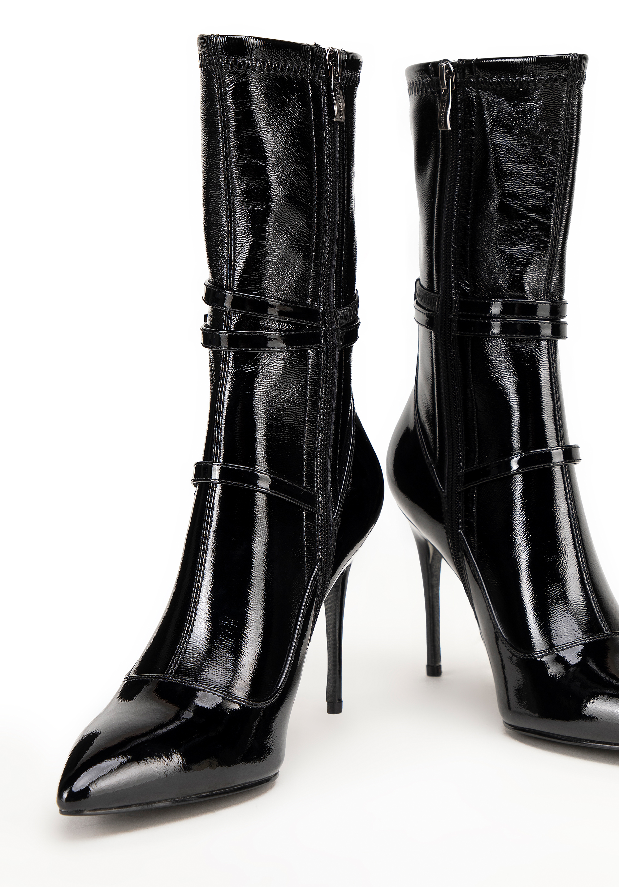 Wir präsentieren Stiefeletten , die Eleganz mit modernem Stil verbinden. Diese Schuhe sind aus hochwertigem Lackleder gefertigt und verfügen über eine glänzende, feuchtigkeitsbeständige Oberfläche, die für einen luxuriösen Touch sorgt. Darüber hinaus sorgt Kunstleder für leichte Flexibilität. Dekorative Riemen in unterschiedlichen Höhen und Randnähte verleihen ihnen einen einzigartigen, zeitgenössischen Charakter und heben die Details und den Stil hervor.