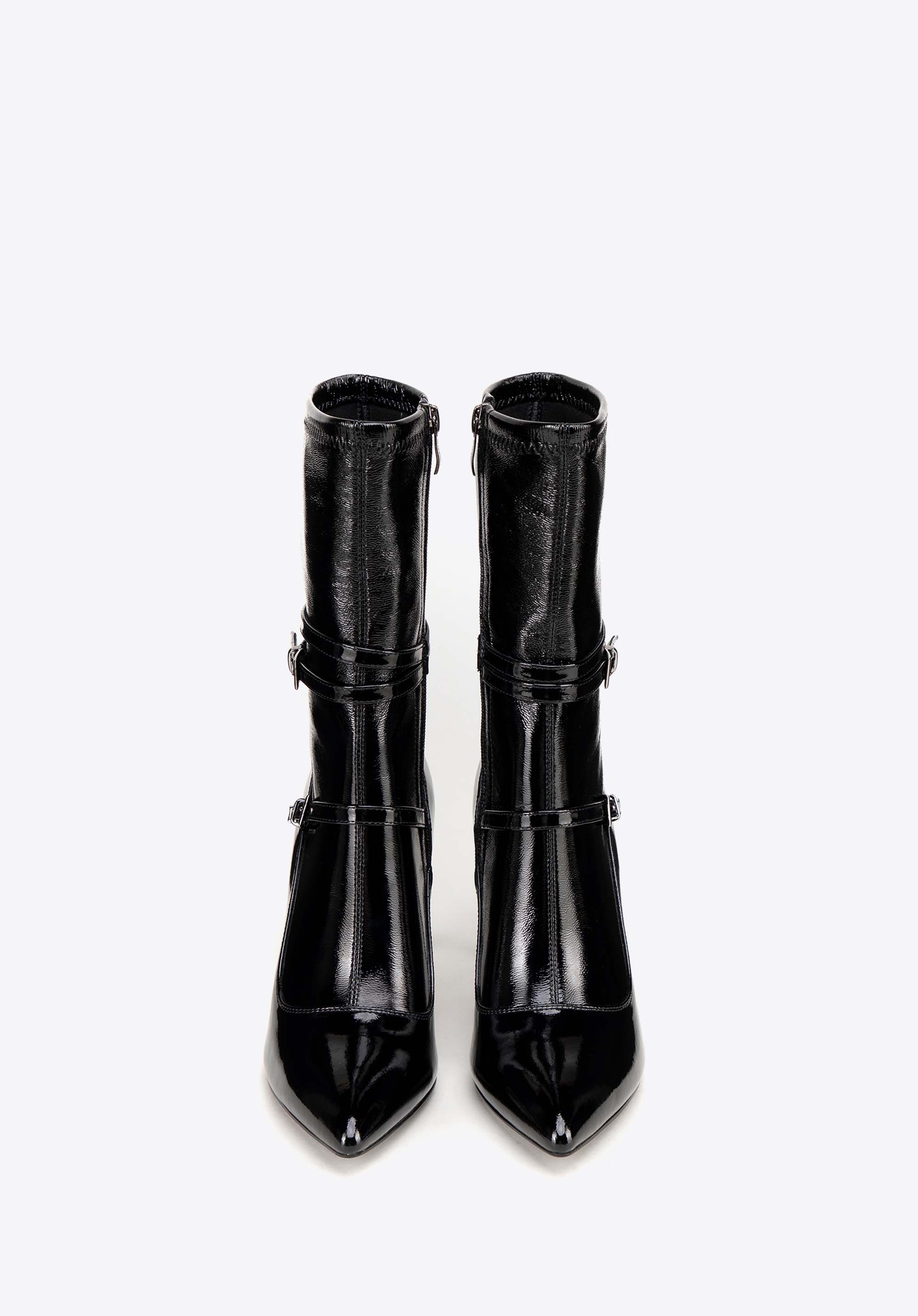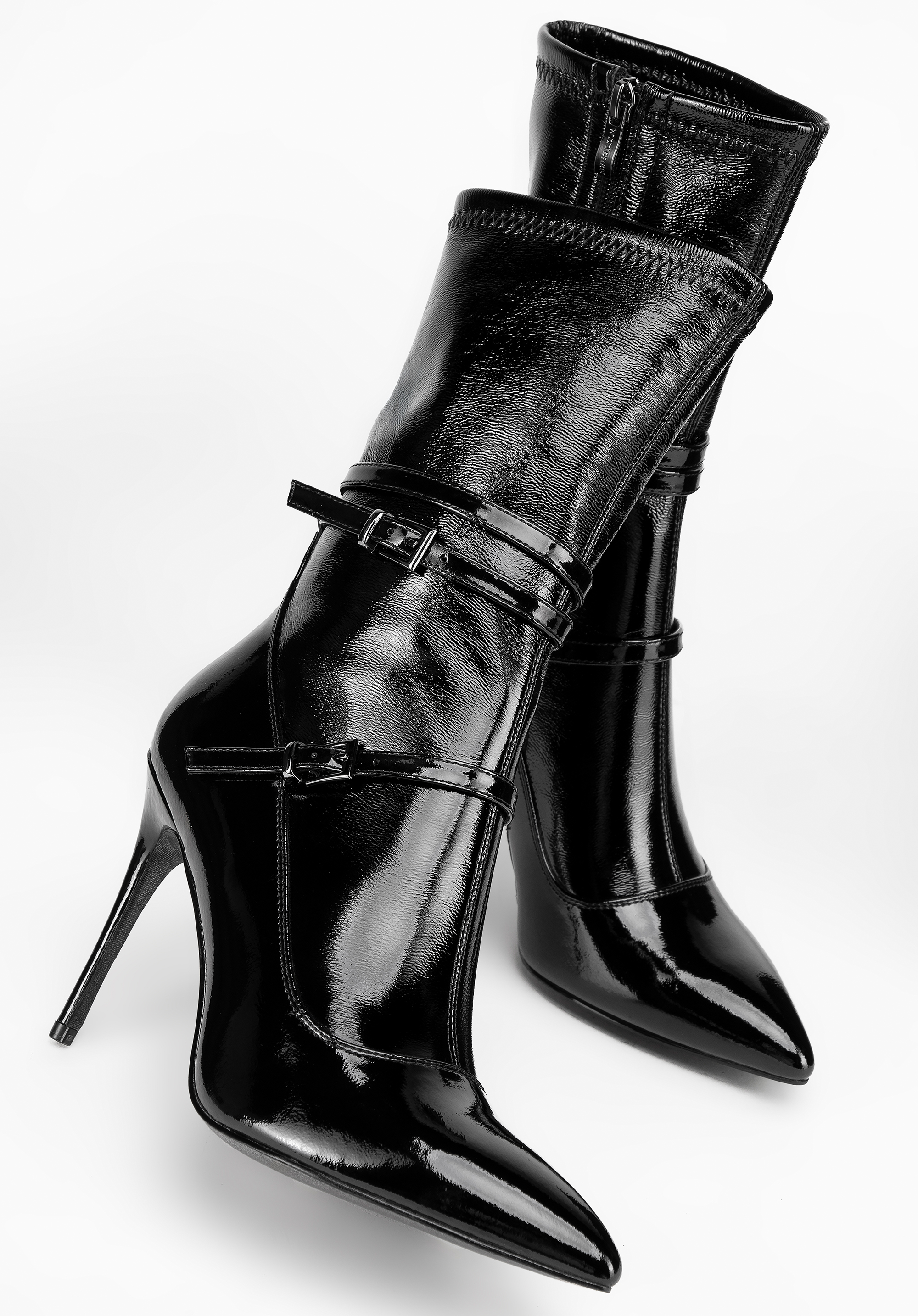Glänzende Stiefelette mit spitzer Spitze und dekorativen Riemchen