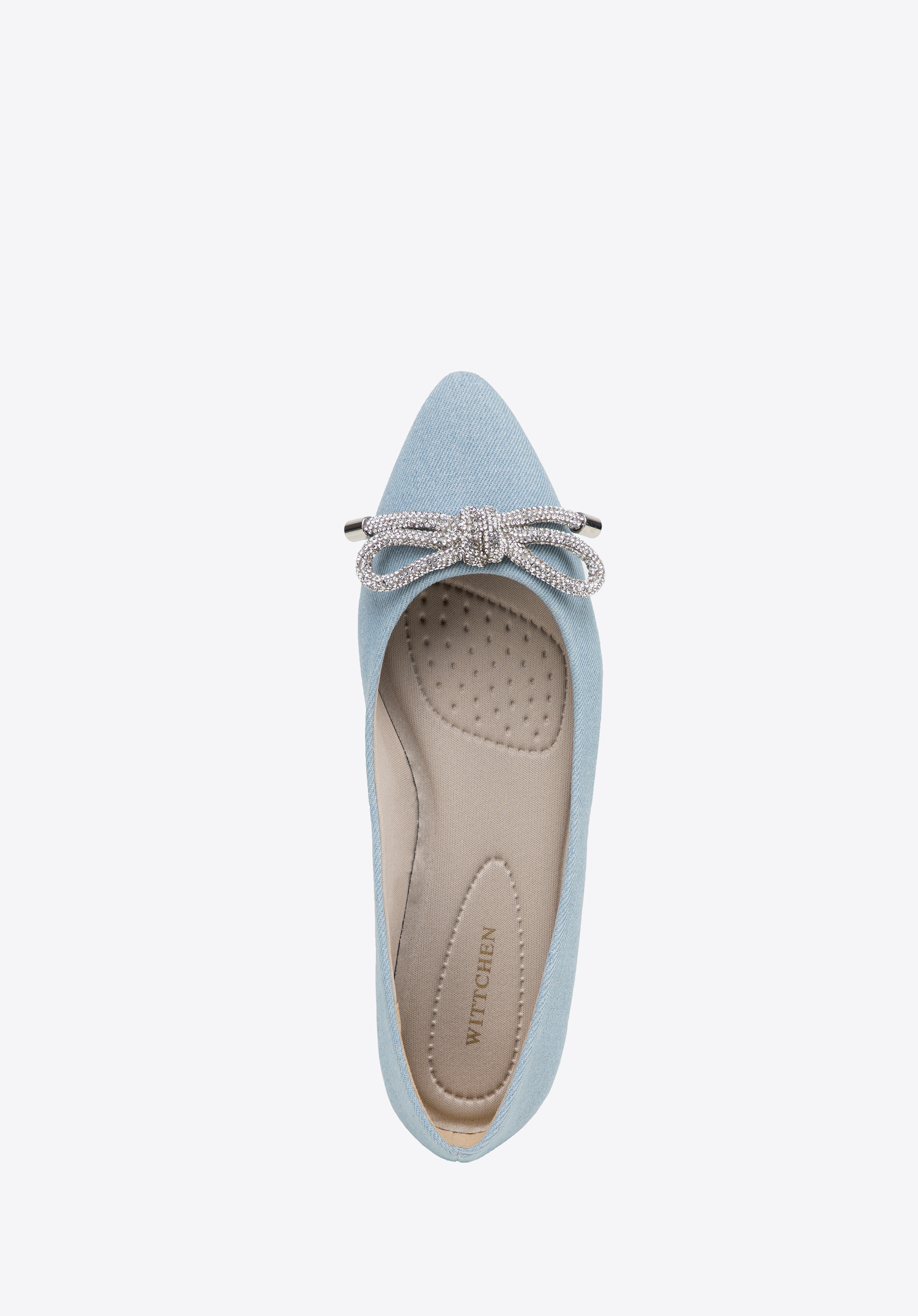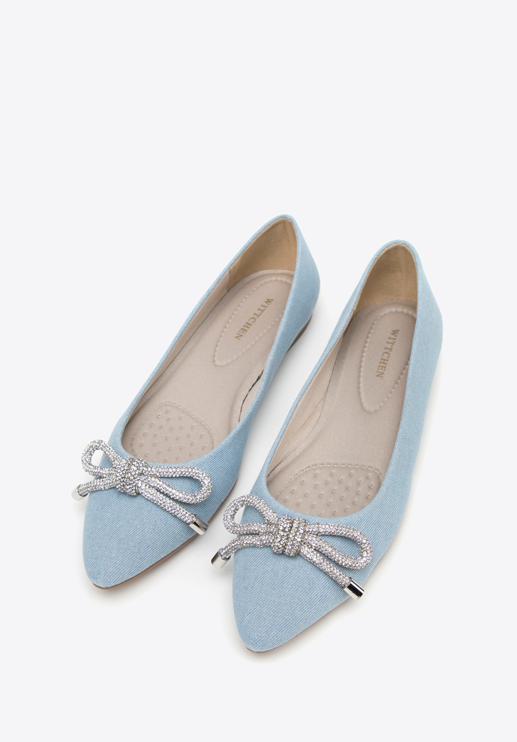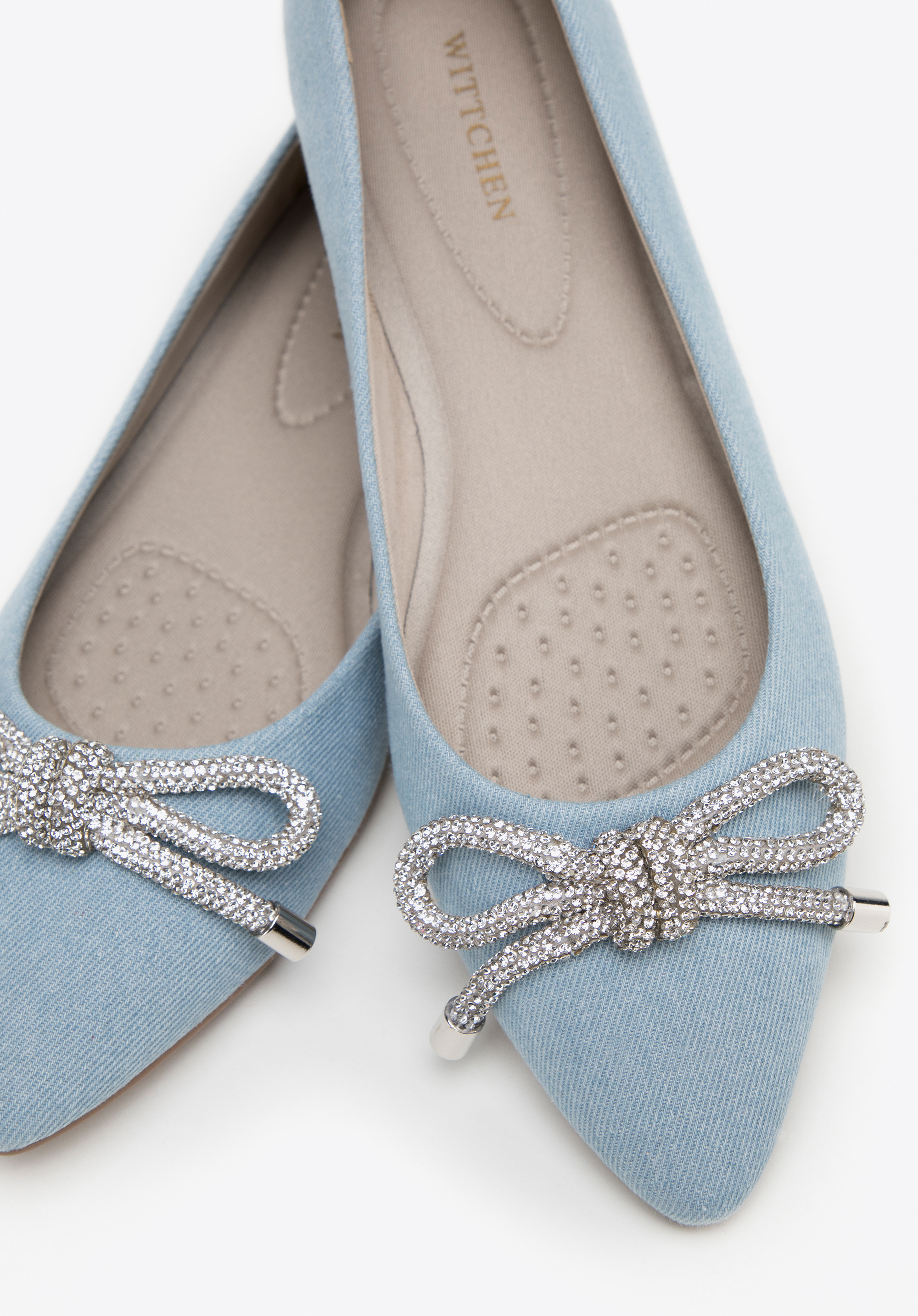 Denim-Ballerinas sind ein modisches Accessoire und ein echter Hingucker. Die spitze Spitze ist mit einer glänzenden Schleife aus kleinen Perlen verziert. Die Schuhe haben eine weiche, profilierte Innensohle und einen flachen Absatz, wodurch sie auch bei wiederholtem Tragen angenehm zu tragen sind. Diese Schuhe passen perfekt zu Ihrem Lieblingsminikleid, Jeans und einem Hemd. Denim-Ballerinas mit glänzendem Schleifendetail zeichnen sich durch einen klassischen Stil mit einem modernen Touch aus – perfekt für viele Anlässe.