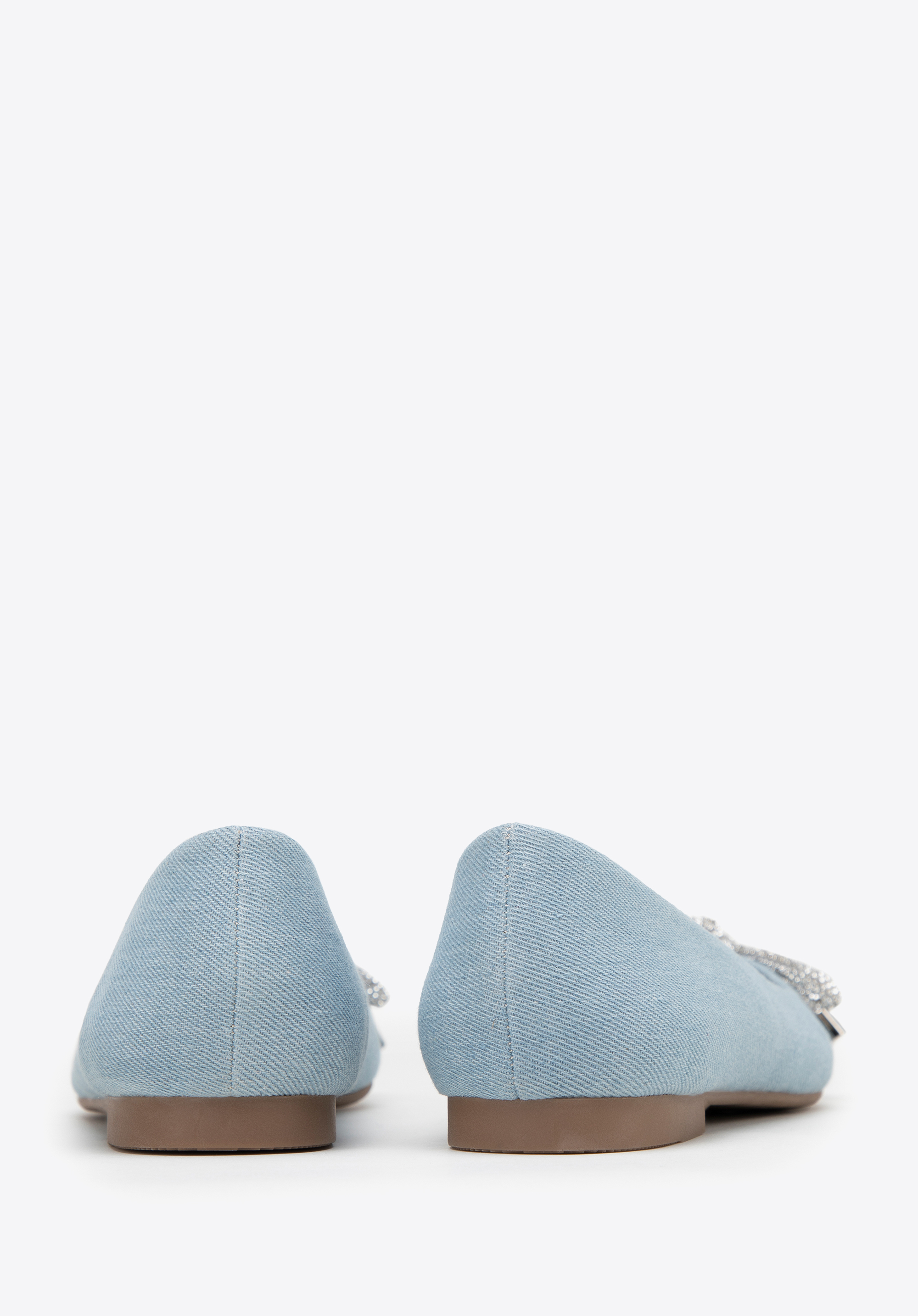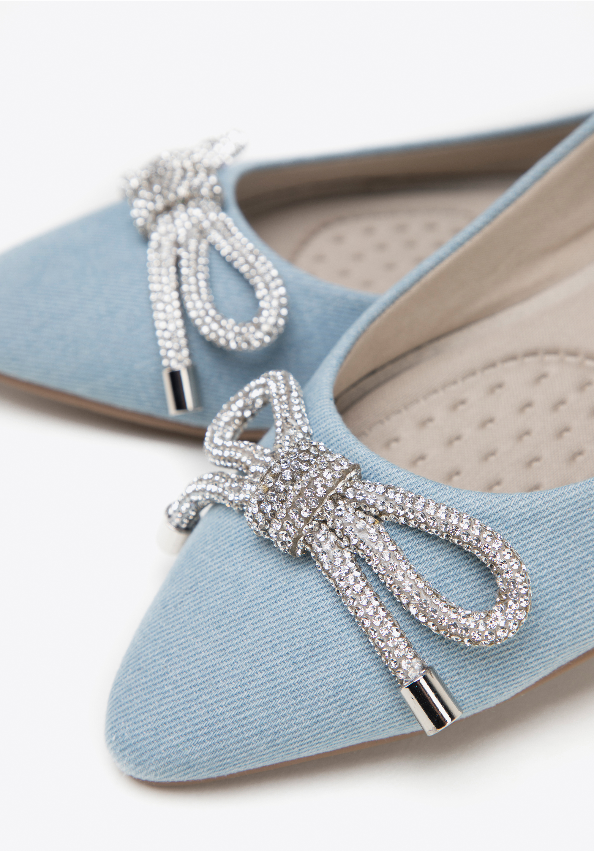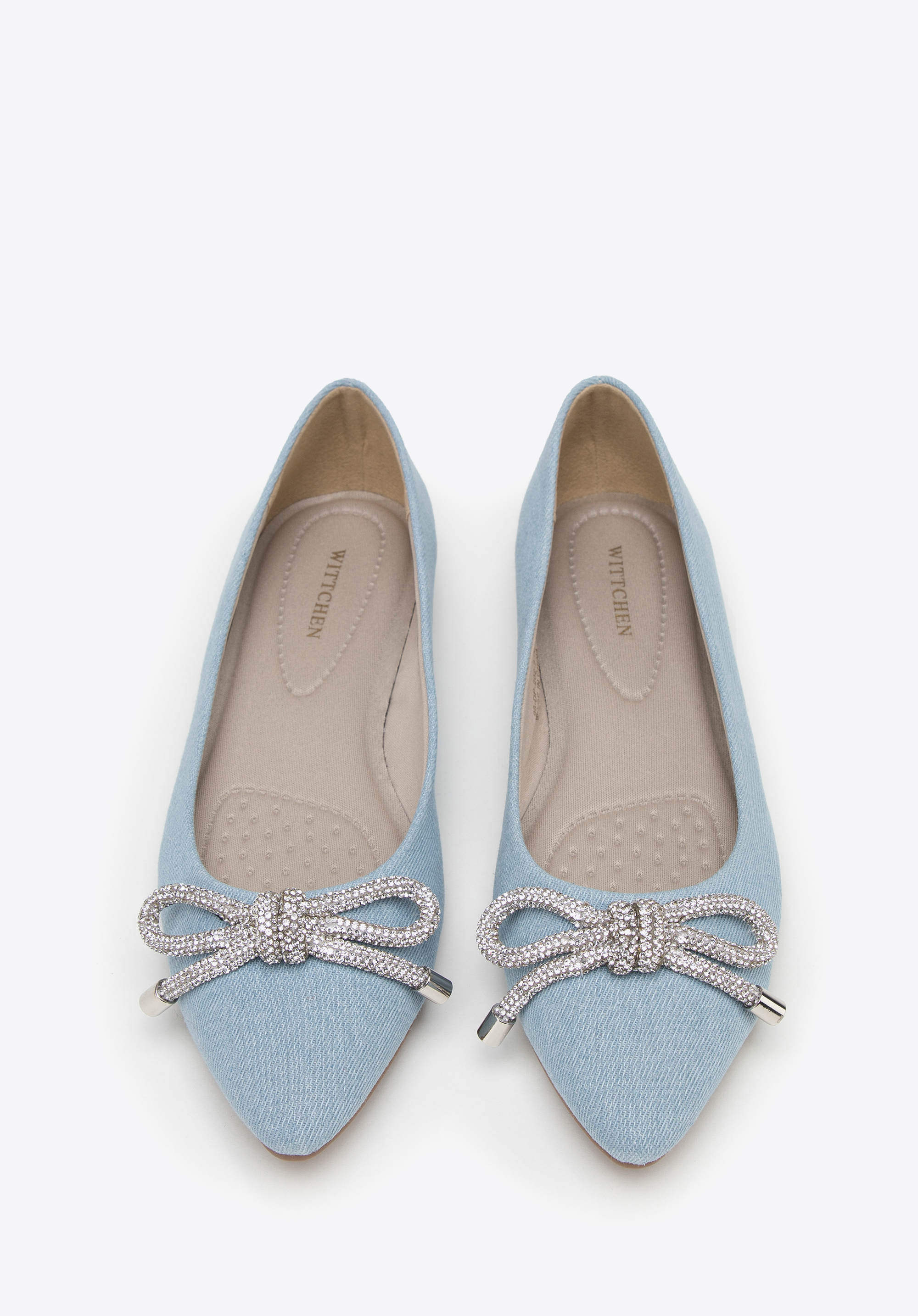 Denim-Ballerinas sind ein modisches Accessoire und ein echter Hingucker. Die spitze Spitze ist mit einer glänzenden Schleife aus kleinen Perlen verziert. Die Schuhe haben eine weiche, profilierte Innensohle und einen flachen Absatz, wodurch sie auch bei wiederholtem Tragen angenehm zu tragen sind. Diese Schuhe passen perfekt zu Ihrem Lieblingsminikleid, Jeans und einem Hemd. Denim-Ballerinas mit glänzendem Schleifendetail zeichnen sich durch einen klassischen Stil mit einem modernen Touch aus – perfekt für viele Anlässe.