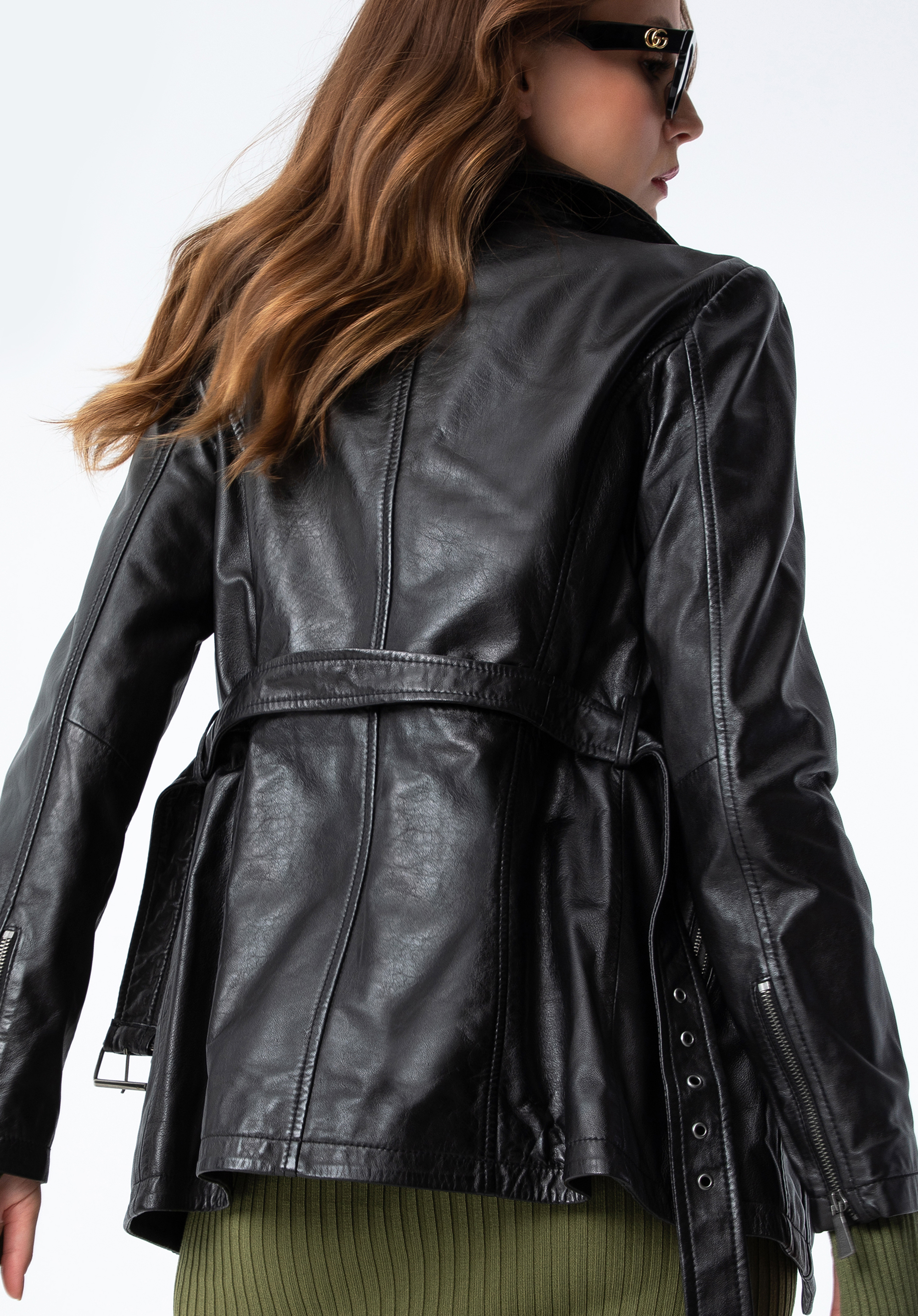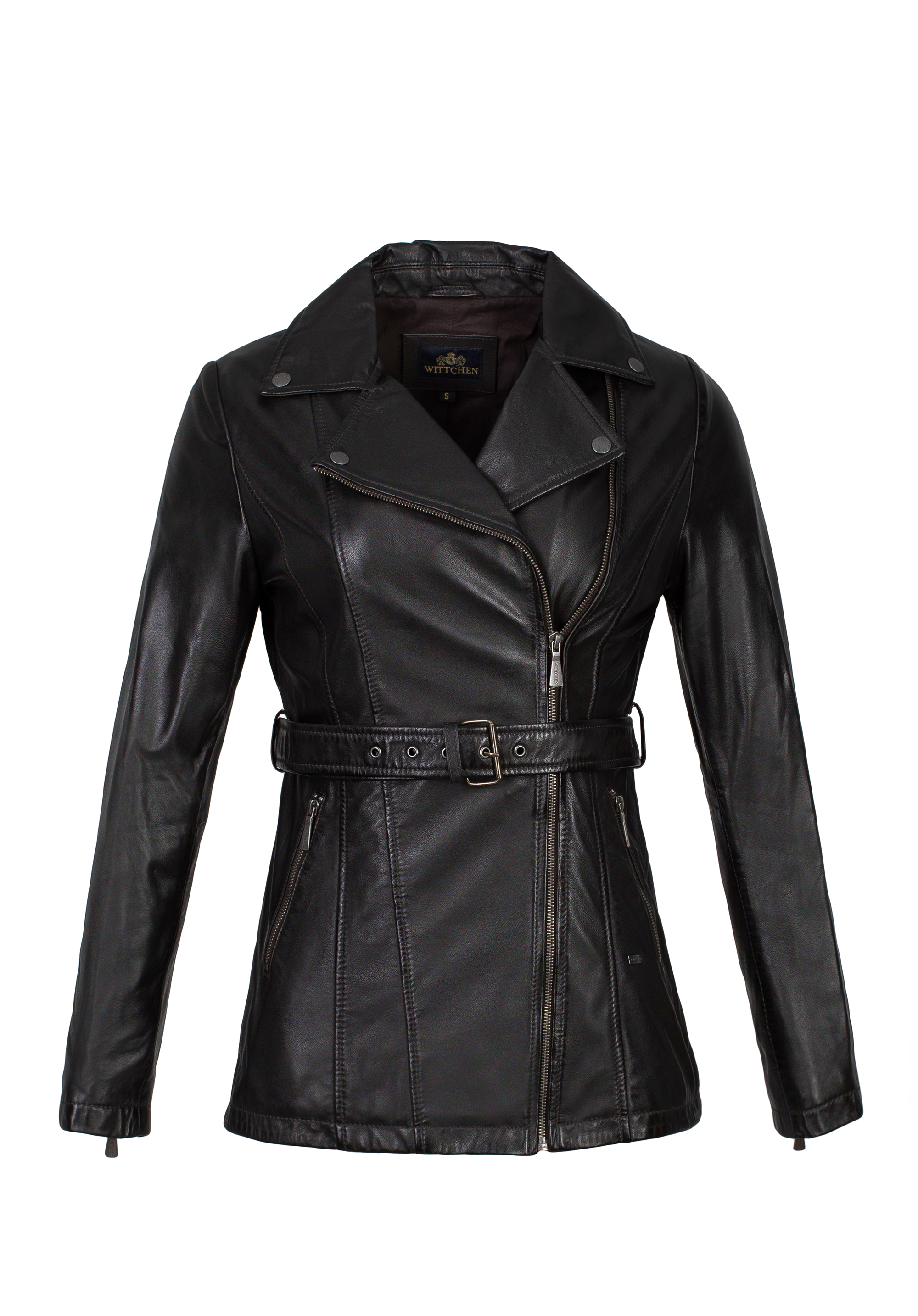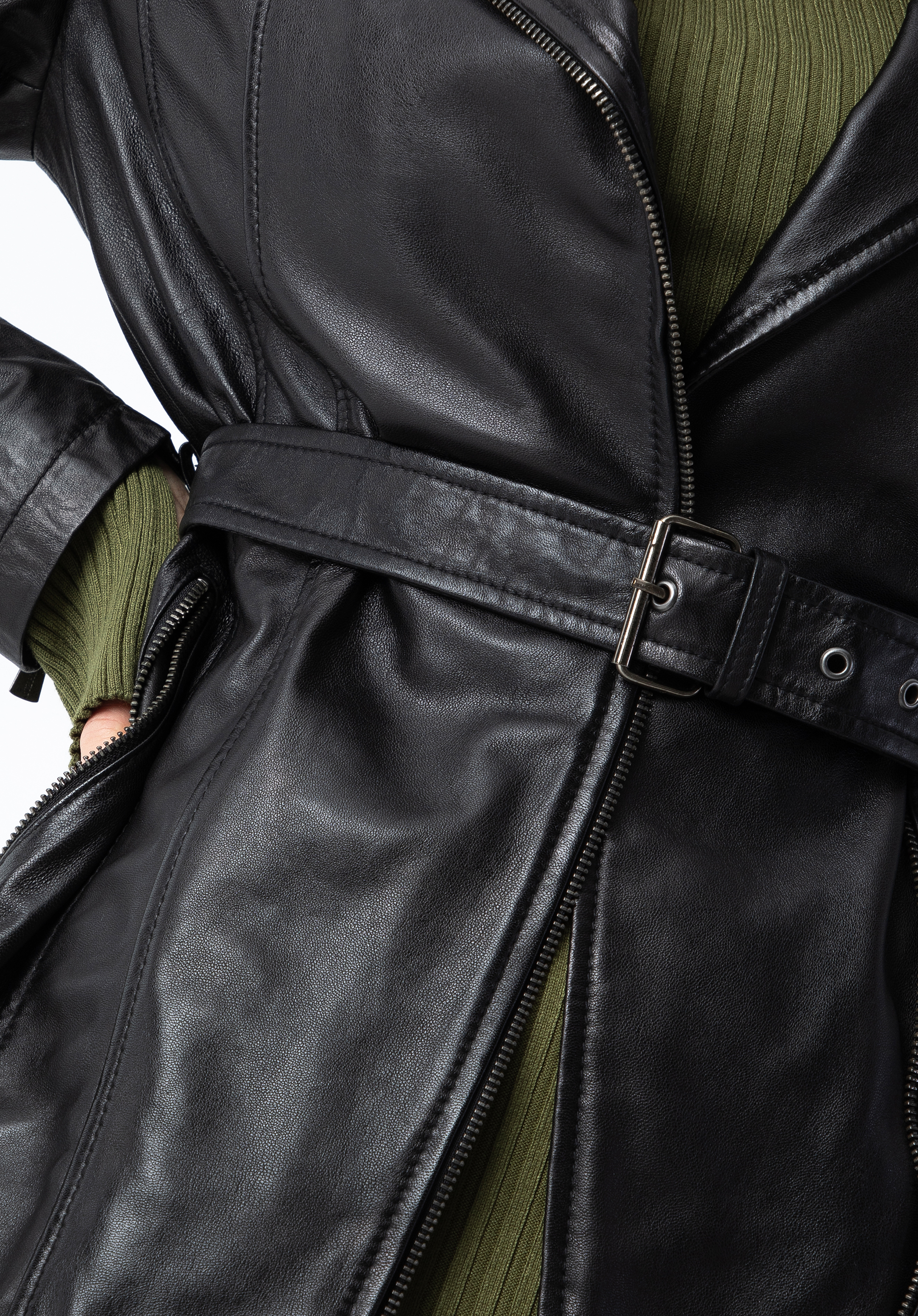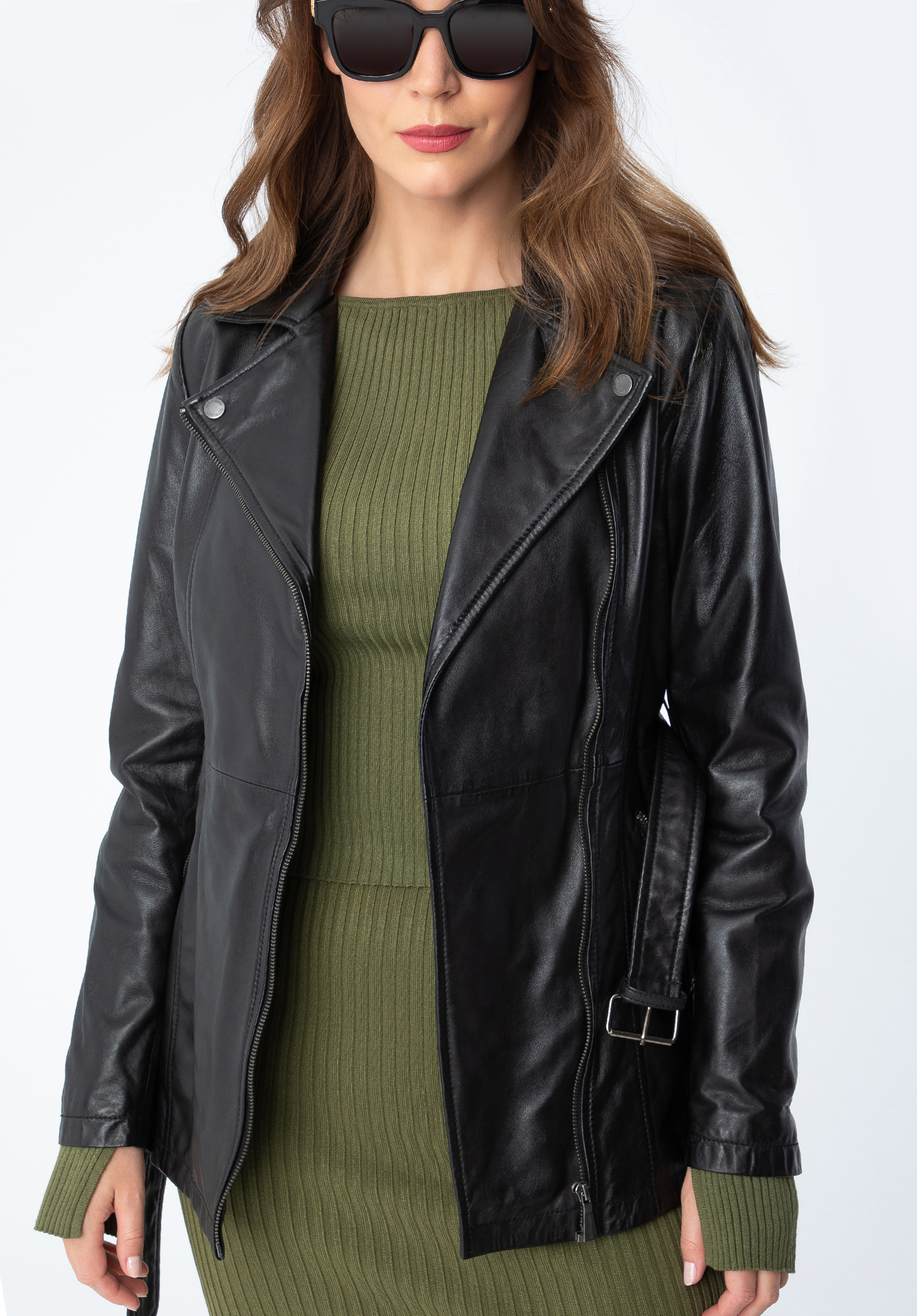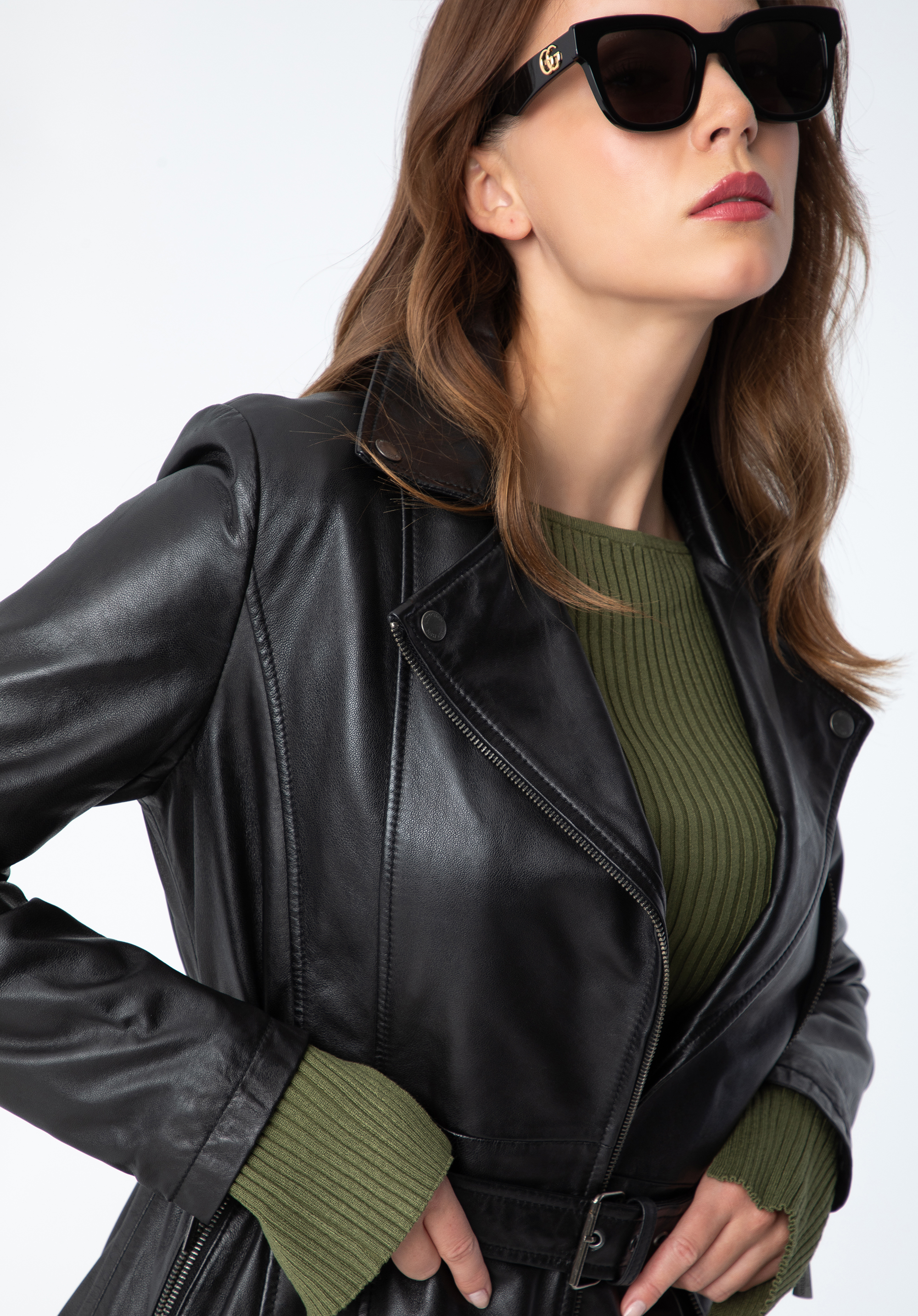 Diese stilvolle Damenjacke wird mehr als nur ein Auge auf sich ziehen. Der asymmetrische Reißverschluss, der abnehmbare Kragen und die glänzenden Druckknöpfe, die für Ramones charakteristisch sind, kommen in einem einzigartigen verlängerten Schnitt, der bis zur Hüfte oder hinter die Hüfte reicht. Die Taille wird durch den Gürtel betont, der abnehmbar ist und somit nach Belieben getragen werden kann. Dieses Modell ist aus hochwertigem Naturleder gefertigt, das sich sehr angenehm anfühlt. Tragen Sie es zu Ihrem Lieblings-Minikleid oder zu einem lässigen Ensemble mit Jeans und Sweatshirt - Sie werden in jeder Situation stilvoll aussehen. Die Damen-Lederjacke mit Gürtel ist ein Accessoire, das Sie im Herbst und Frühjahr jeden Tag brauchen.