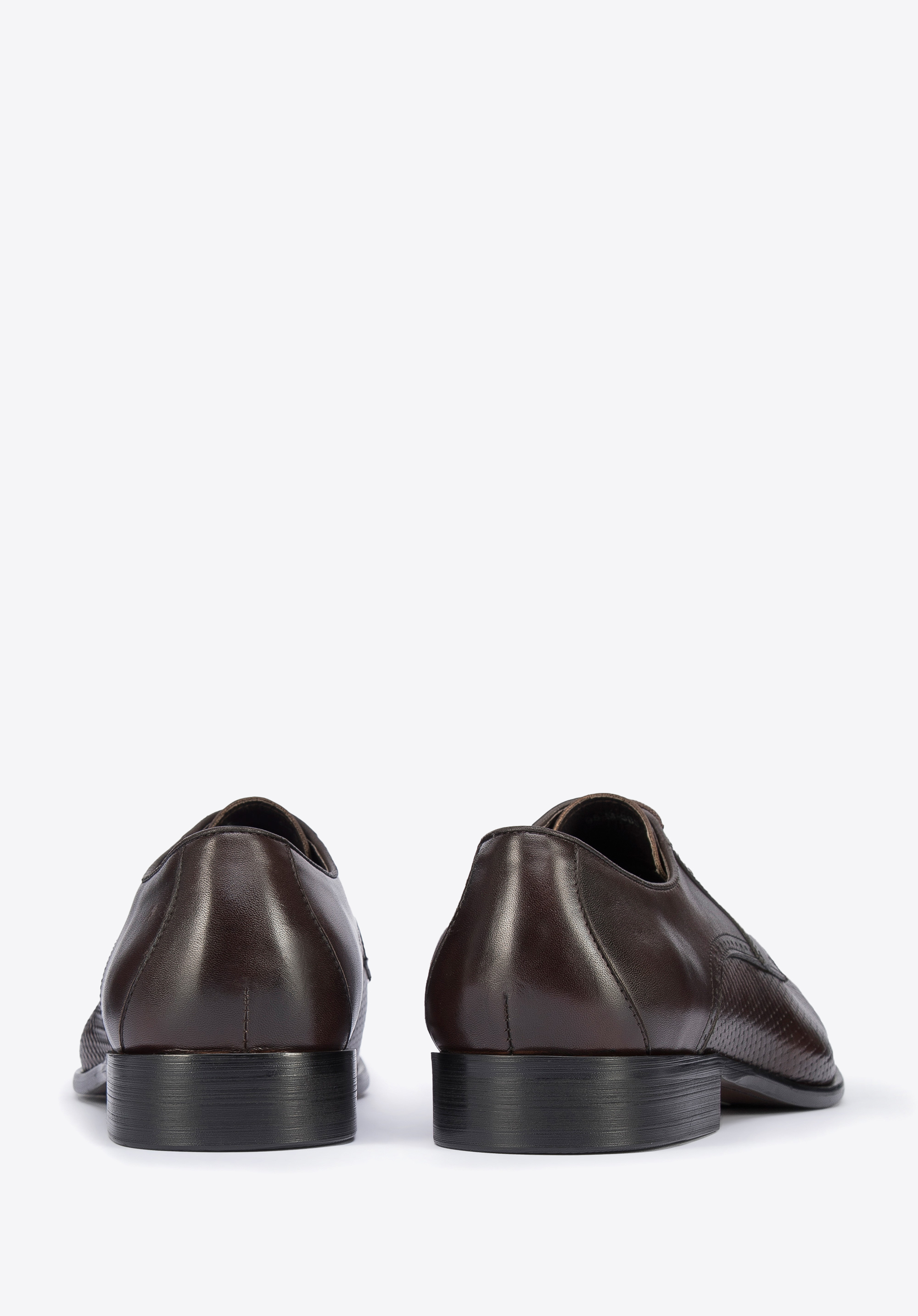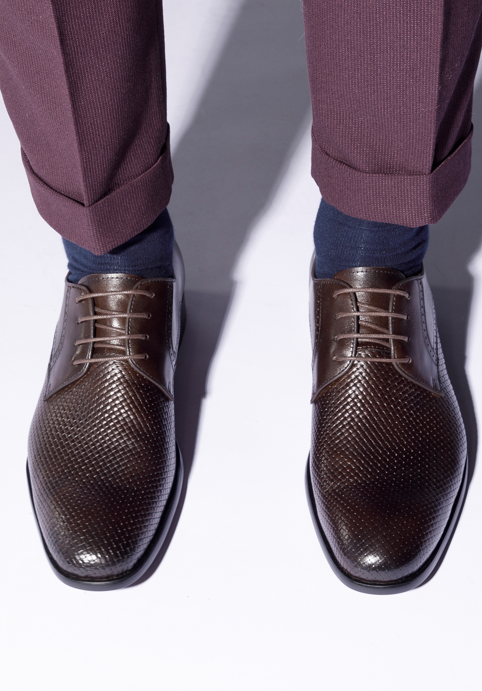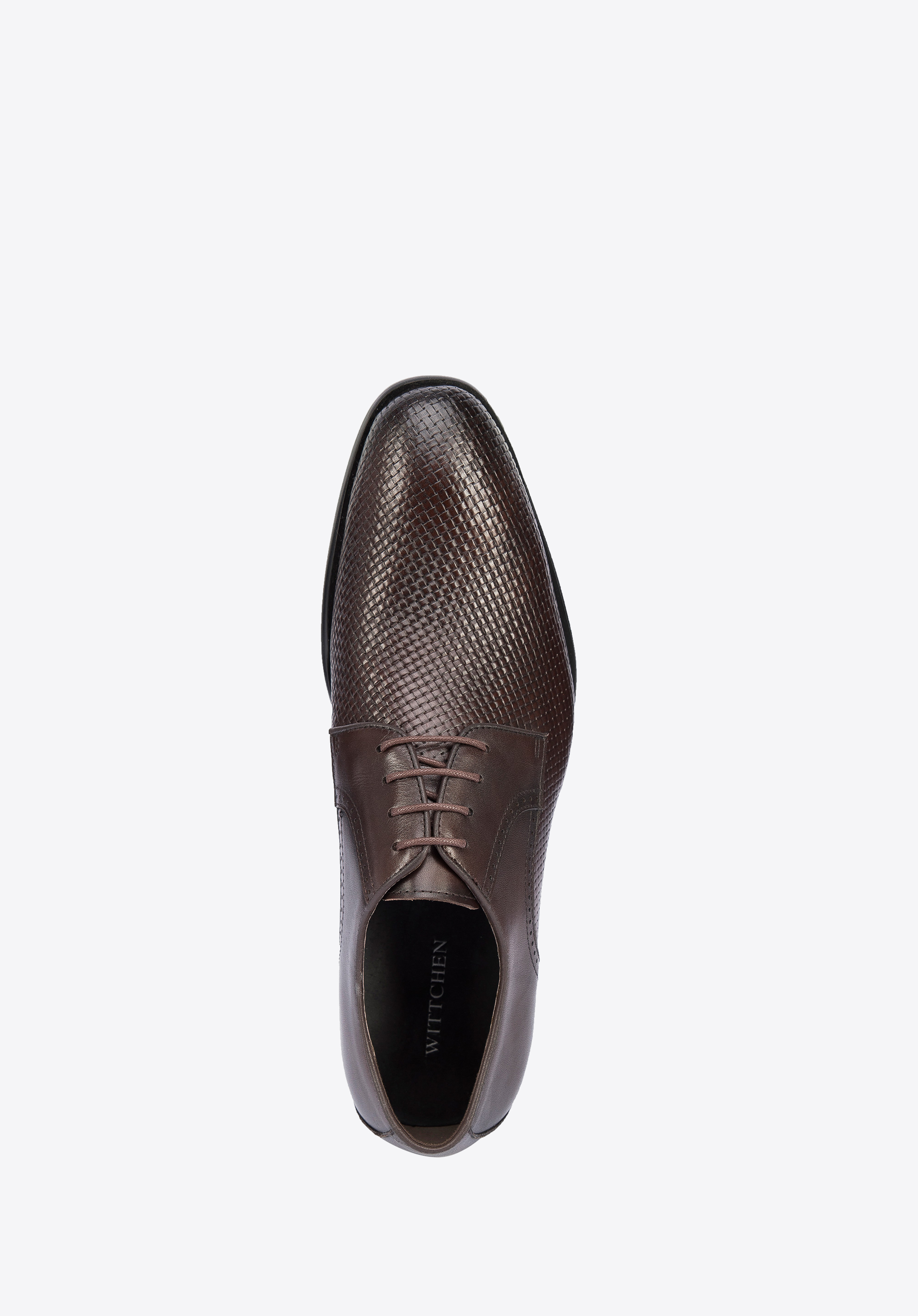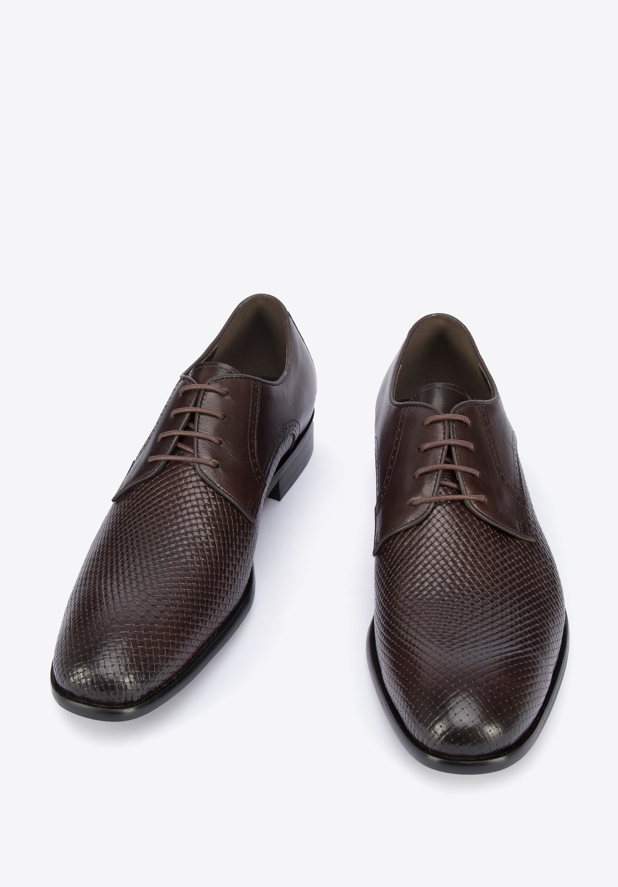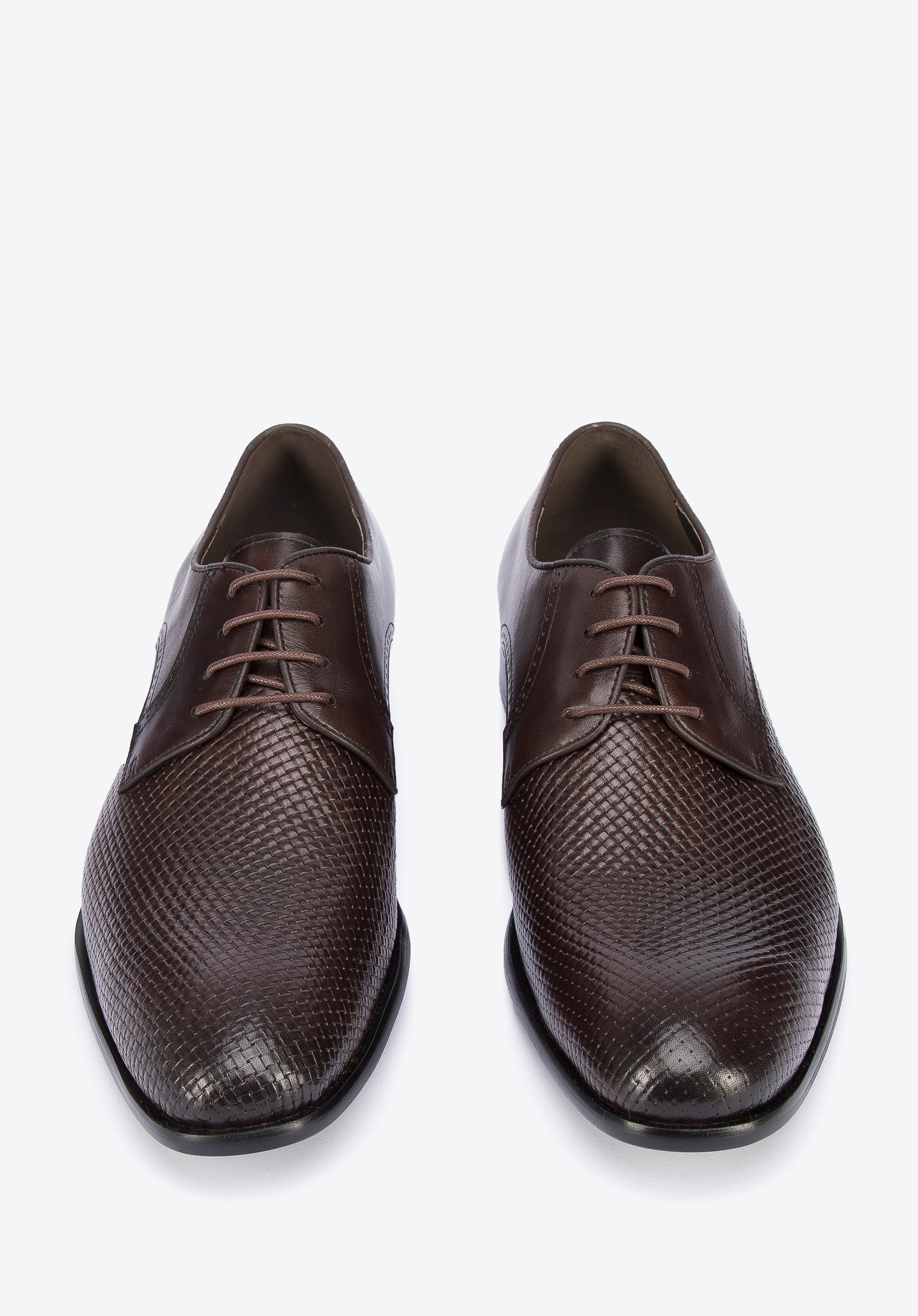 Diese originellen Schuhe unterstreichen Ihr jedes Outfit. Sie sind aus hochwertigem Naturleder gefertigt und das stilvolle Geflecht verleiht ihnen Charakter. Sie haben auch dekorative Löcher an den Seiten. Es handelt sich um einfache, aber originelle Derby-Schuhe. Sie sind halb-formal und passen daher sowohl zu einem legeren Anzug als auch zu Jeans und einem Pullover. Derby-Schuhe aus Leder mit Geflecht ist ein klassisches Modell mit einem interessanten Finish.