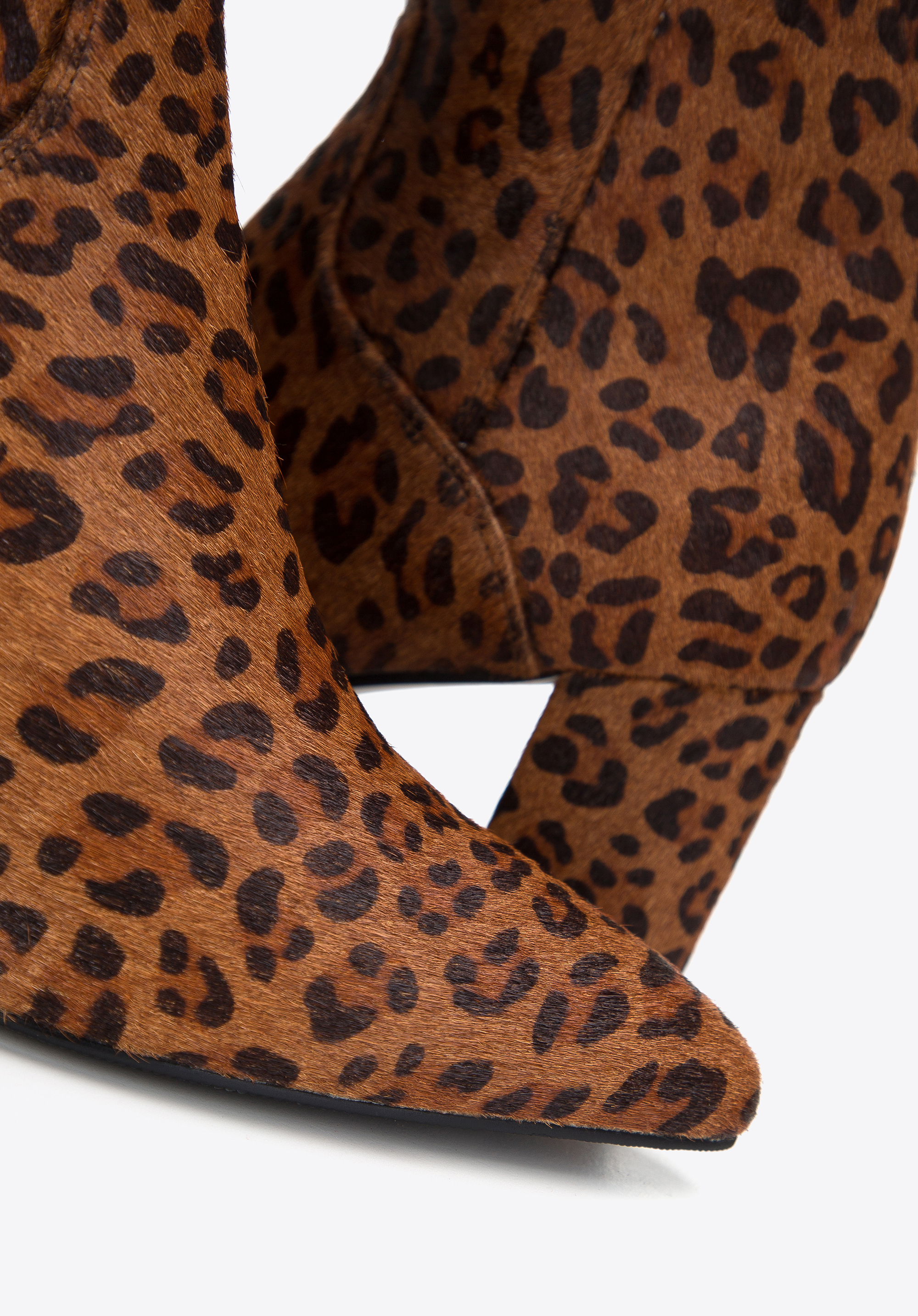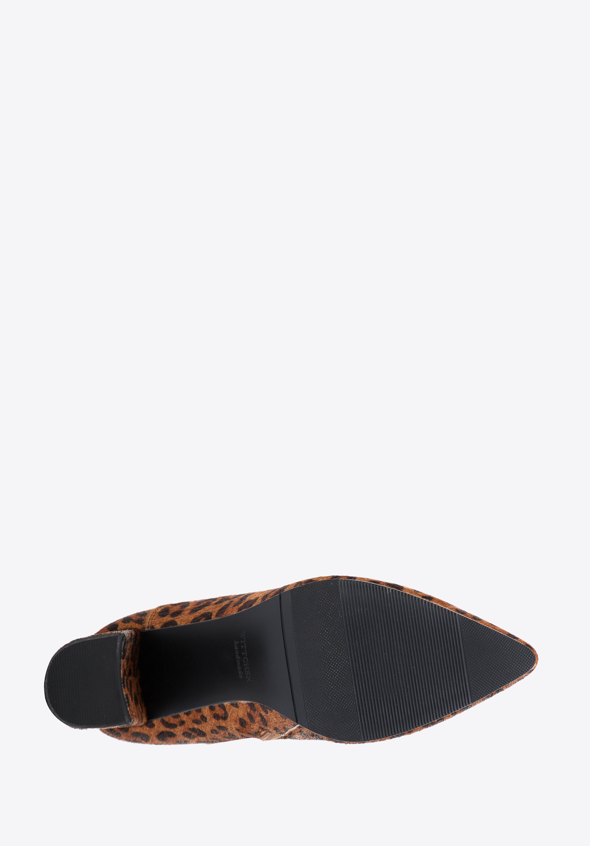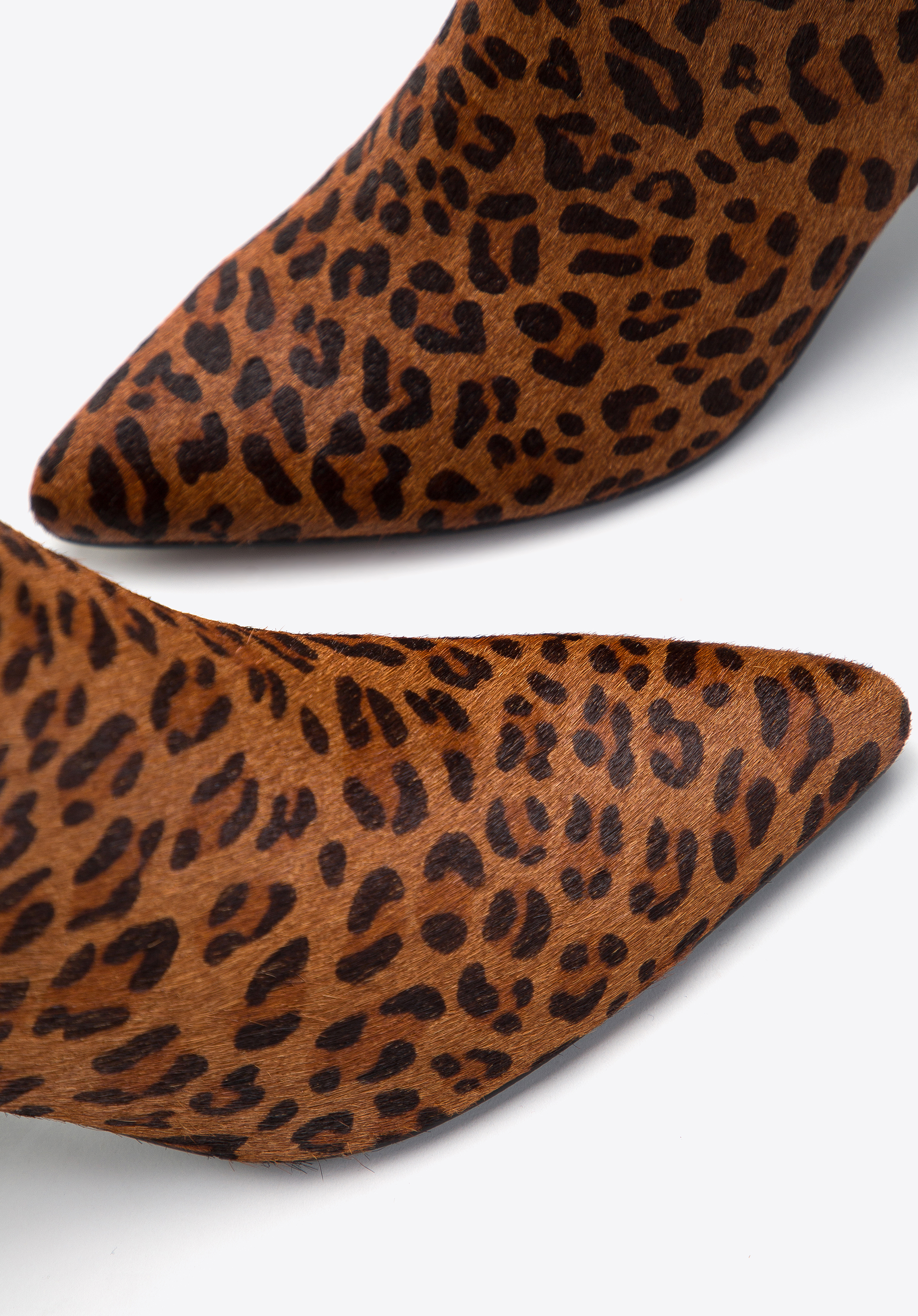 In diesen Stiefeln werden Sie nicht unbemerkt bleiben. Sie sind aus hochwertigem Leder mit Borsten in einem modischen Tiermuster gefertigt . An der Spitze befindet sich ein V-Ausschnitt, der die Wade betont. Die Stiefel haben eine formschöne spitze Spitze und einen bequemen Stiletto-Absatz, der Ihnen ein paar Zentimeter Höhe verleiht. An der Innenseite befindet sich ein Reißverschluss, der das An- und Ausziehen erleichtert. Dieses Modell bringt Abwechslung in ein Set mit einem klassischen Trench und peppt ein feminines Minikleid auf. Damenstiefel aus Leder mit Tiermuster sind eine gute Wahl für Liebhaberinnen von Accessoires mit Charakter.