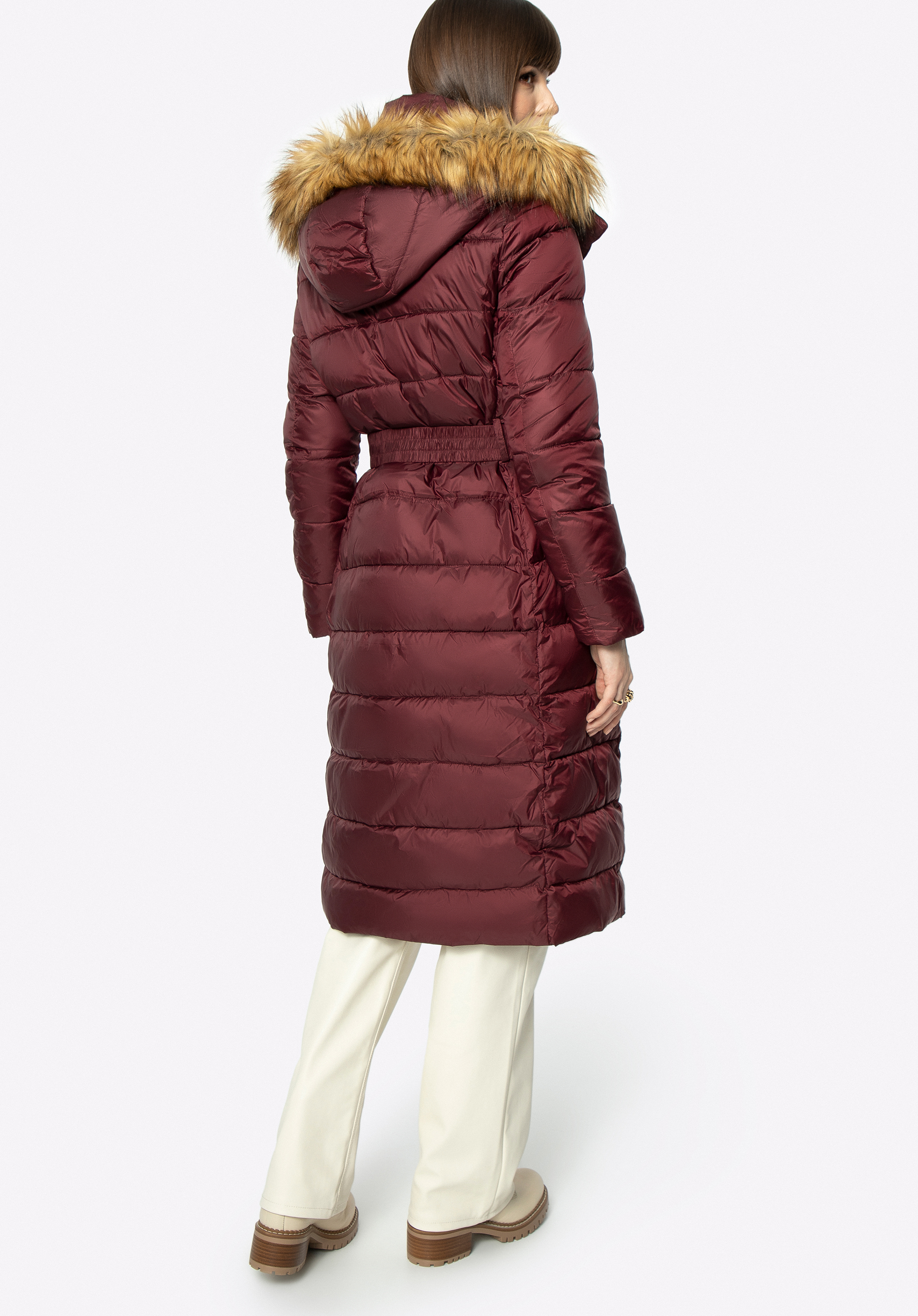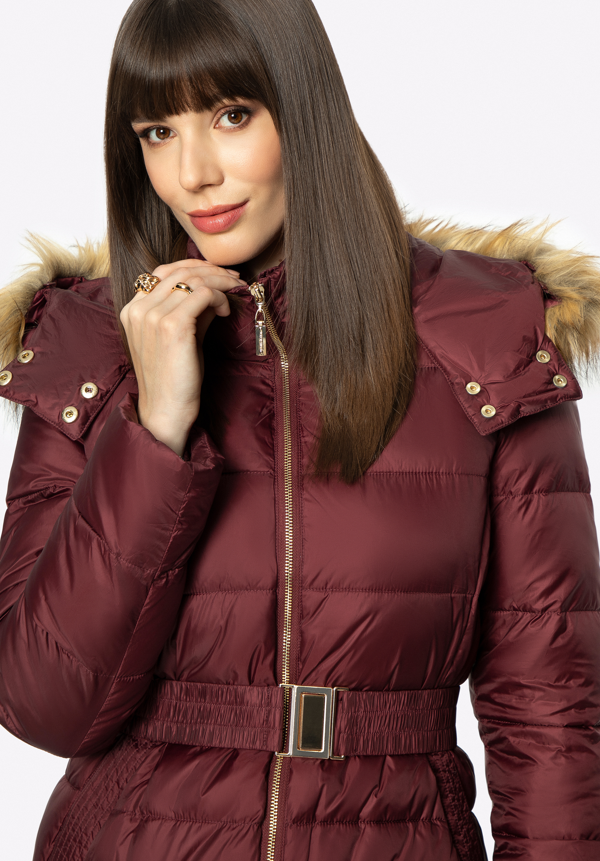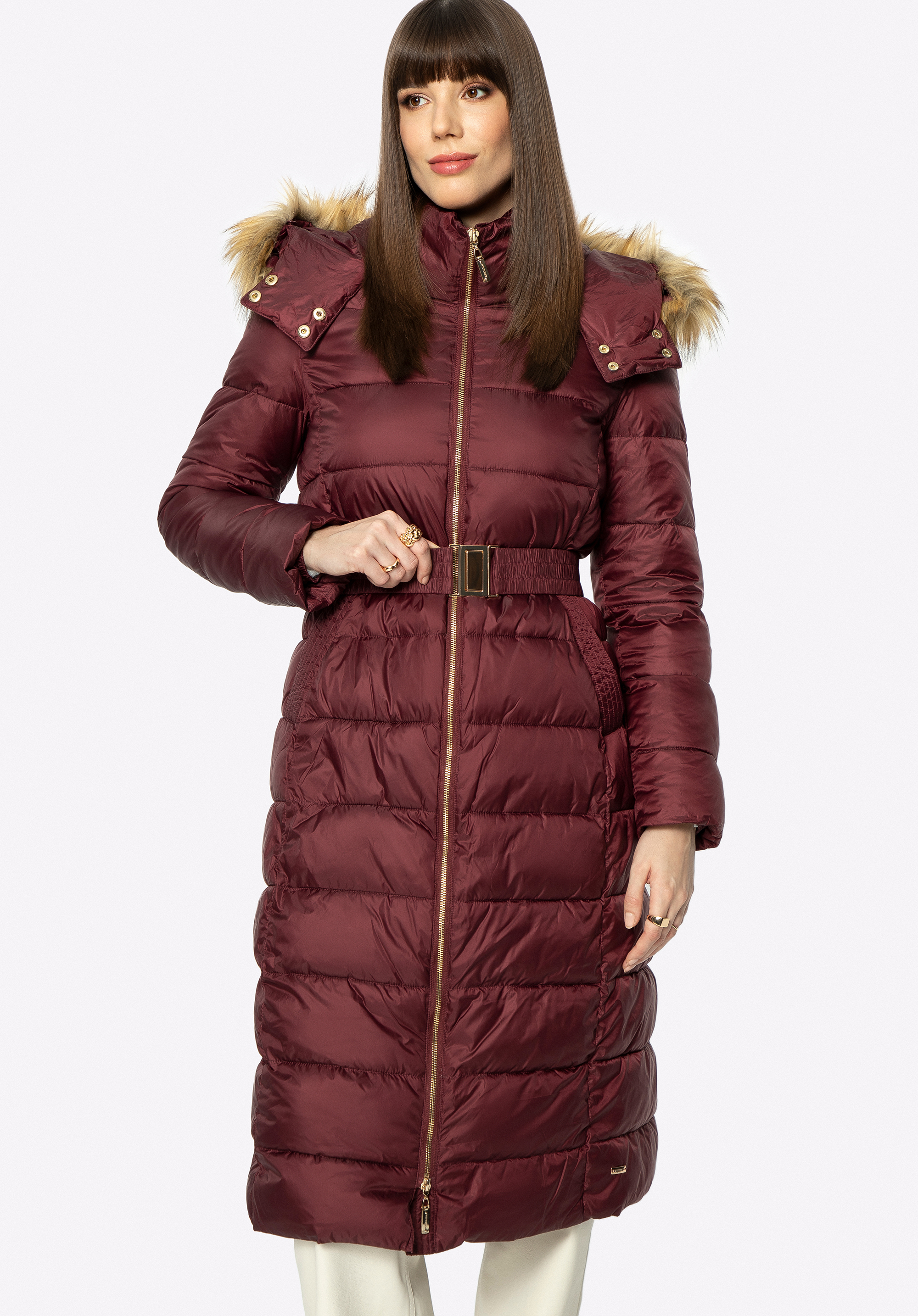 Dieser modische Mantel für Herbst und Winter hält Sie auch bei schlechtem Wetter warm. Er wurde aus leicht glänzendem Polyester mit horizontaler Steppung gefertigt. Die Taille wird durch den Gürtel mit Schnalle betont, den Sie abnehmen können. Der hohe Kragen und die abnehmbare Kapuze mit Kunstpelzbesatz sind das perfekte Accessoire für Damen, die nicht gerne Mützen tragen. Der gesteppte Wintermantel für Damen mit Kapuze ist ein zeitloses Modell für jede elegante Frau.