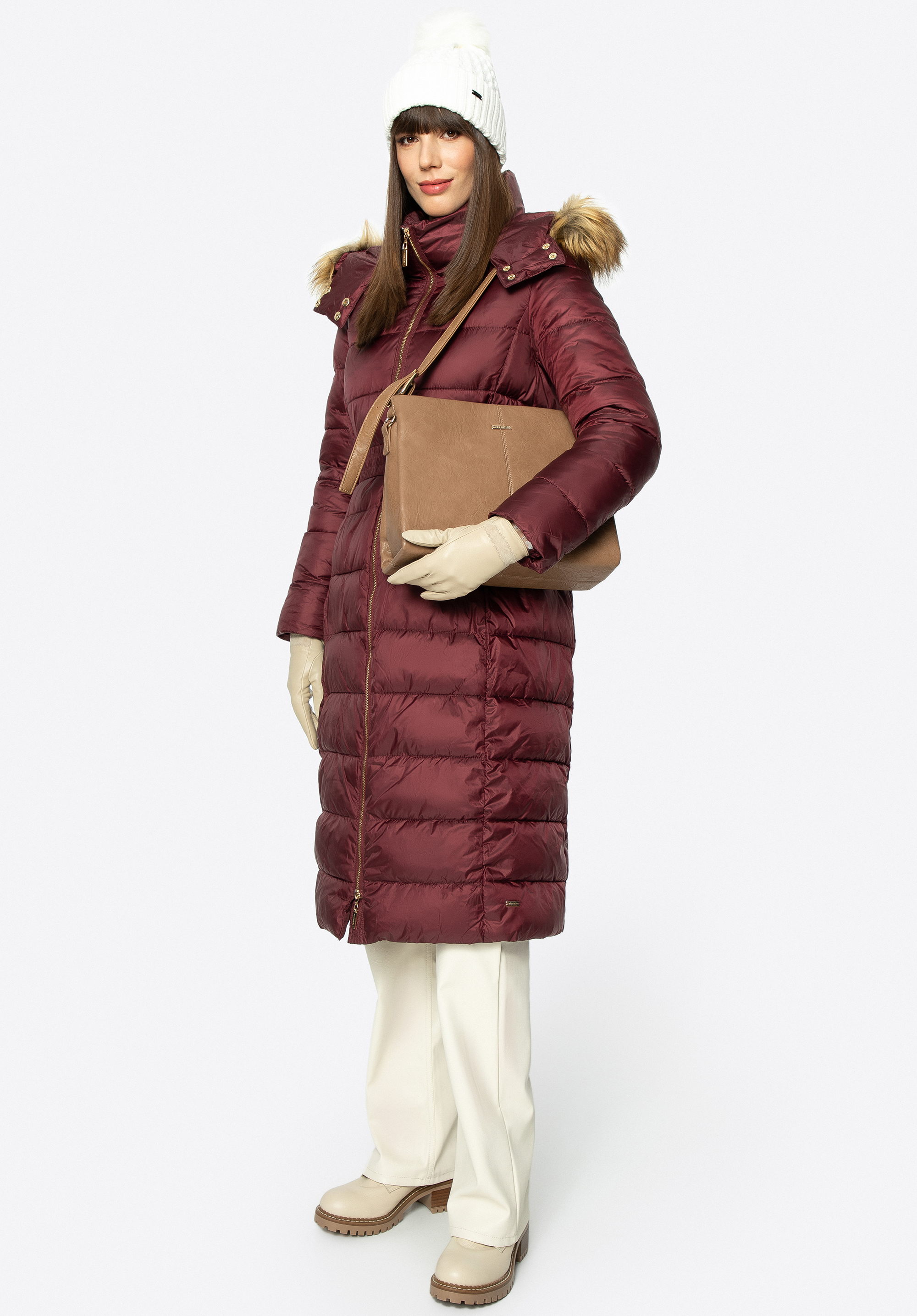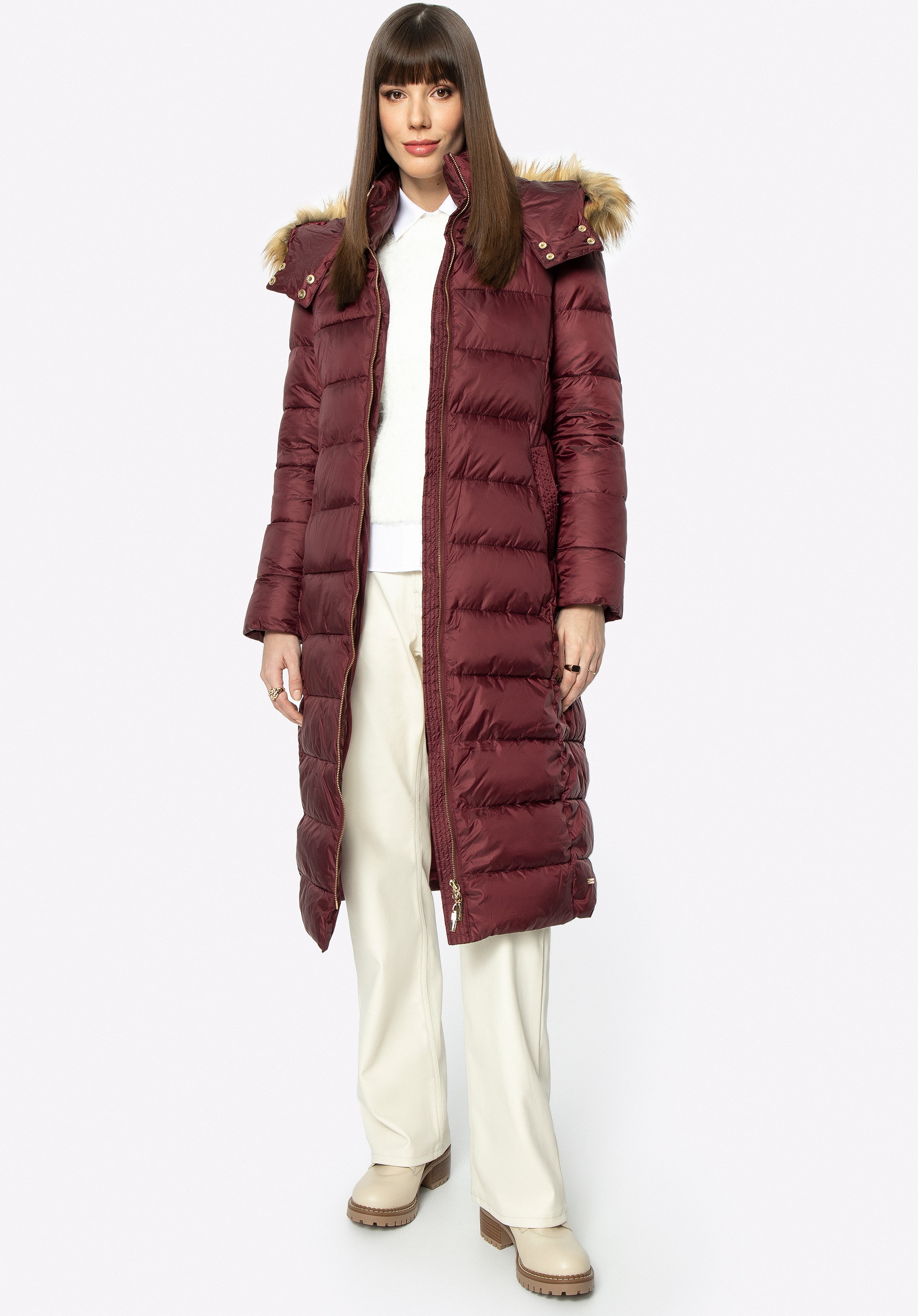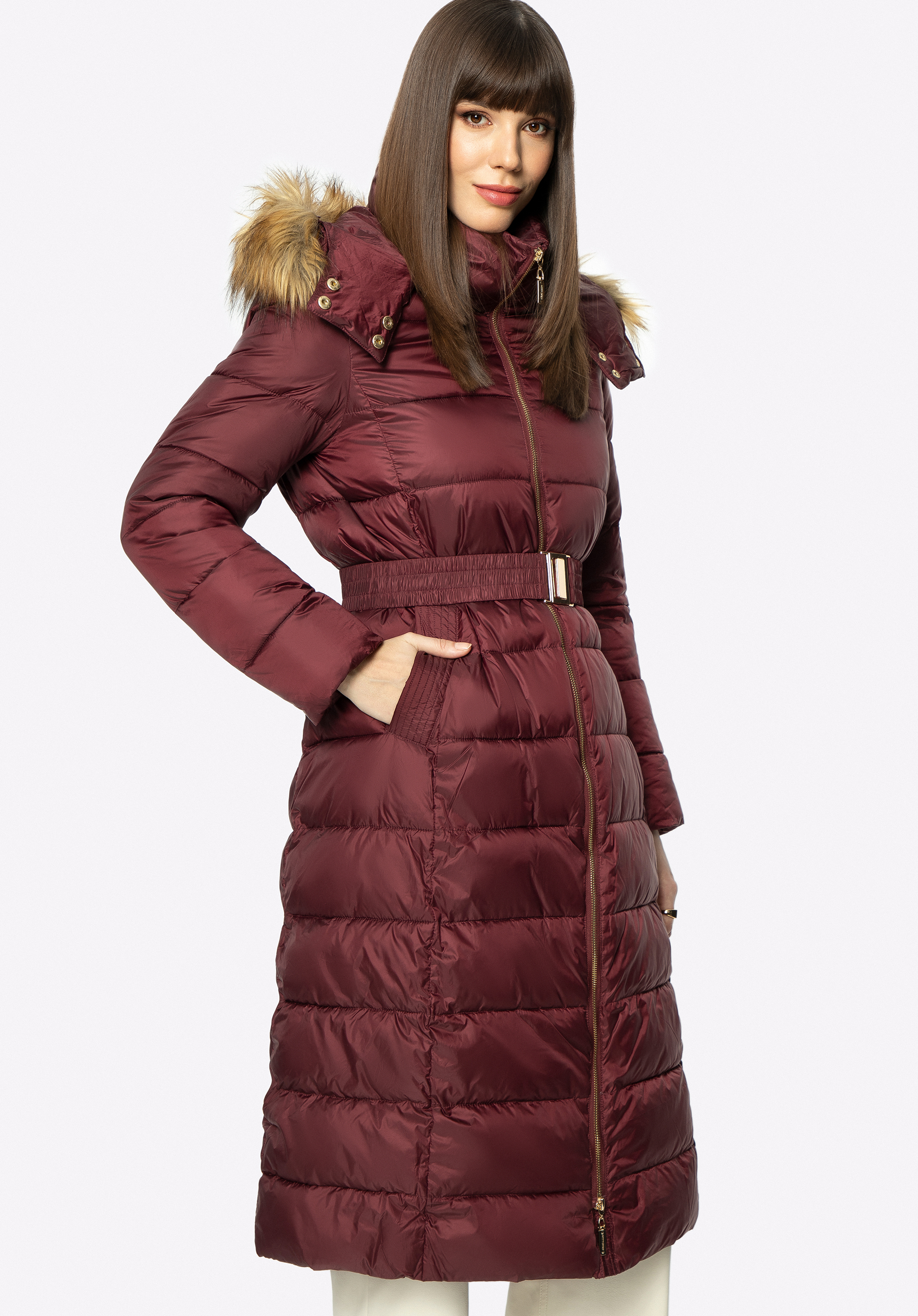 Dieser modische Mantel für Herbst und Winter hält Sie auch bei schlechtem Wetter warm. Er wurde aus leicht glänzendem Polyester mit horizontaler Steppung gefertigt. Die Taille wird durch den Gürtel mit Schnalle betont, den Sie abnehmen können. Der hohe Kragen und die abnehmbare Kapuze mit Kunstpelzbesatz sind das perfekte Accessoire für Damen, die nicht gerne Mützen tragen. Der gesteppte Wintermantel für Damen mit Kapuze ist ein zeitloses Modell für jede elegante Frau.