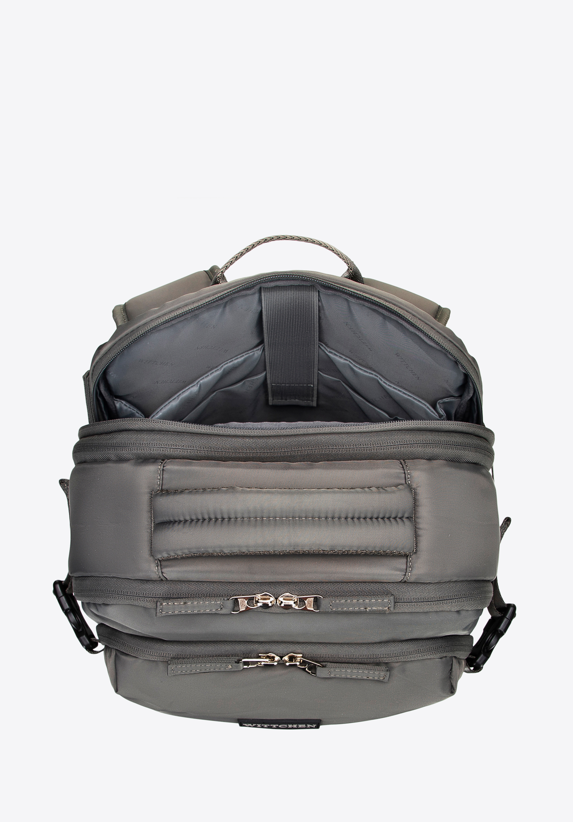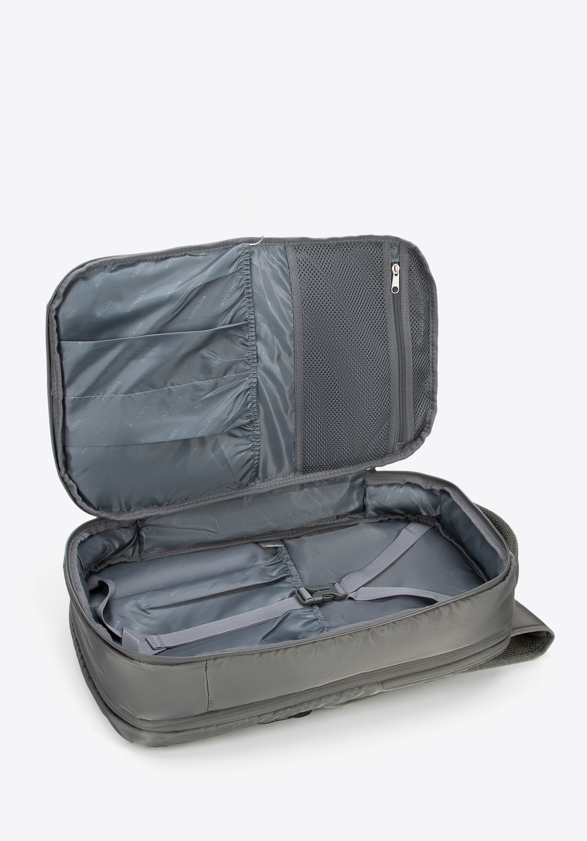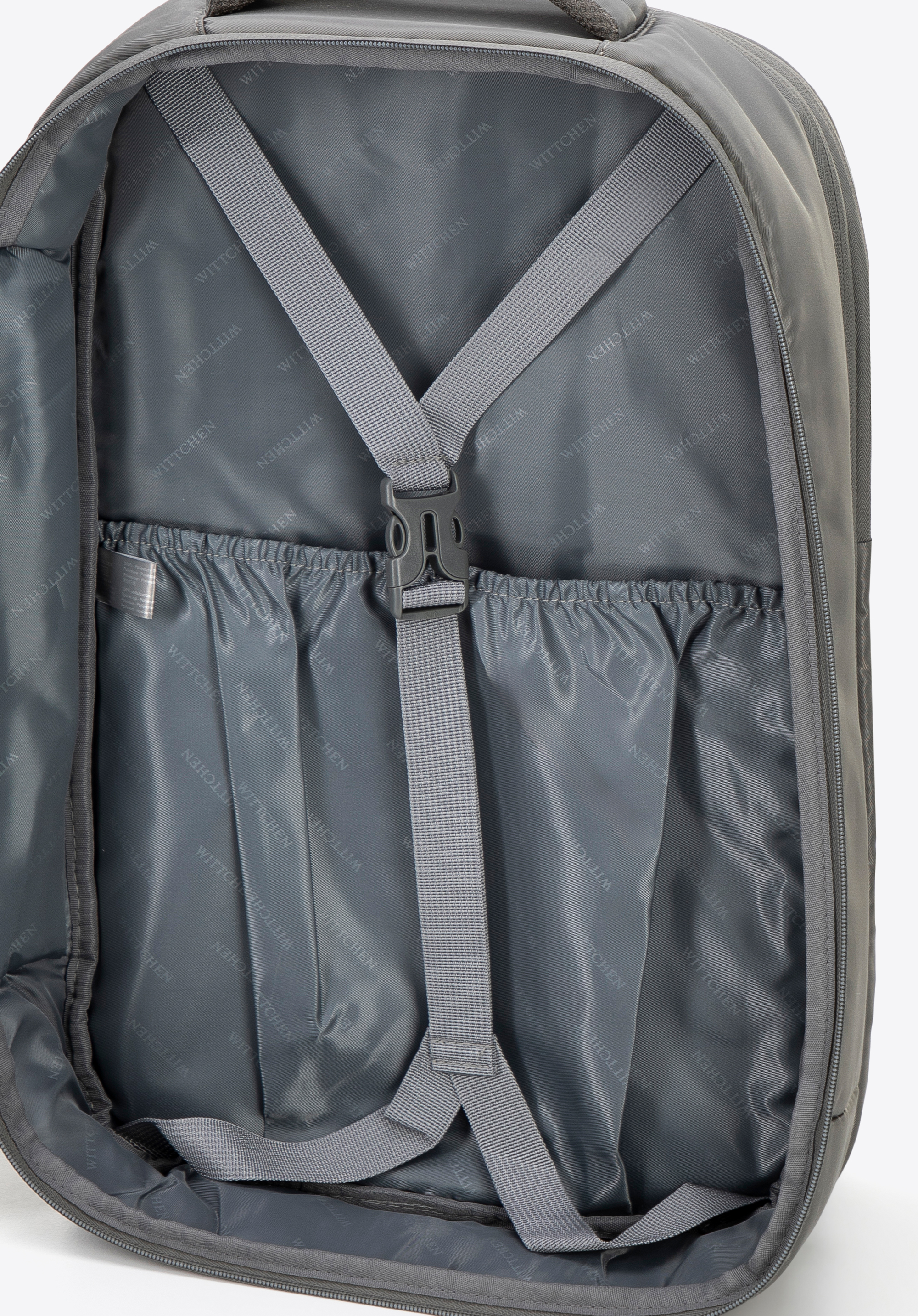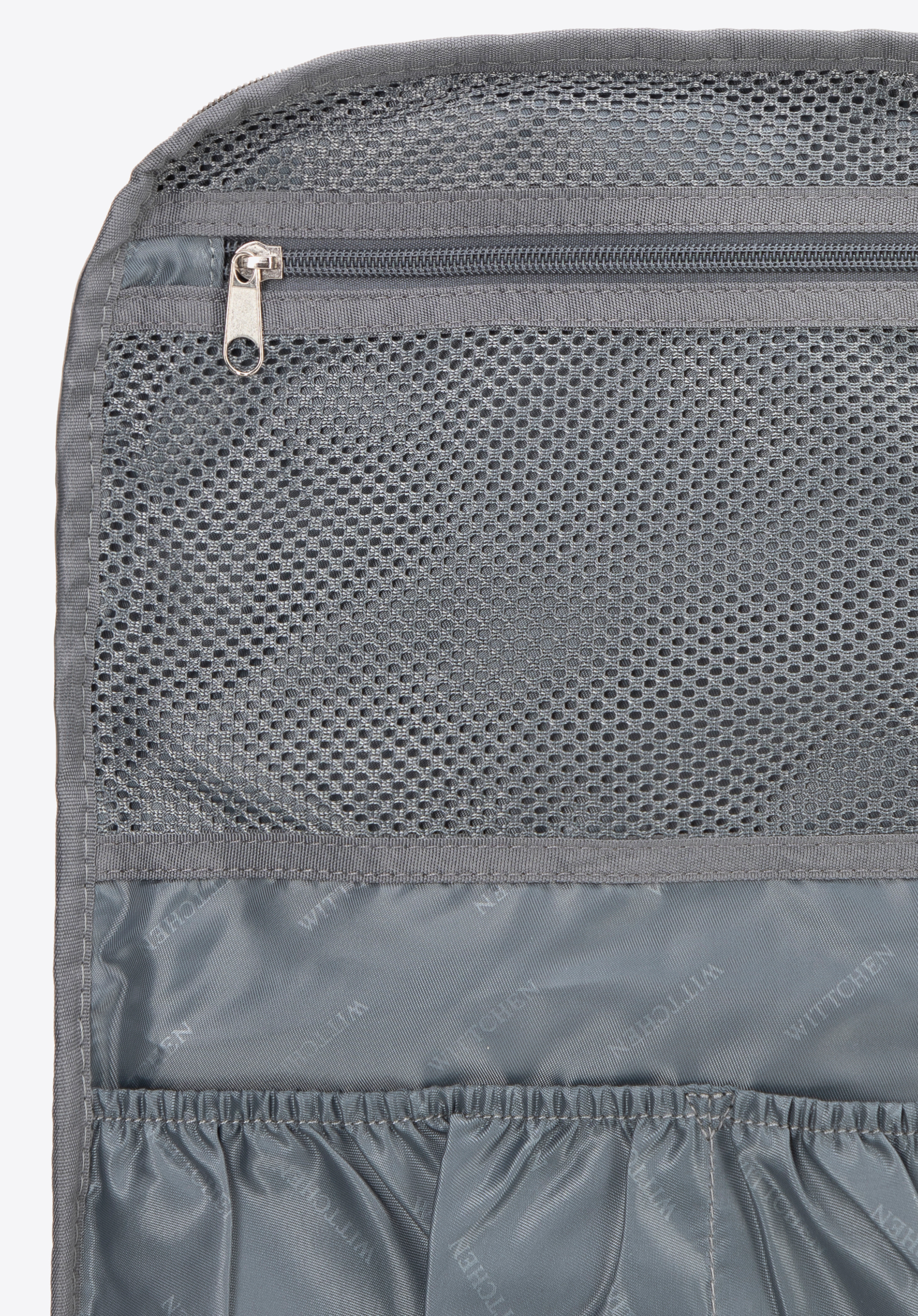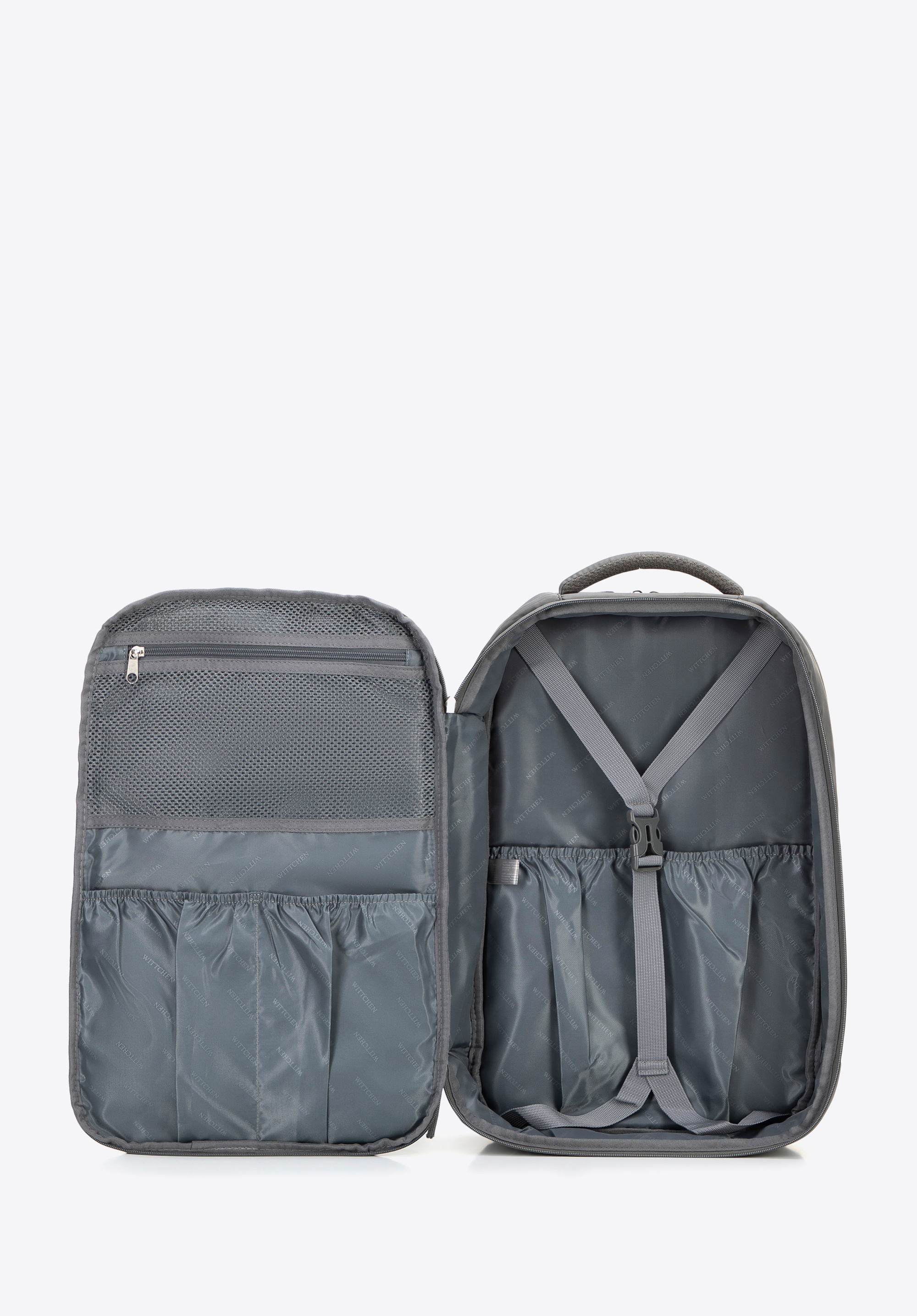 - Hauptfach: Das Fach lässt sich wie ein Koffer öffnen und bietet drei Taschen mit Gummizug zur Aufbewahrung kleinerer Gegenstände. Sicherheitsgurte sorgen für Ordnung im Inneren und ermöglichen einen einfachen Zugriff auf den Inhalt.