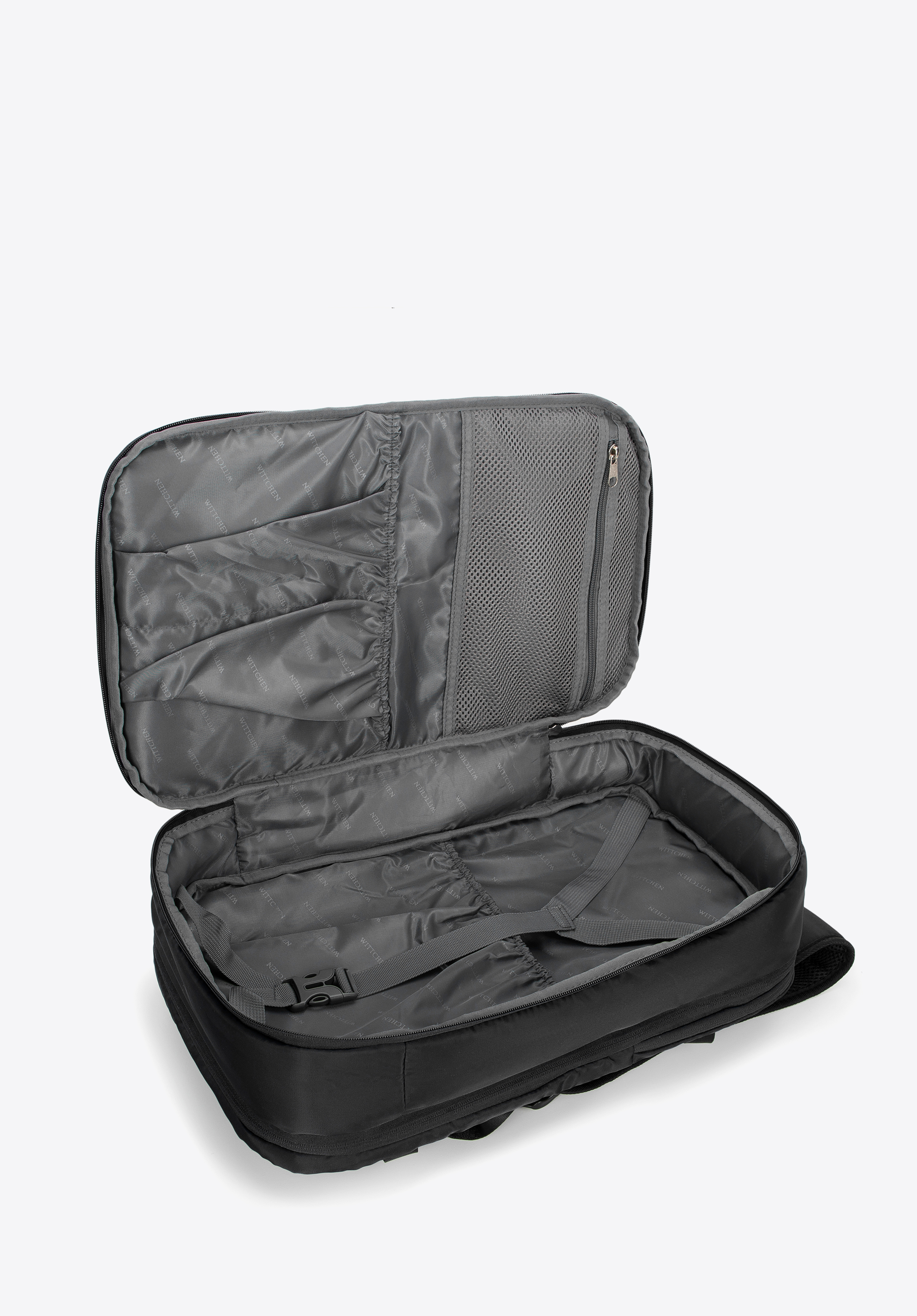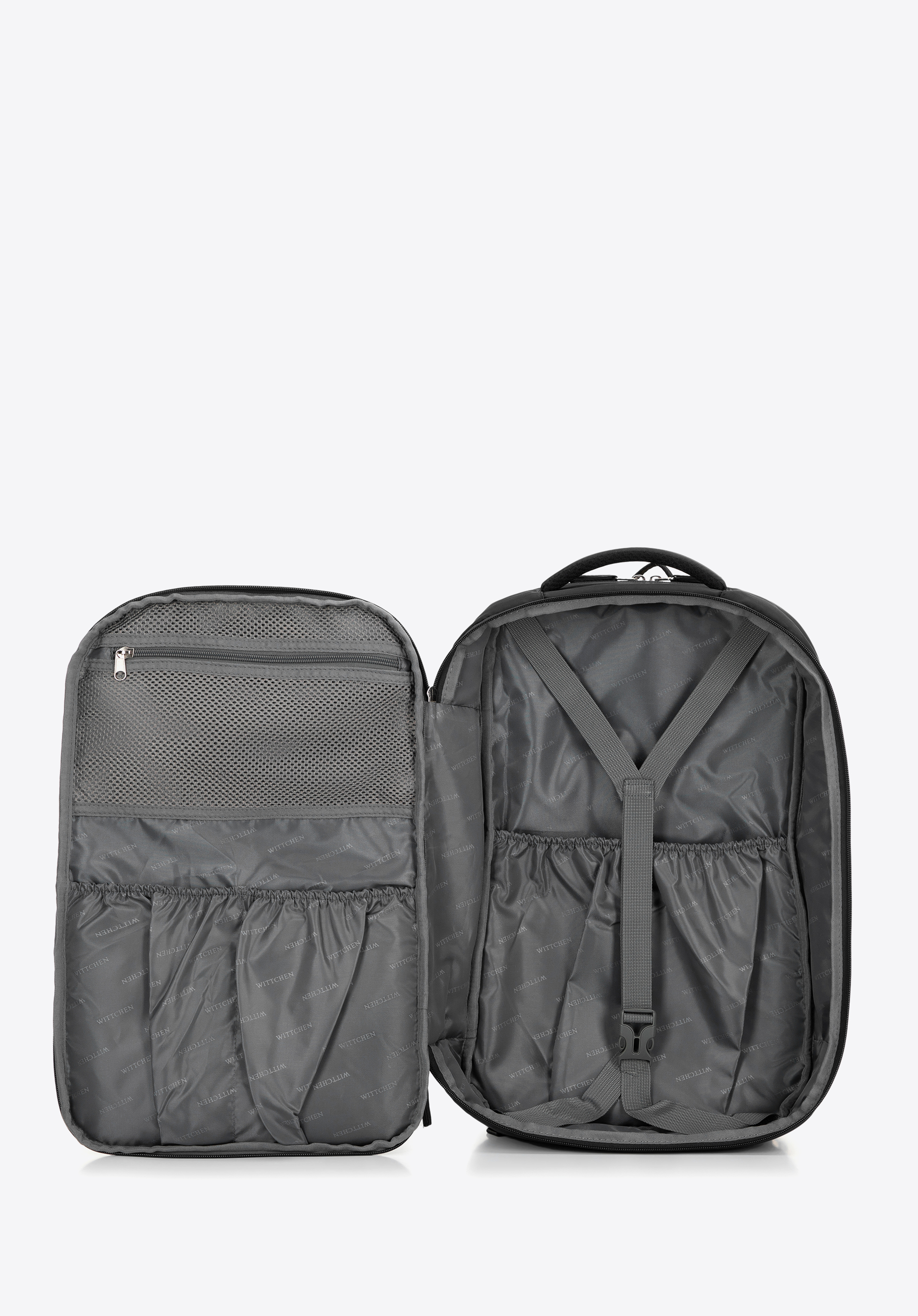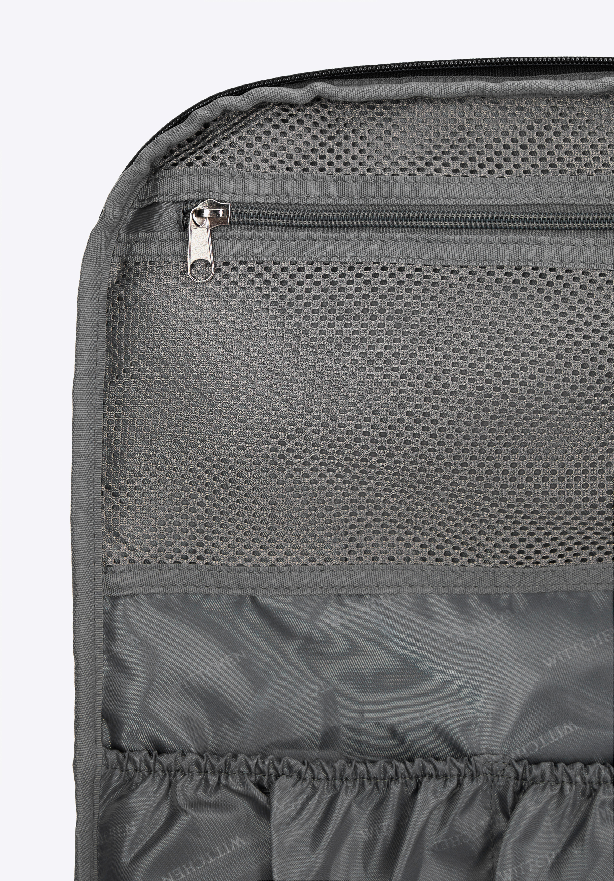 - Hauptfach: Das Fach lässt sich wie ein Koffer öffnen und bietet drei Taschen mit Gummizug zur Aufbewahrung kleinerer Gegenstände. Sicherheitsgurte sorgen für Ordnung im Inneren und ermöglichen einen einfachen Zugriff auf den Inhalt.